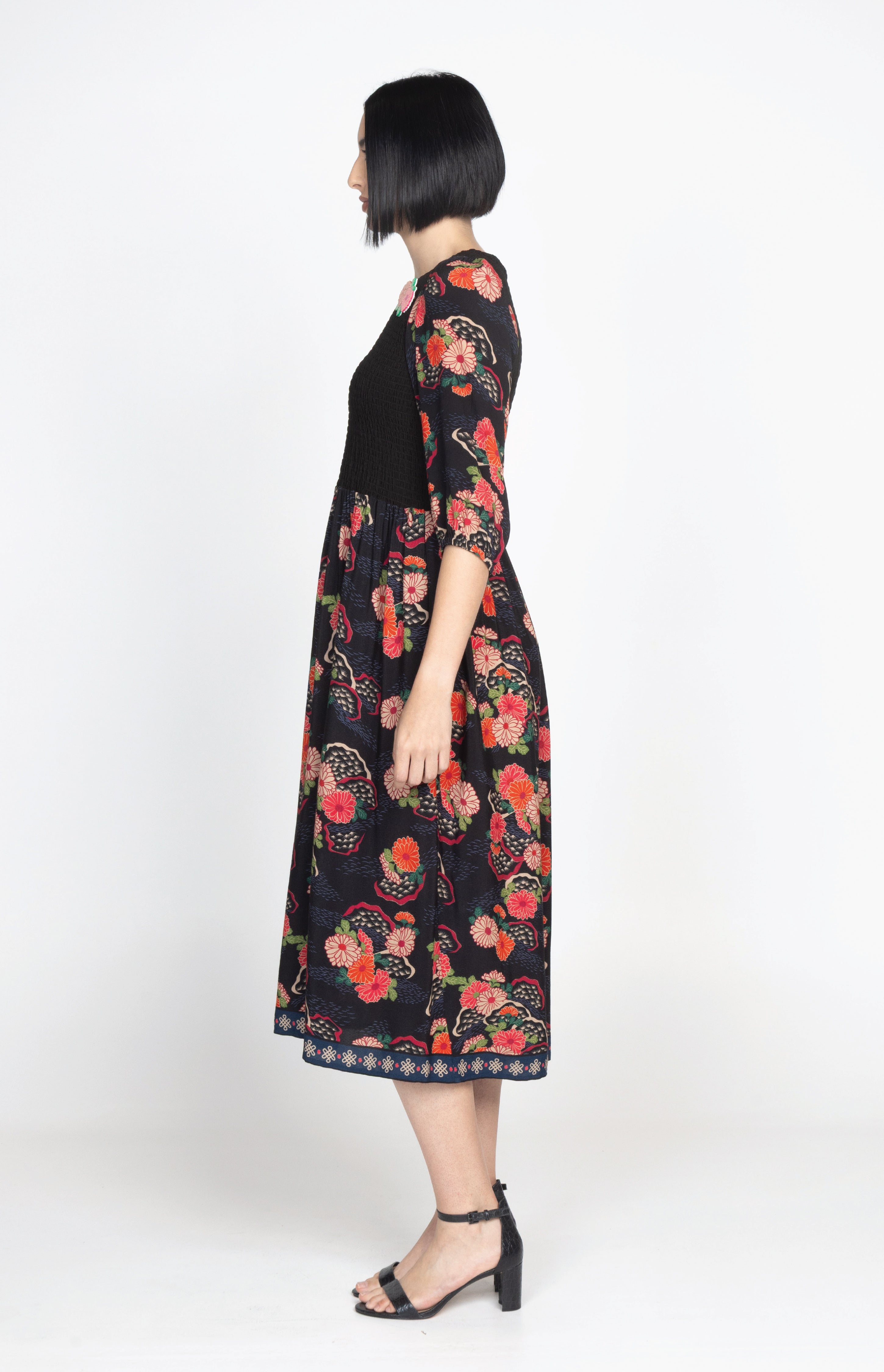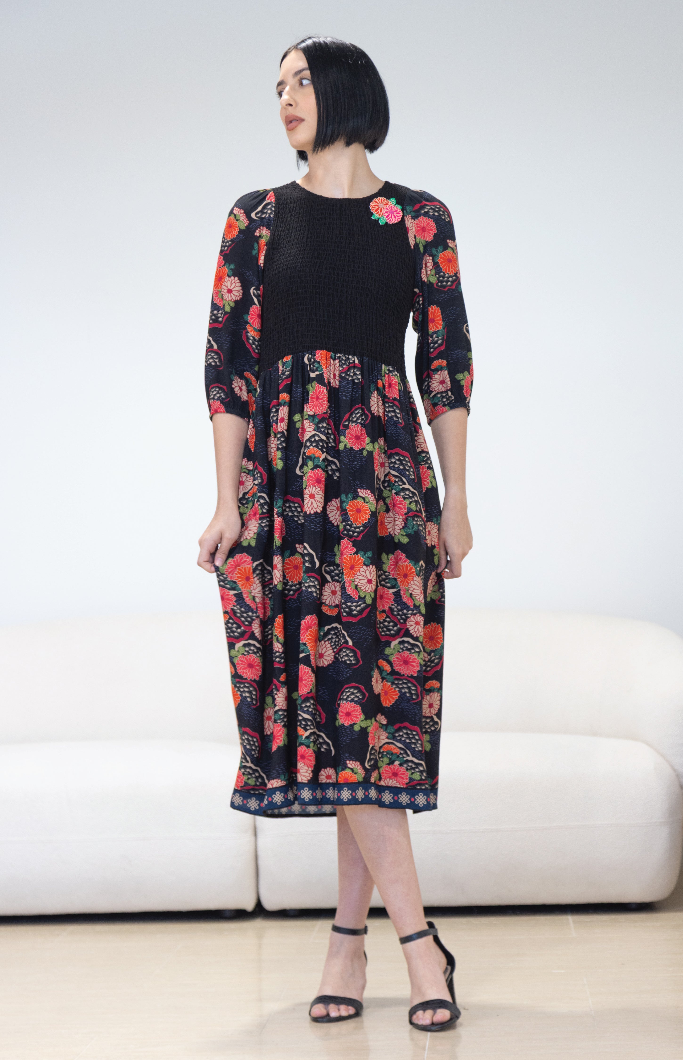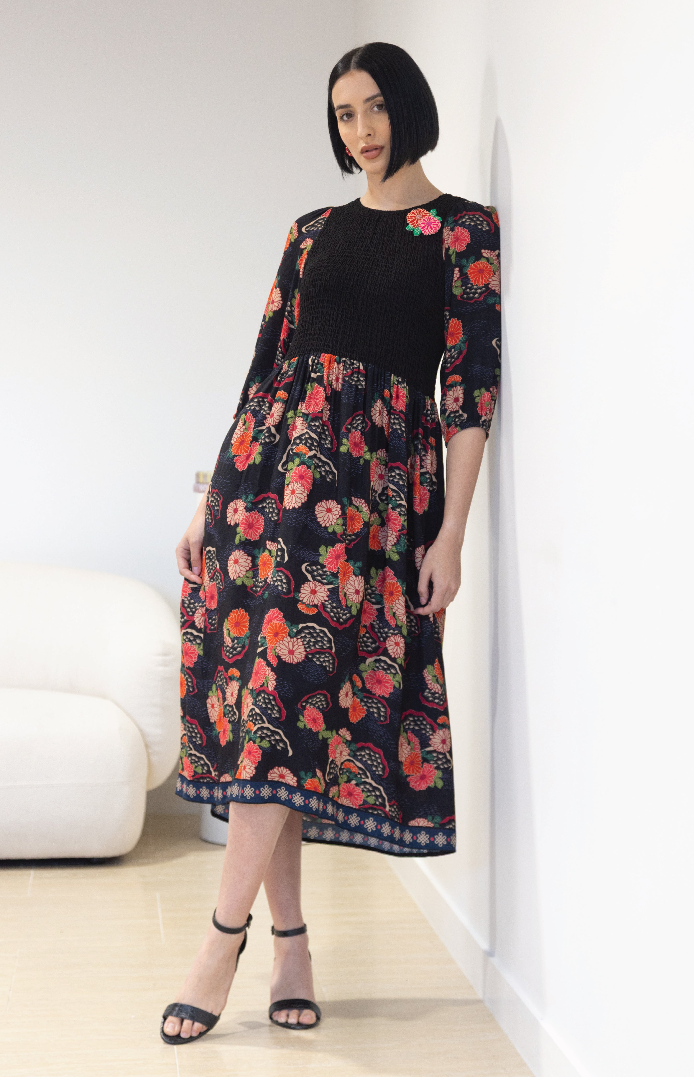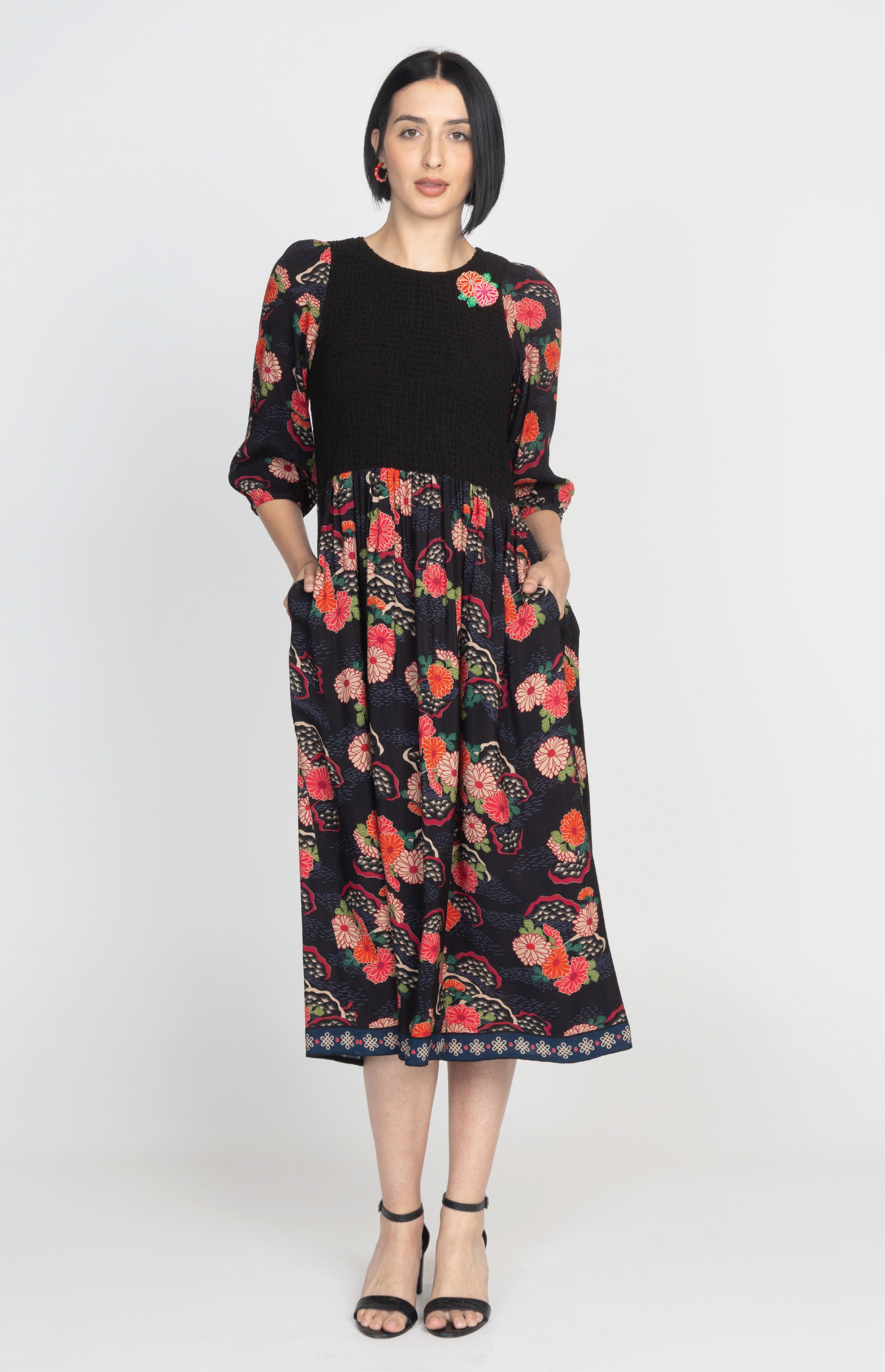 Softly gathered sleeves, a shirred bodice and a playful contrast hem band make her comfortable, stylish, and ready for any occasion.
