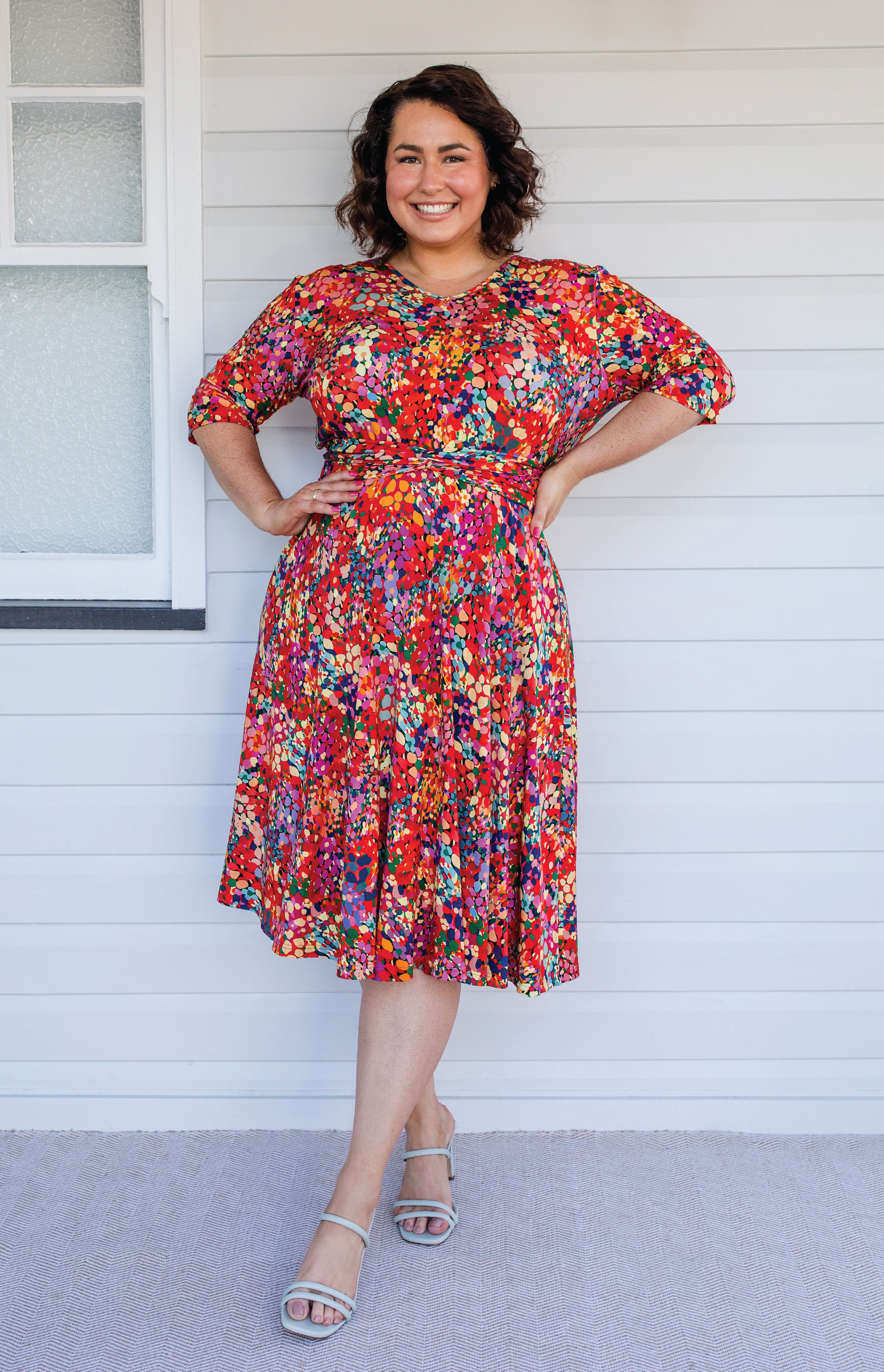 Our Designer Deanne (blonde) is wearing size 8. Her bust is 97cm; Waist 80cm; Hip: 103cm.