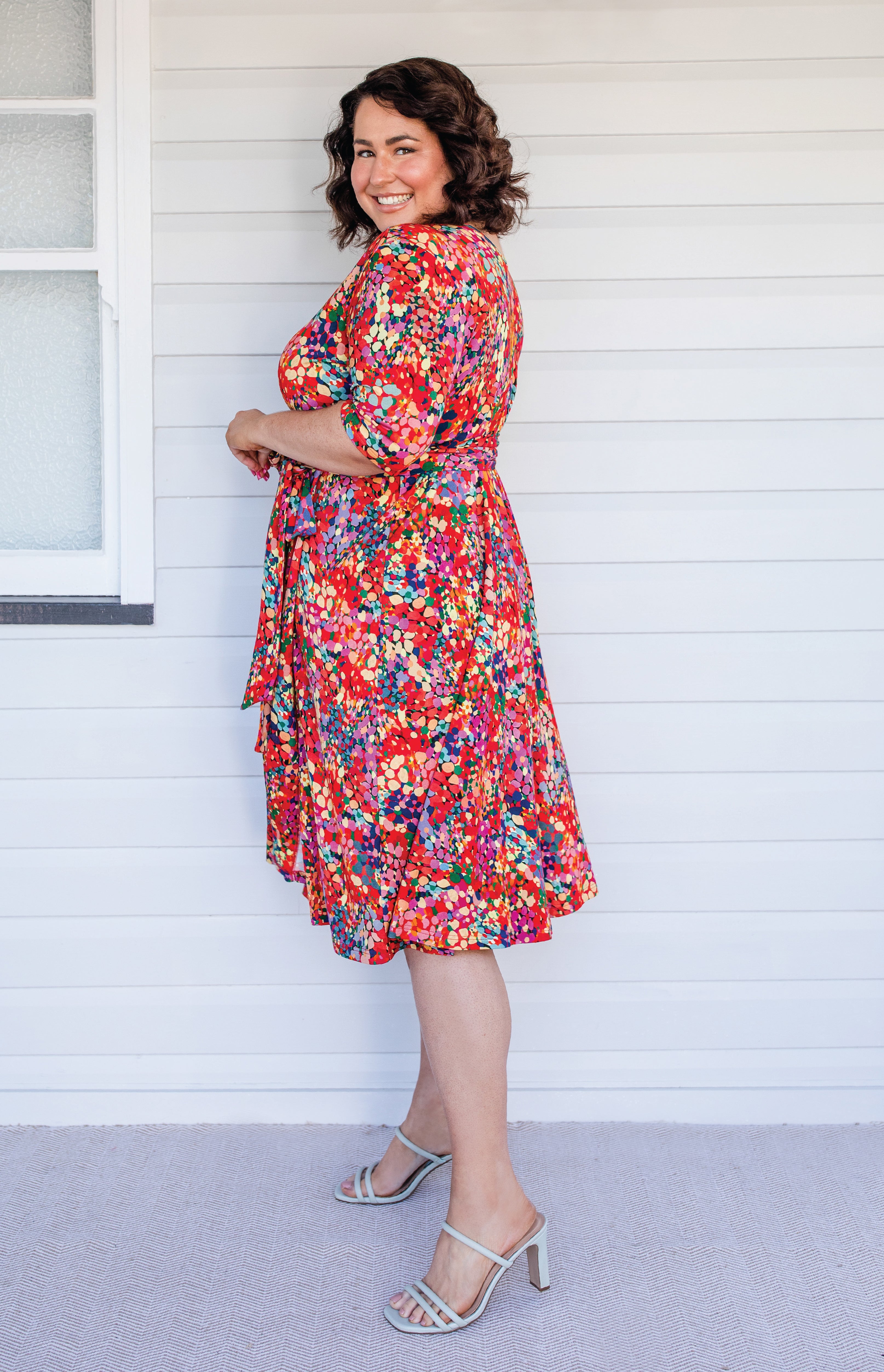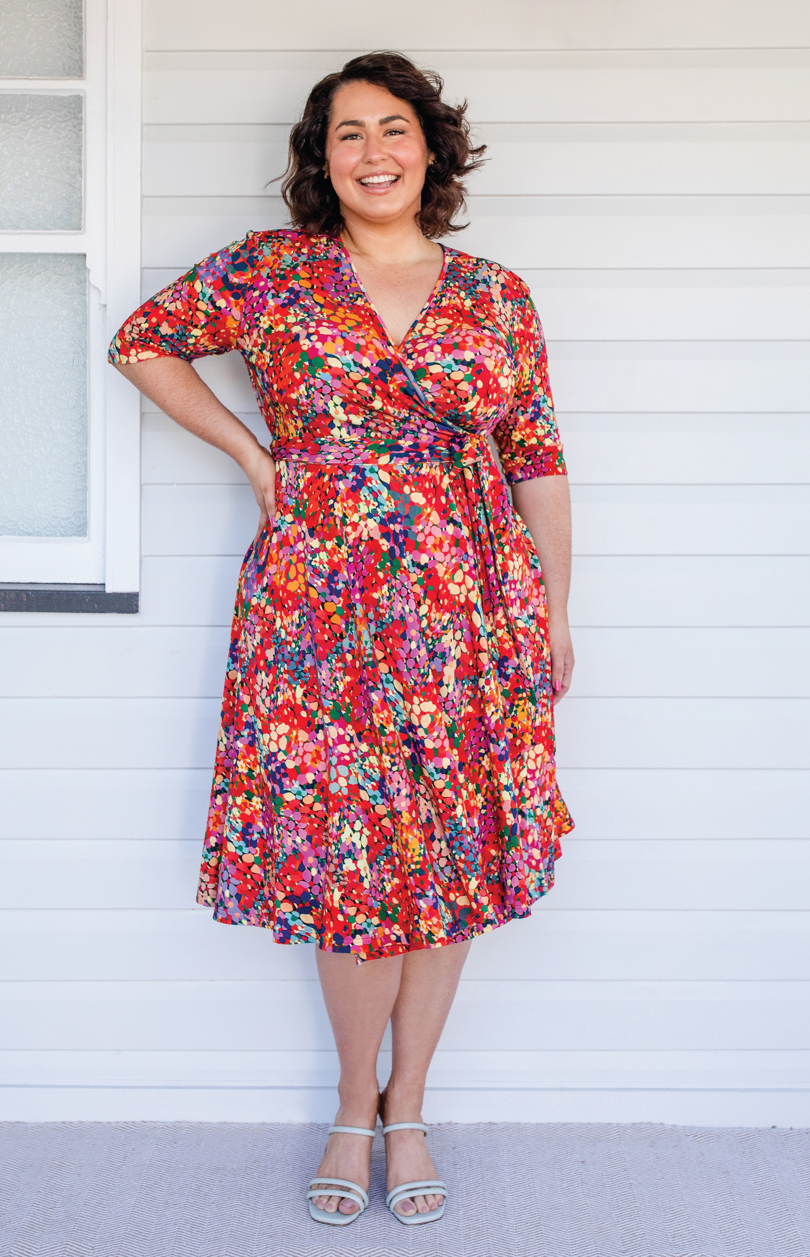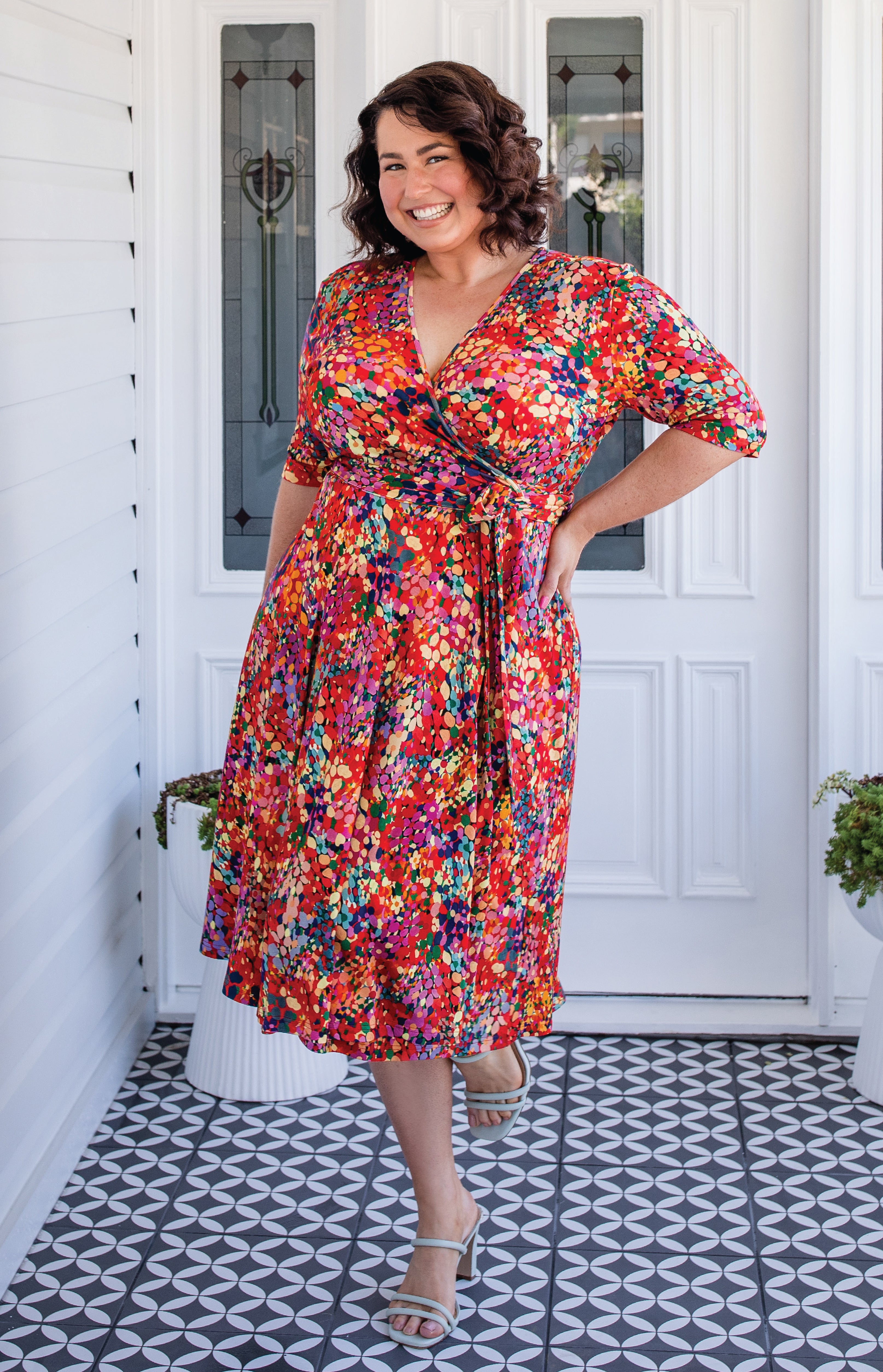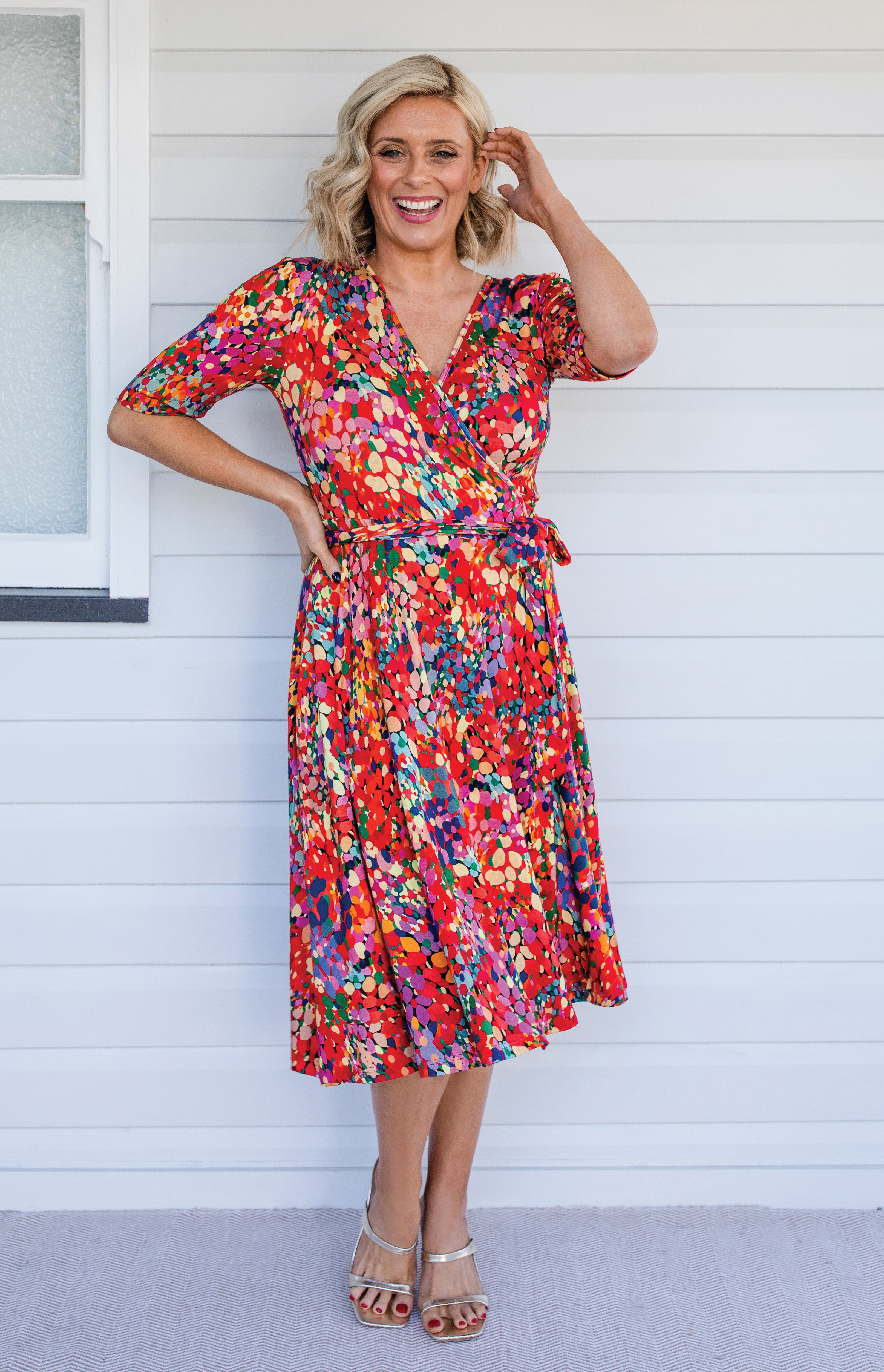 A classic wrap dress with a cinched-in waist that enhances the waistline and a soft circle skirt that twirls… it all adds up to a wardrobe winner that you'll wear and wear xo