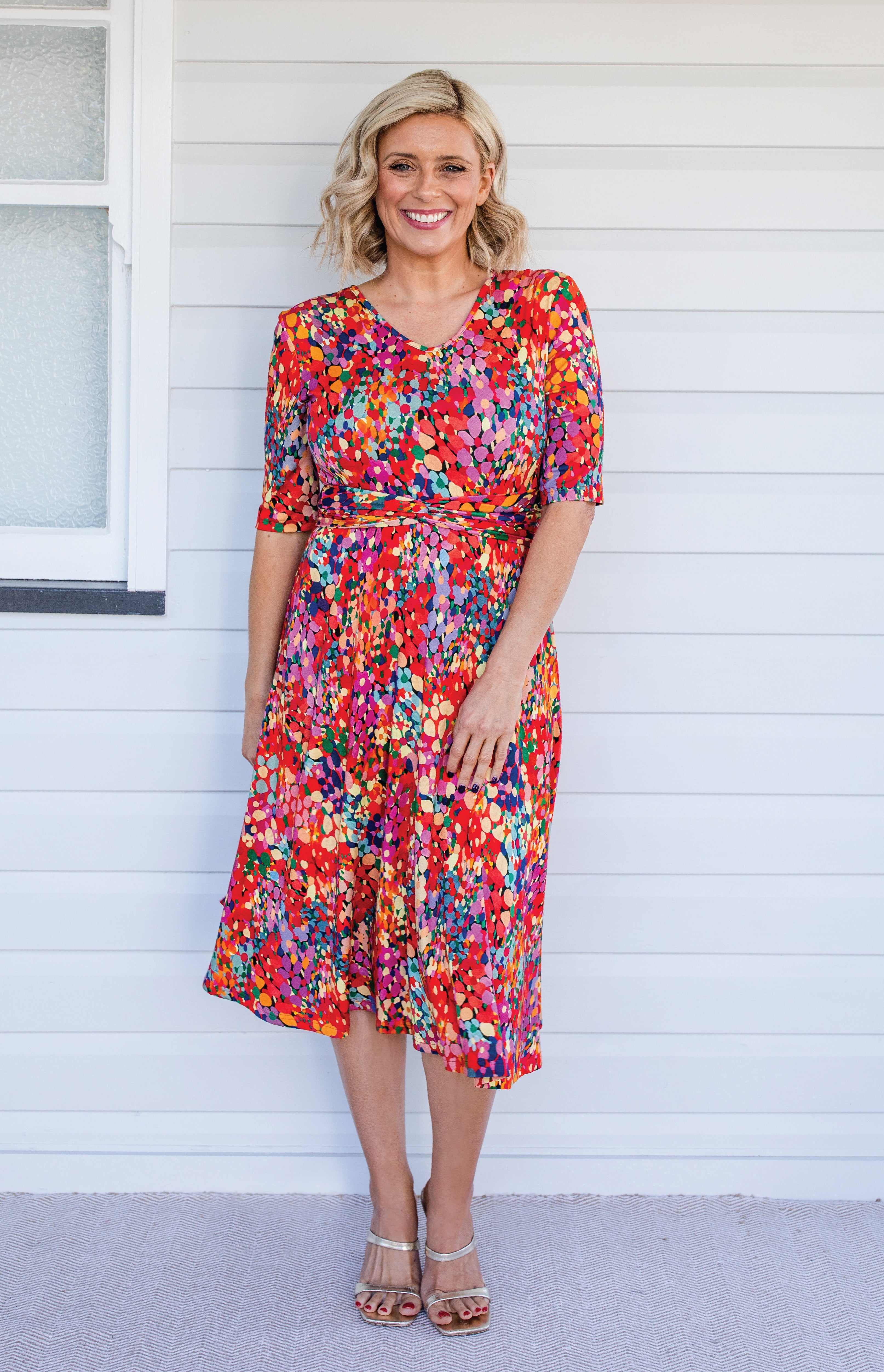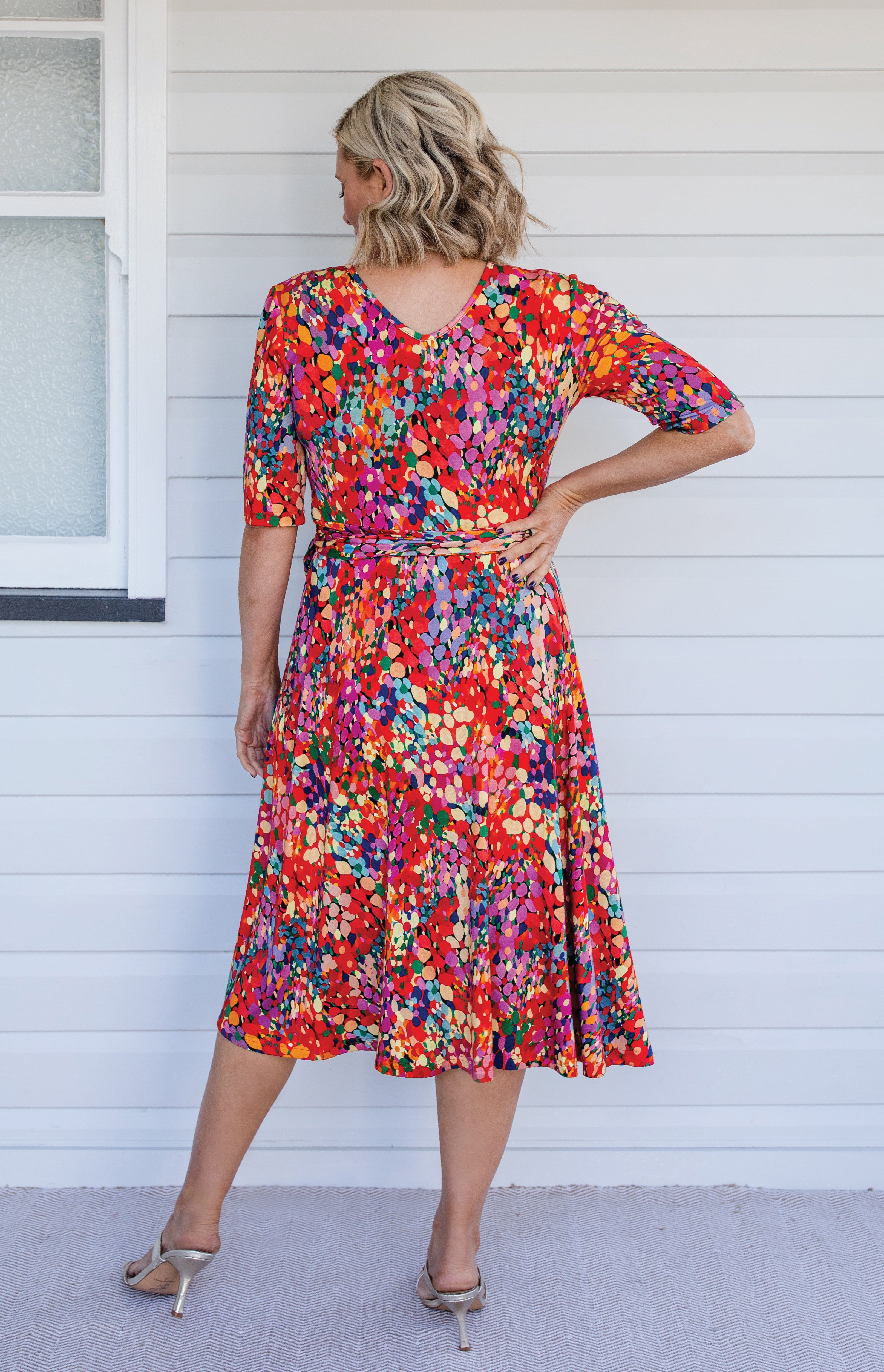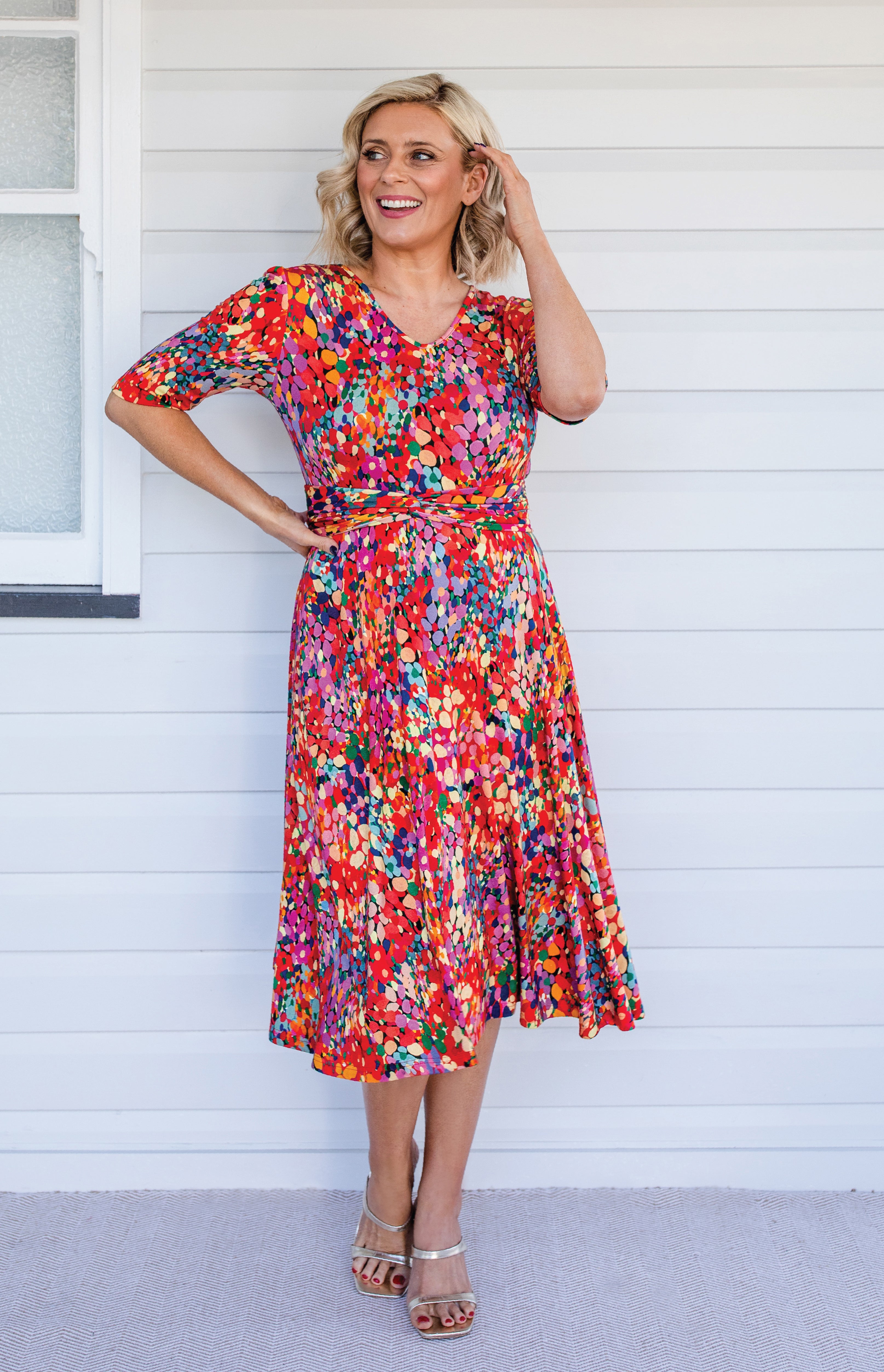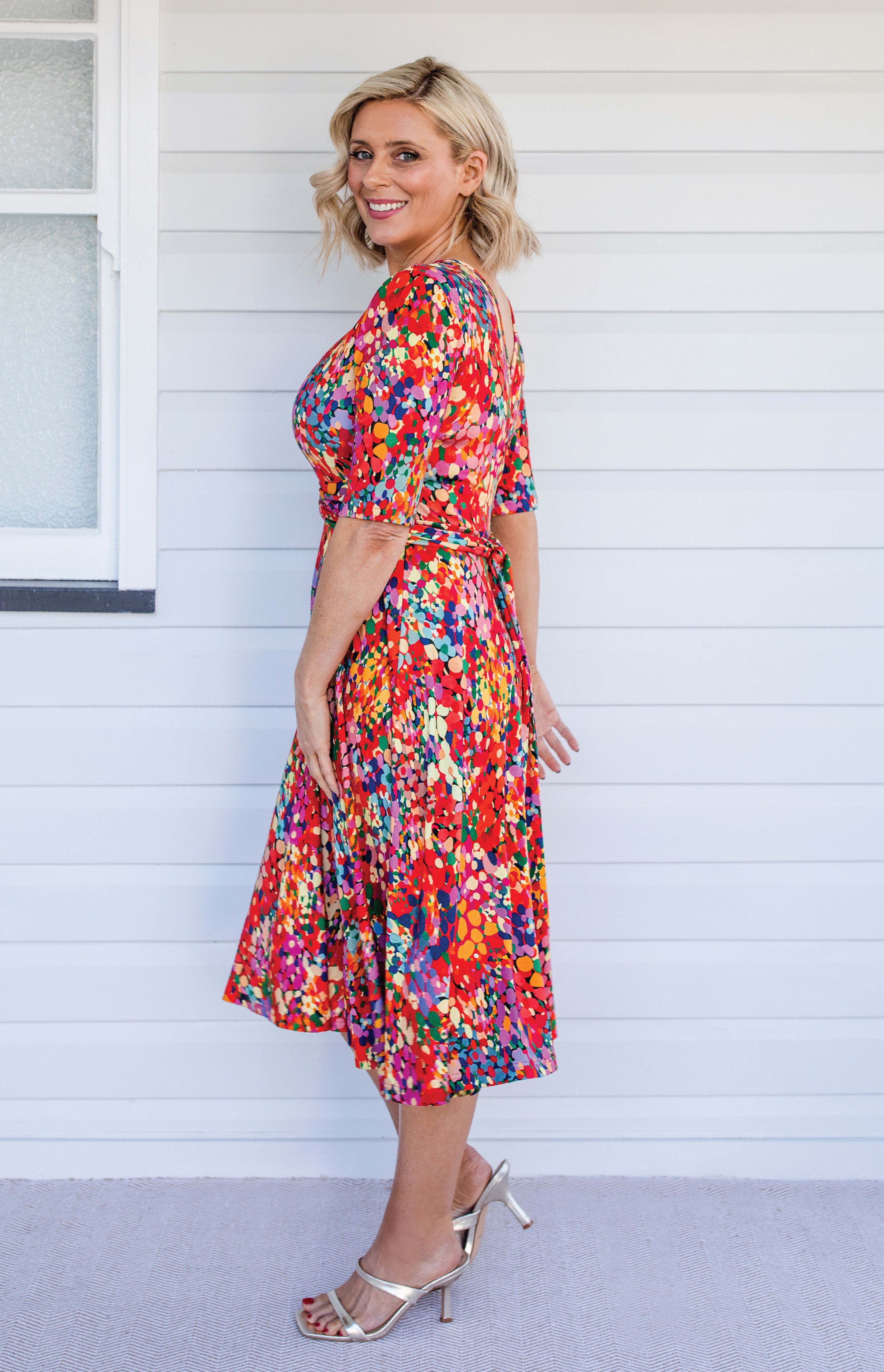 A classic wrap dress with a cinched-in waist that enhances the waistline and a soft circle skirt that twirls… it all adds up to a wardrobe winner that you'll wear and wear xo