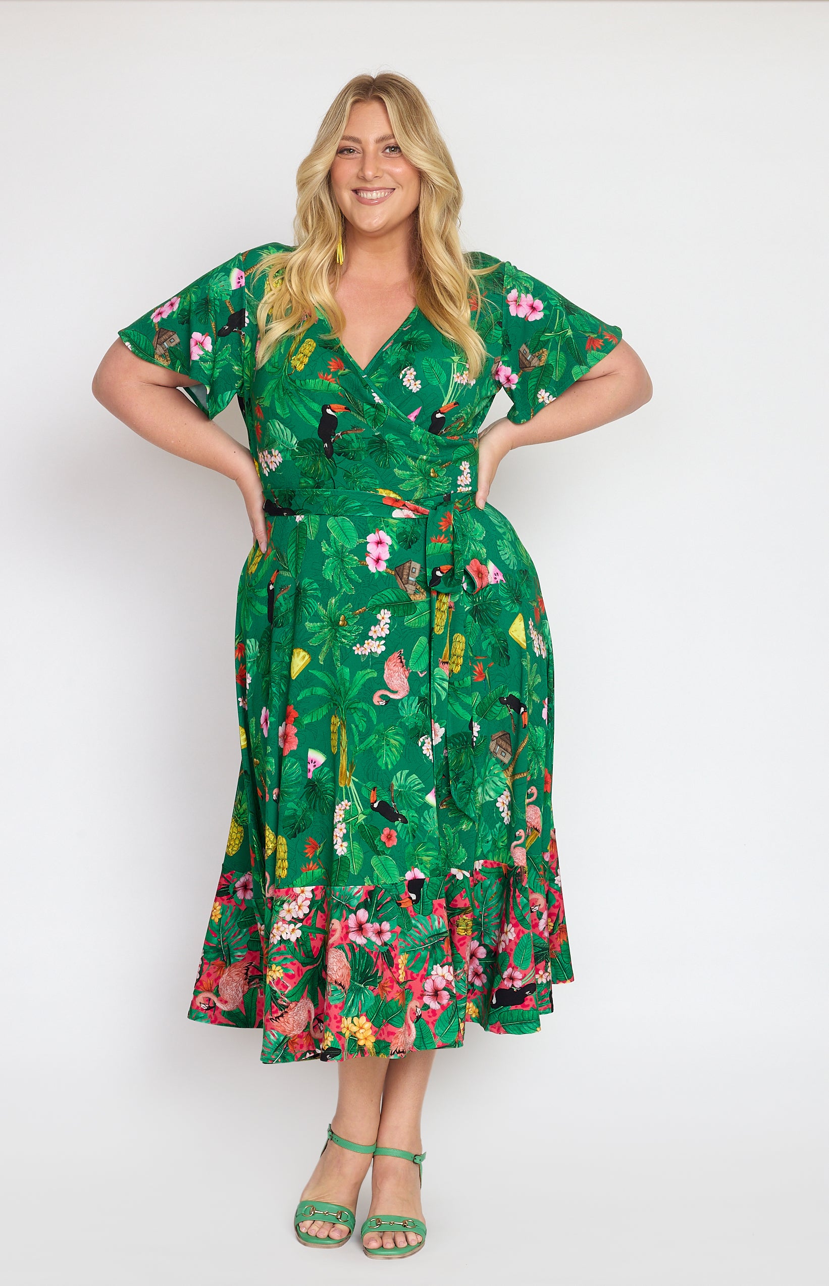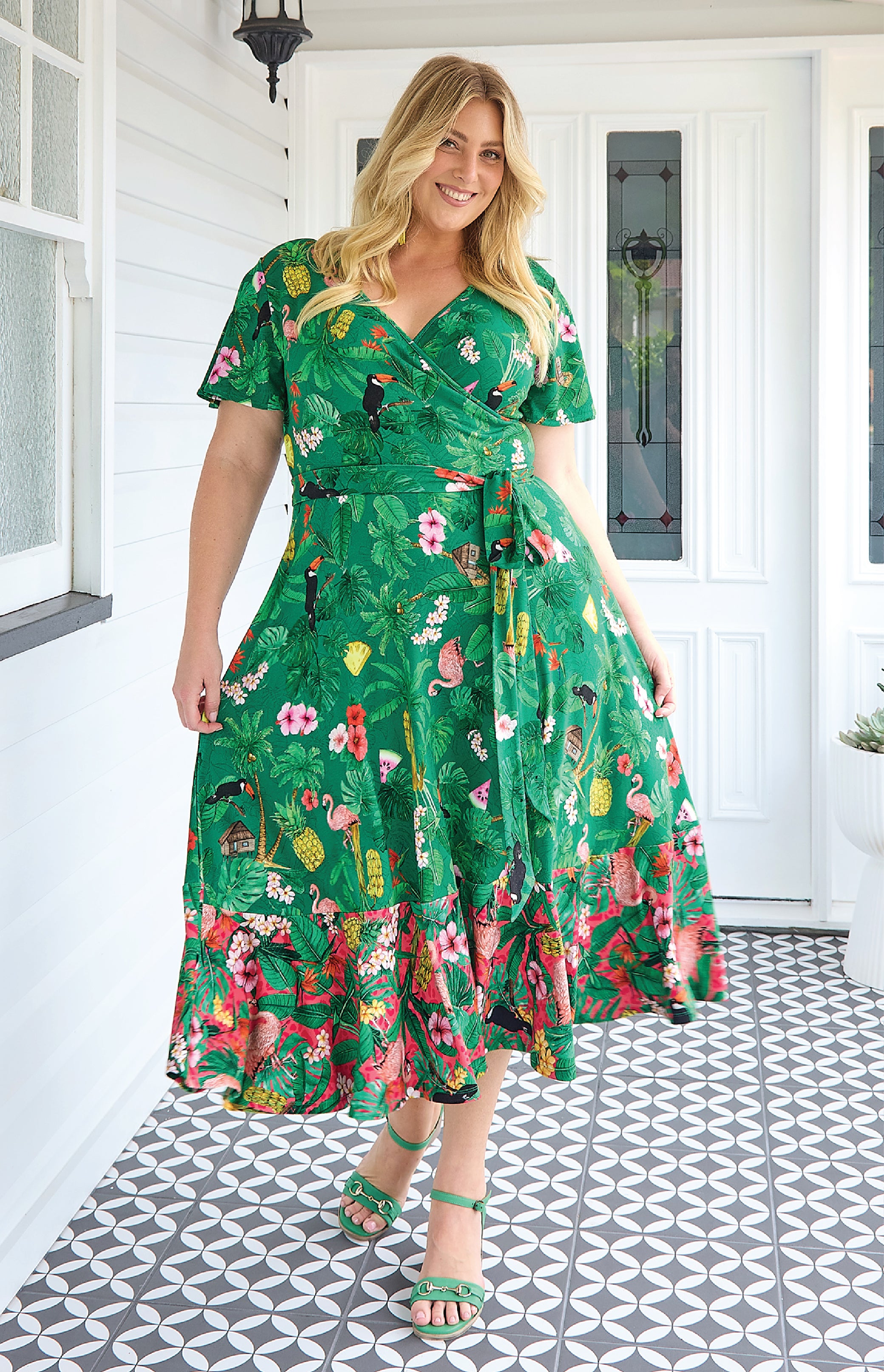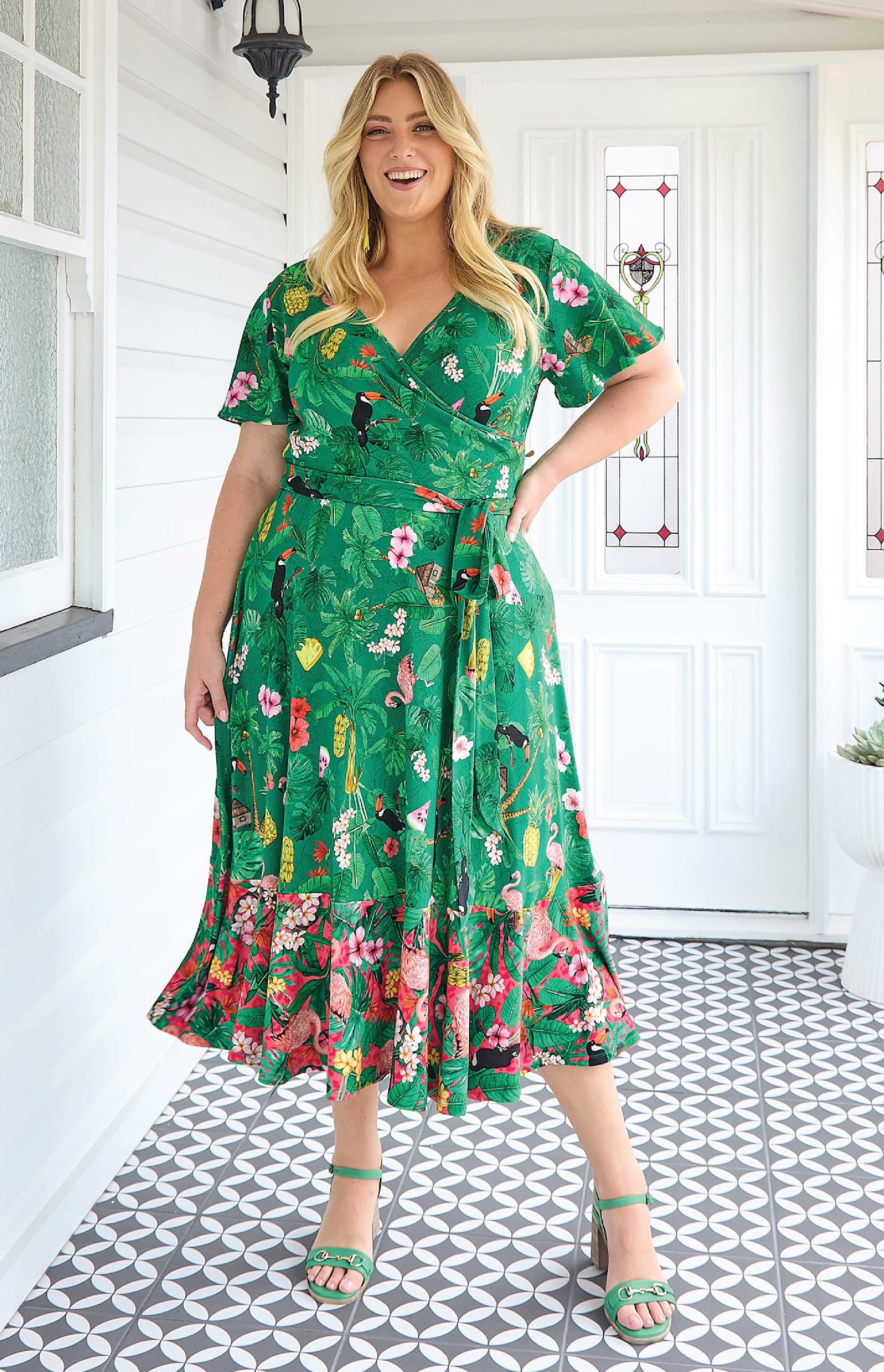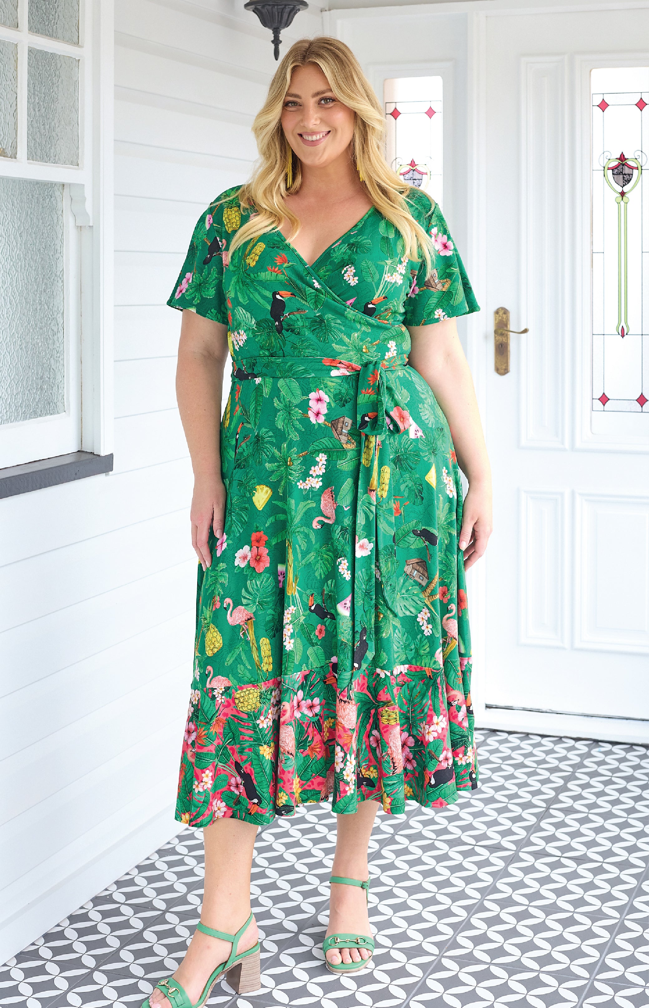Our model Caitlin (blonde) is wearing size 18. Her bust is 115cm; Waist 100cm; Hip: 125.5cm.