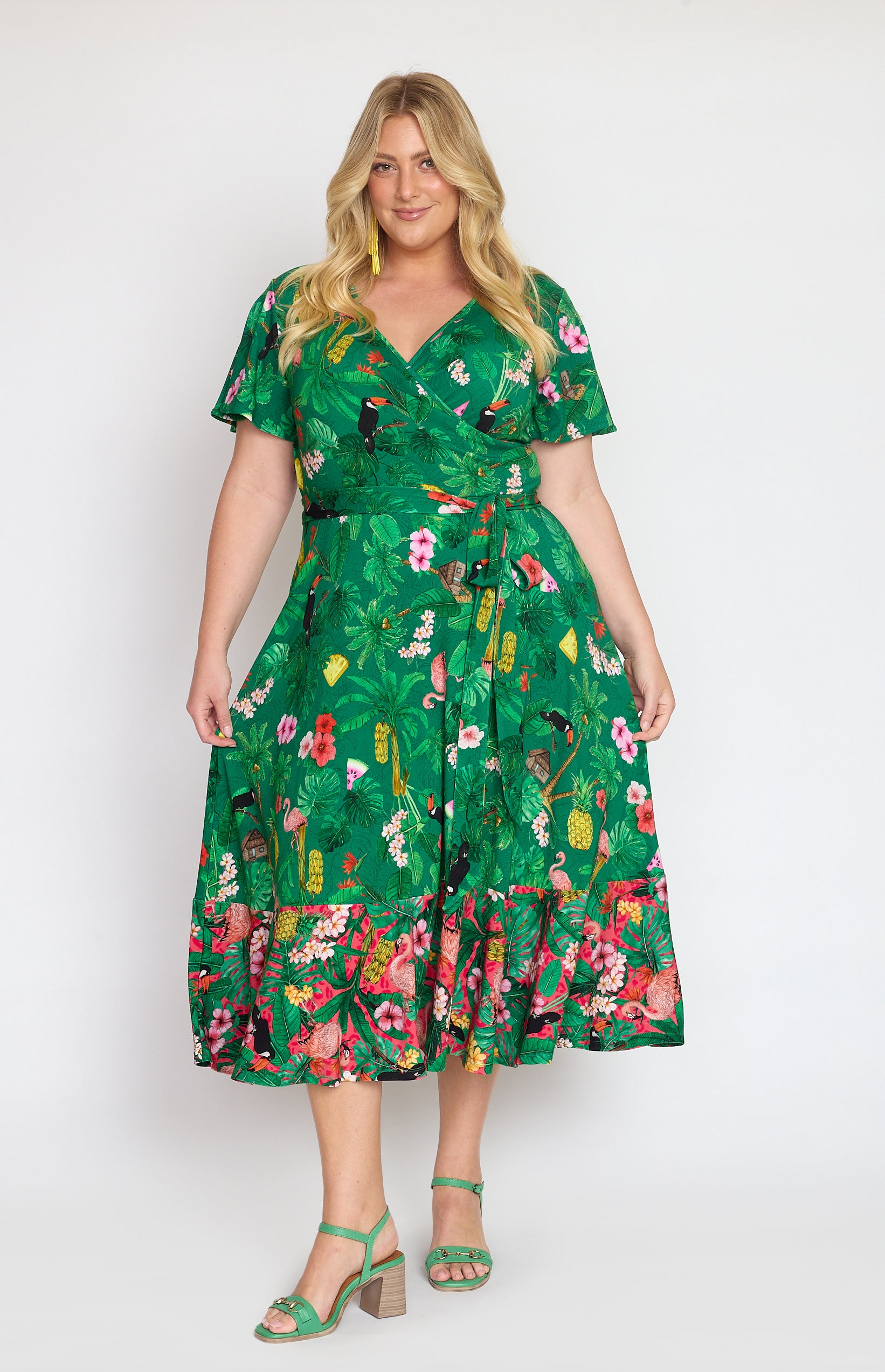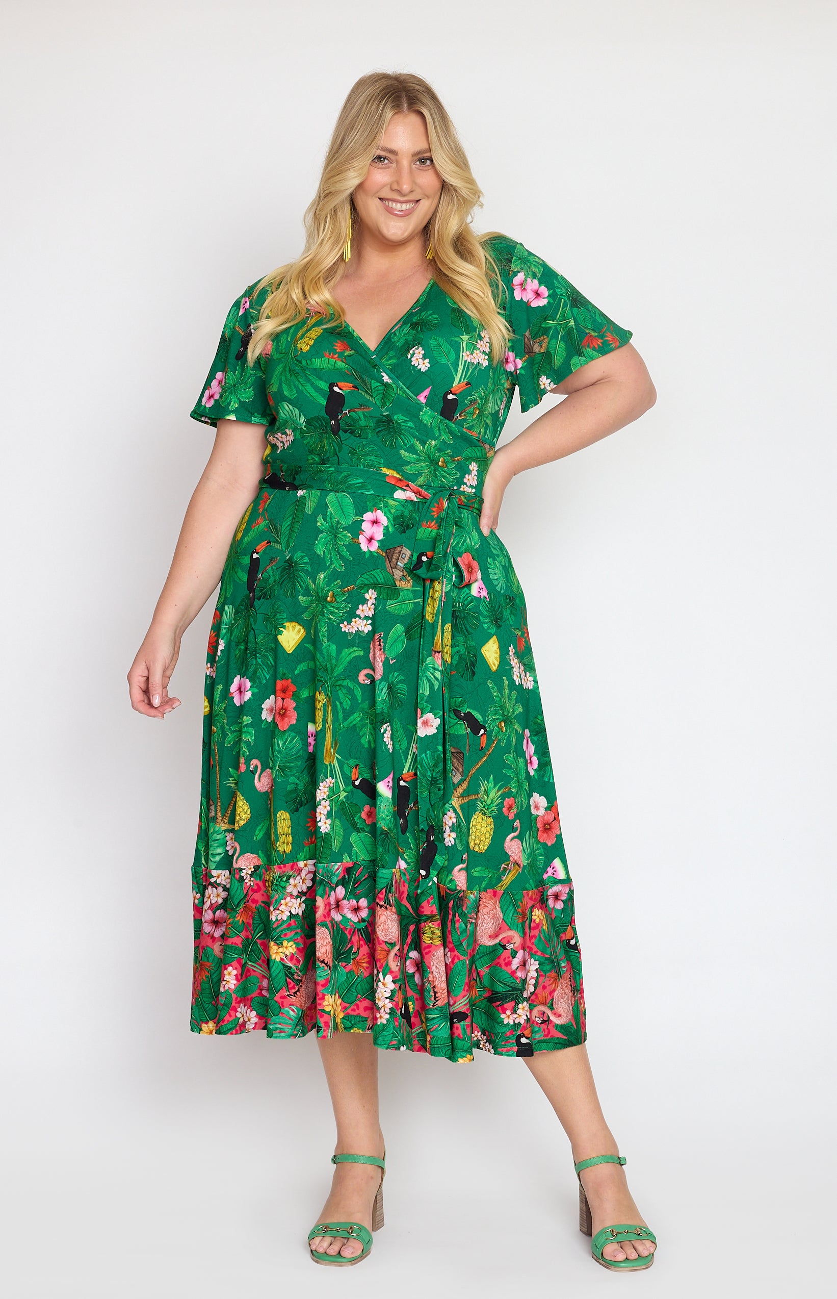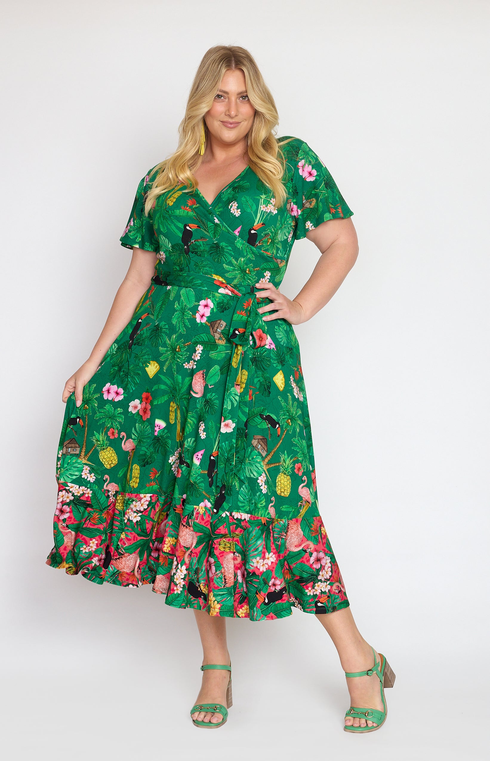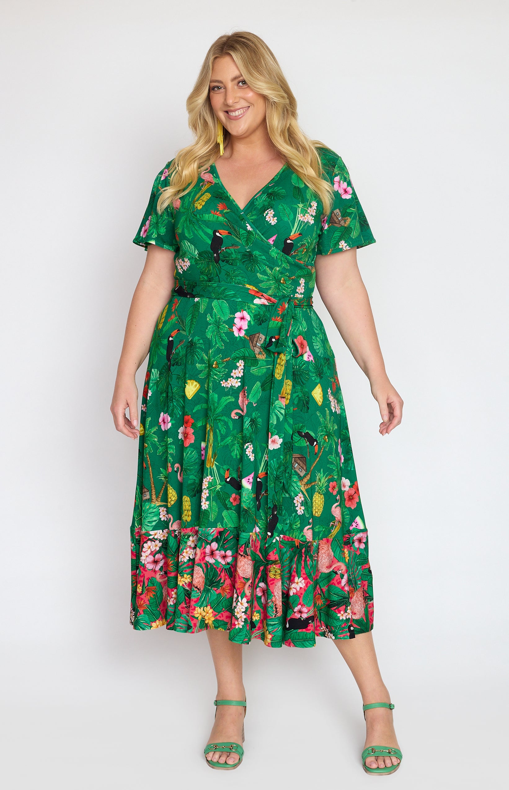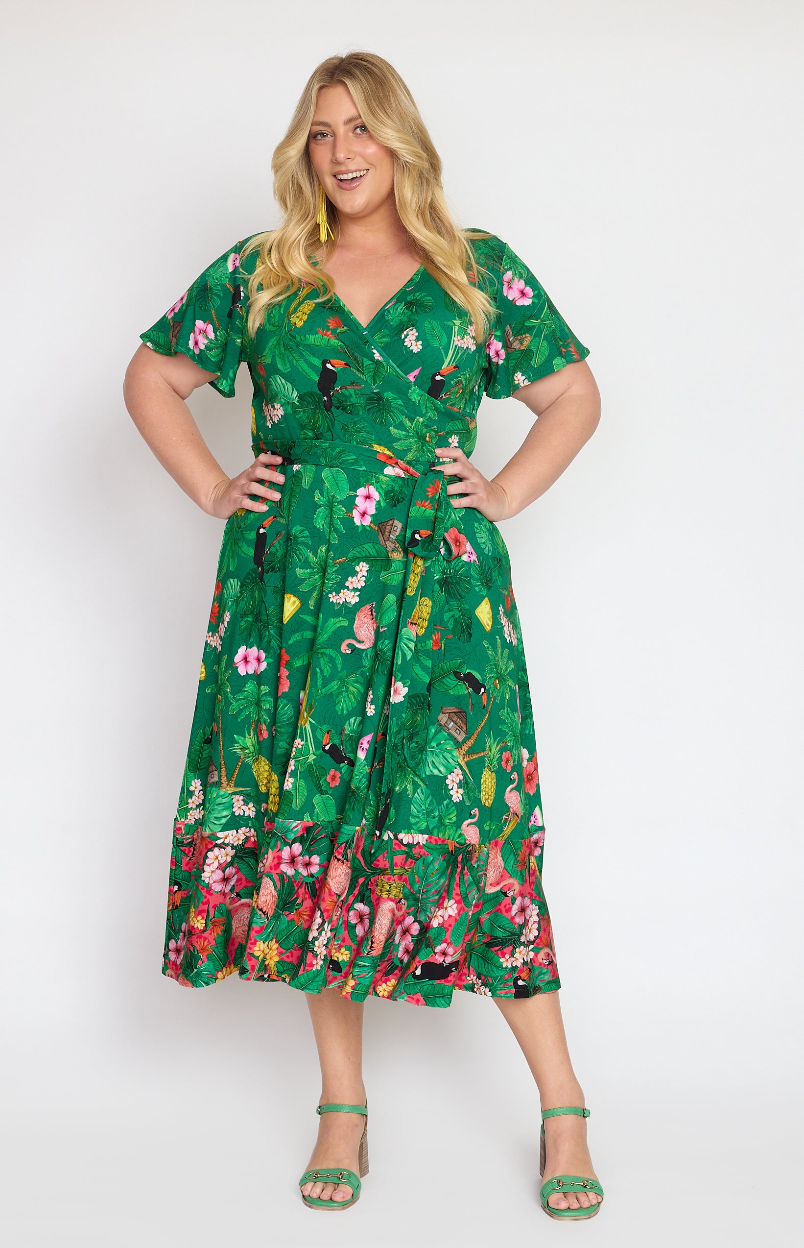 Our model Caitlin (blonde) is wearing size 18. Her bust is 115cm; Waist 100cm; Hip: 125.5cm.