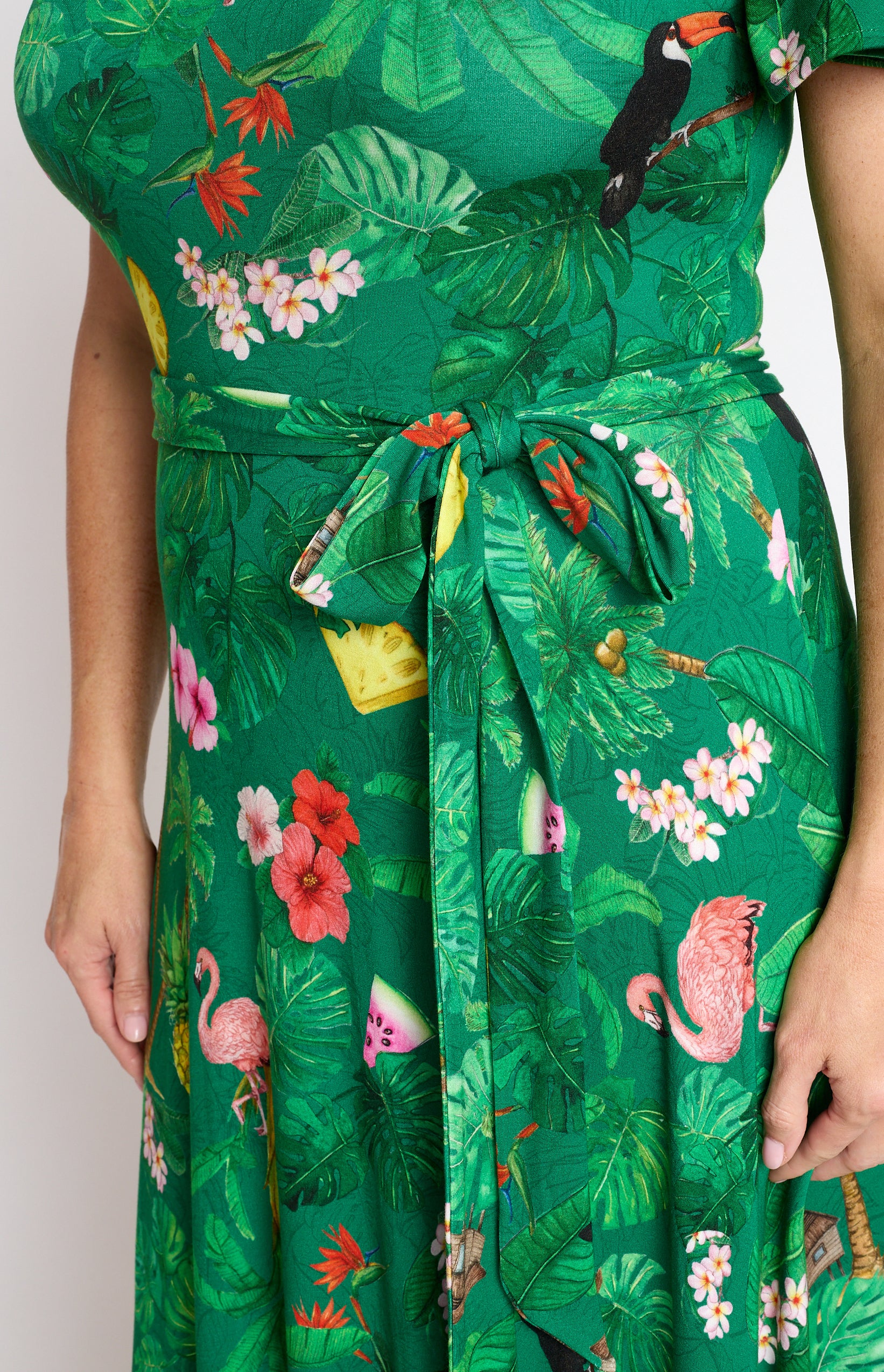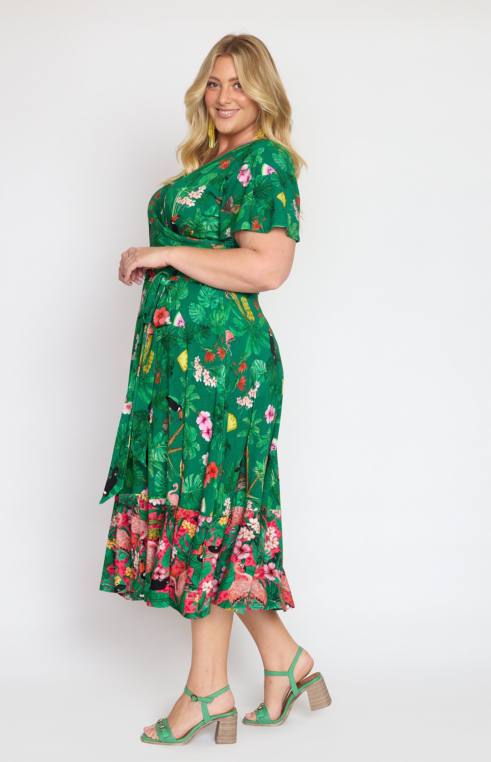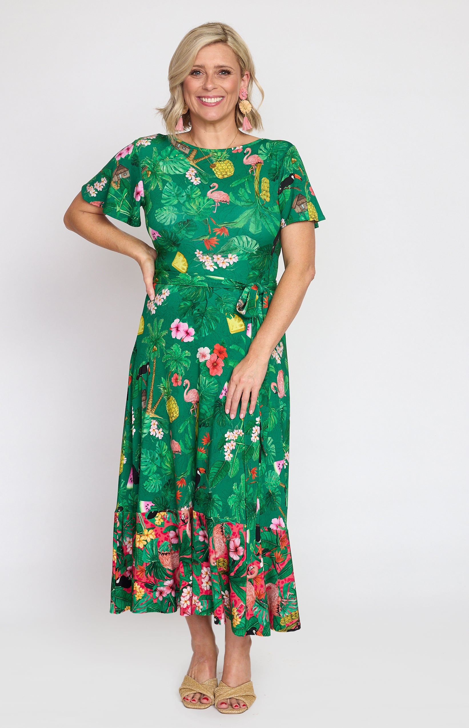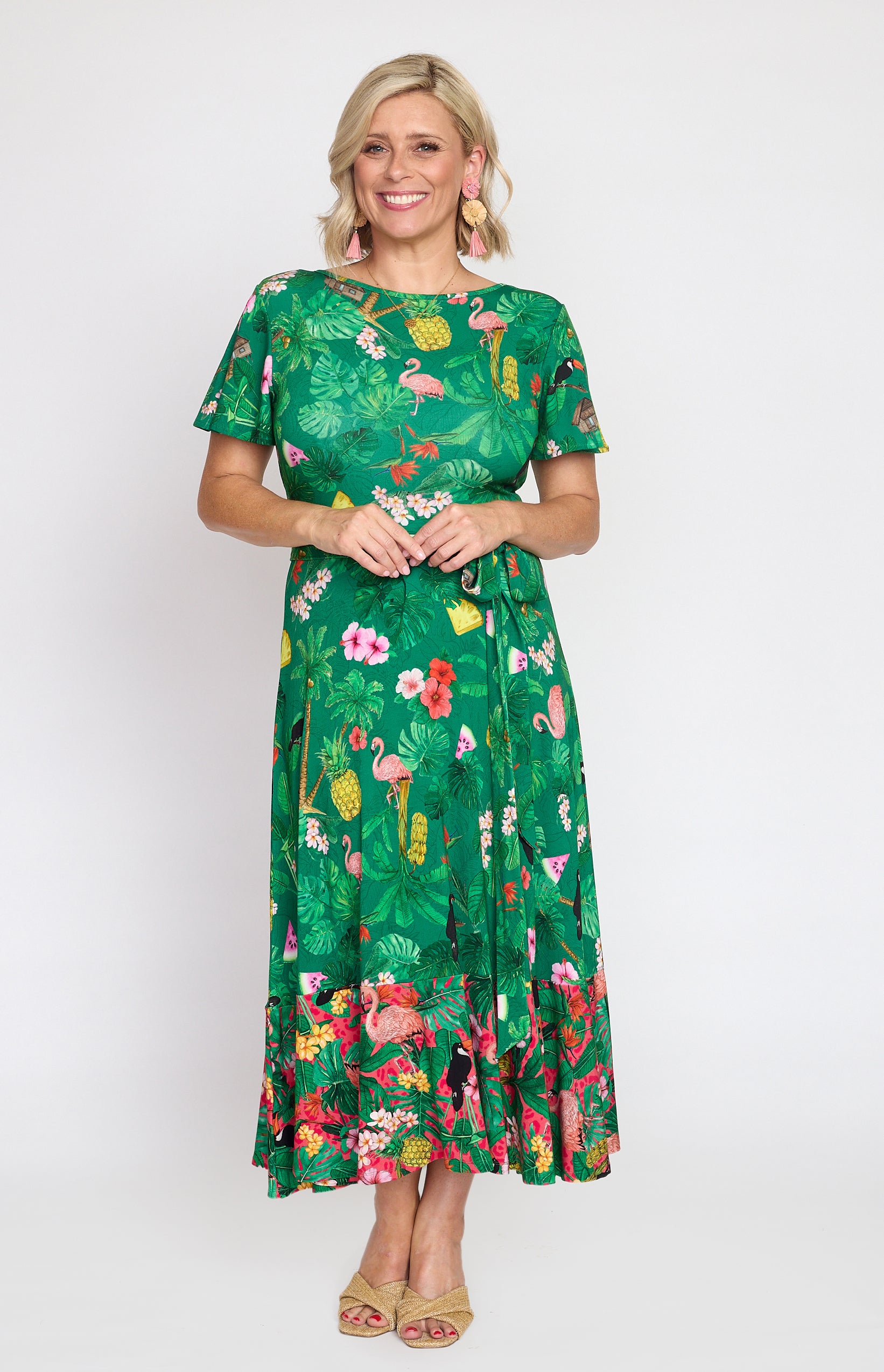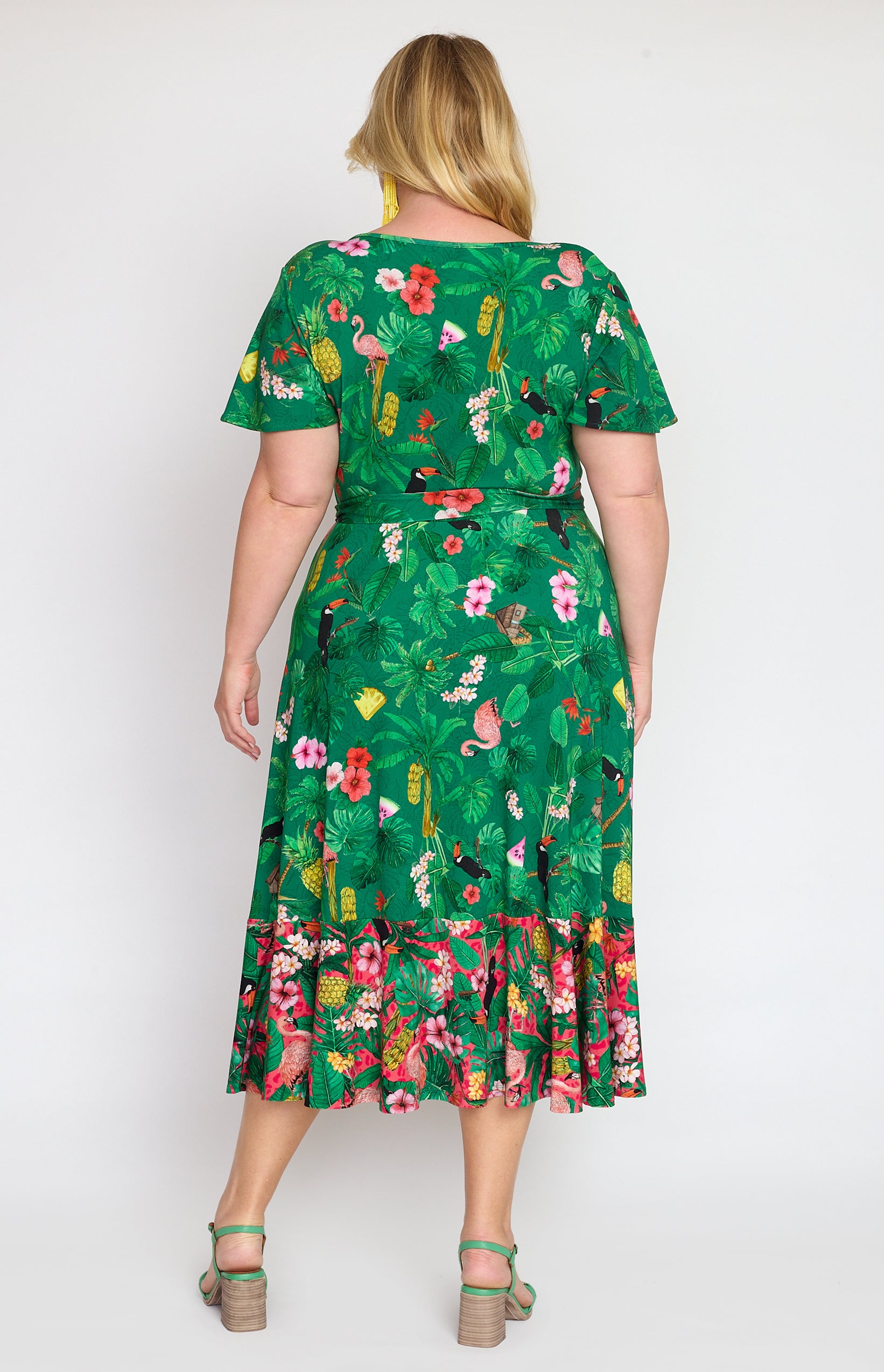 She is extra fancy with a wide flared ruffle around the hem in a contrast print and flared sleeve, and she comes with a matching belt.