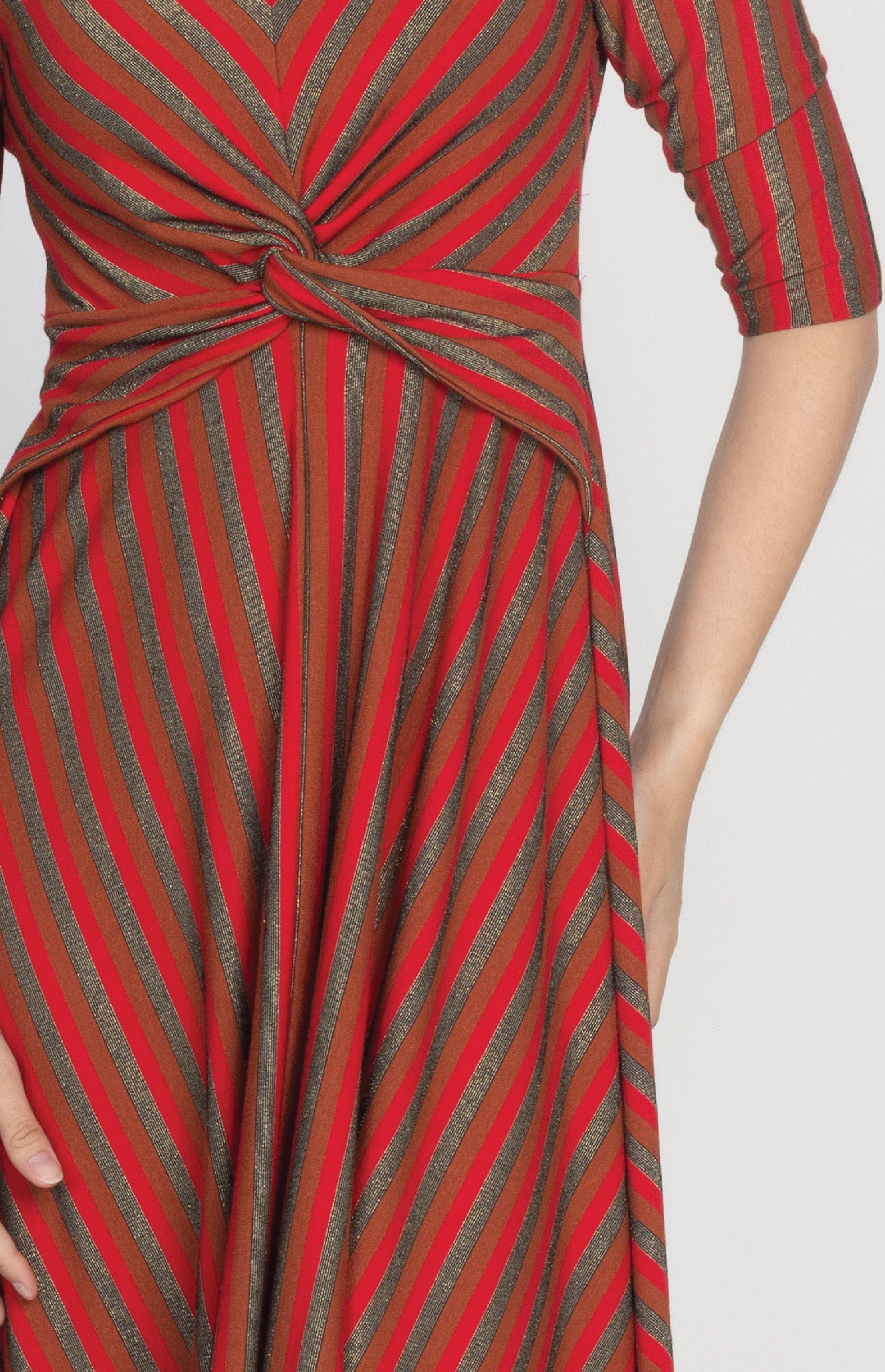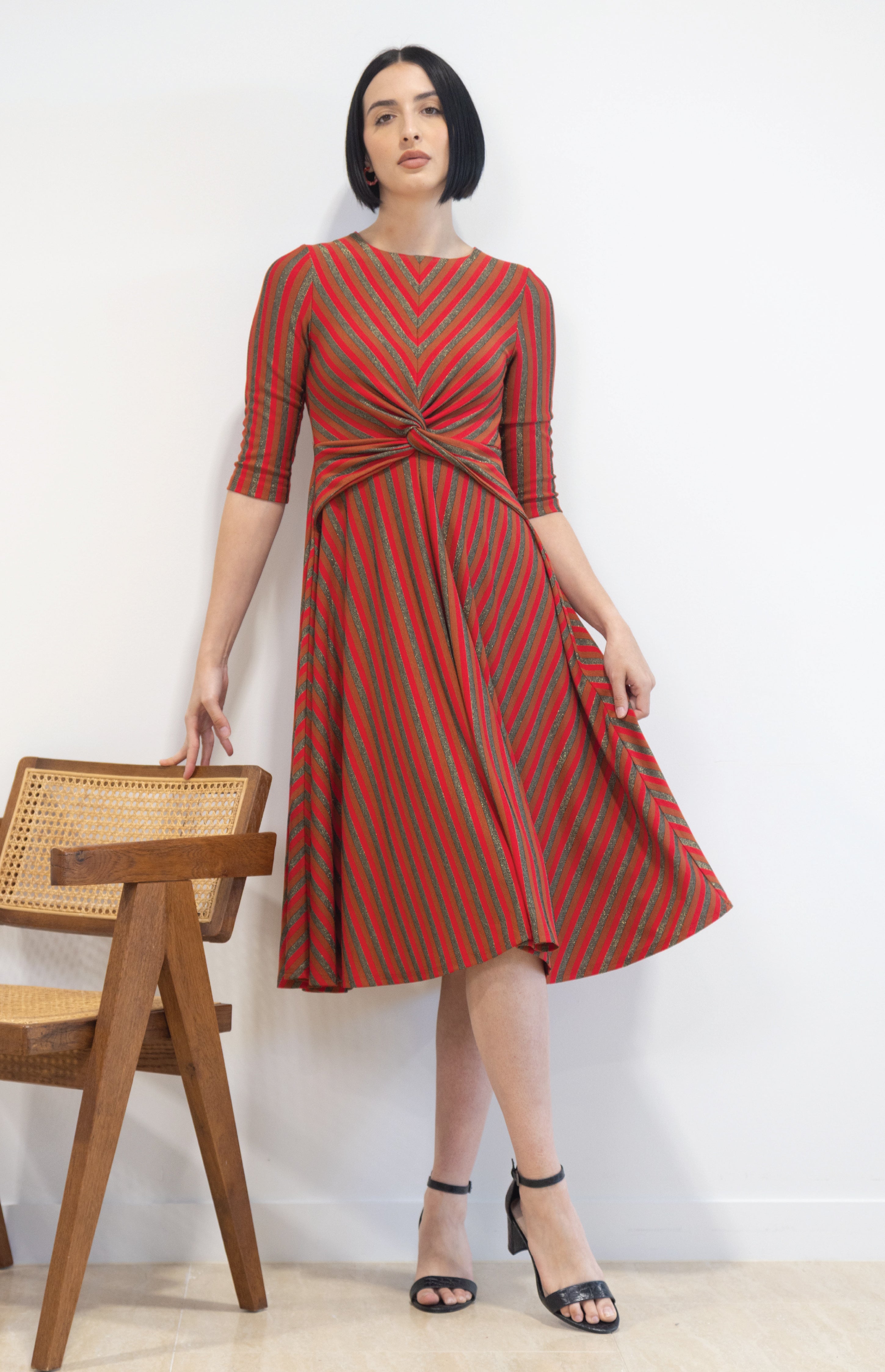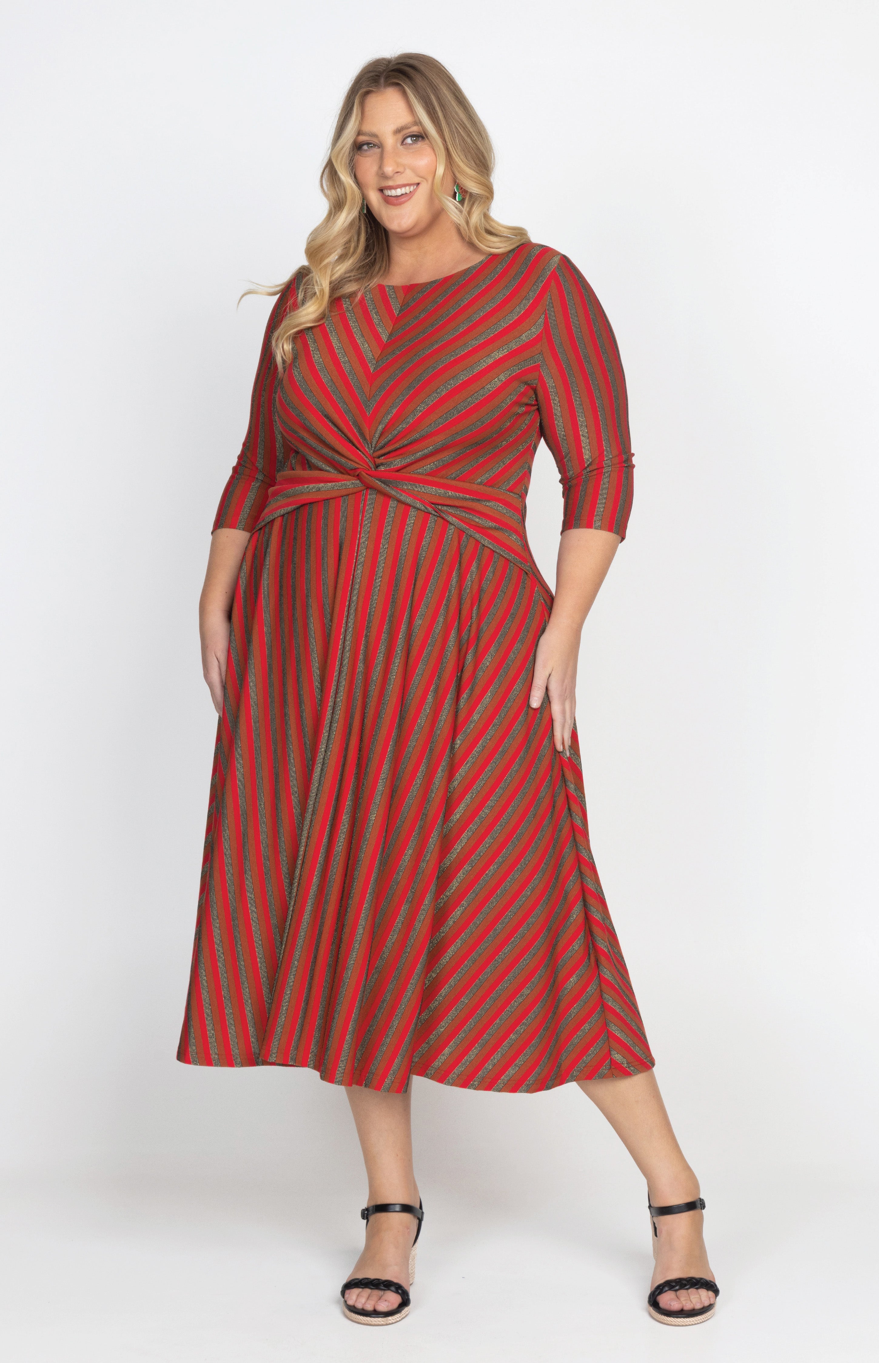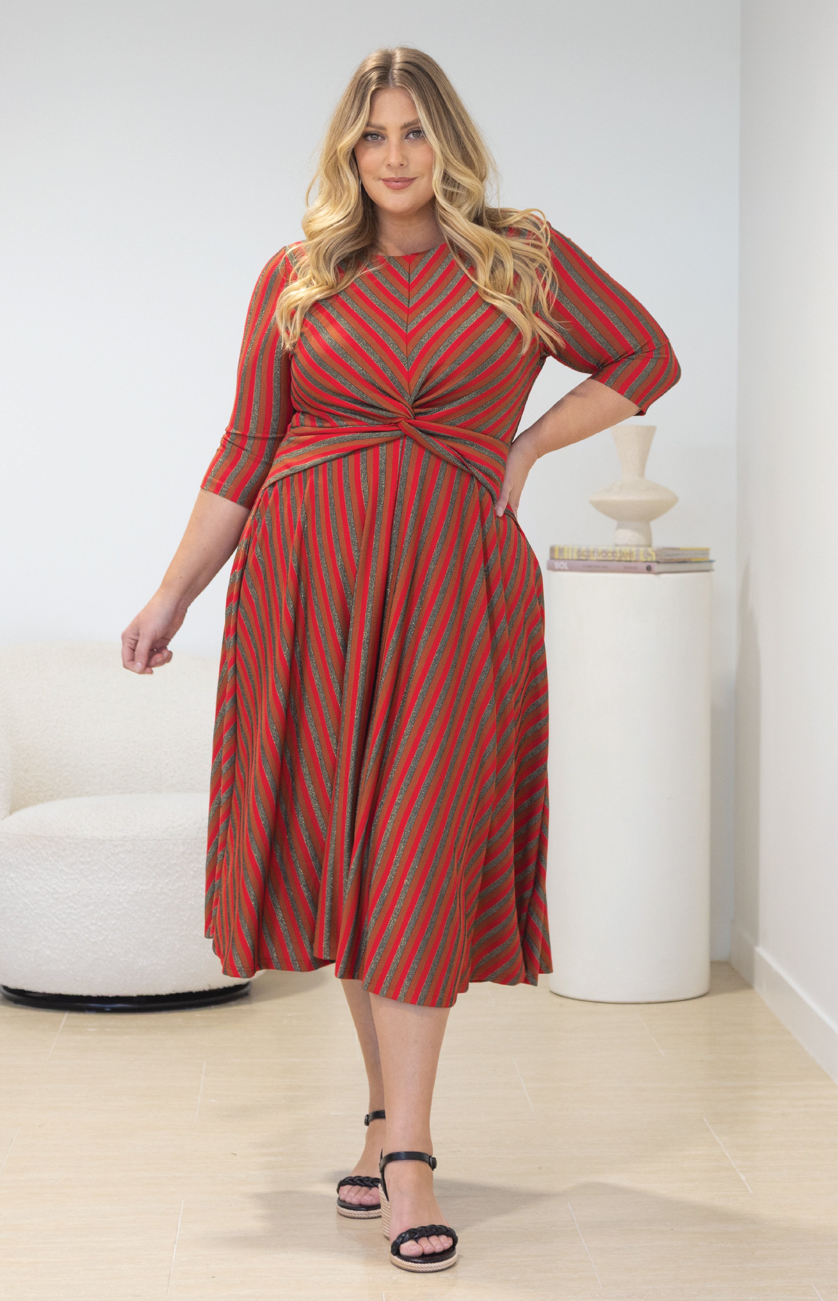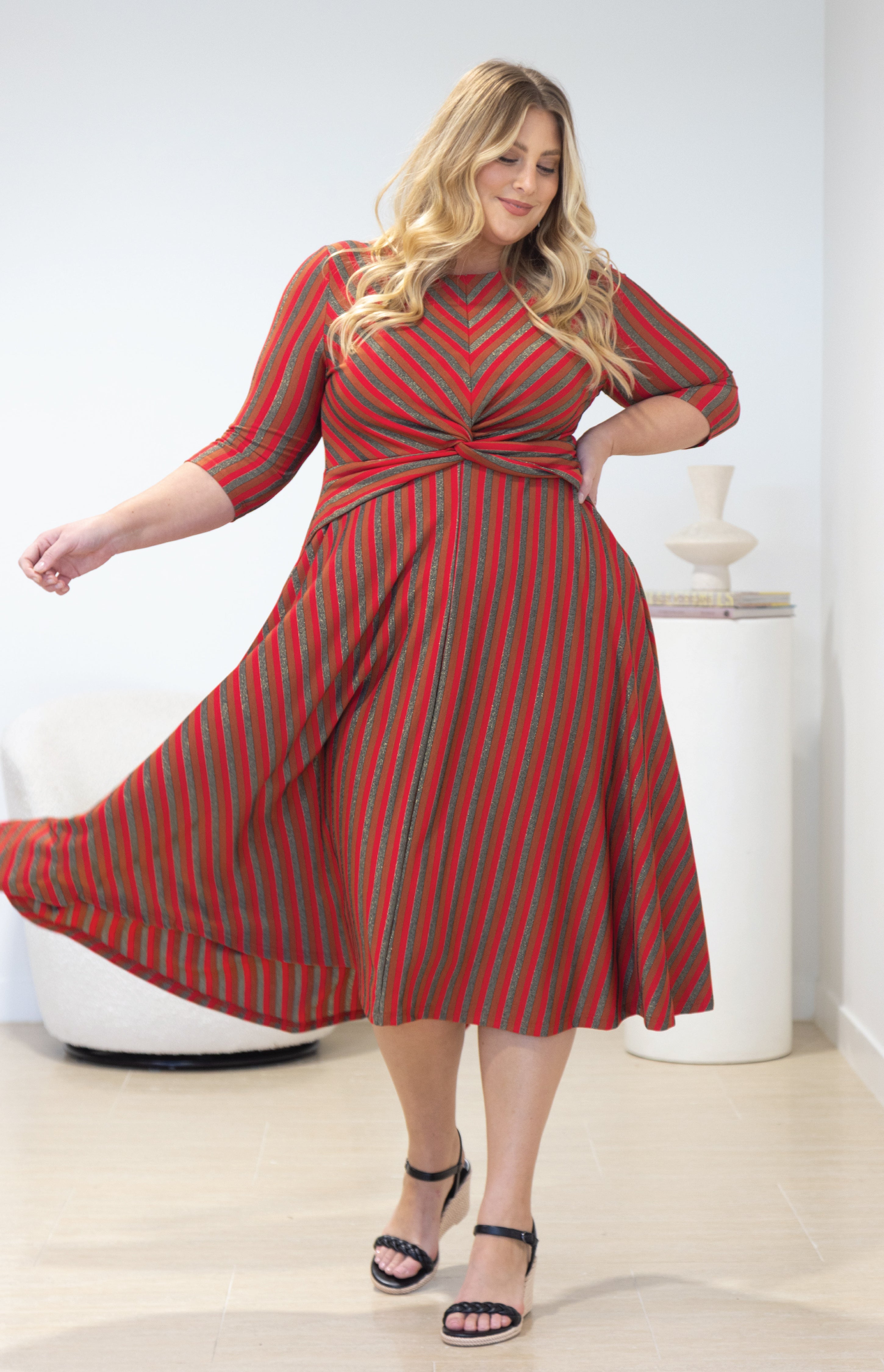 Made in glittering sparkle stripe fabric, she’s designed with a twist detail at the waist to create a striking hourglass silhouette.
