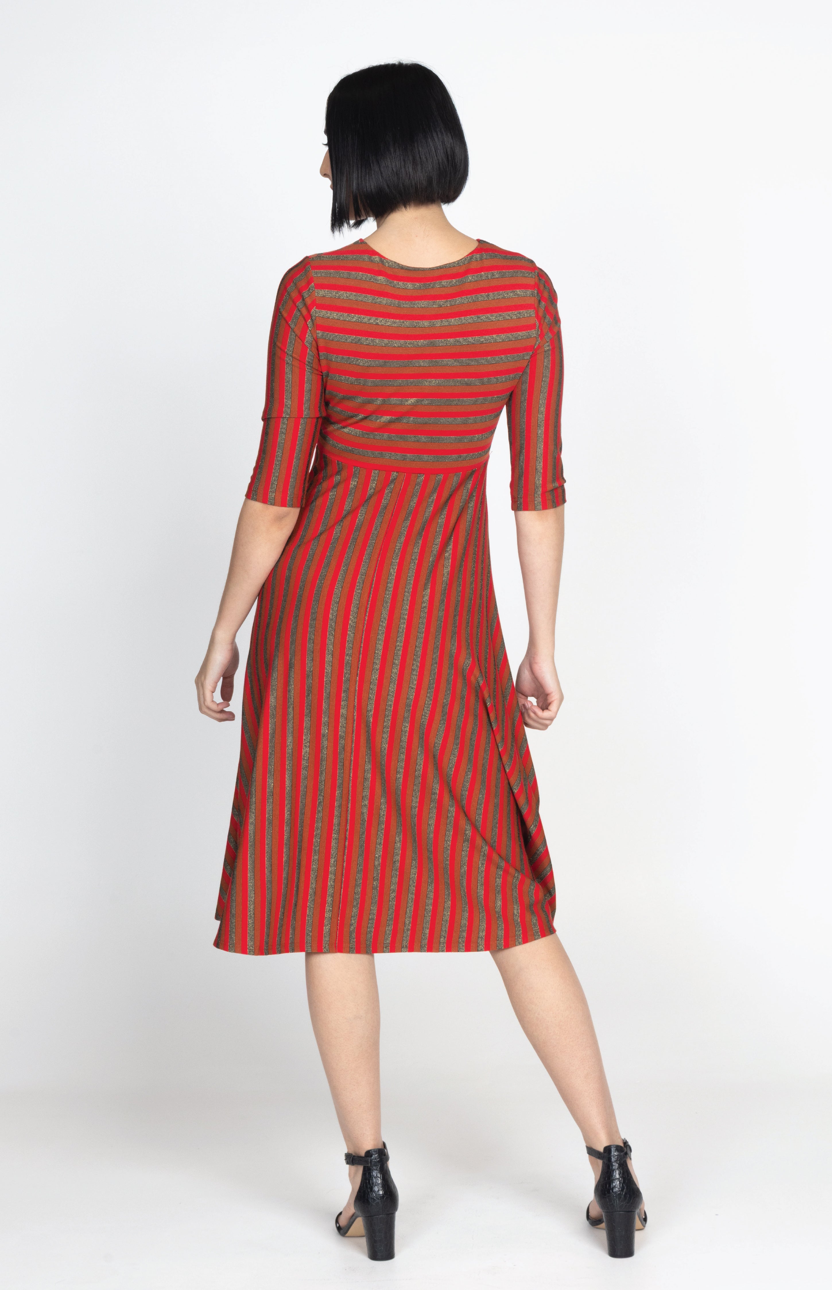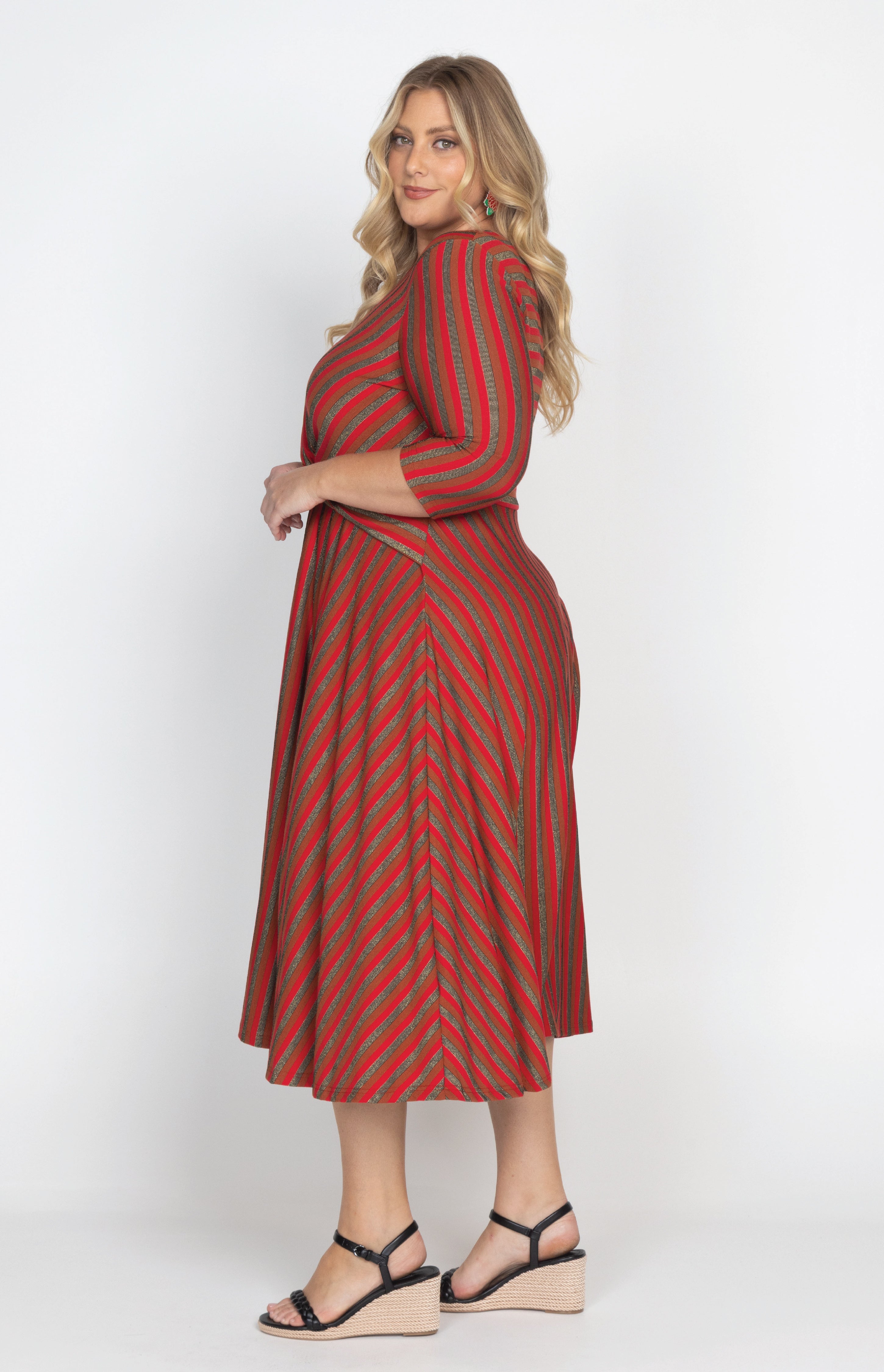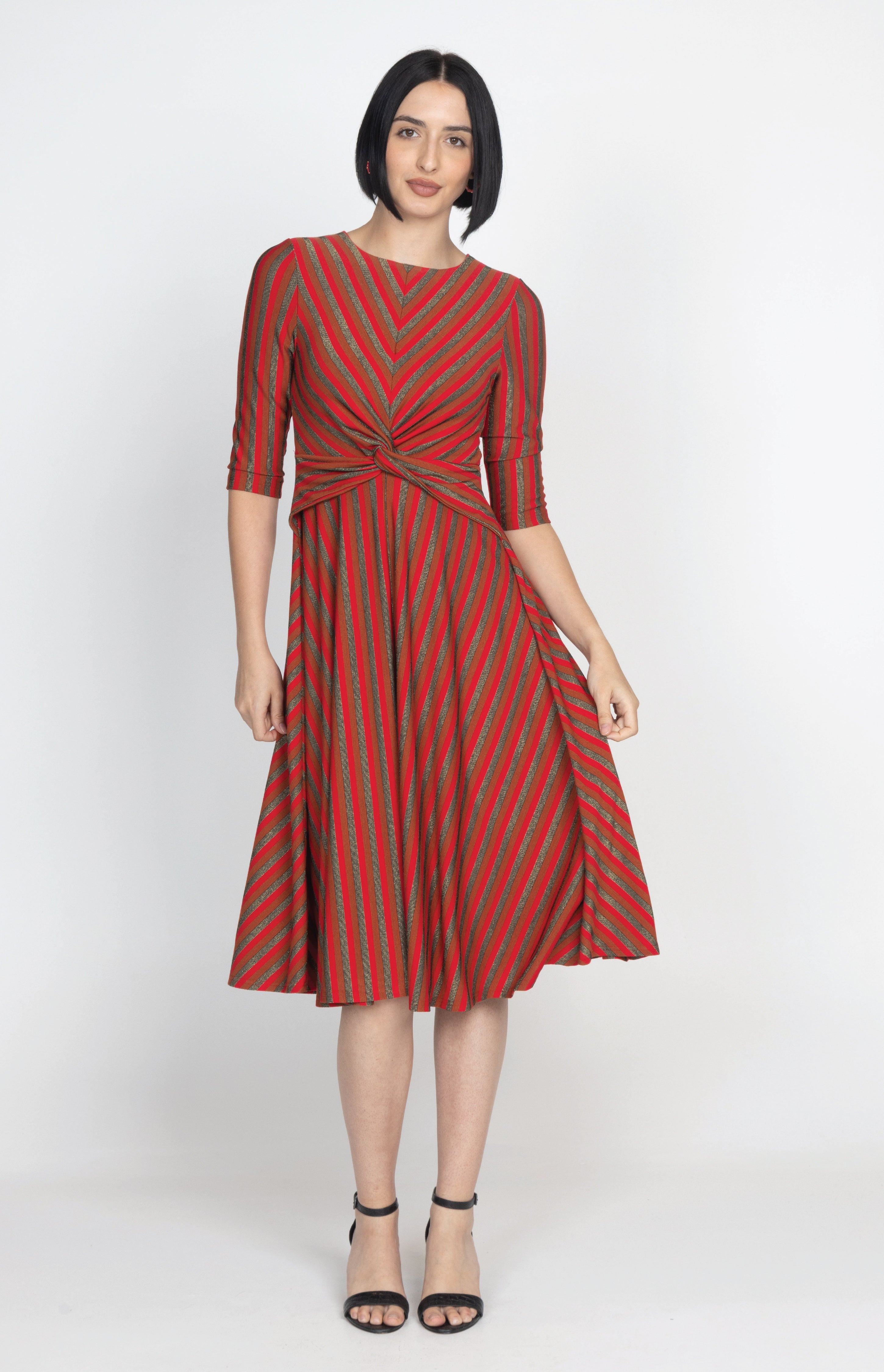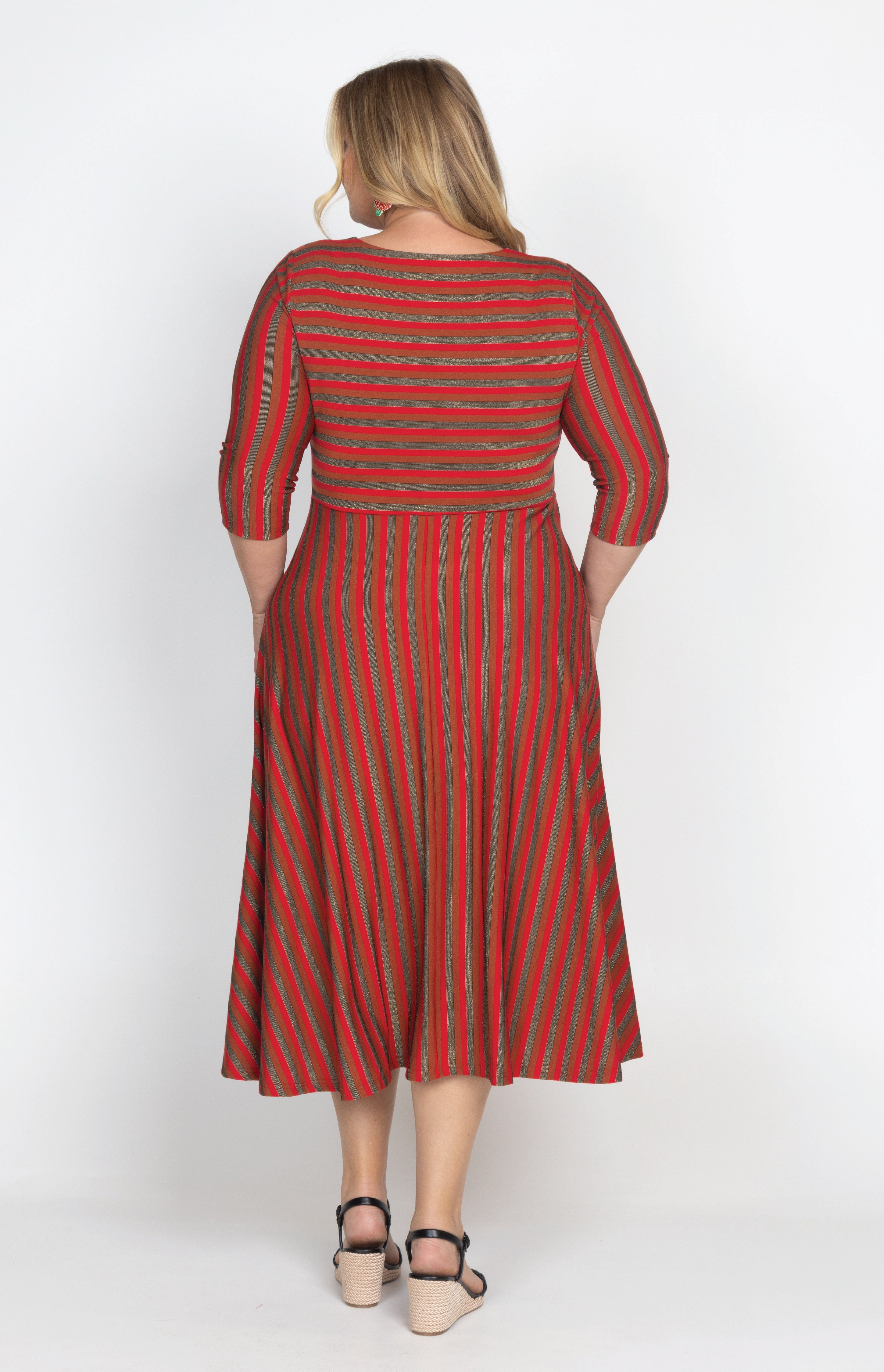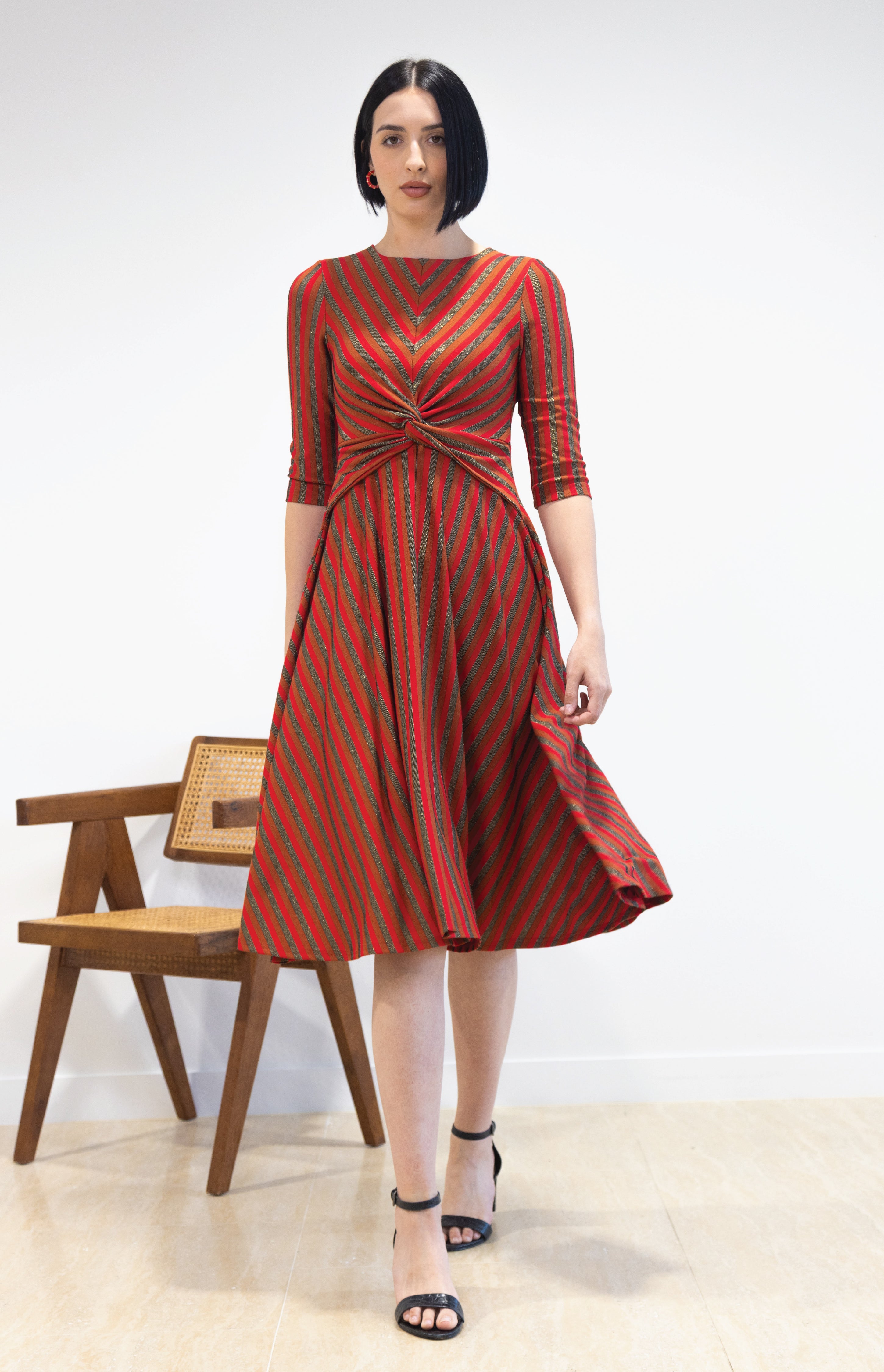 Made in glittering sparkle stripe fabric, she’s designed with a twist detail at the waist to create a striking hourglass silhouette.