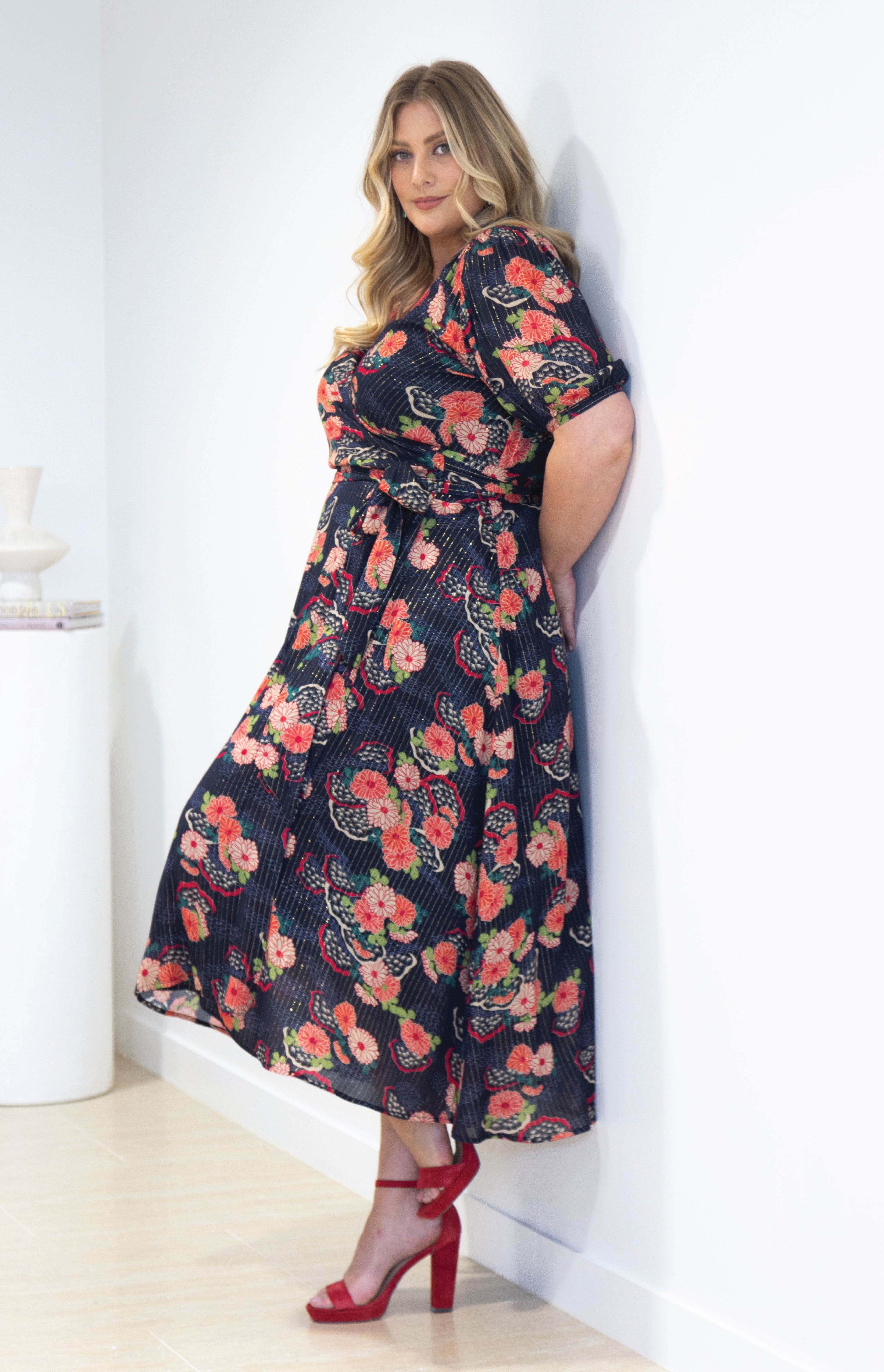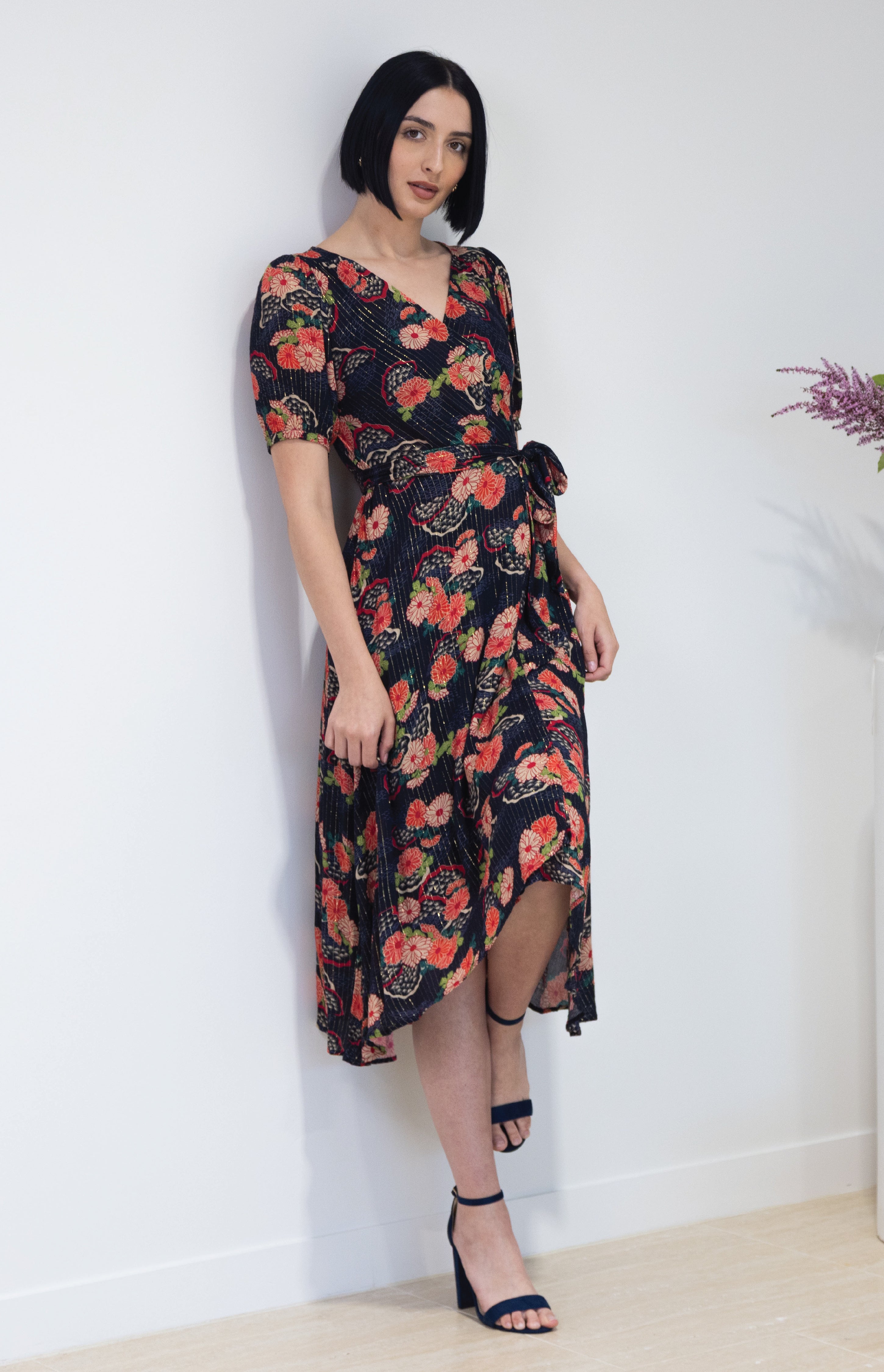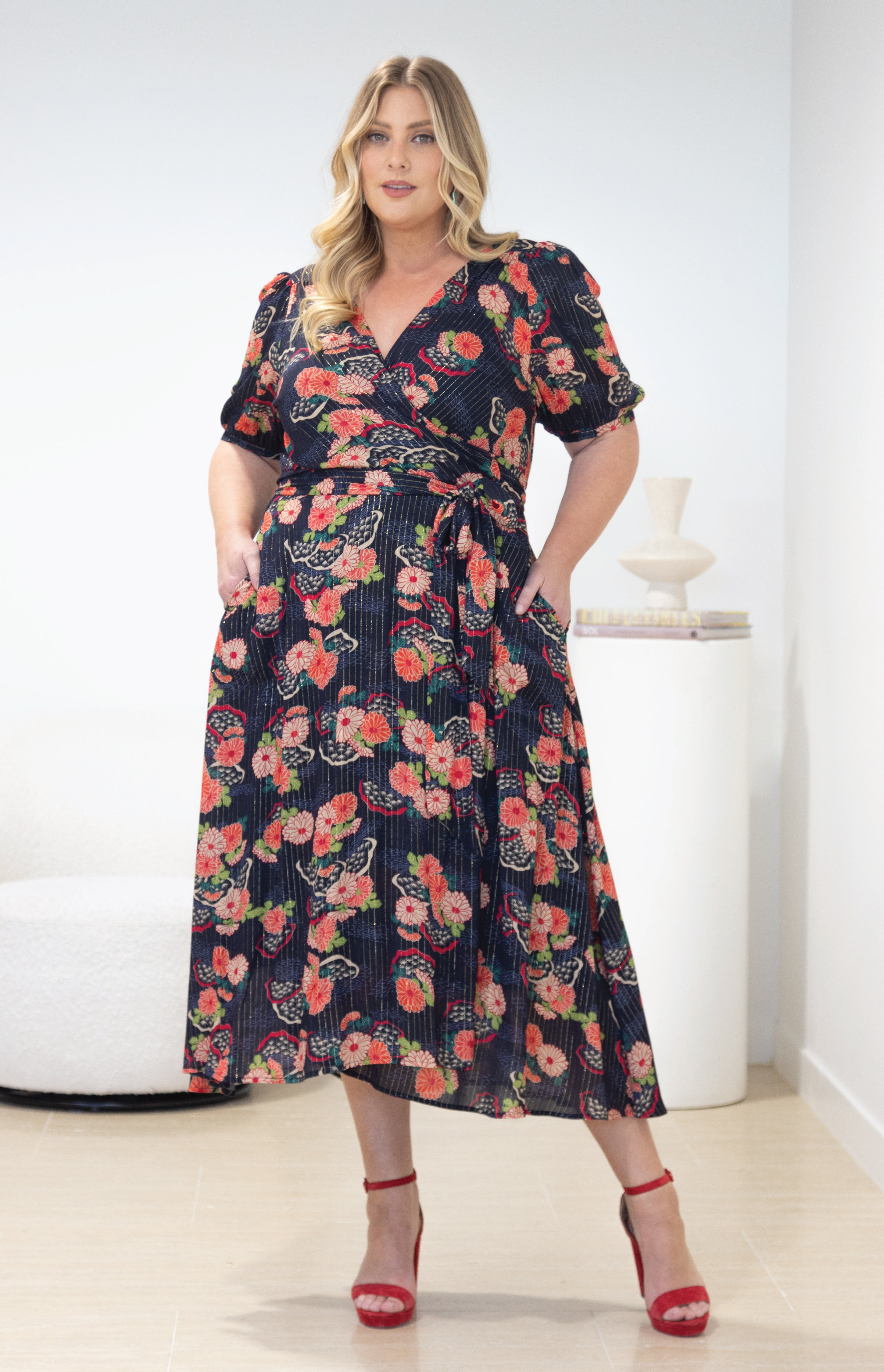 Our new Scarlett Dress is a true wrap silhouette crafted in a sheer fabric with a subtle sparkle stripe, and she comes complete with a separate slip dress for comfort and coverage.