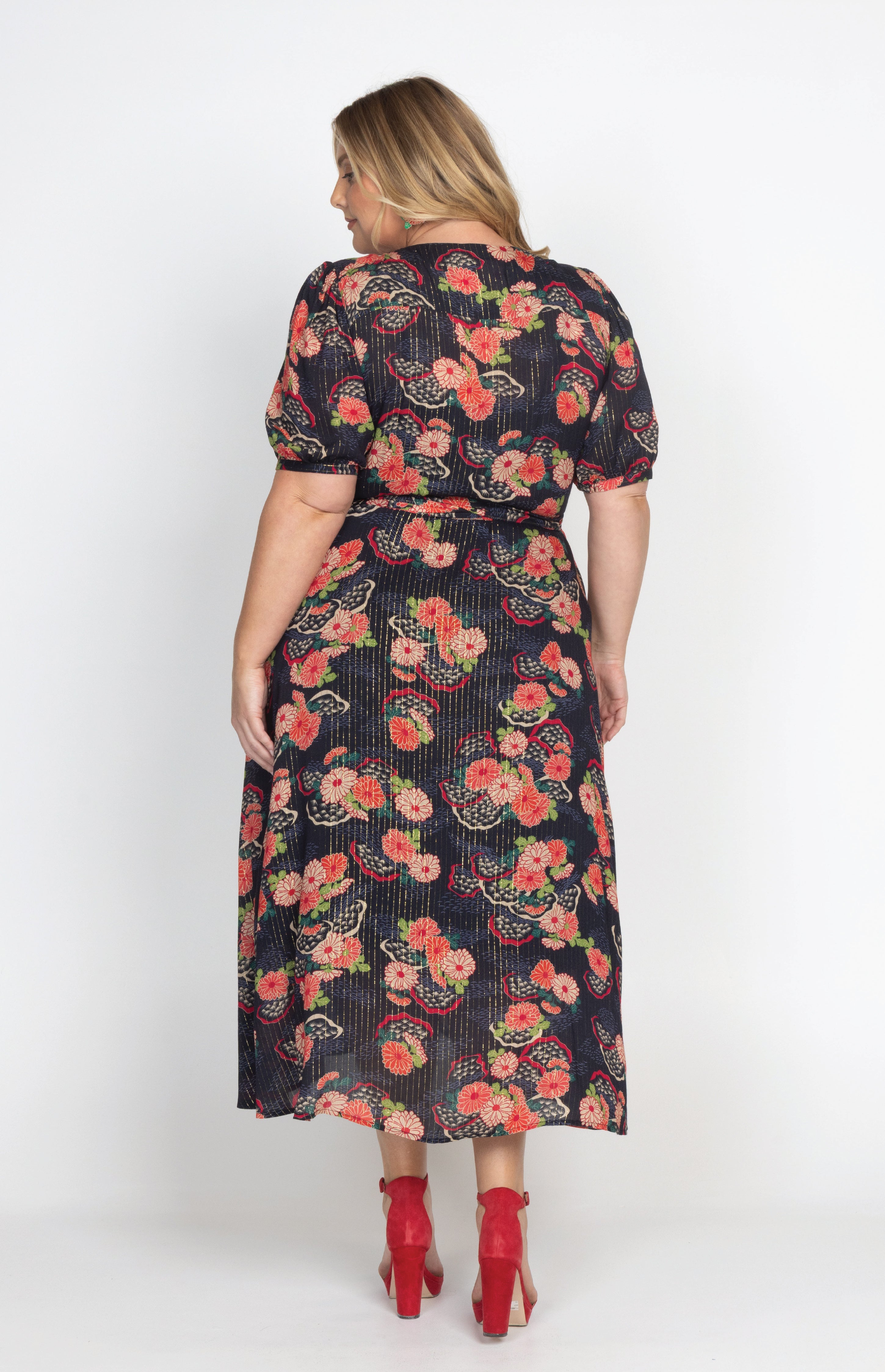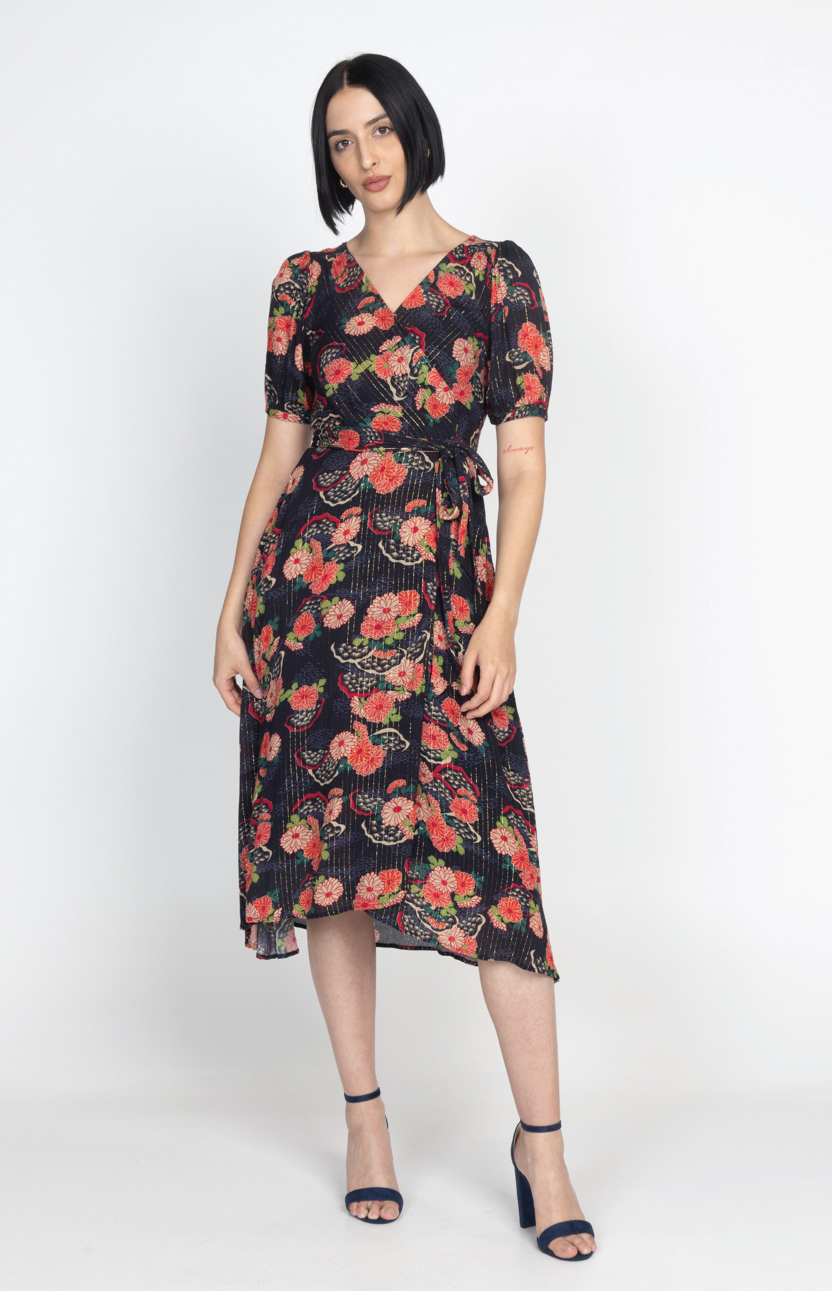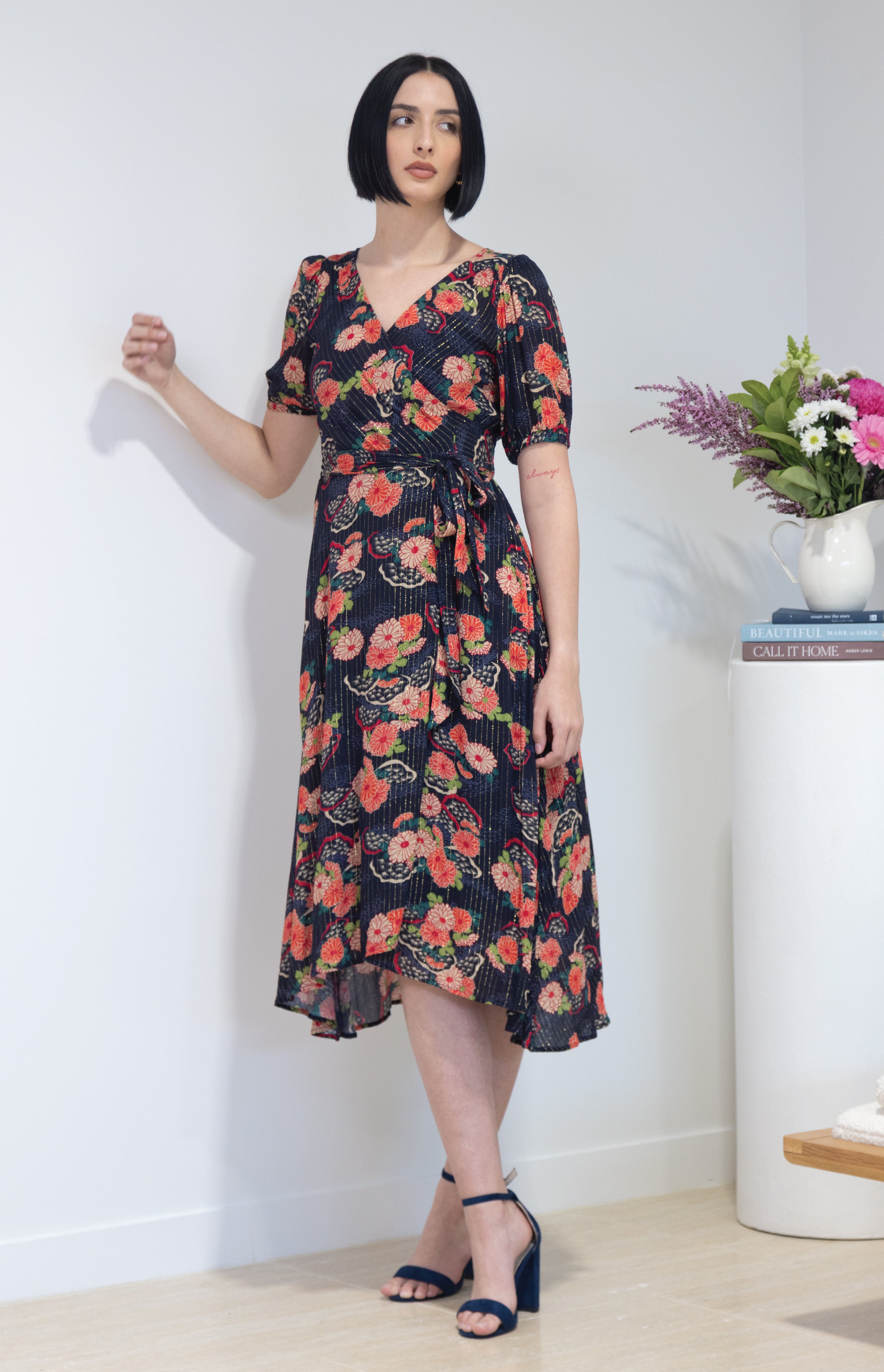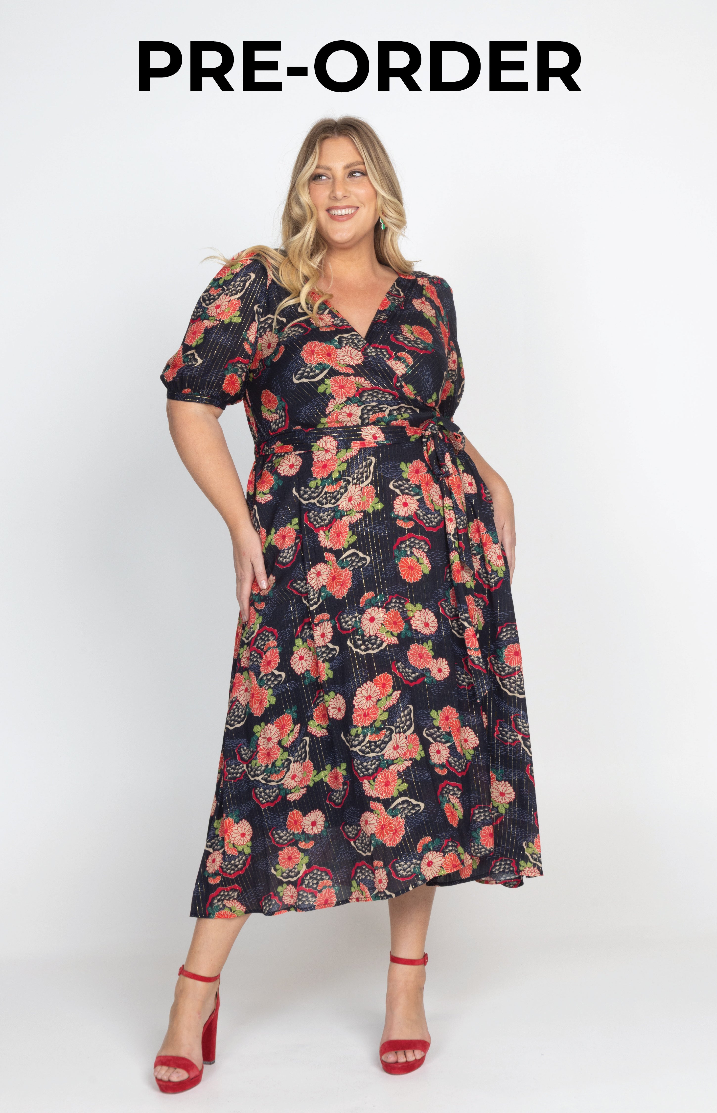 Our new Scarlett Dress is a true wrap silhouette crafted in a sheer fabric with a subtle sparkle stripe, and she comes complete with a separate slip dress for comfort and coverage.
