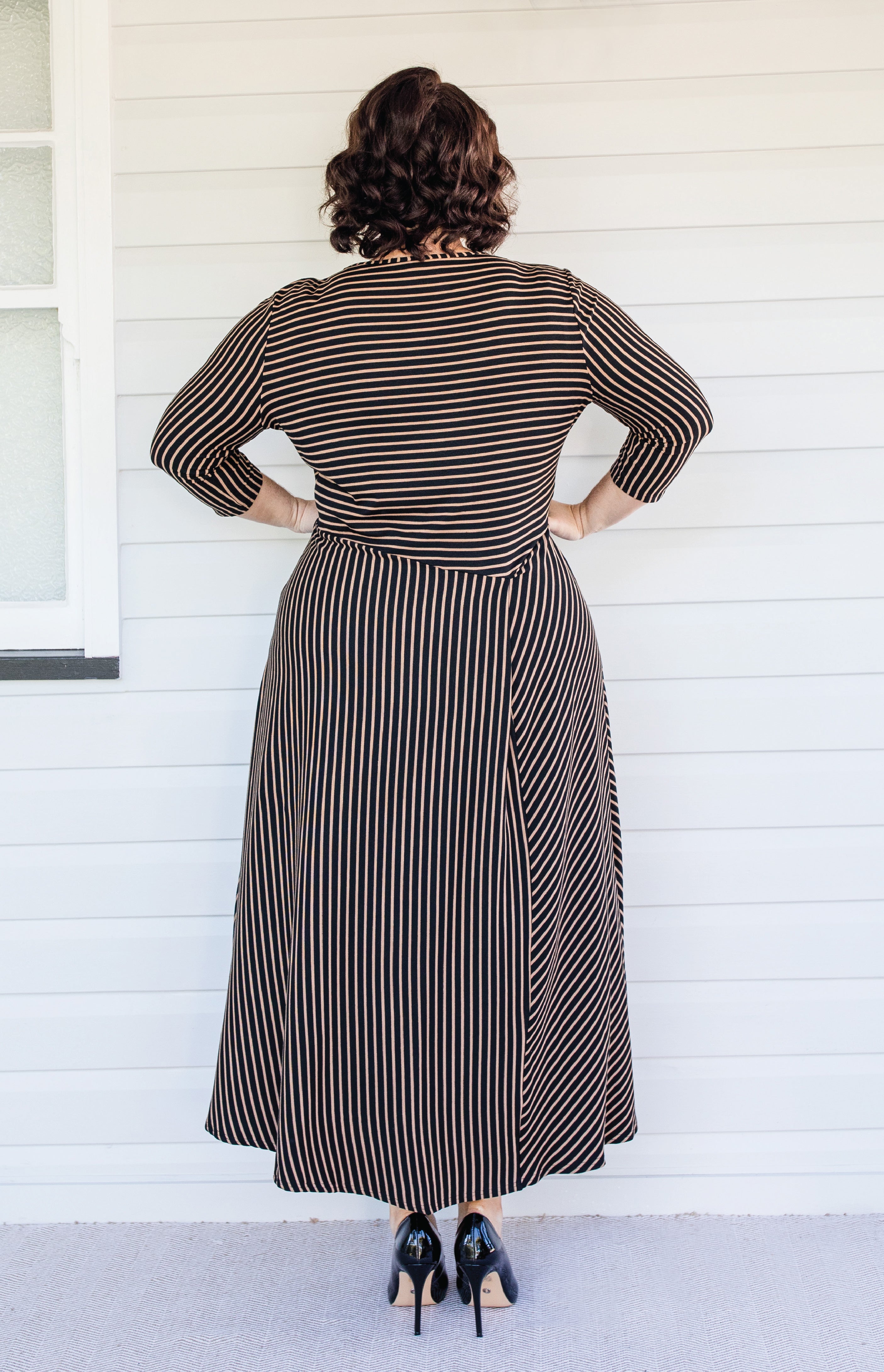 In classic stripes, see how we have cut the stripes in different directions so that they draw the eye down, elongating the figure. The fullness of the tuck in the skirt will skim over your tummy and bottom area.