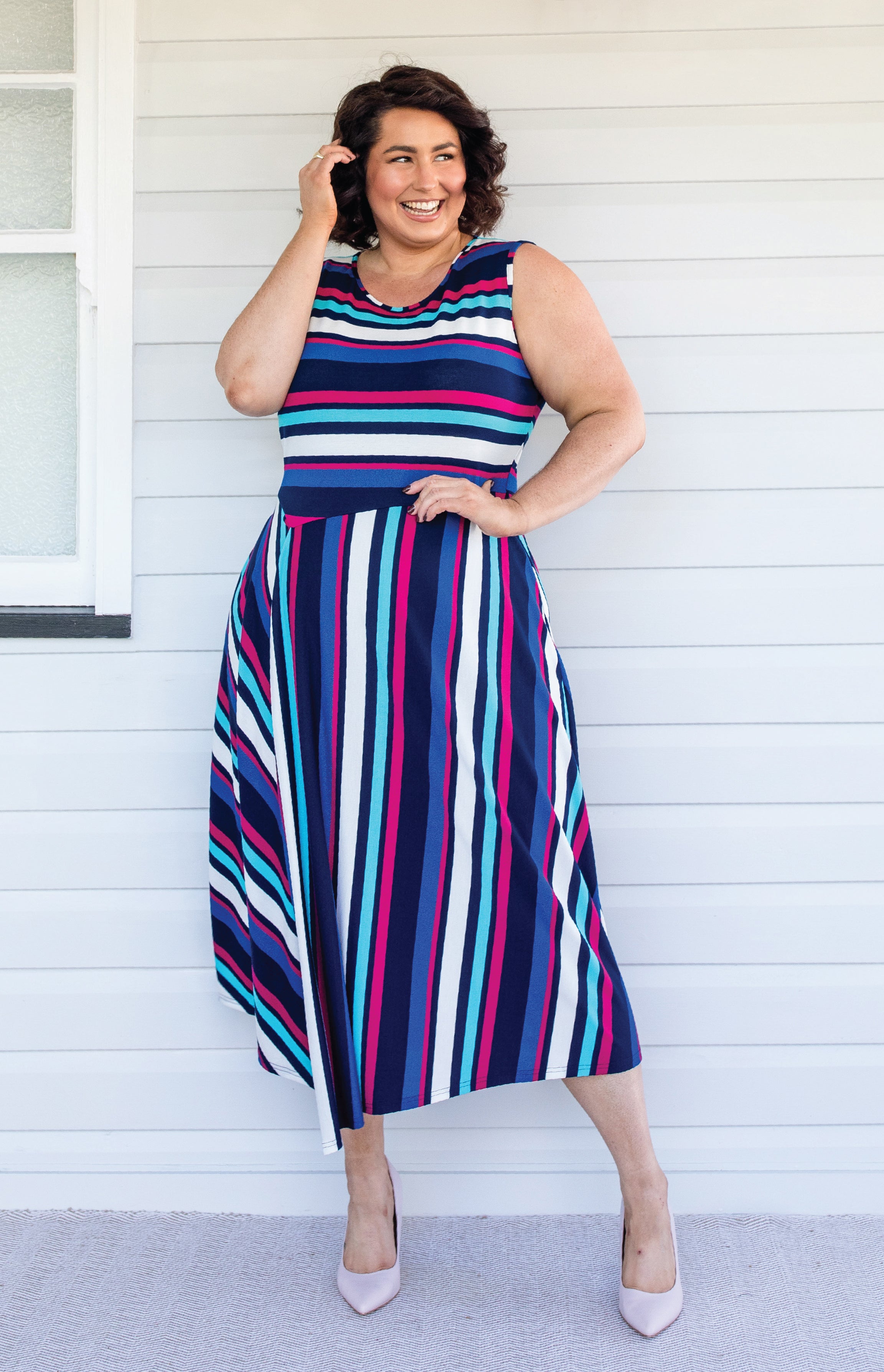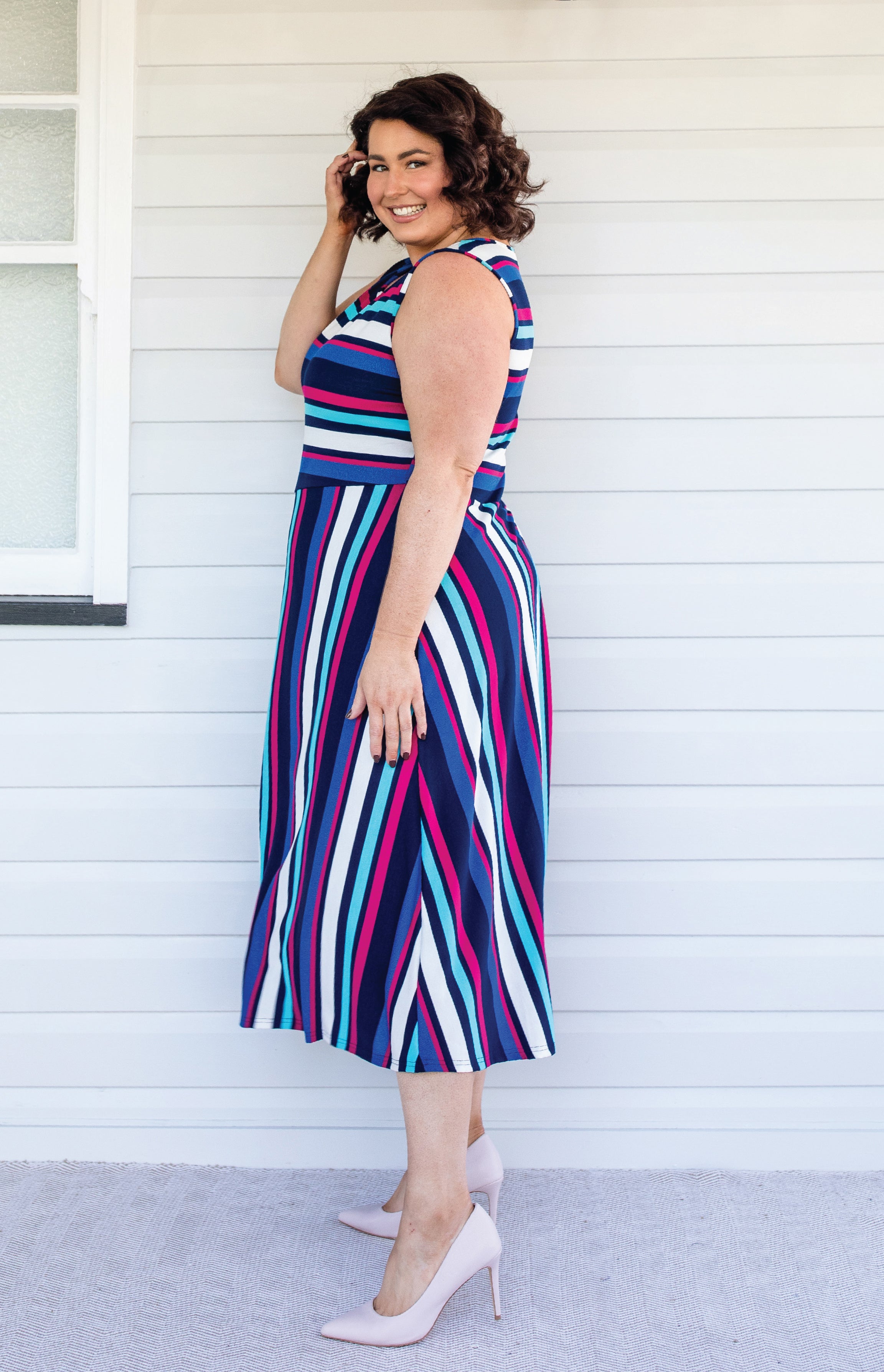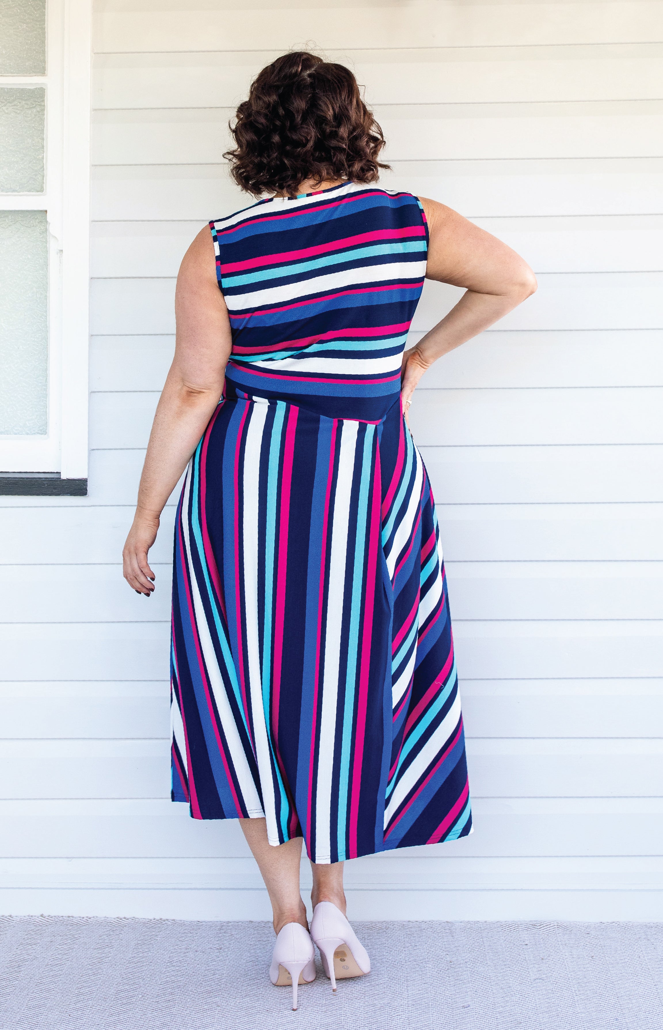 In coloured stripes, with a subtle sparkle texture, see how we have cut the stripes in different directions so that they draw the eye down, elongating the figure. The fullness of the tuck over the tummy and bottom disguise any lumps and bumps.