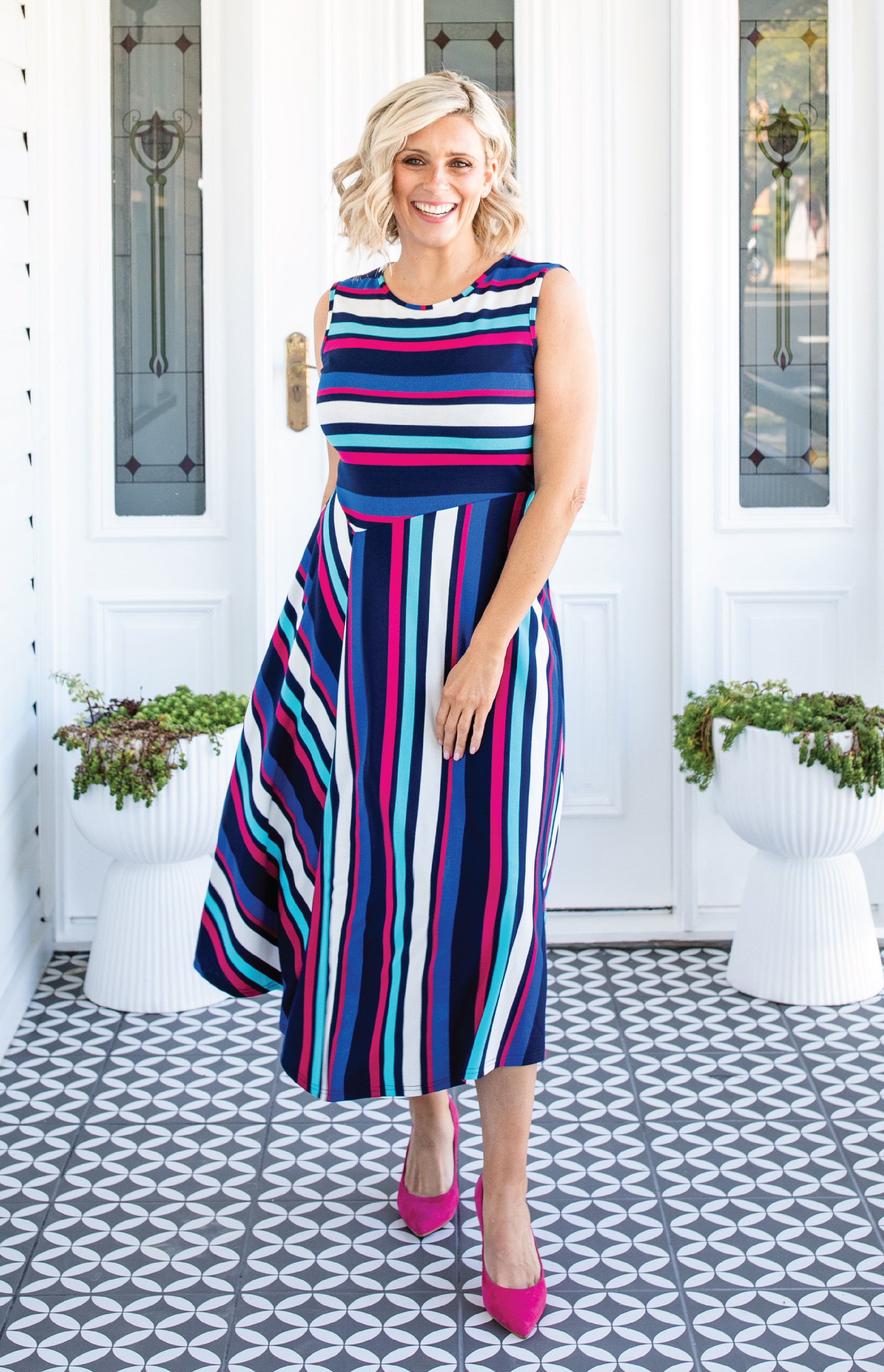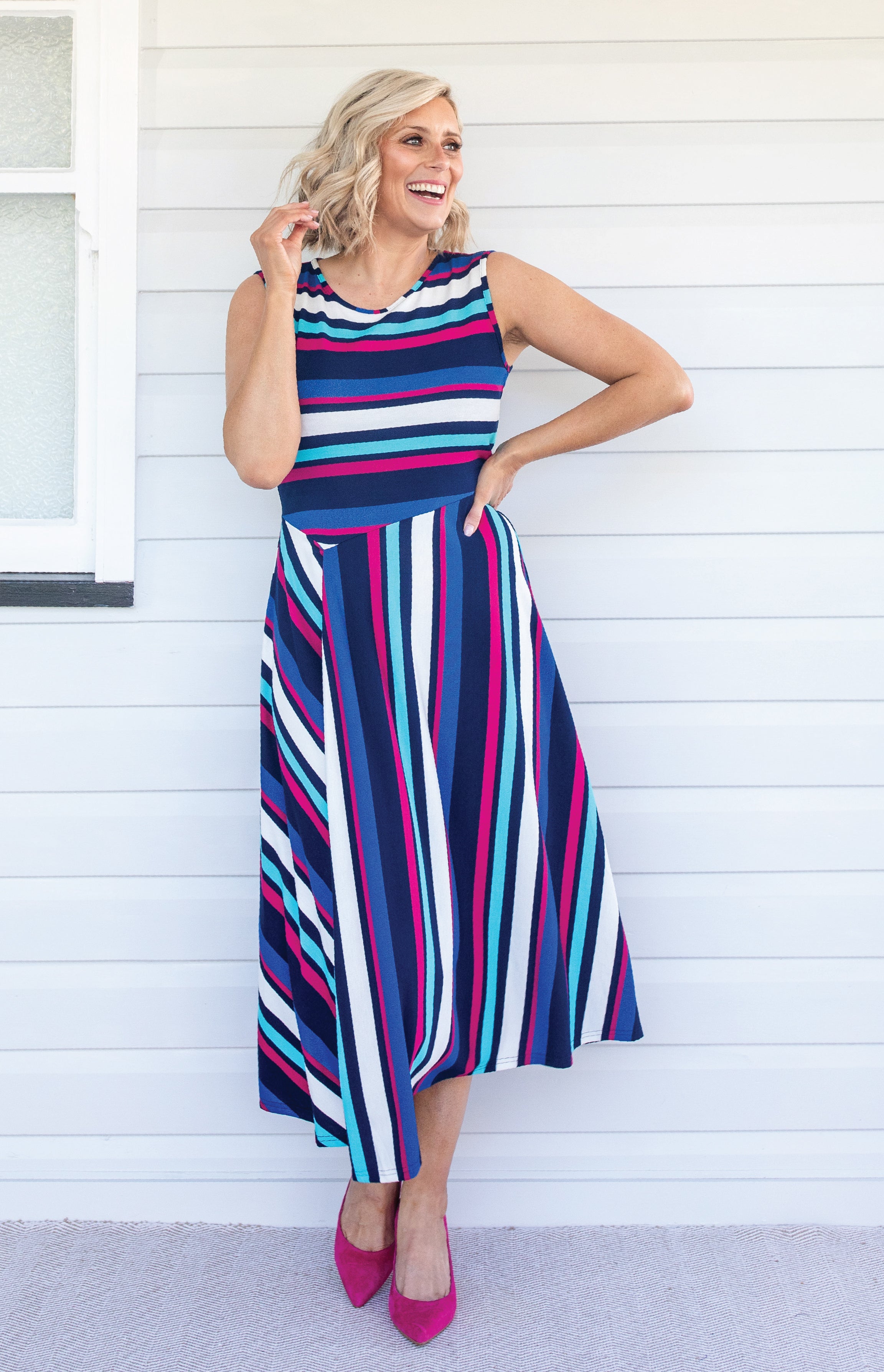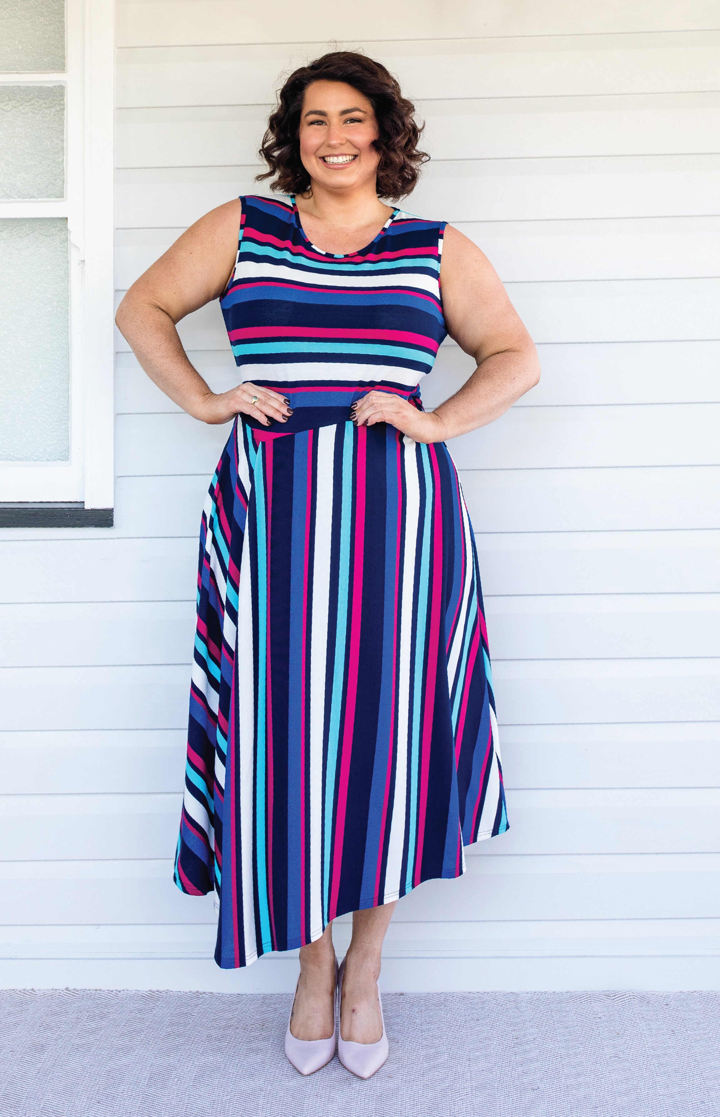 In coloured stripes, with a subtle sparkle texture, see how we have cut the stripes in different directions so that they draw the eye down, elongating the figure. The fullness of the tuck over the tummy and bottom disguise any lumps and bumps.