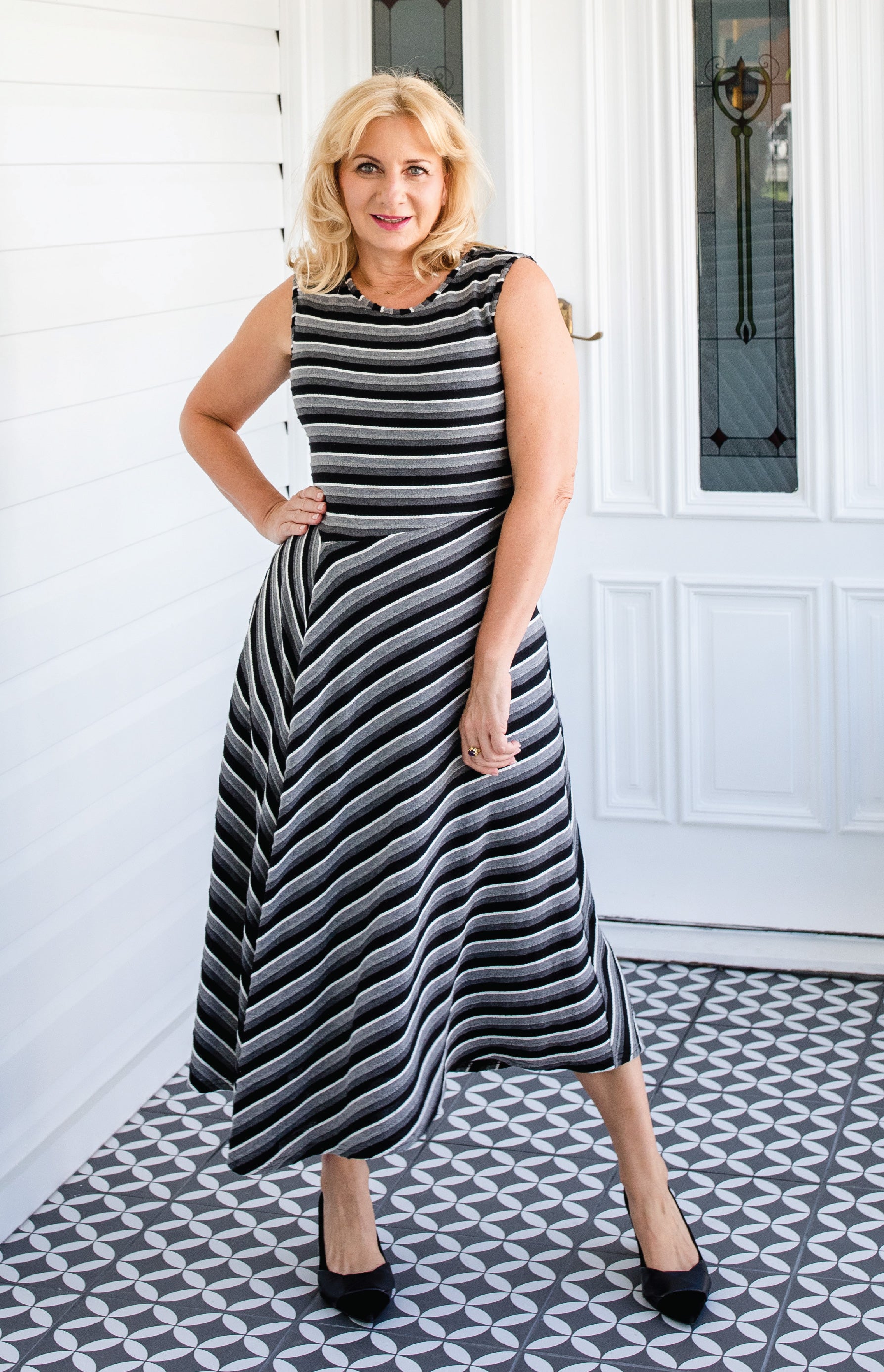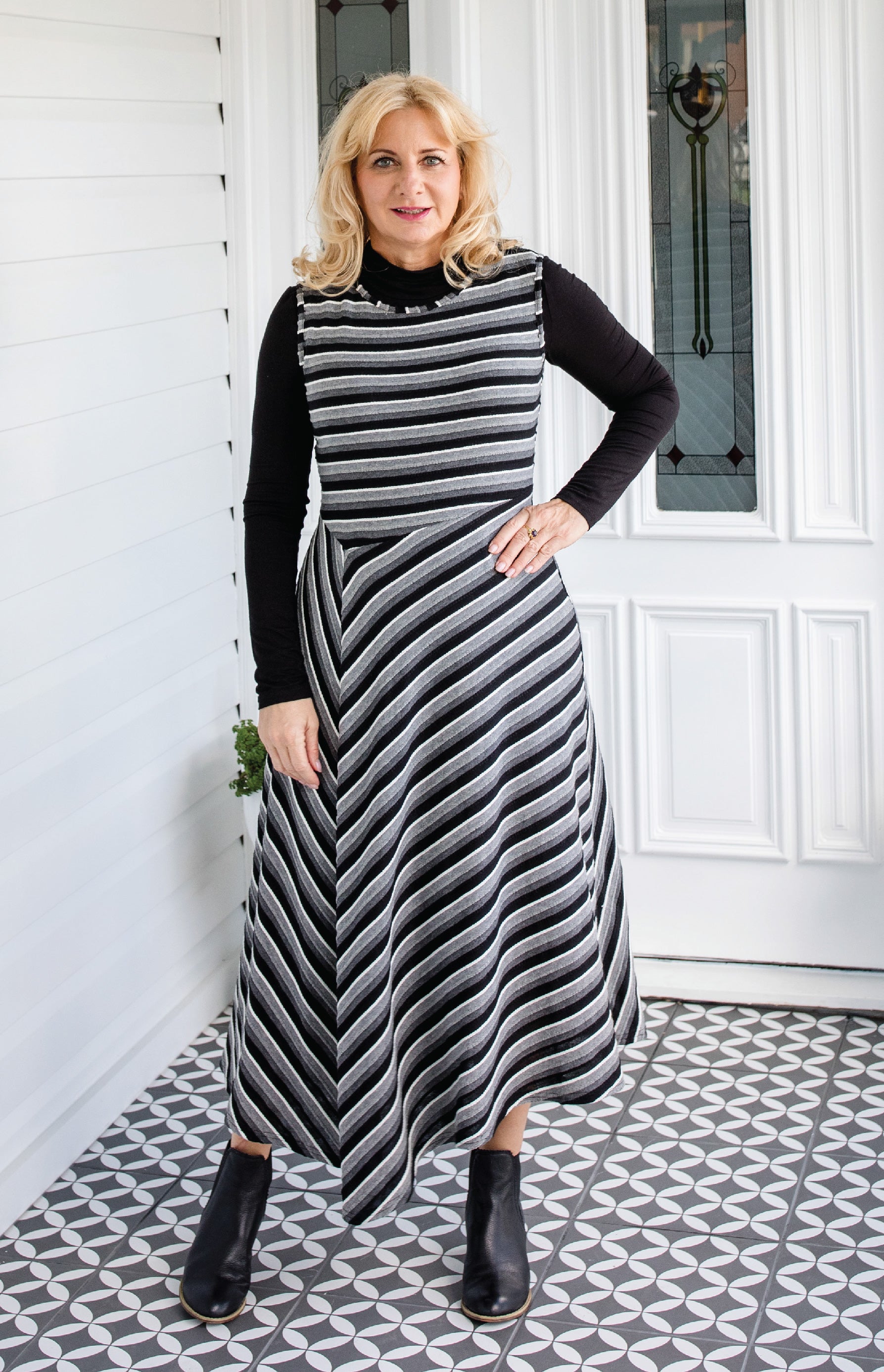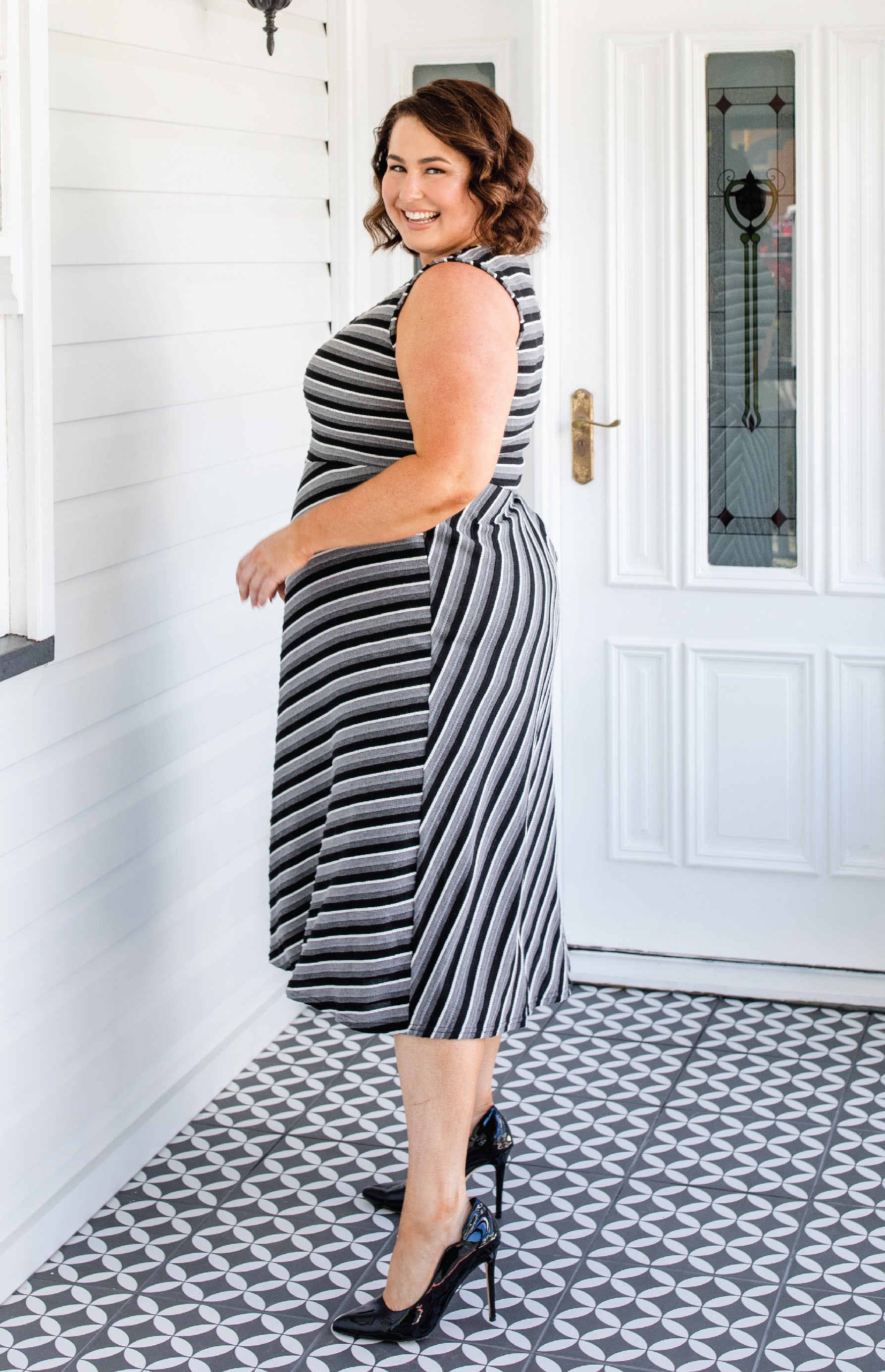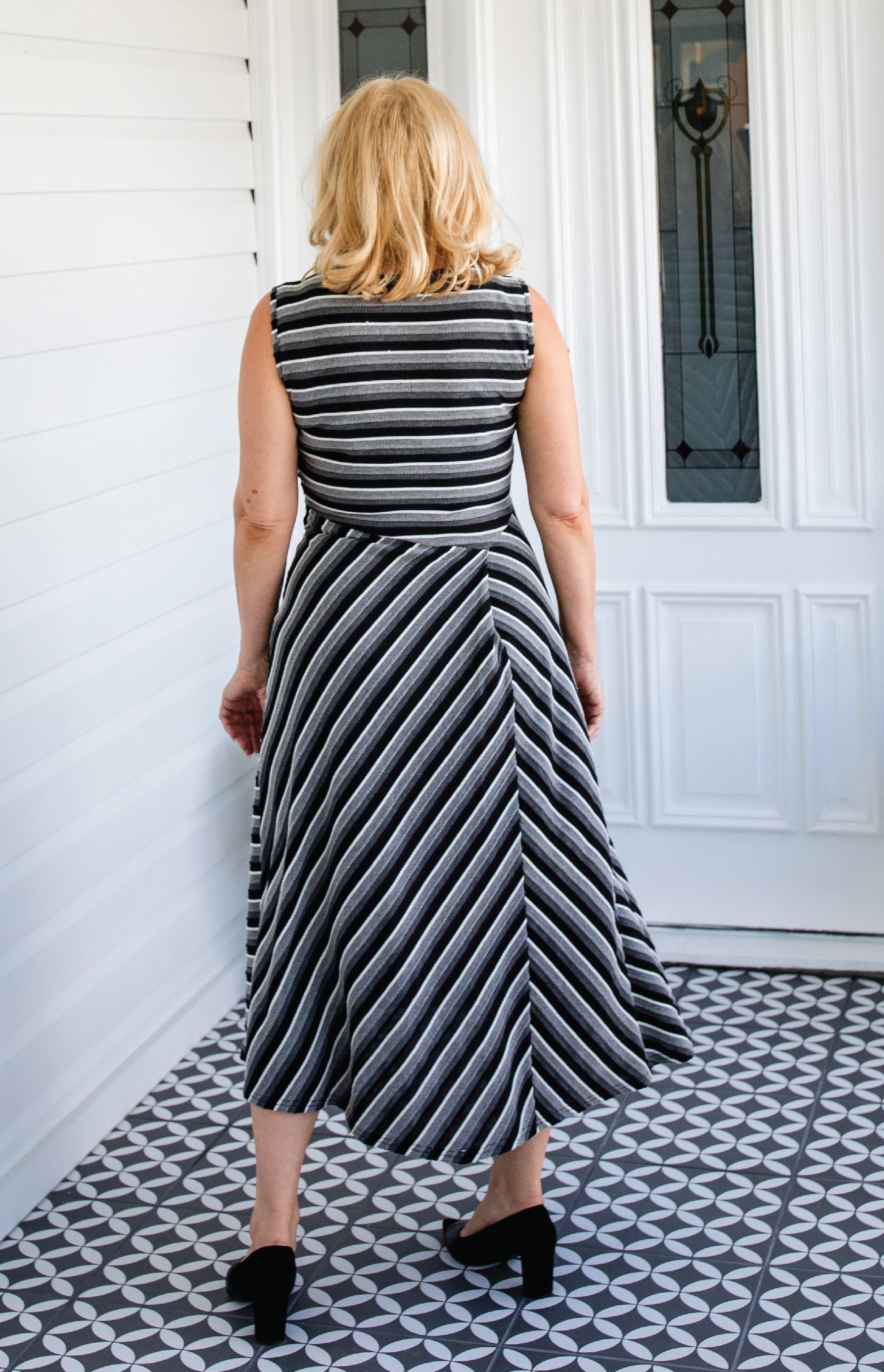 In classic stripes, see how we have cut the stripes in different directions so that they draw the eye down, elongating the figure. The fullness of the tuck in the skirt will skim over your tummy and bottom area.