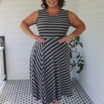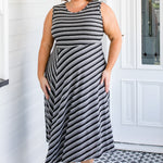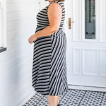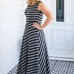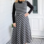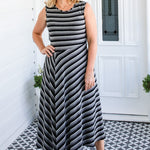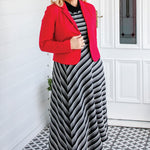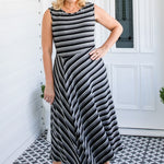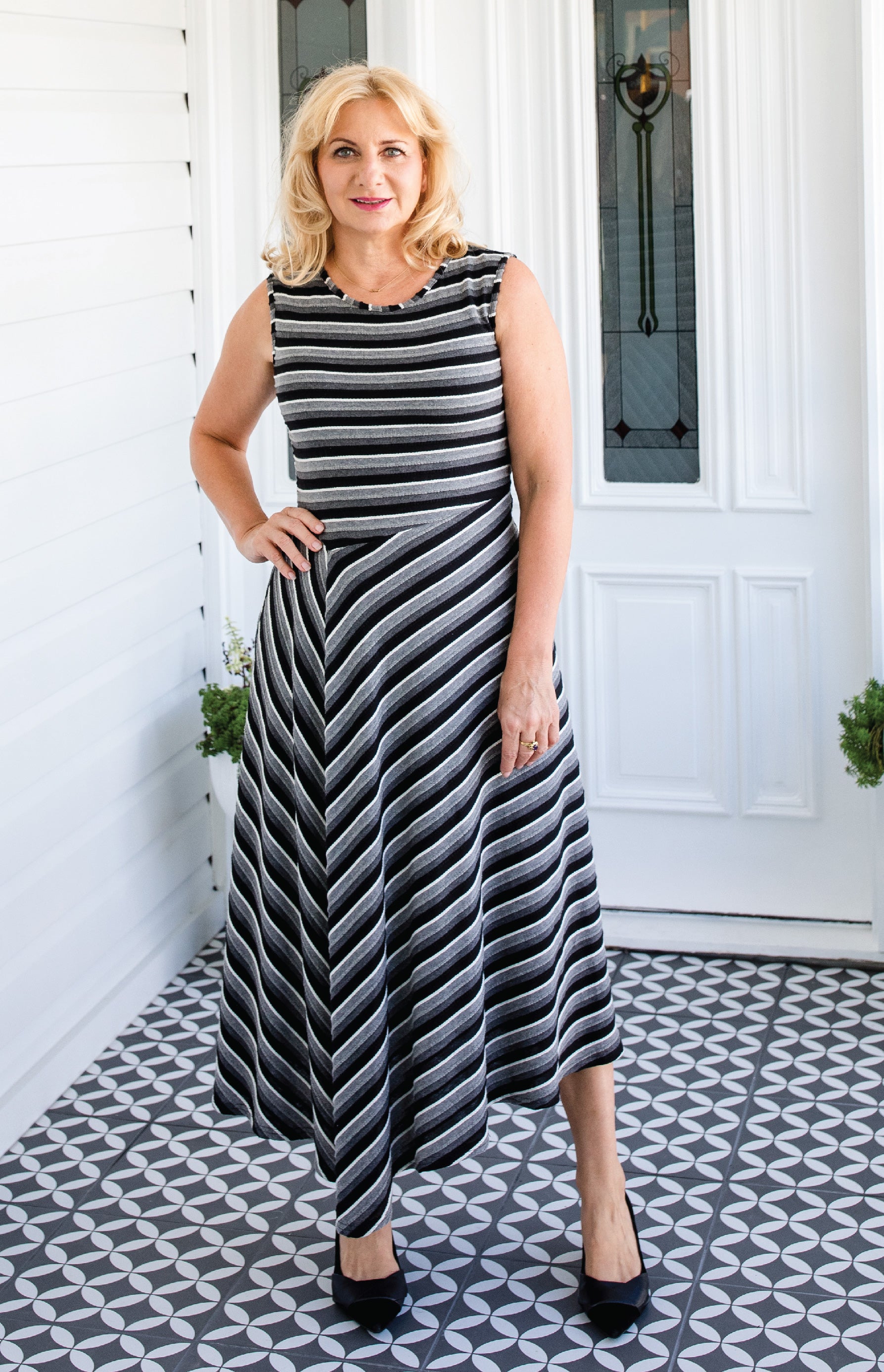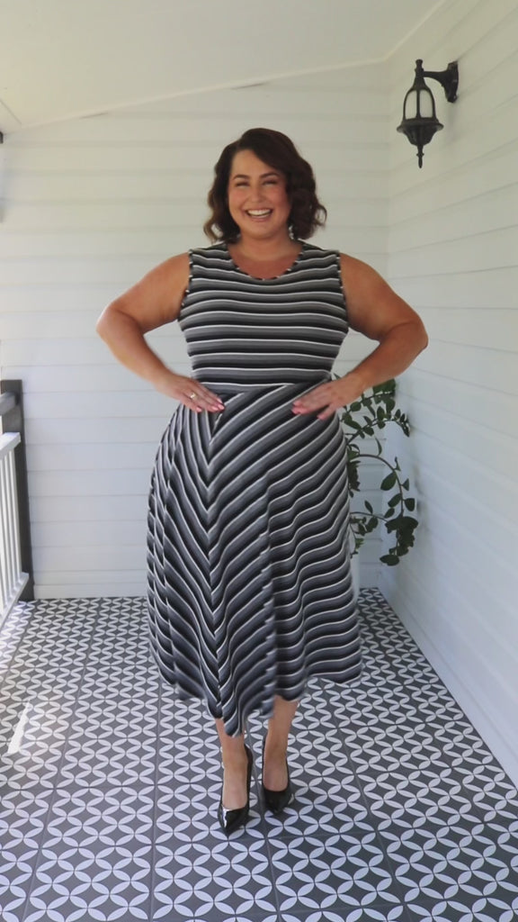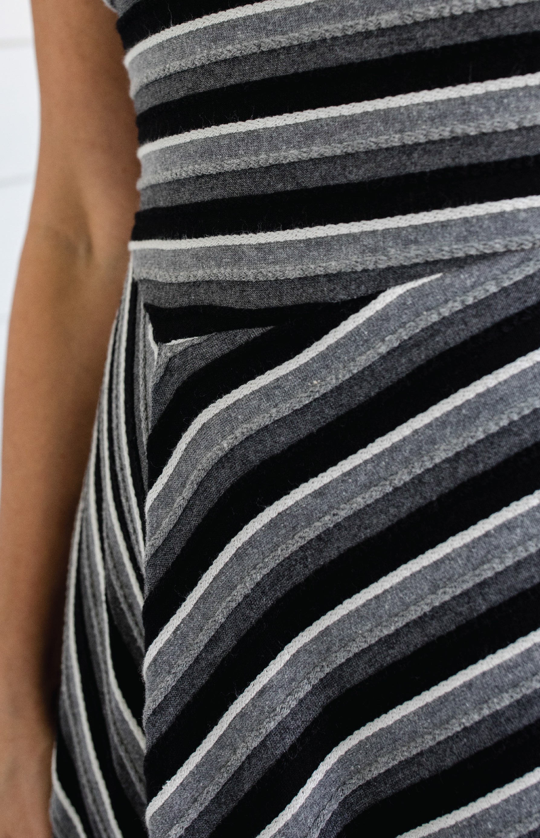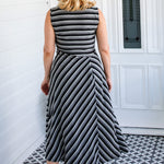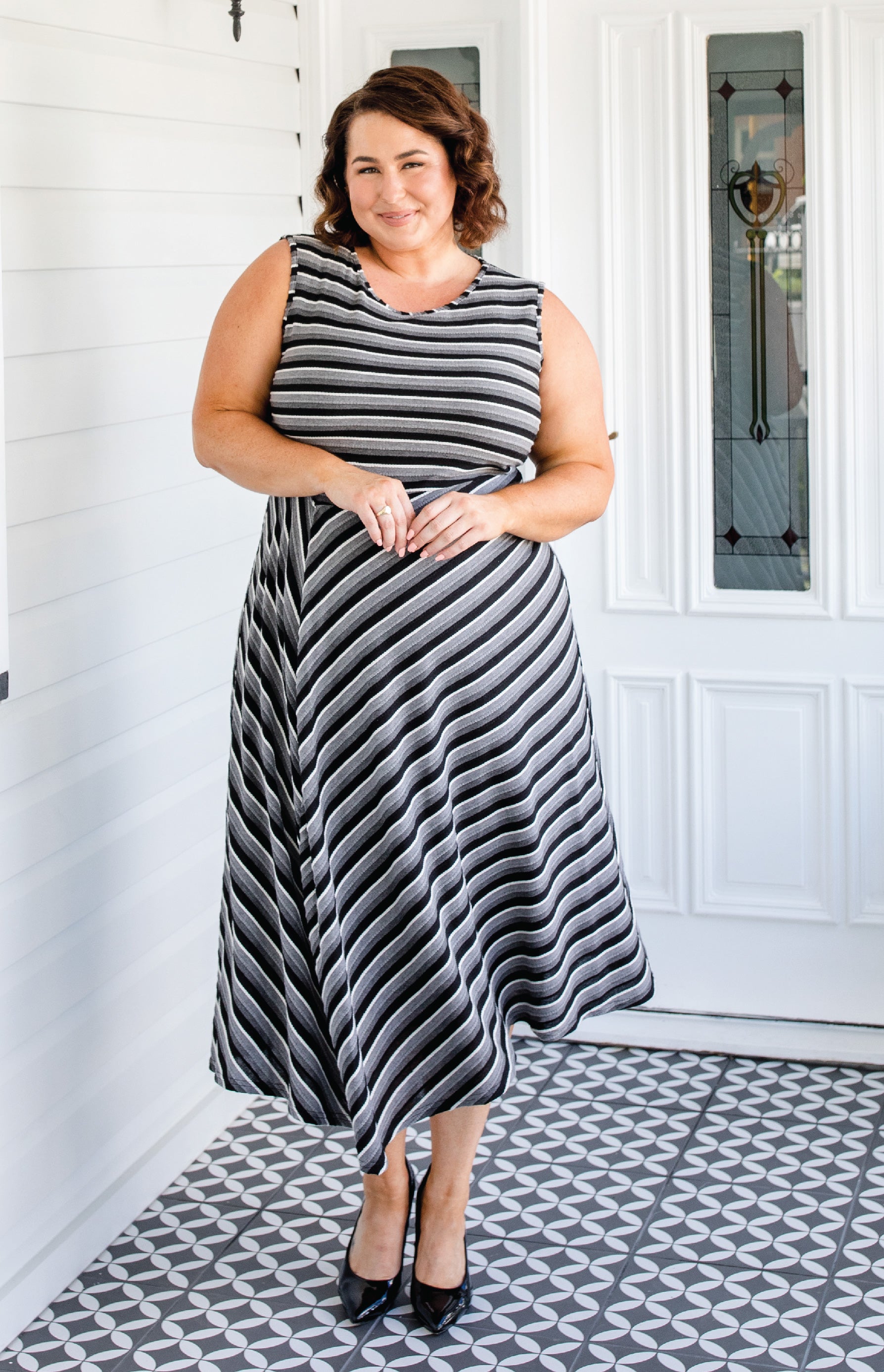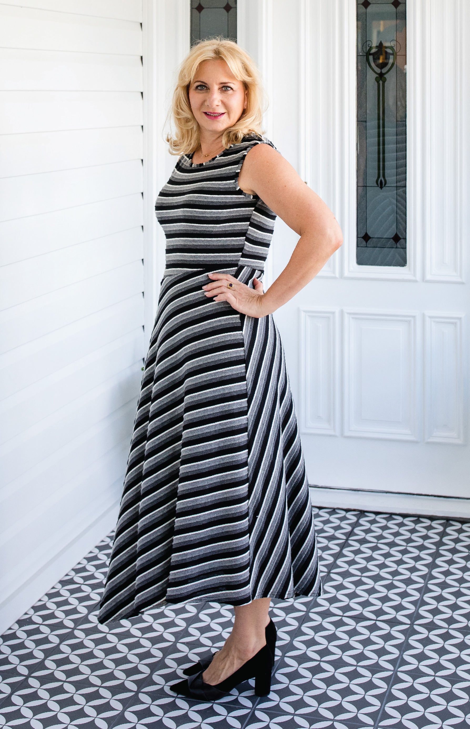 In classic stripes, see how we have cut the stripes in different directions so that they draw the eye down, elongating the figure. The fullness of the tuck in the skirt will skim over your tummy and bottom area.