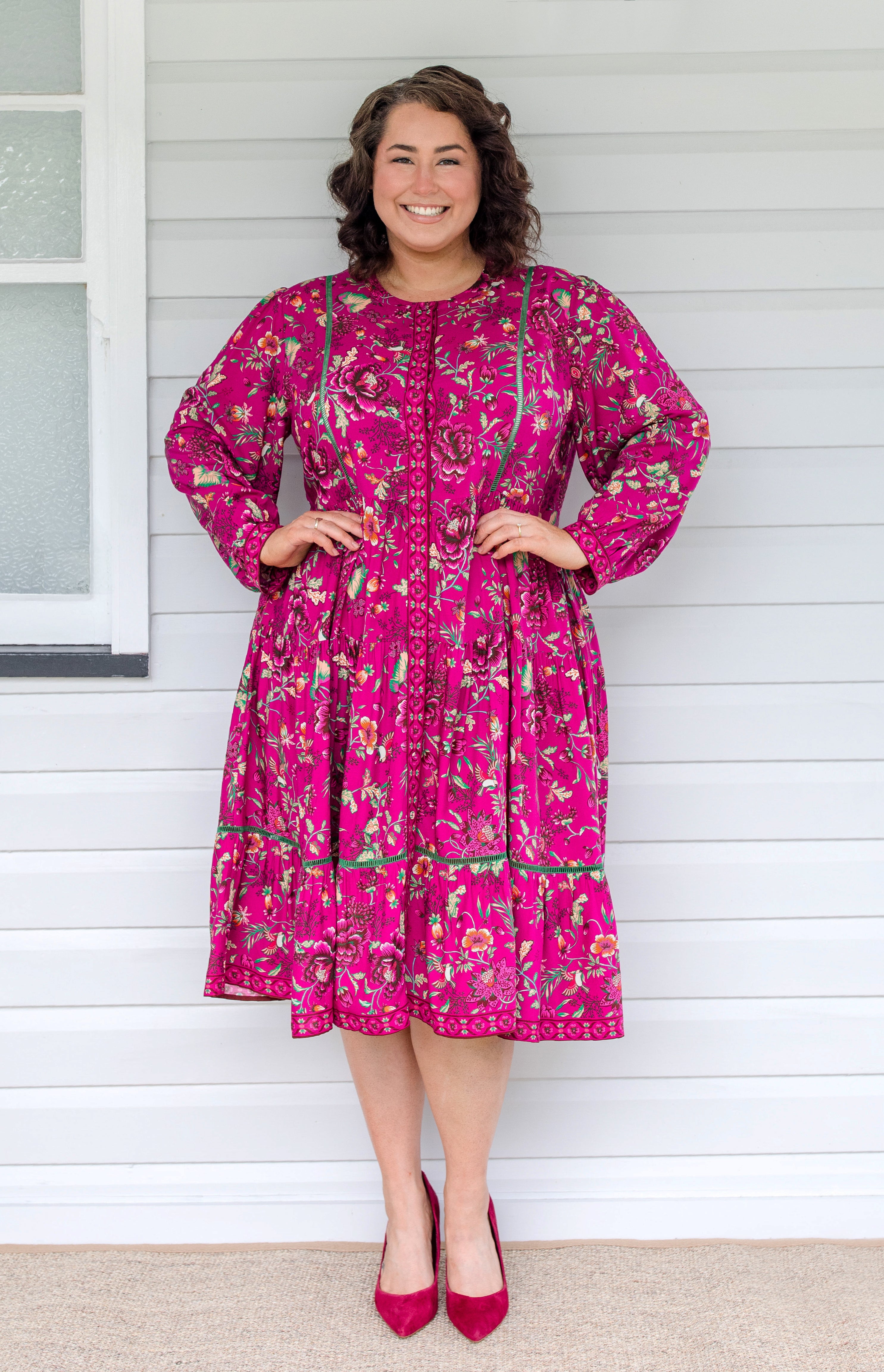 The Sophia Dress is a timeless shirt dress silhouette that's sure to turn heads with her fancy lace trims, flowy skirt and statement sleeve.