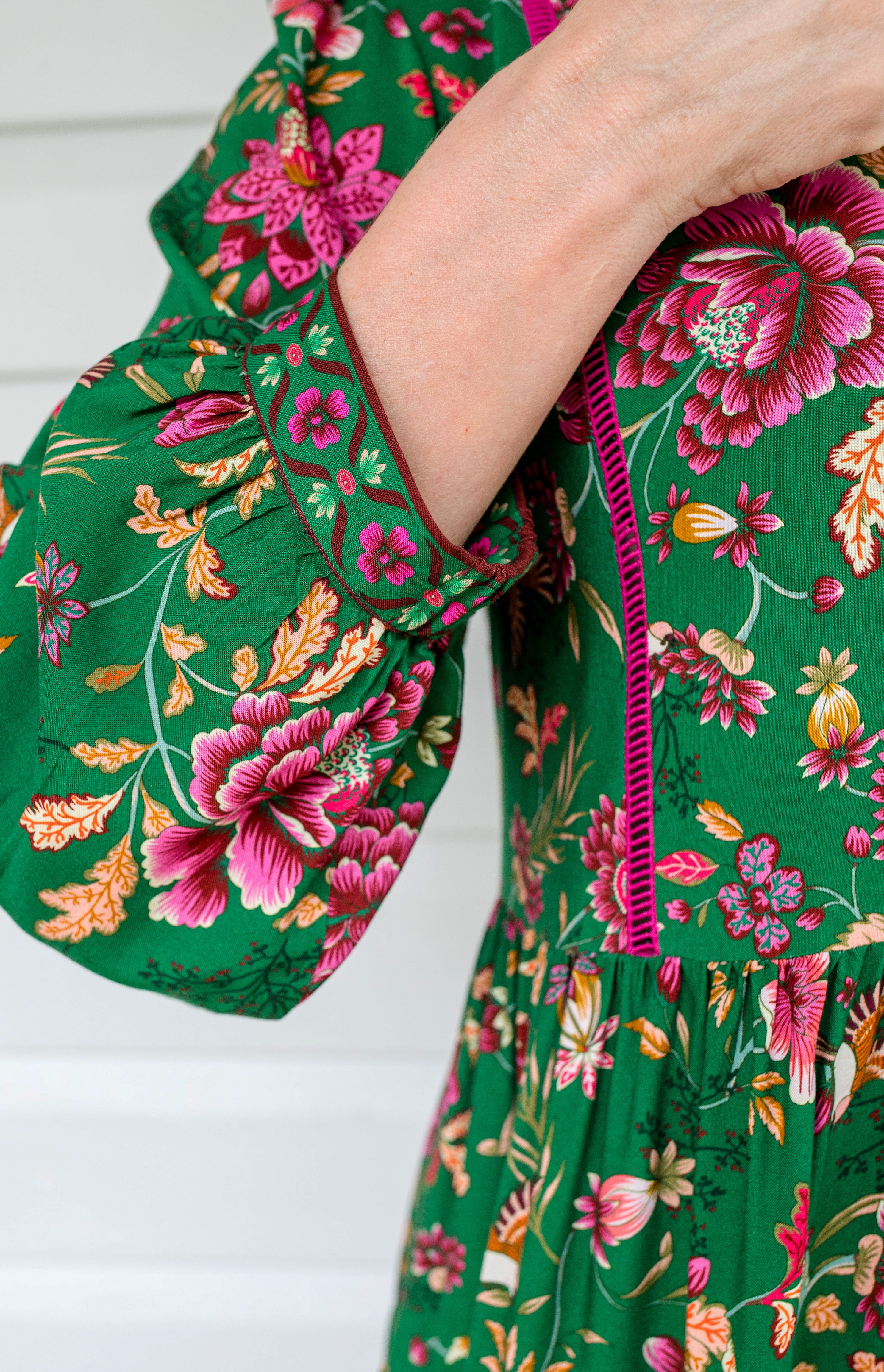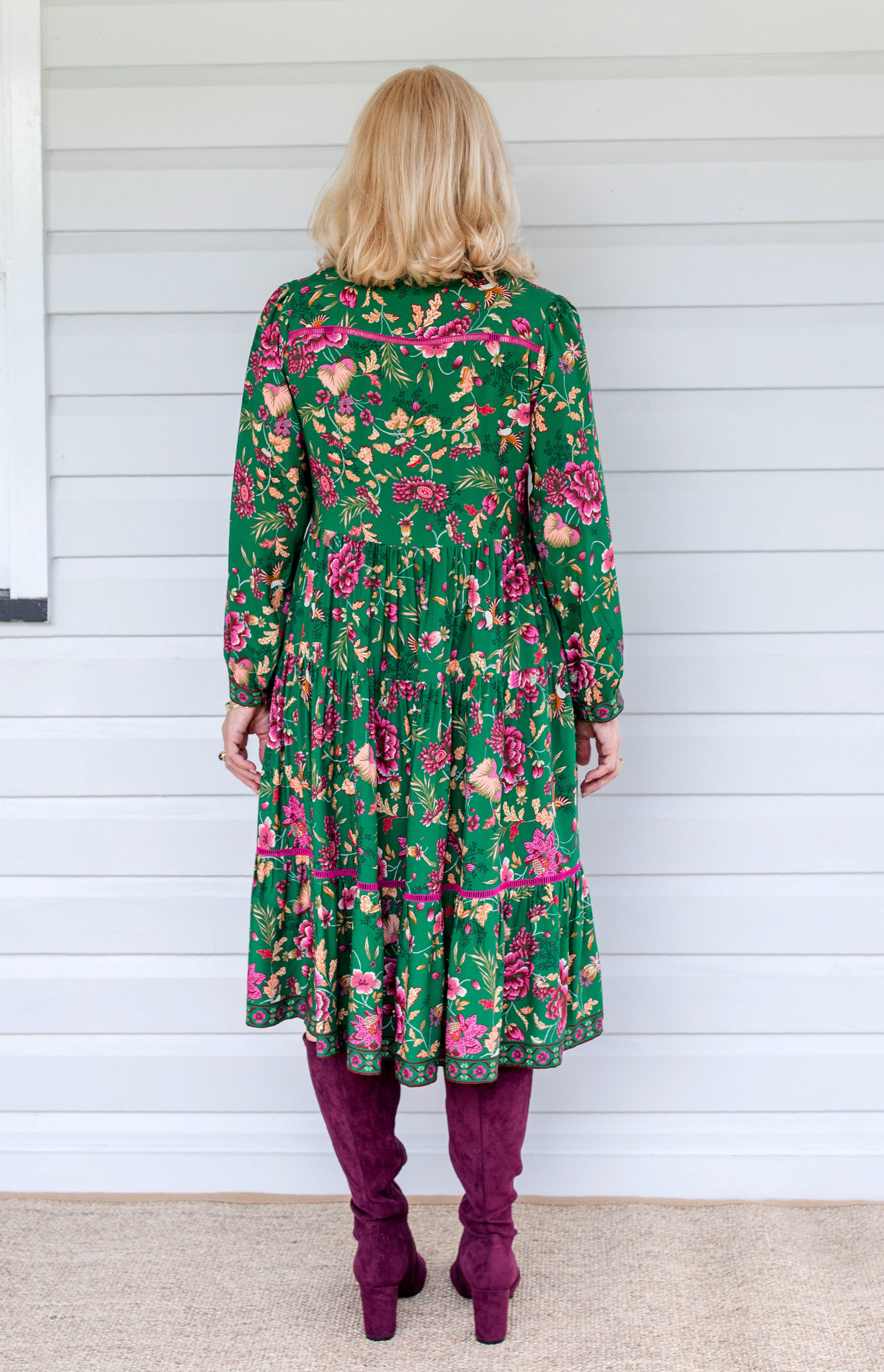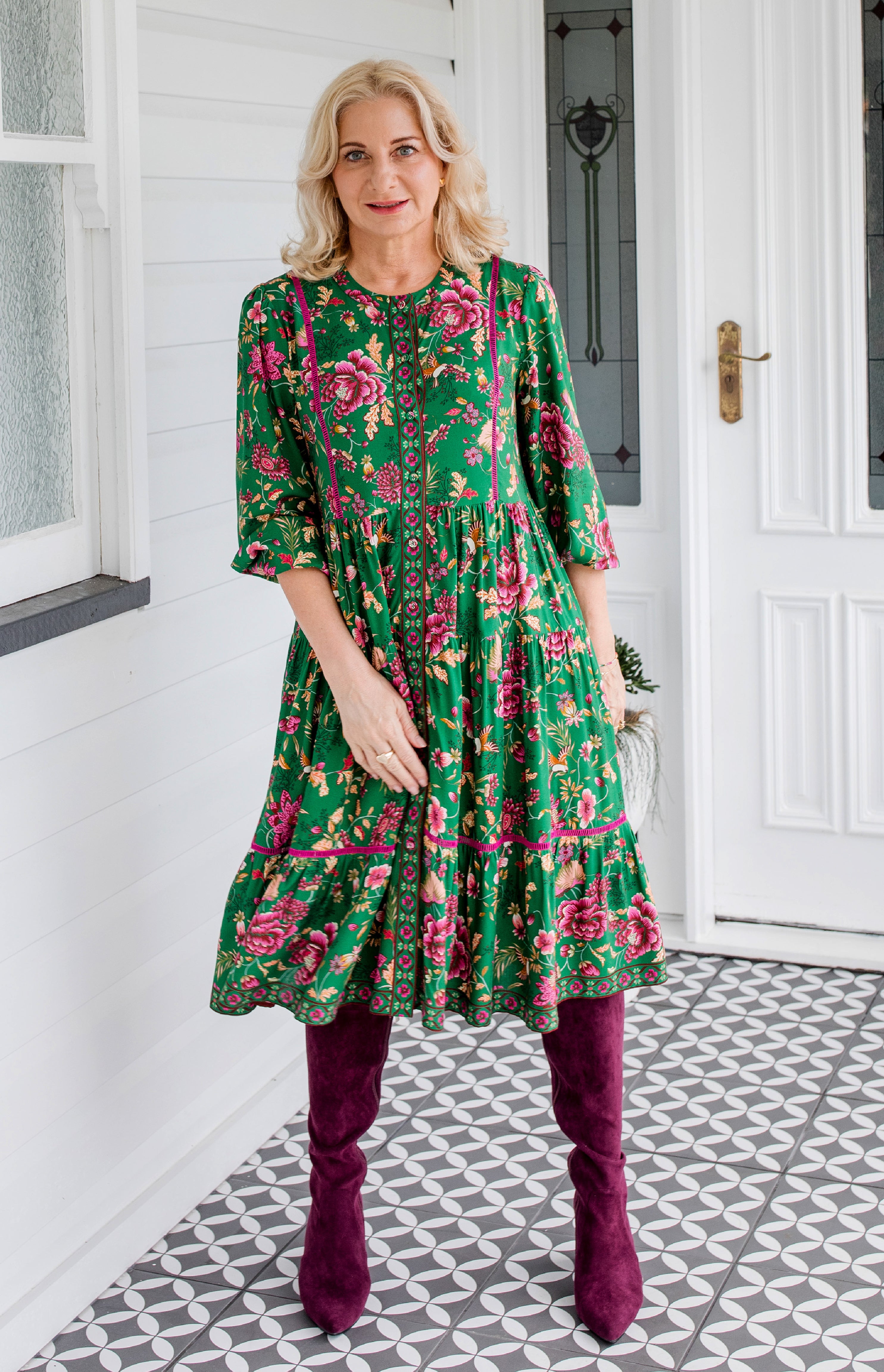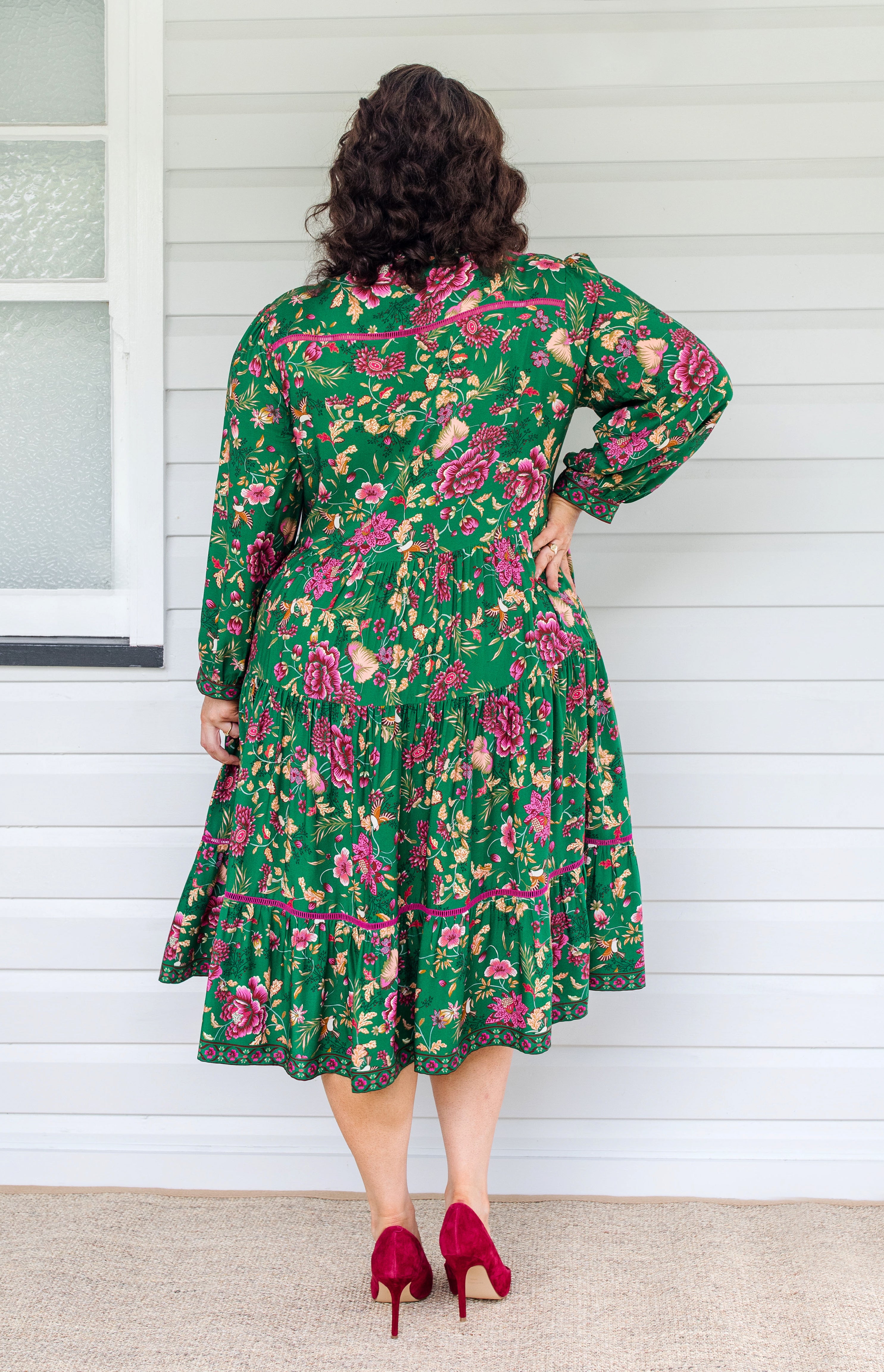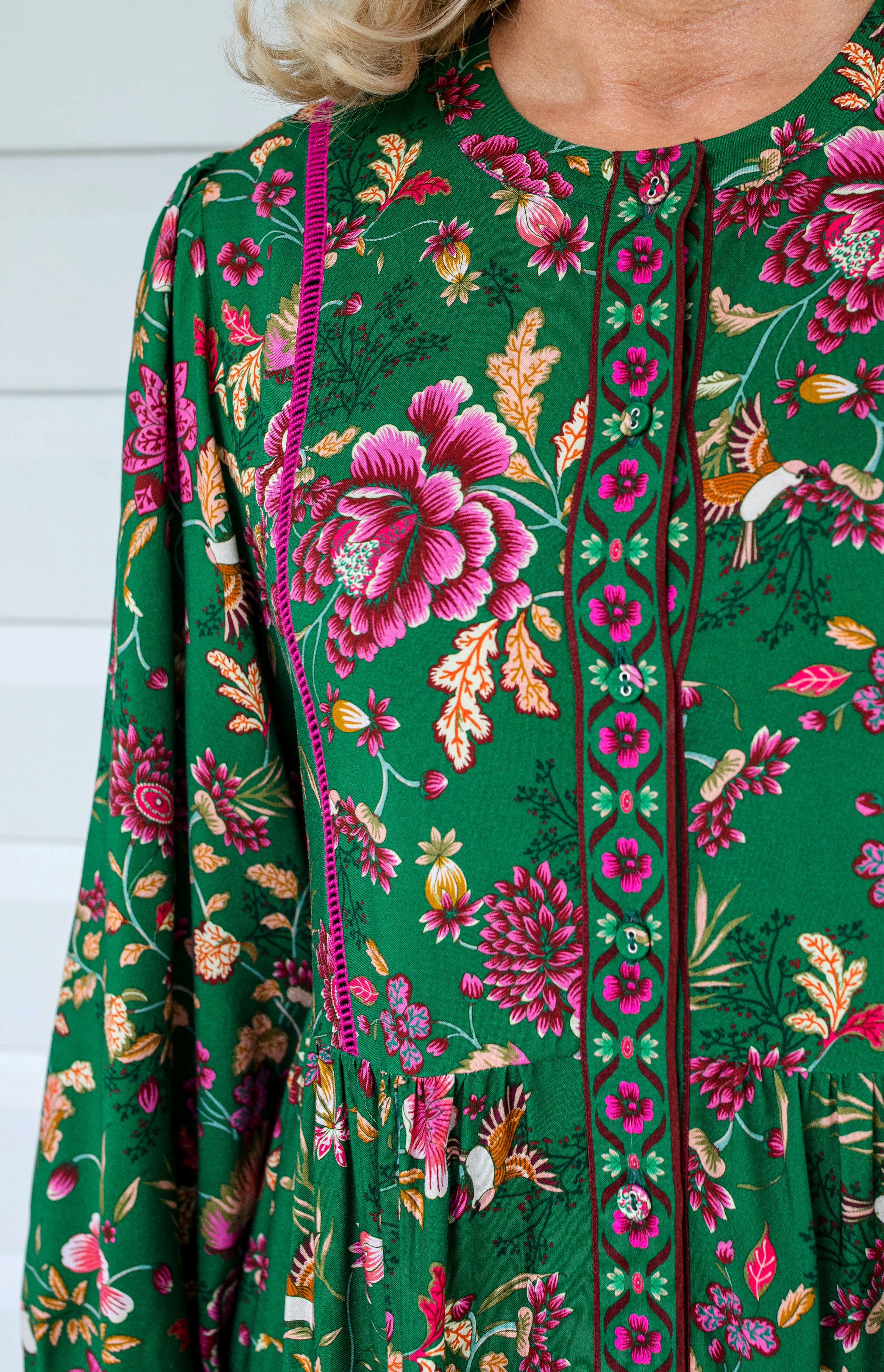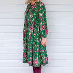 Maiocchi Sophia Dress in Flights of Fancy Green print.