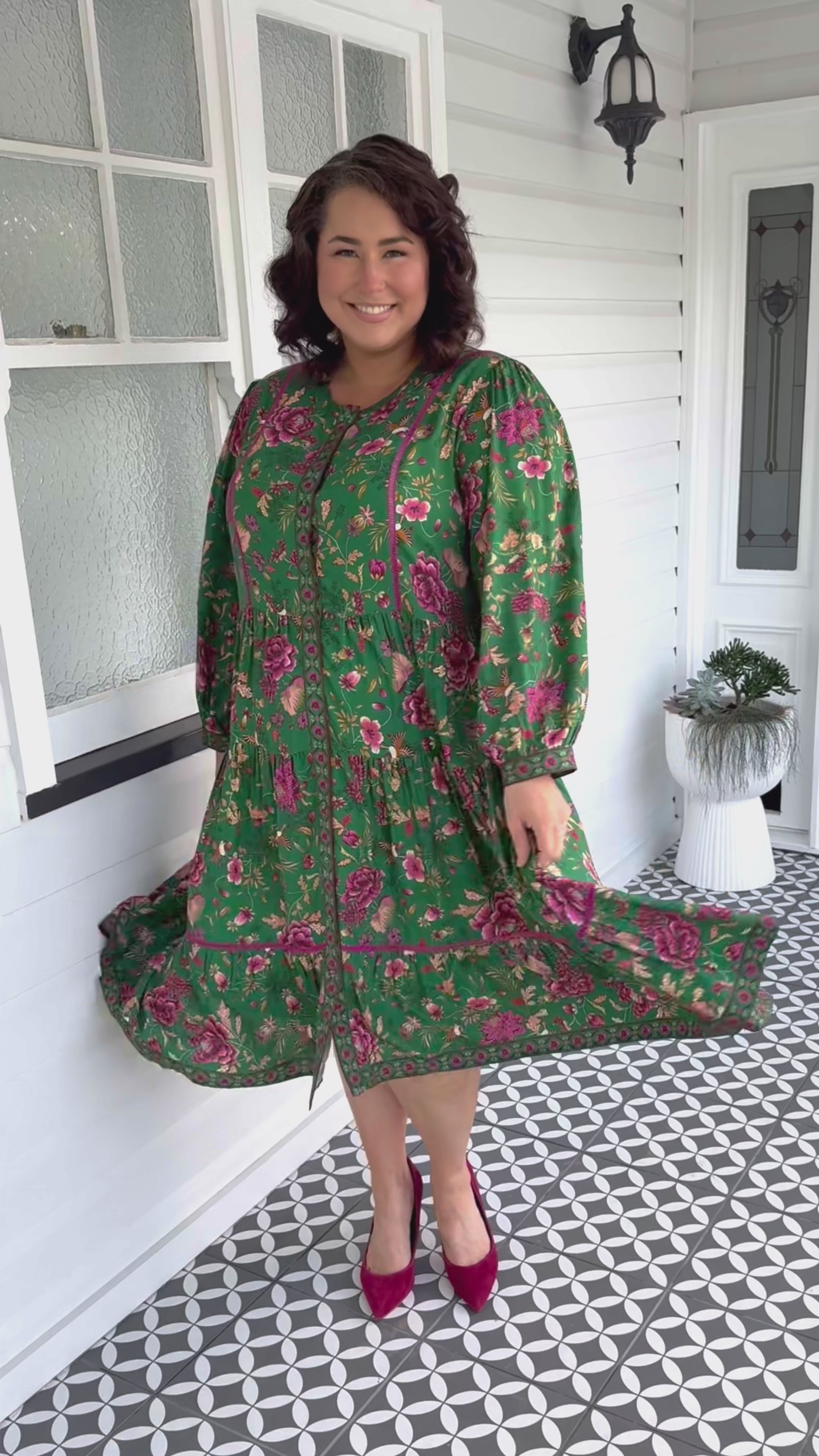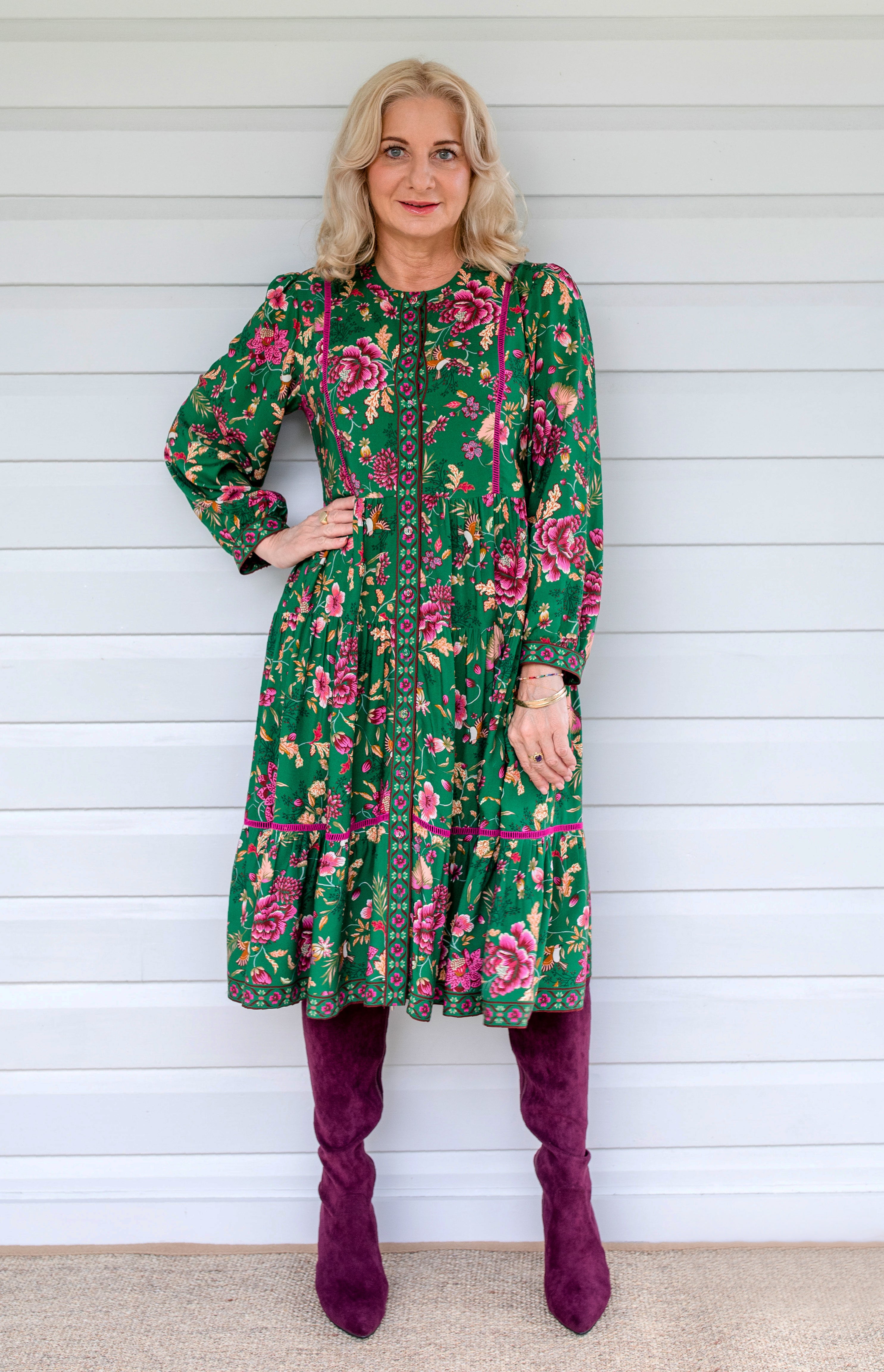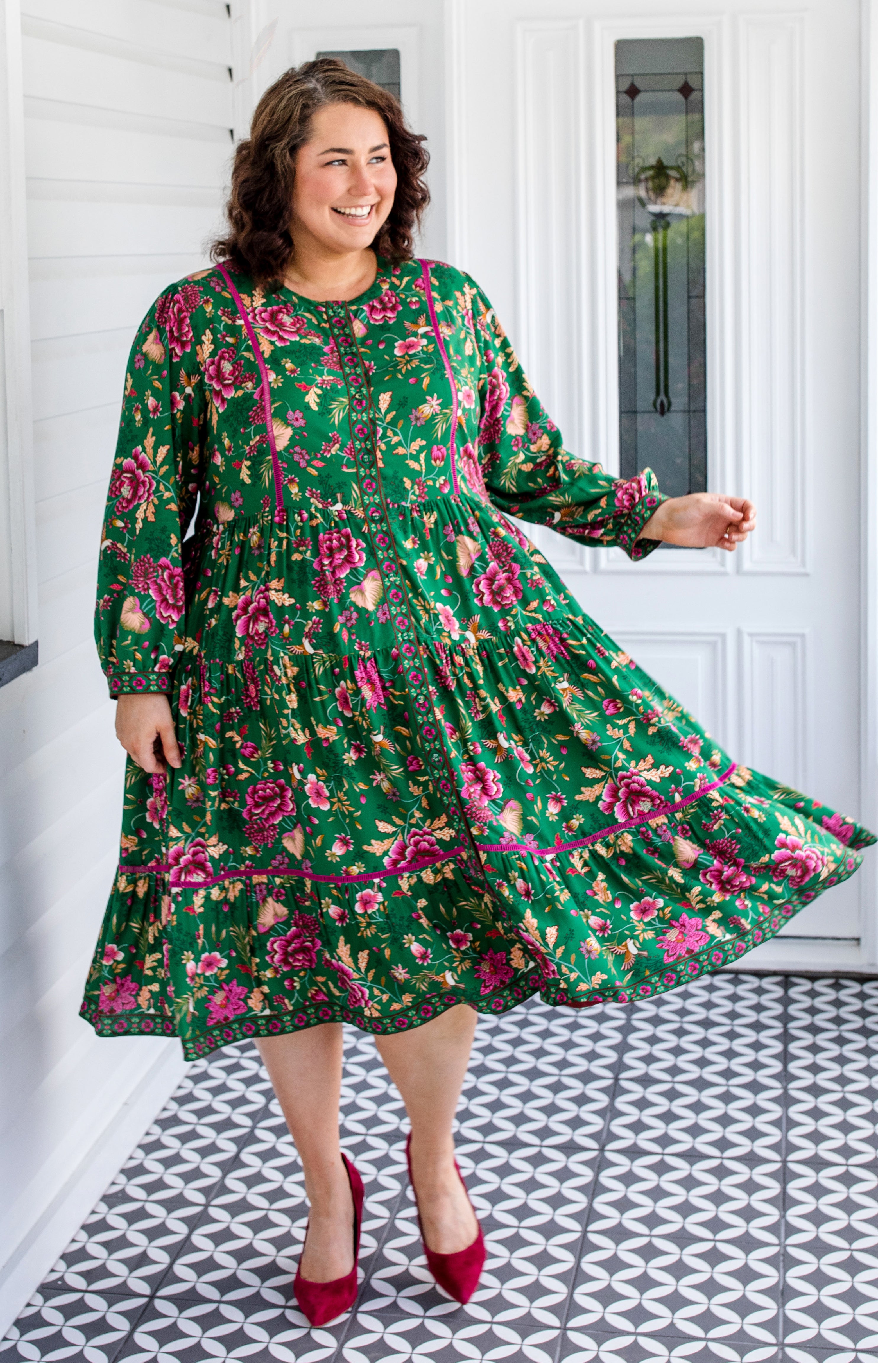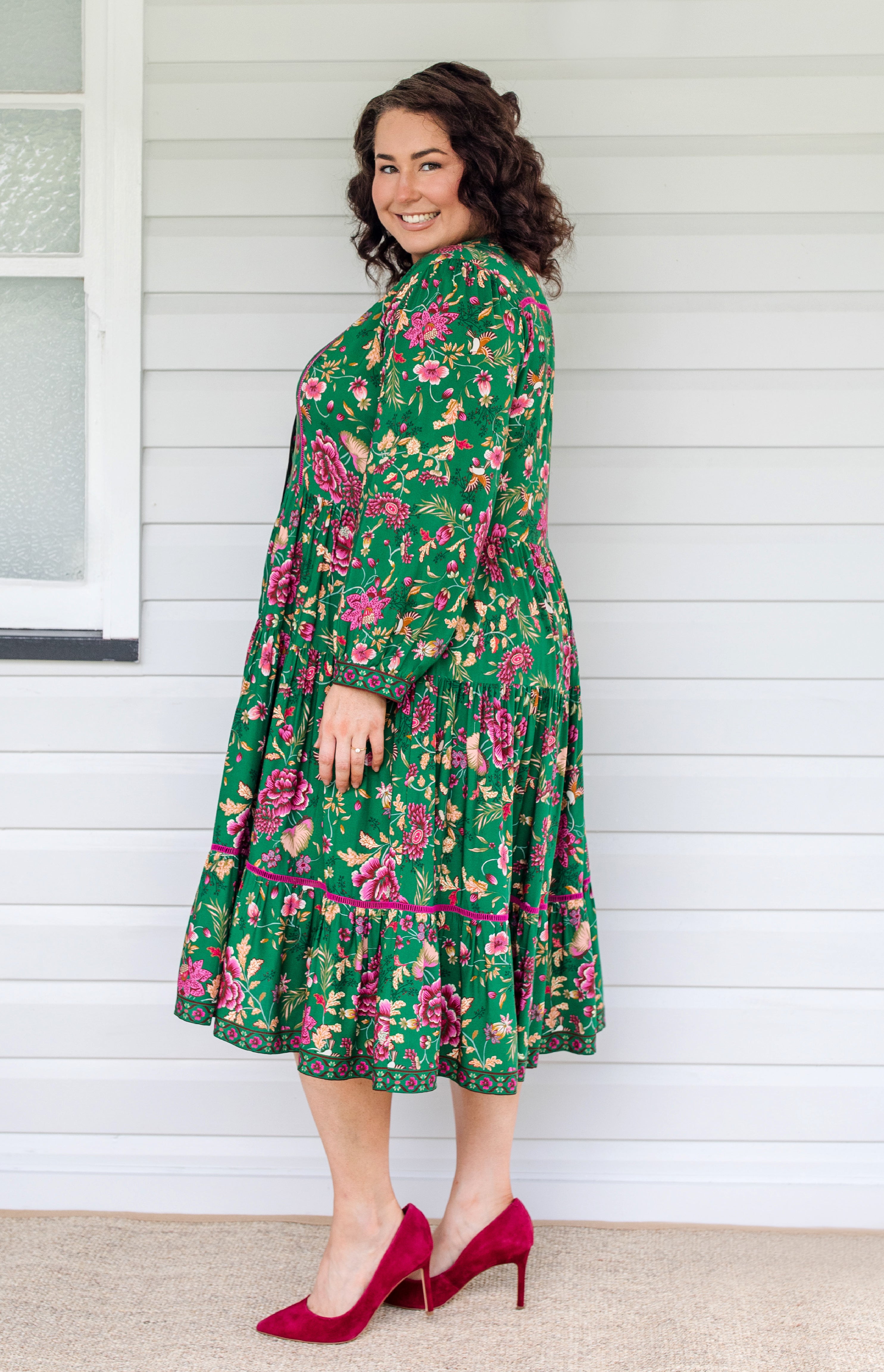 Maiocchi Sophia Dress in Flights of Fancy Green print.