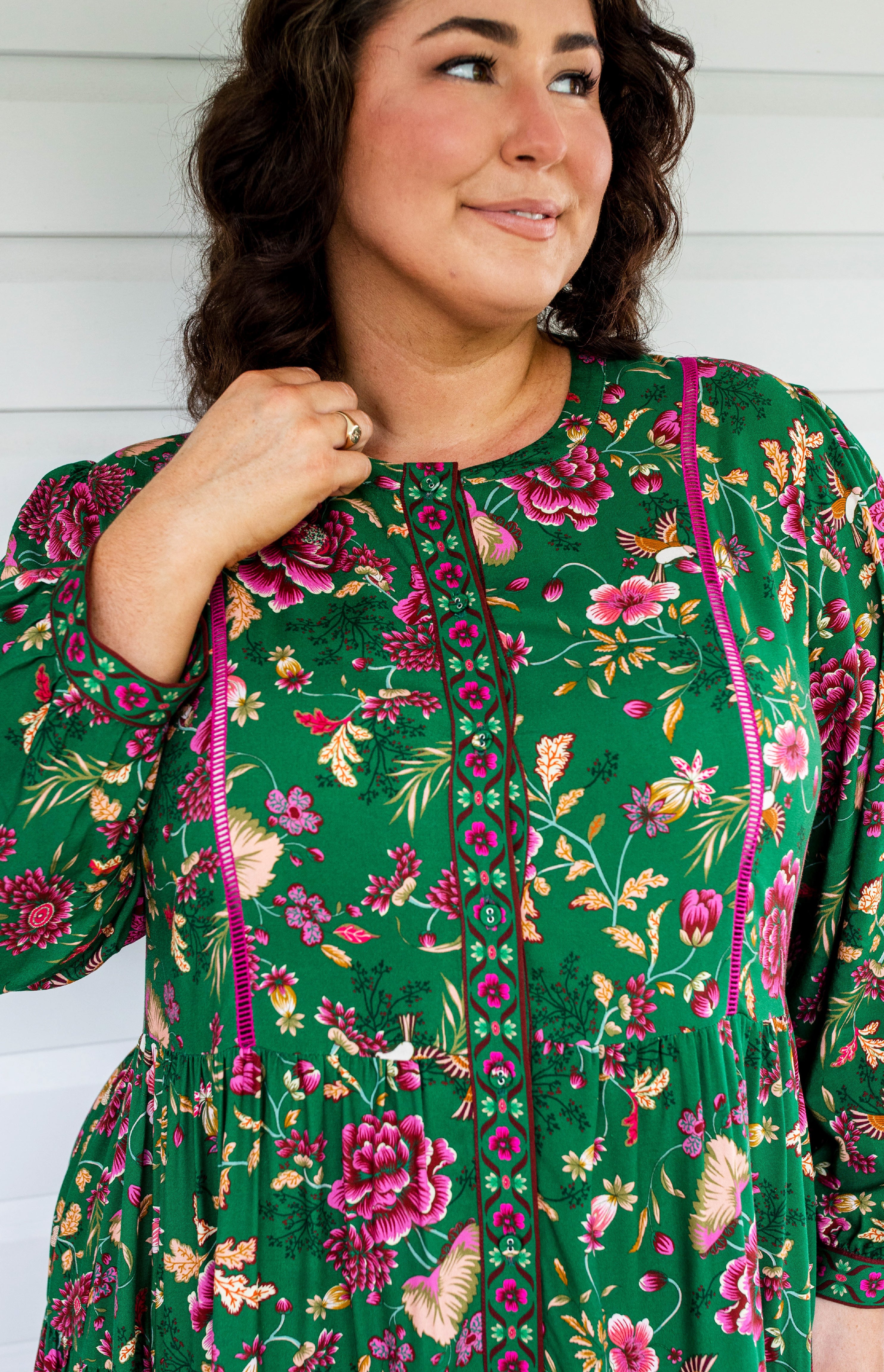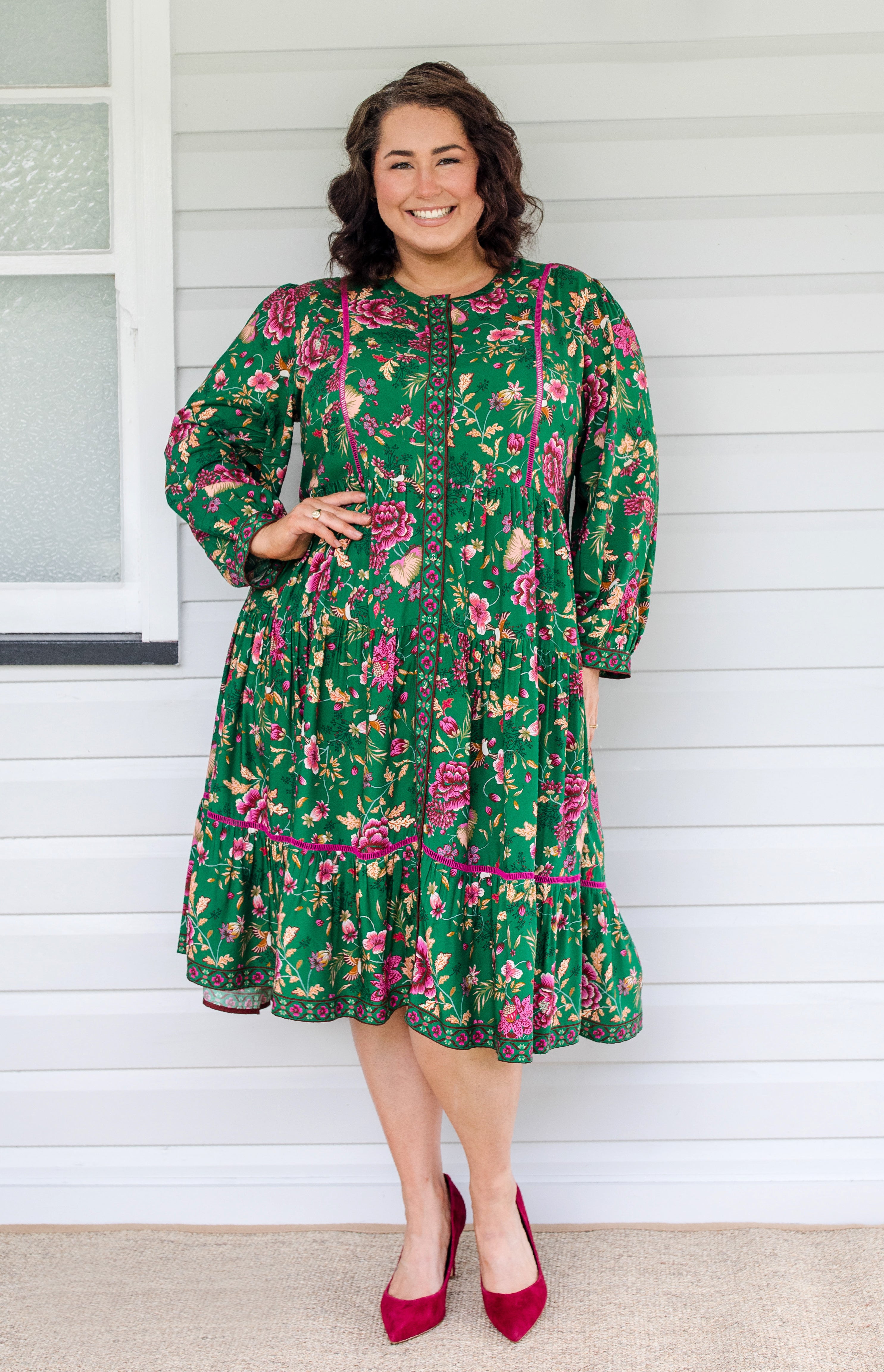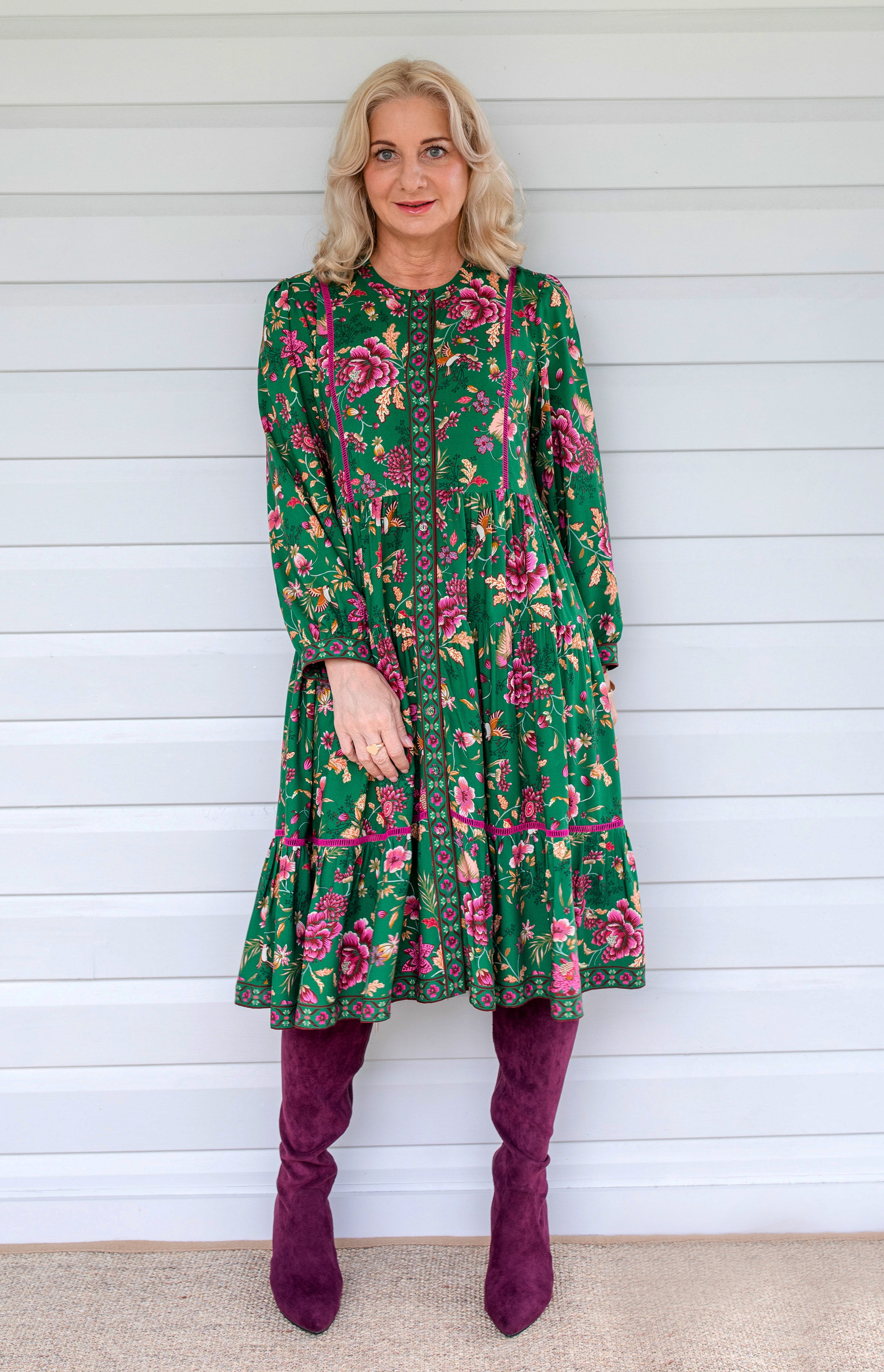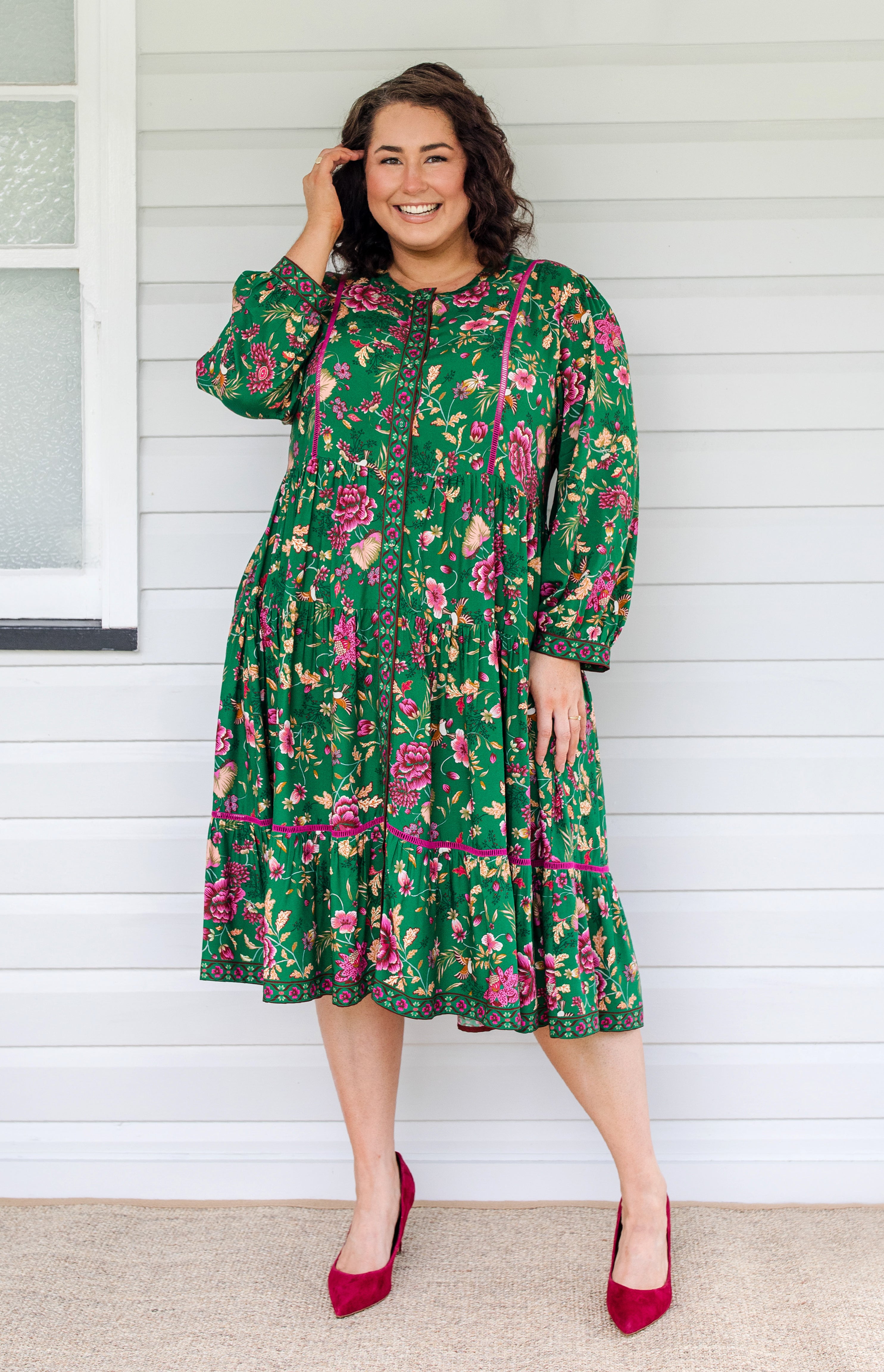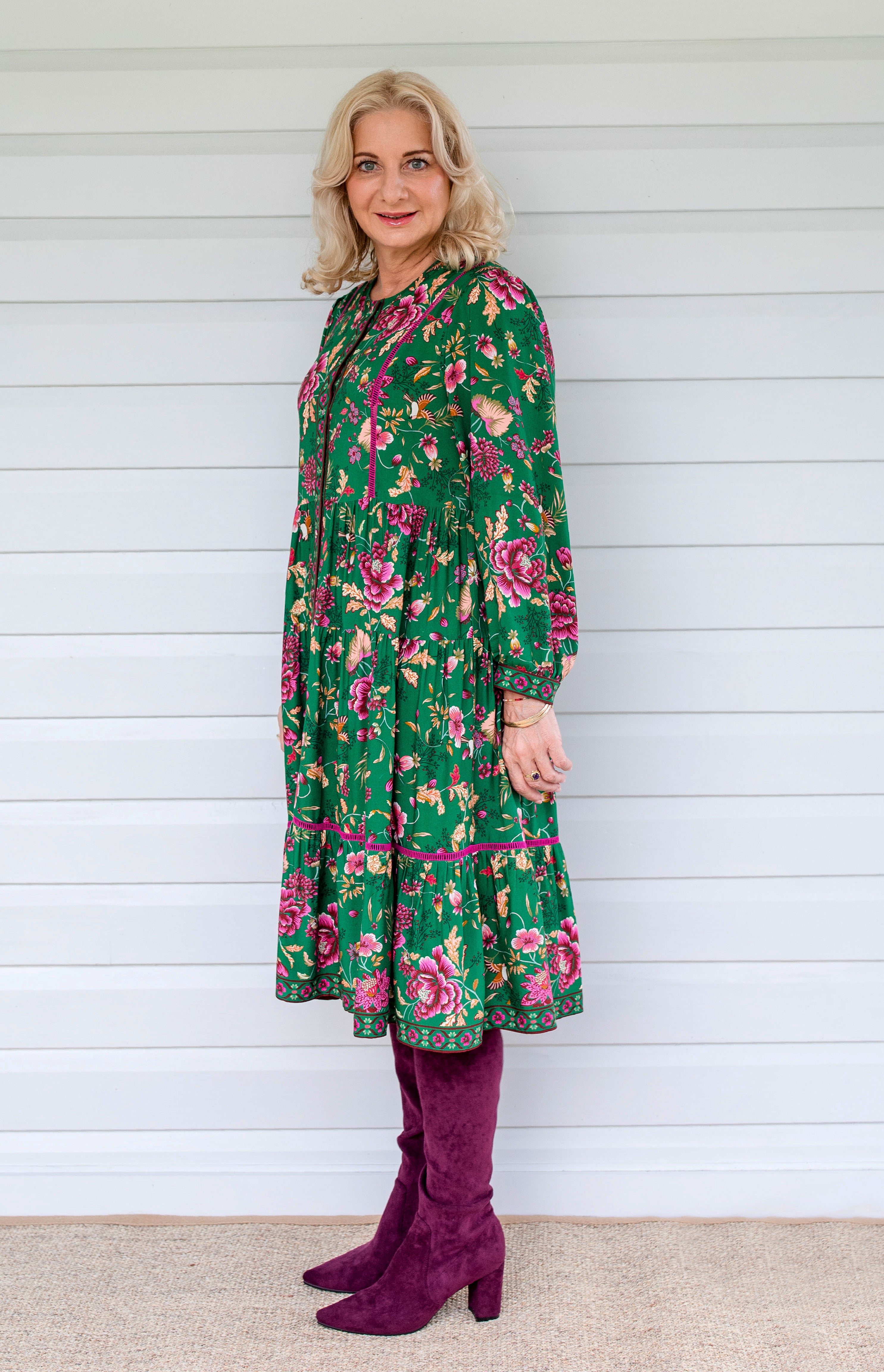 Maiocchi Sophia Dress in Flights of Fancy Green print.