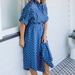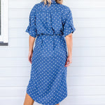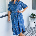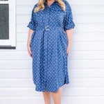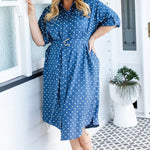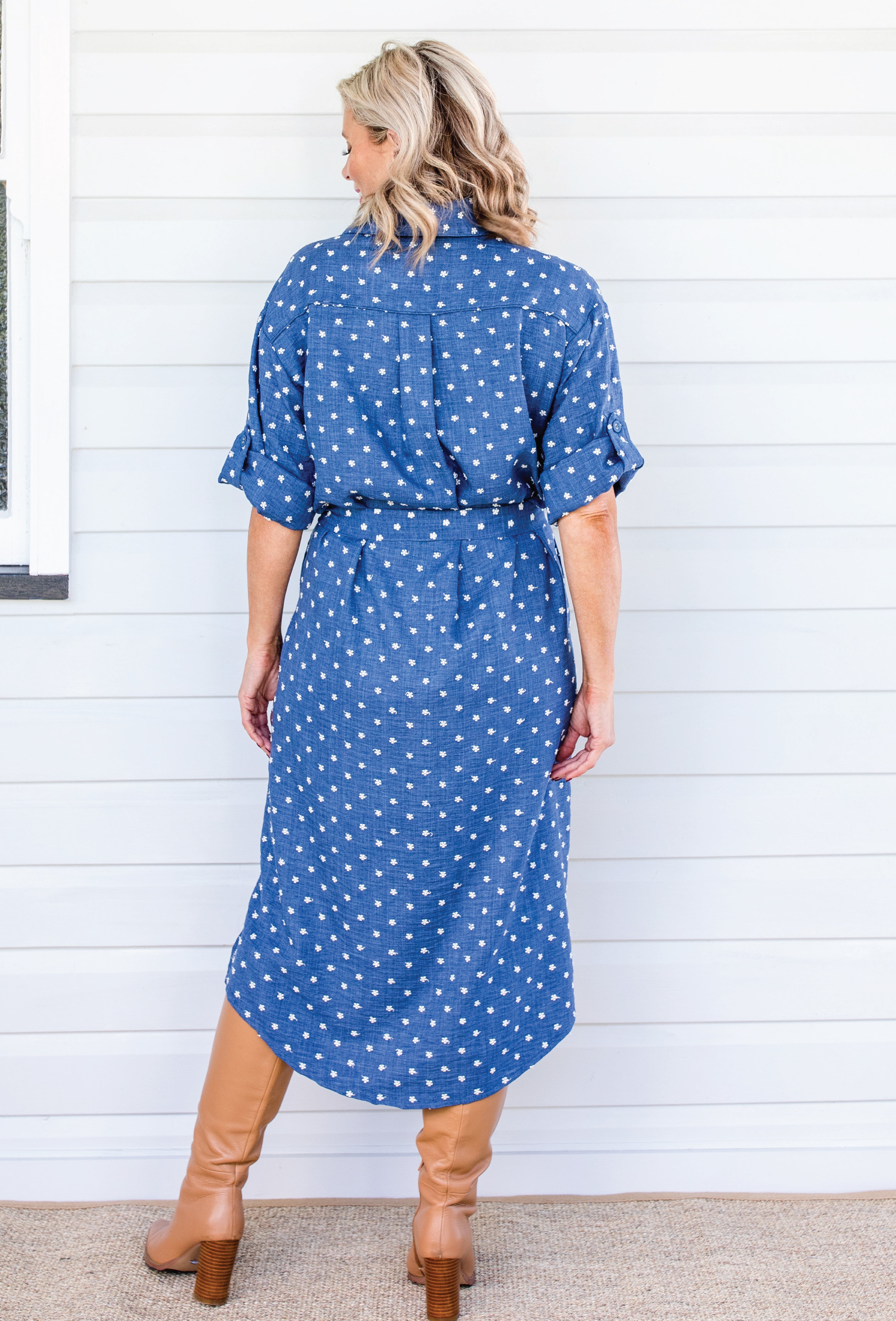 The Alison Shirt Dress is a traditional shirt dress style, and features a luxe denim fabric with little embroidered flowers.