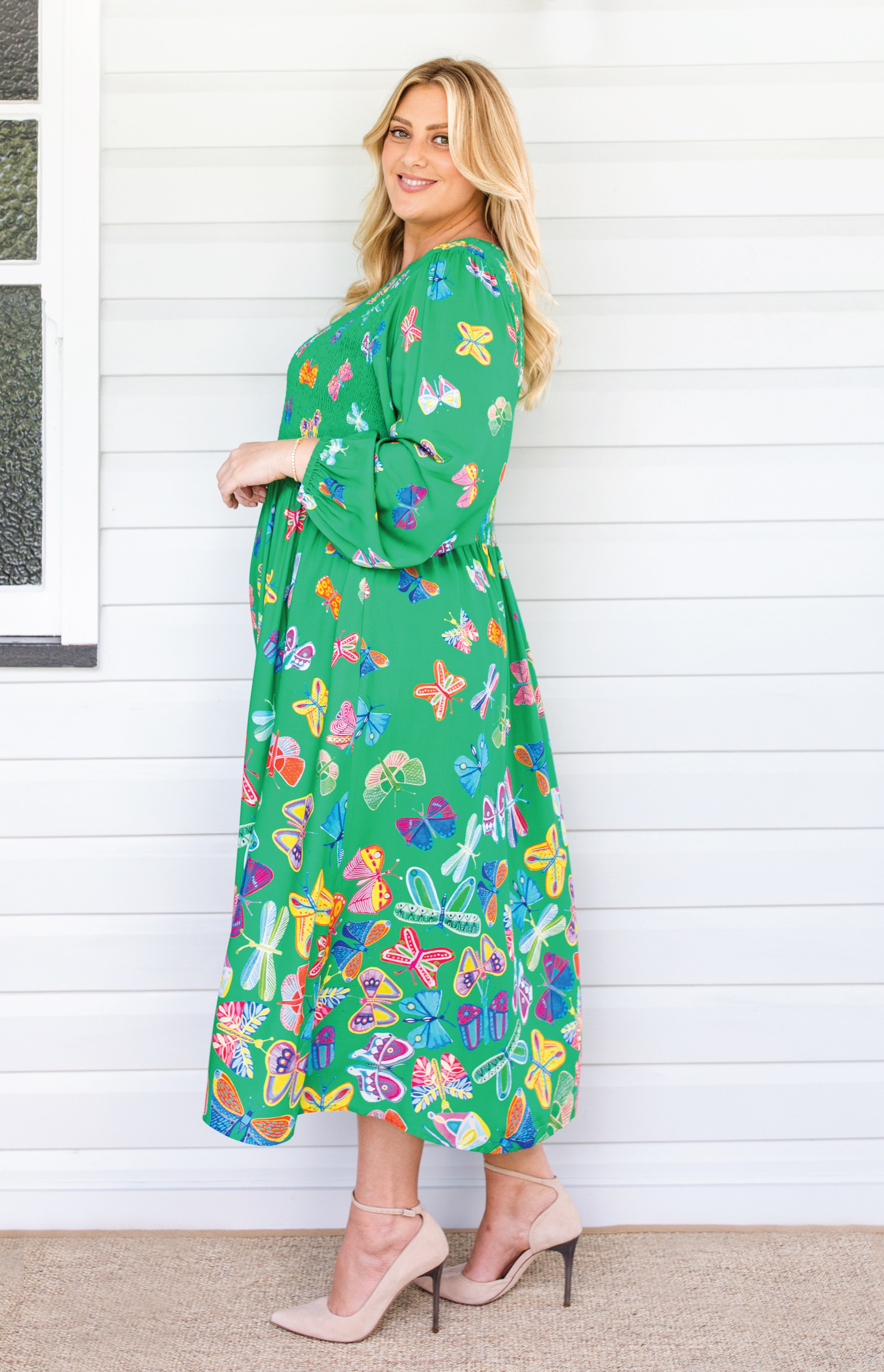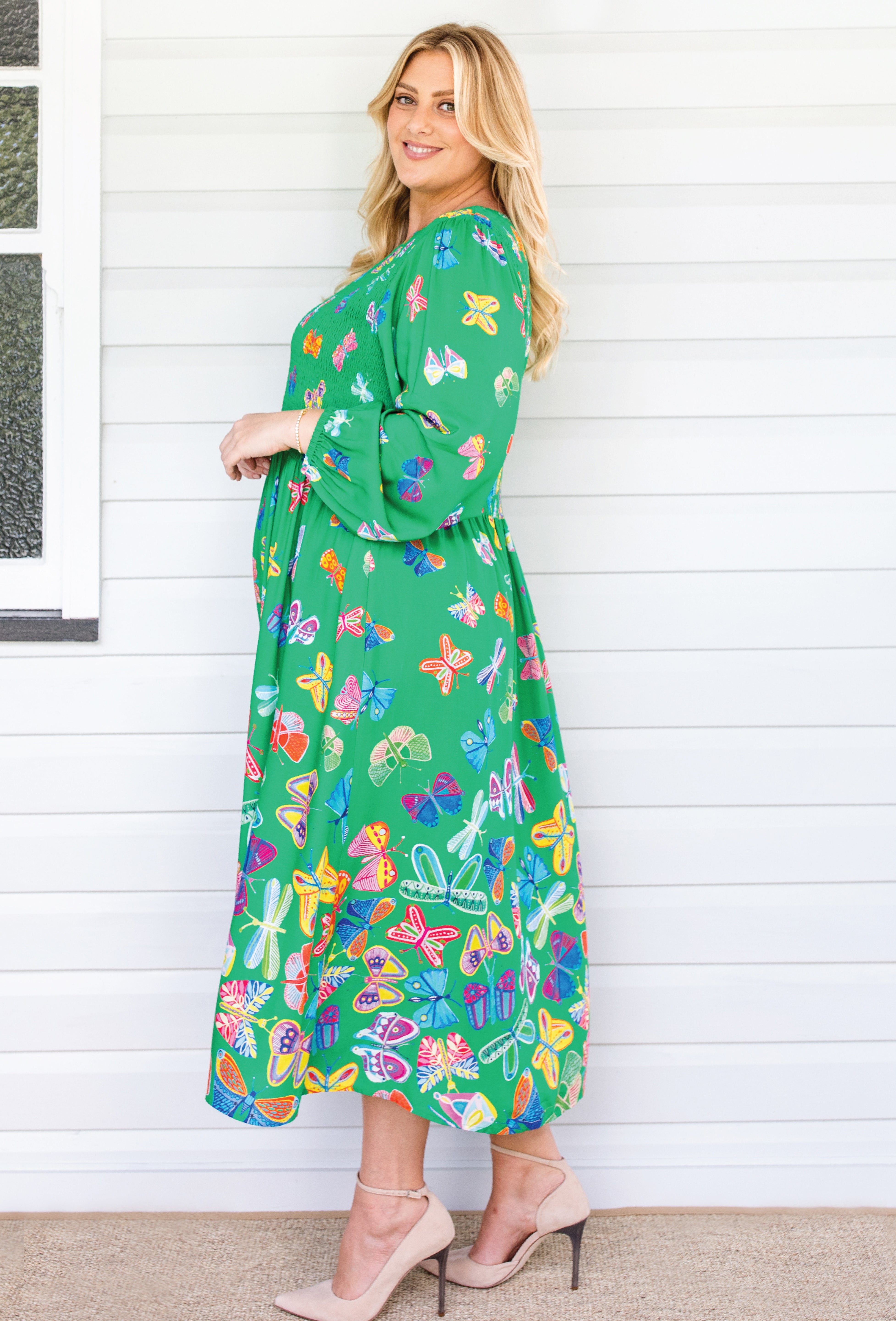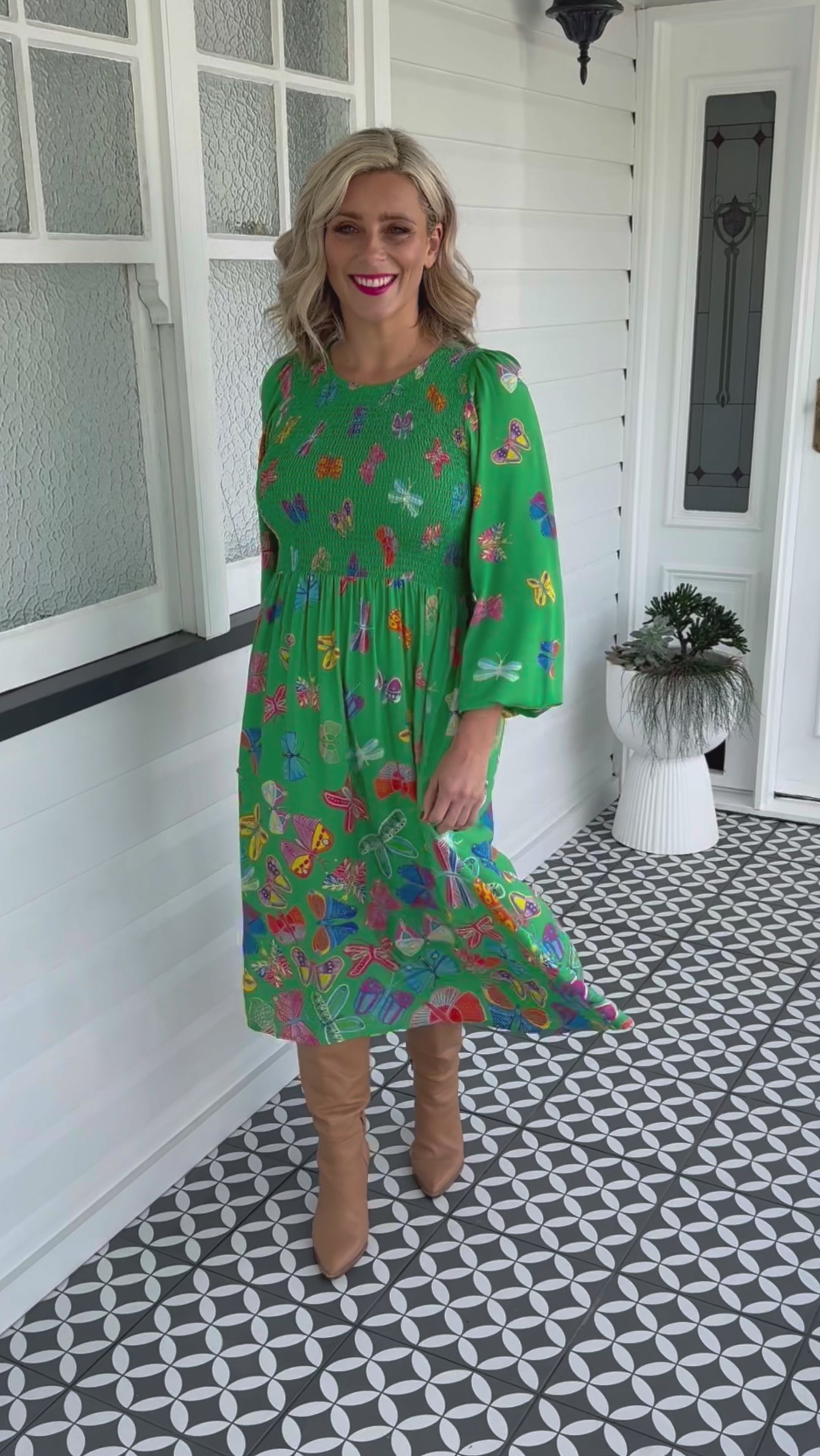 Our Barbados Midi Dress features a shirred bodice, a tiered skirt skirt, and a gathered sleeve. She is oh so comfortable and easy to wear and can take you from the rooftop bar to a fancy ladies lunch xo