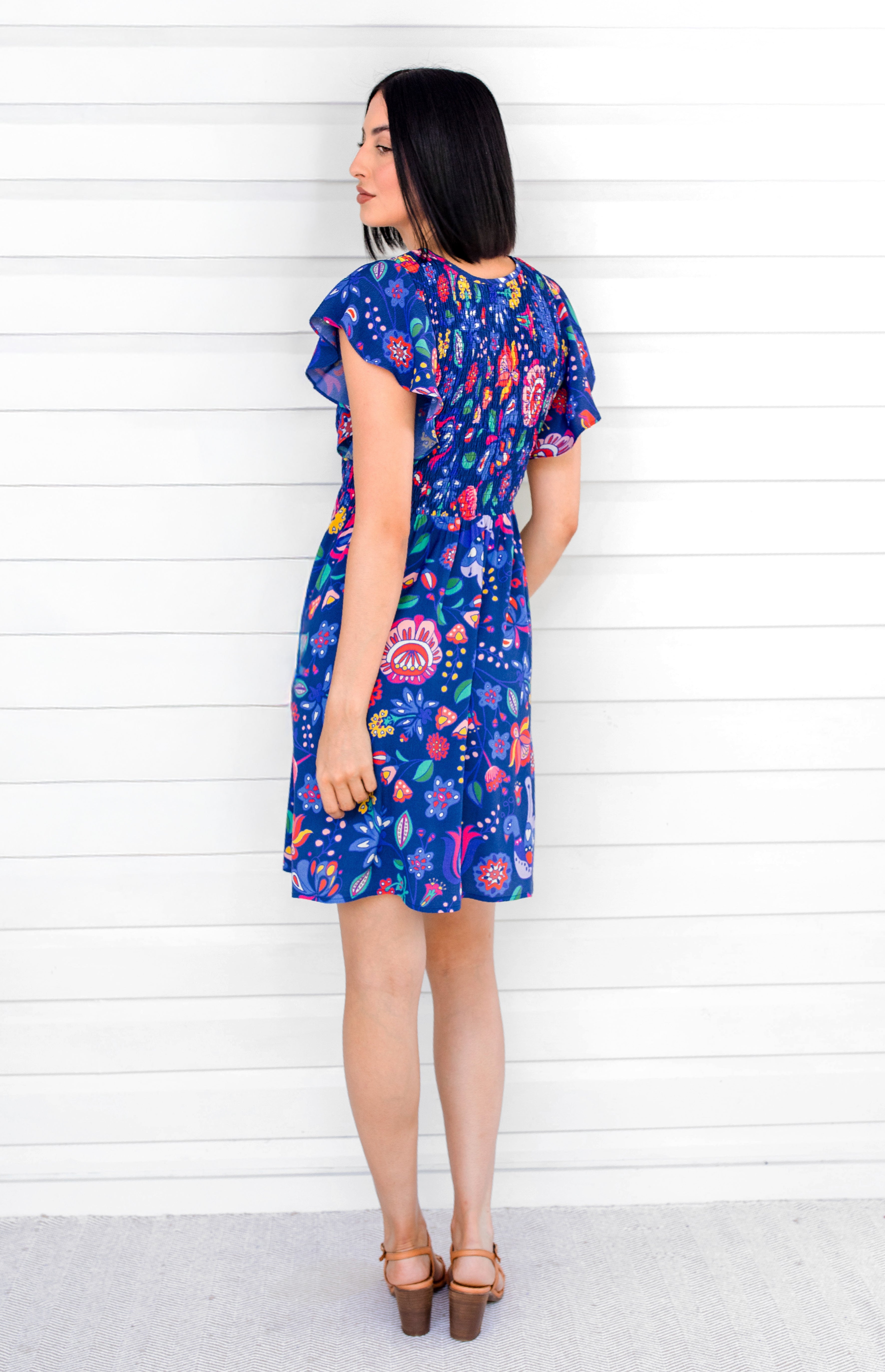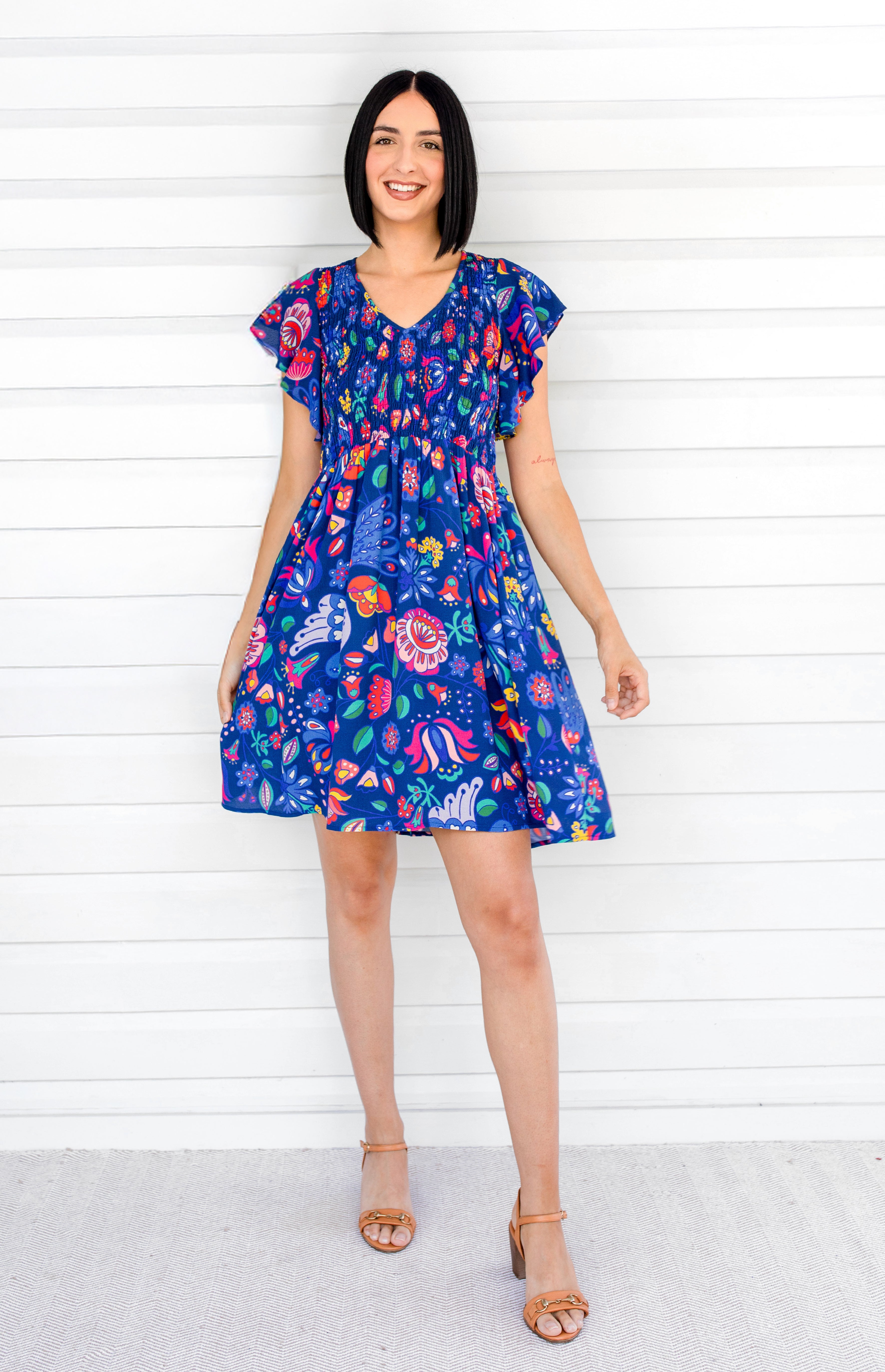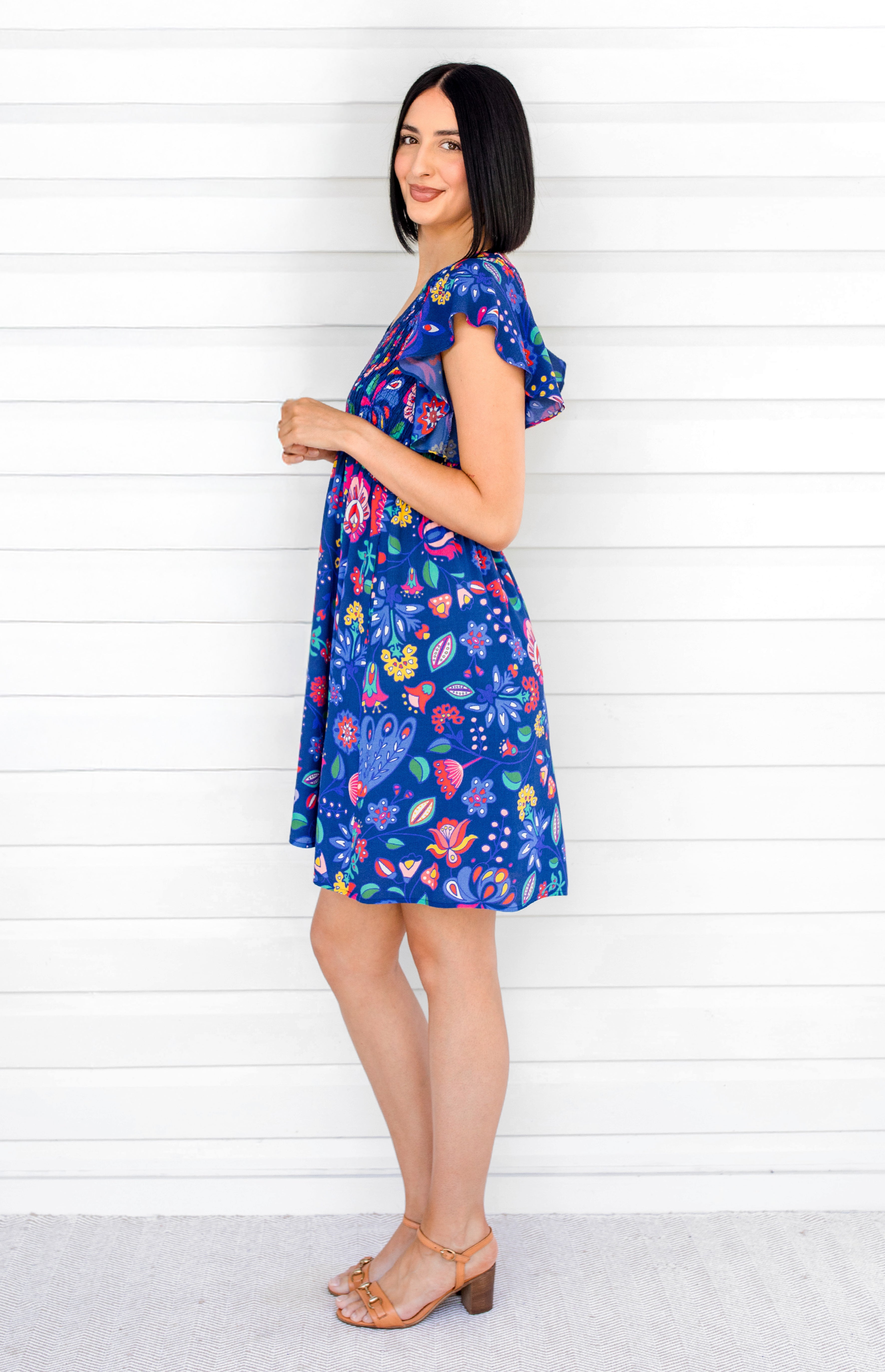 Statement fluttery sleeves, a shirred bodice and a fabulous A-line silhouette makes her oh so comfortable, stylish, and ready for any occasion.