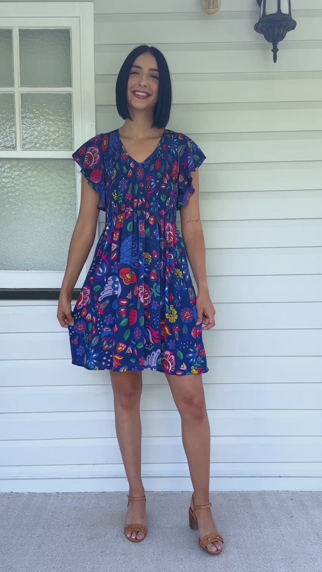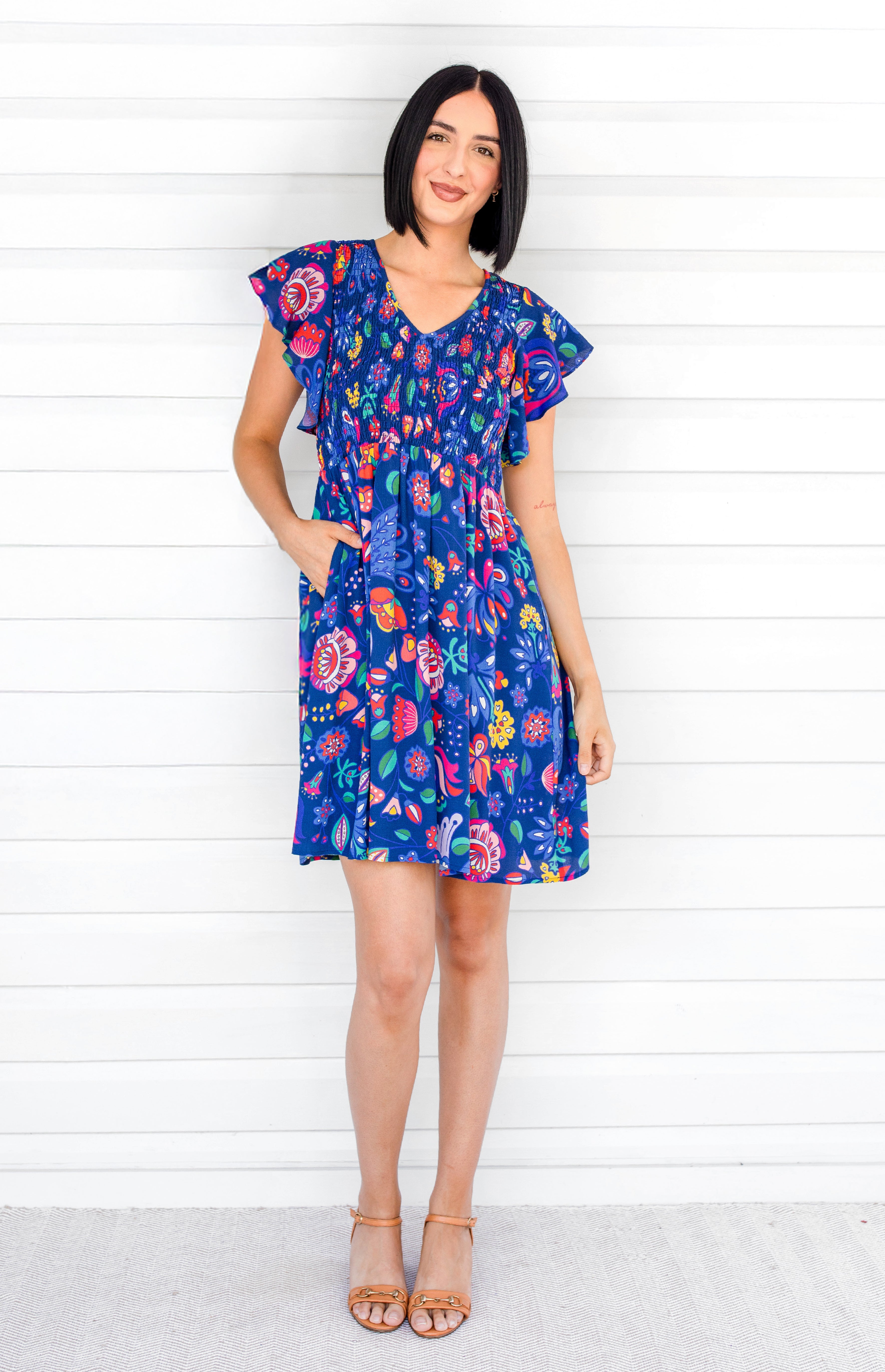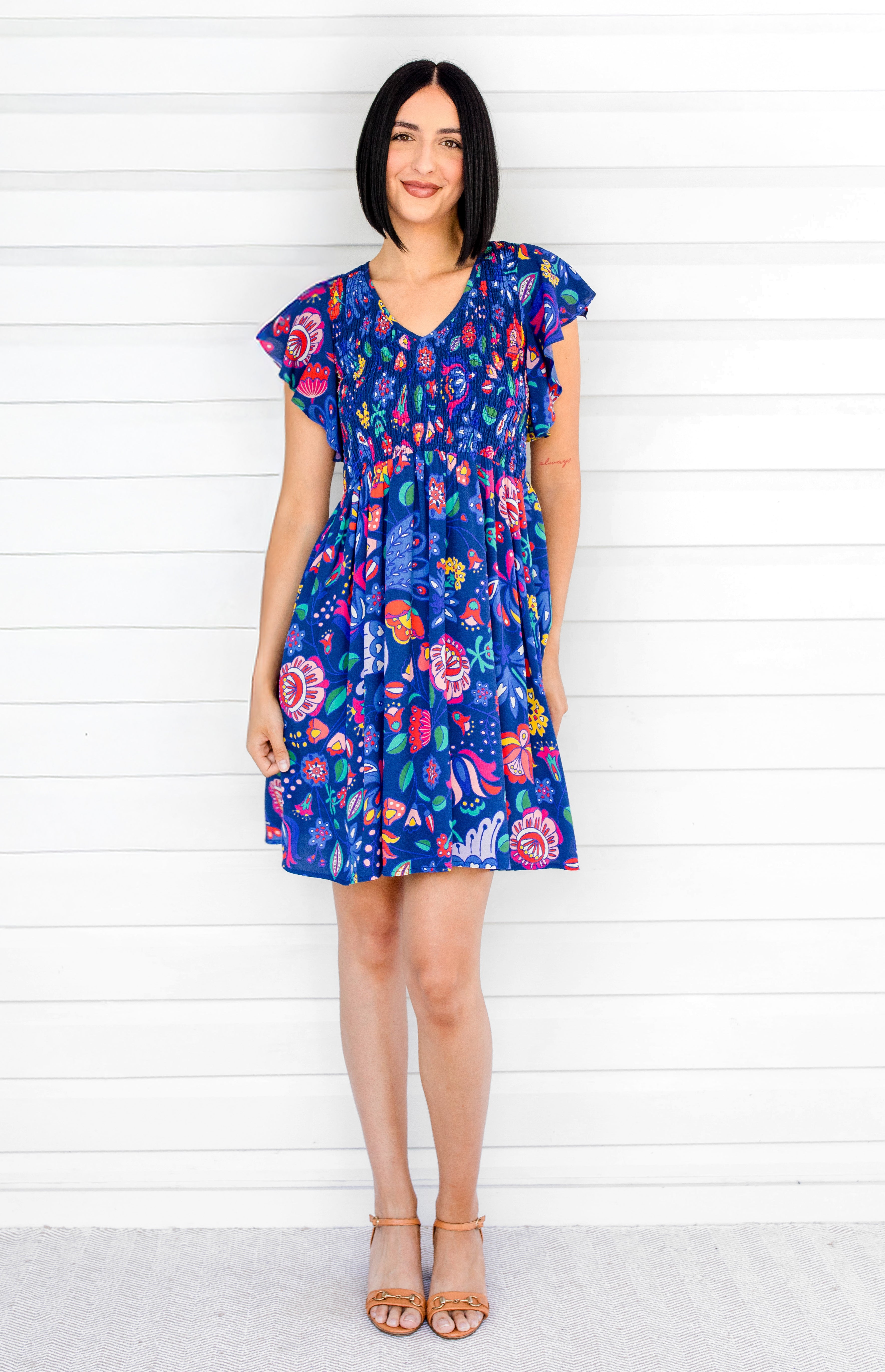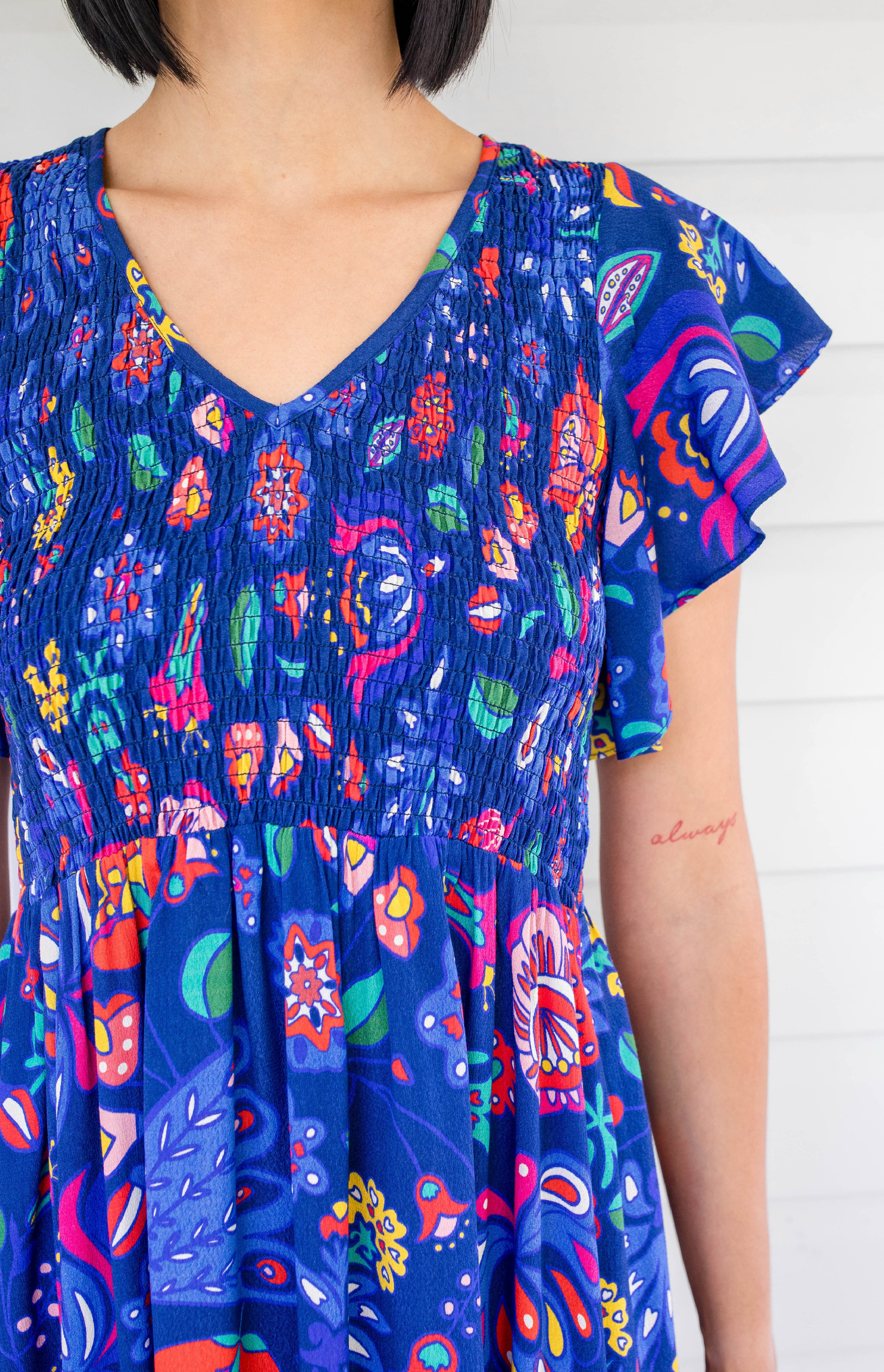 Statement fluttery sleeves, a shirred bodice and a fabulous A-line silhouette makes her oh so comfortable, stylish, and ready for any occasion.