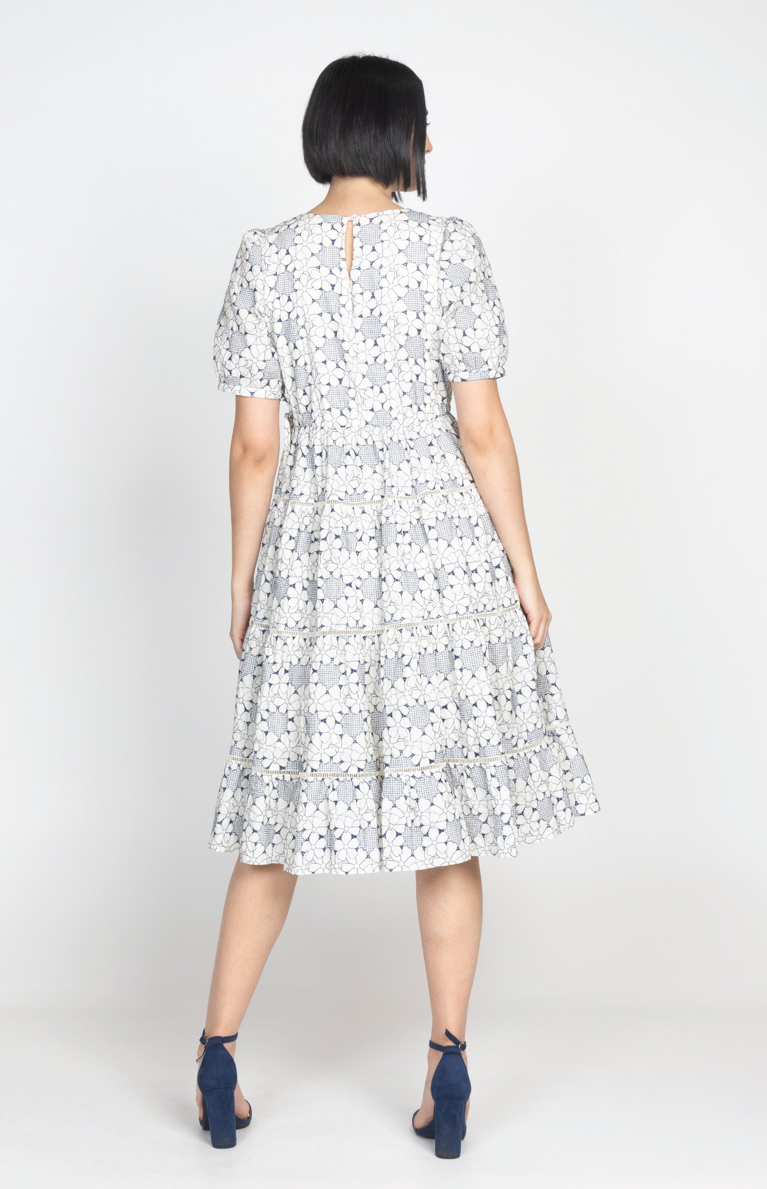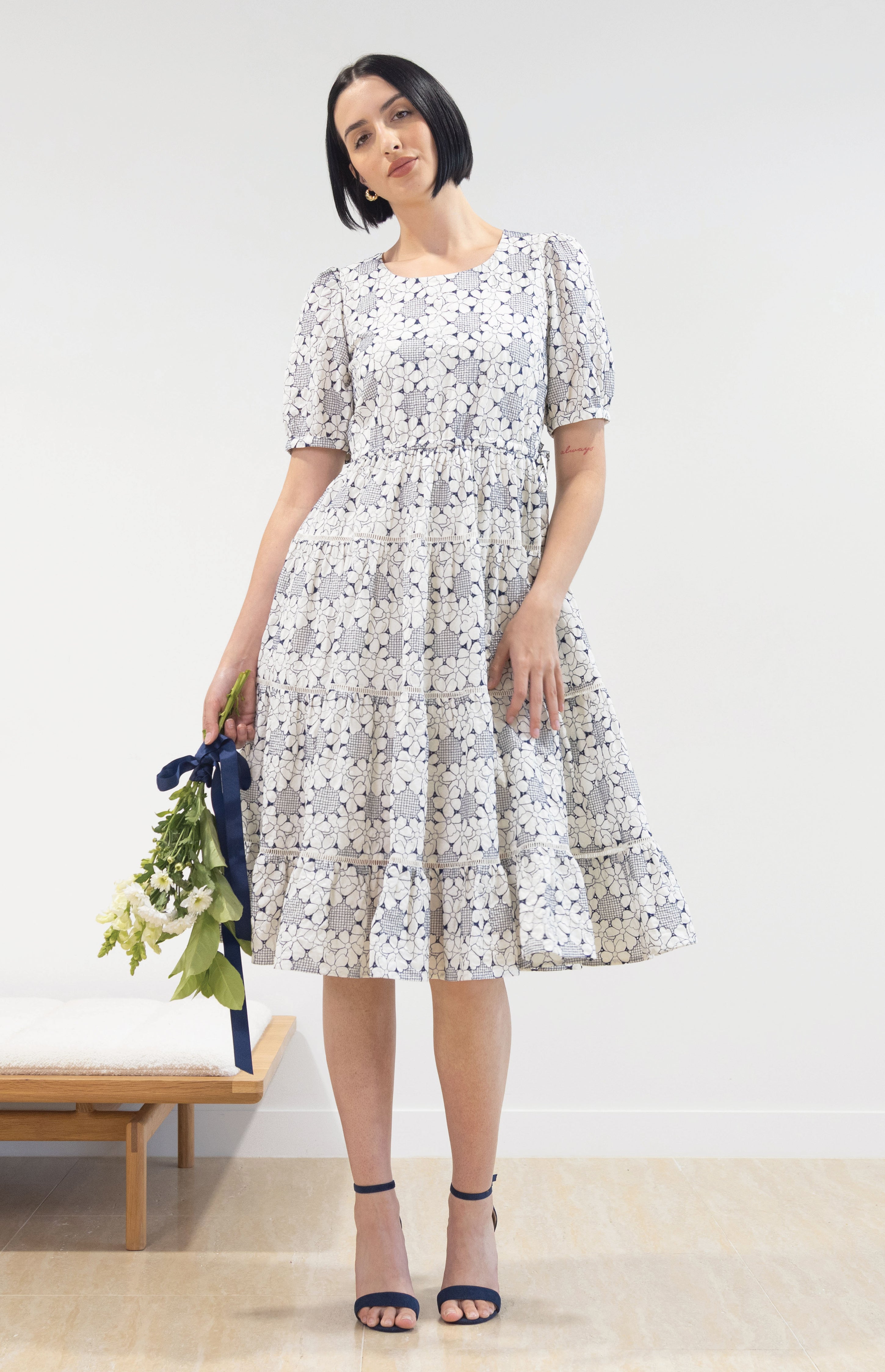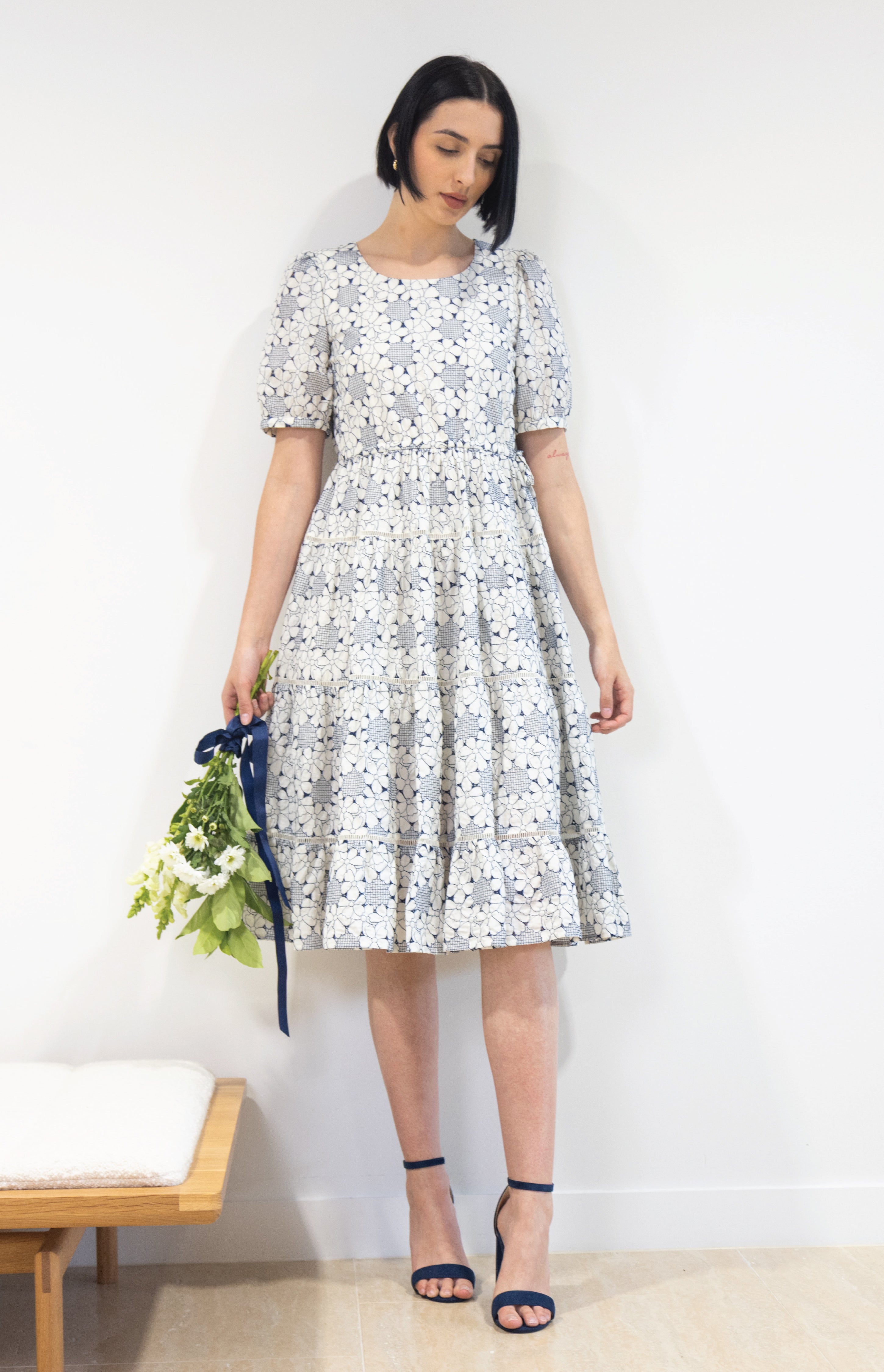 Eloise is crafted in the most delicate cotton embroidered lace and fully lined in cotton for a striking, yet cool and effortless look for summer. The pretty little details - softly gathered sleeves, a fabulous full skirt, and ladder lace trim - make this dress a truly special piece you will wear and love forever.