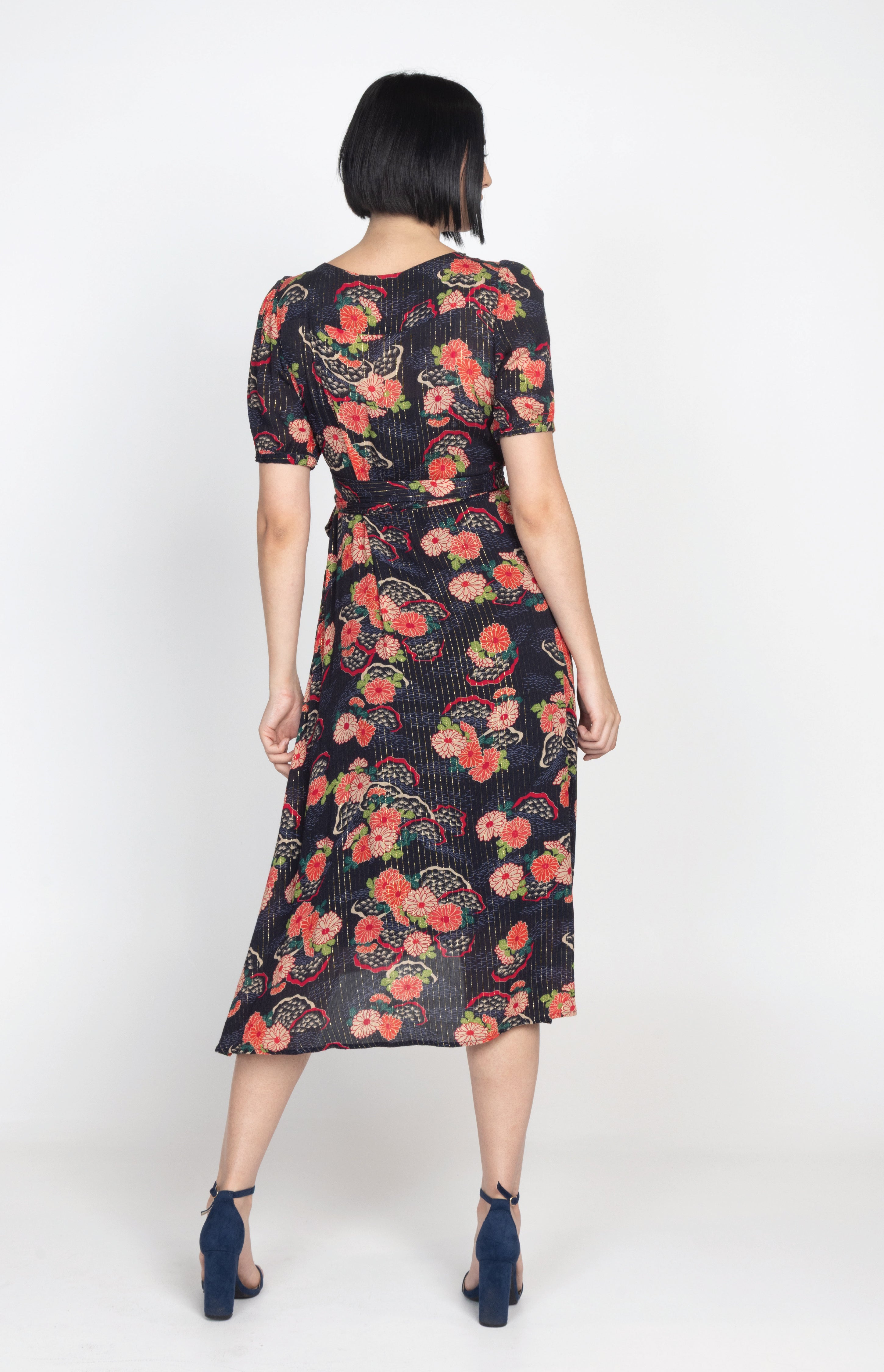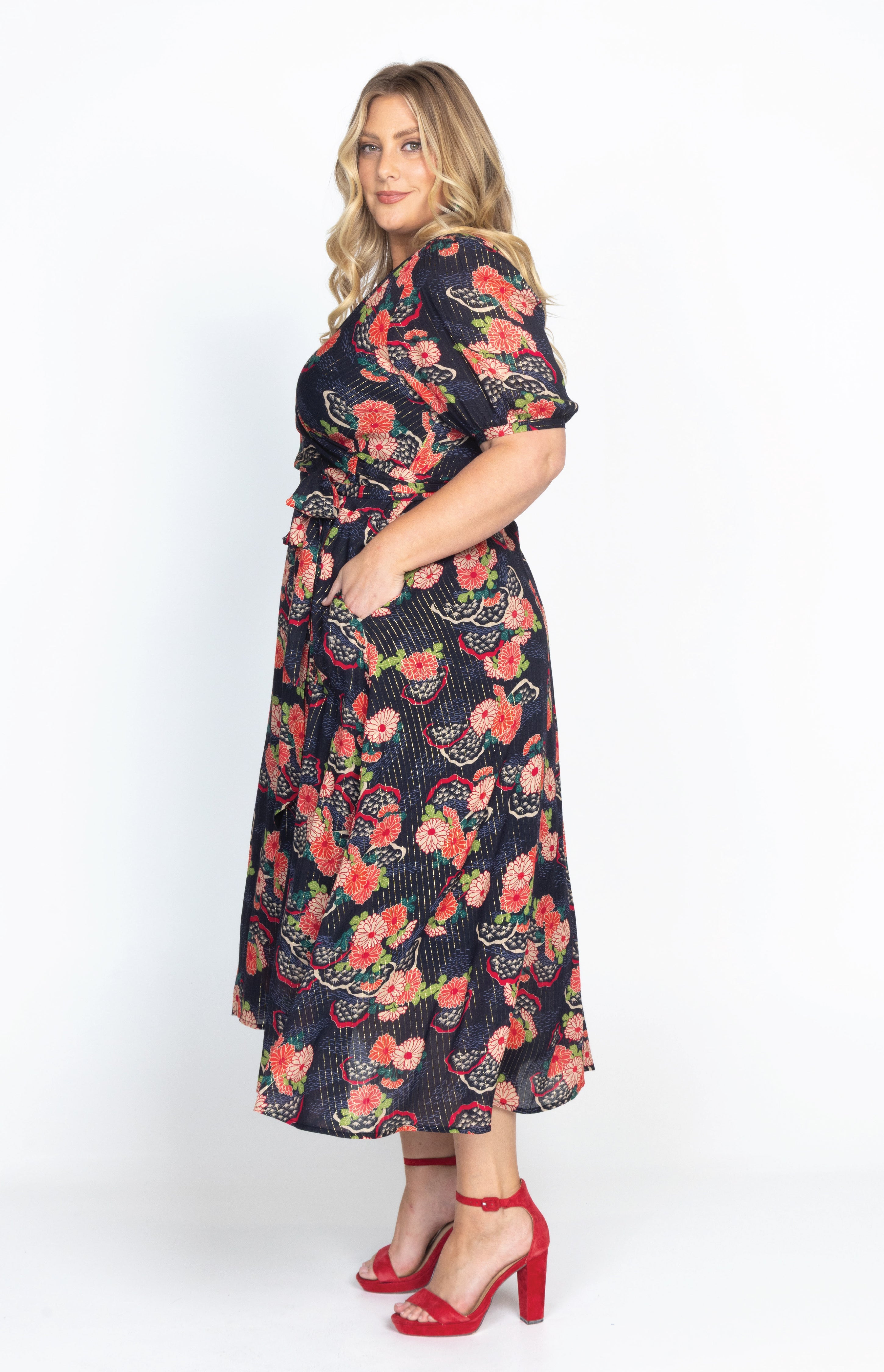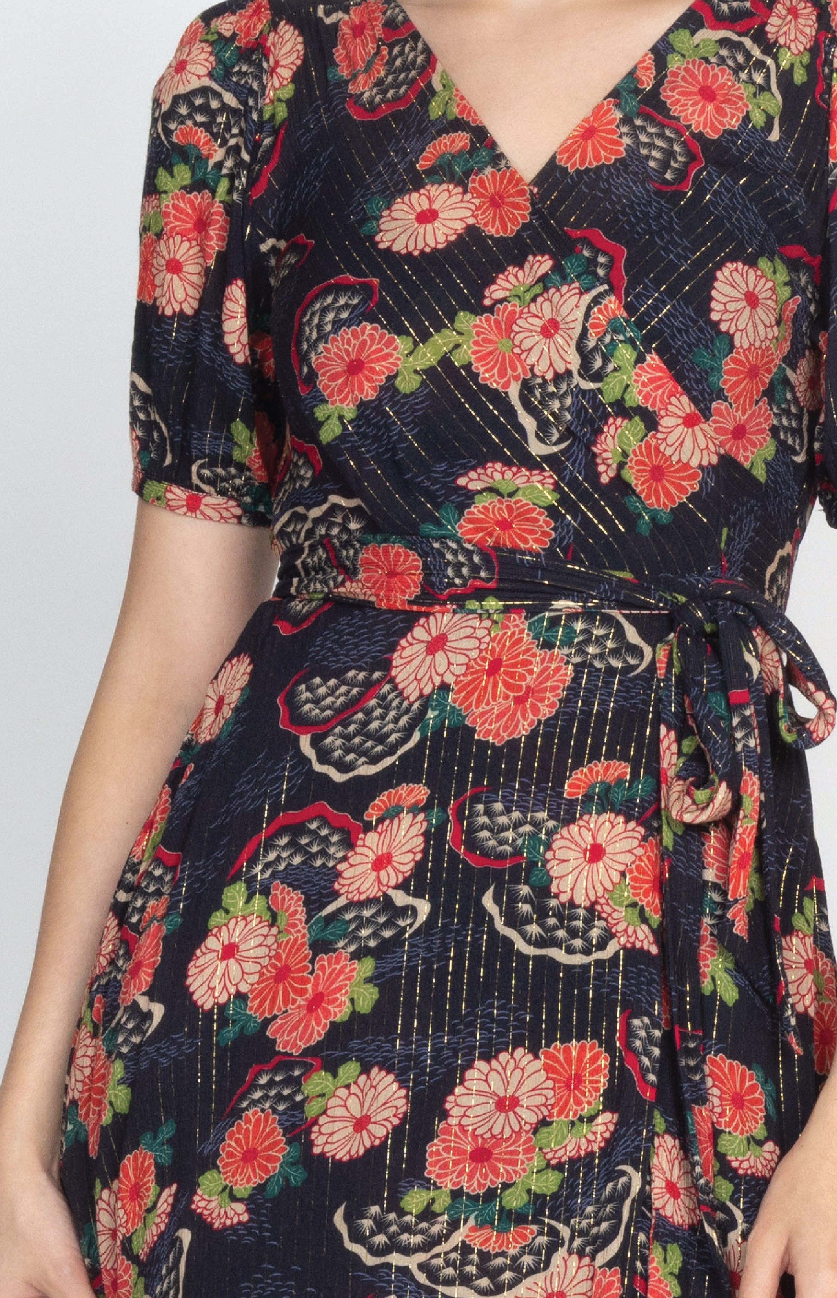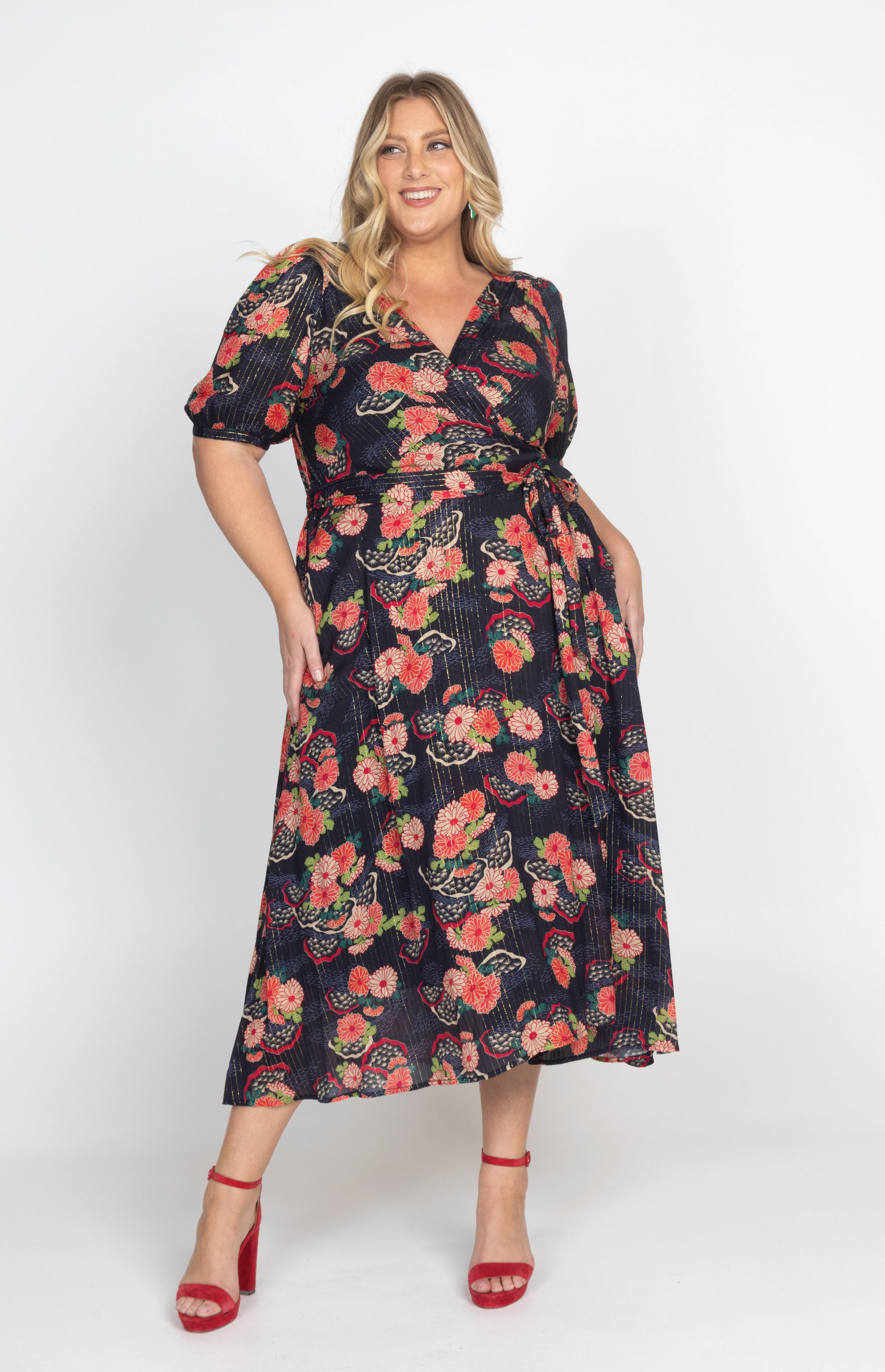 Our new Scarlett Dress is a true wrap silhouette crafted in a sheer fabric with a subtle sparkle stripe, and she comes complete with a separate slip dress for comfort and coverage.