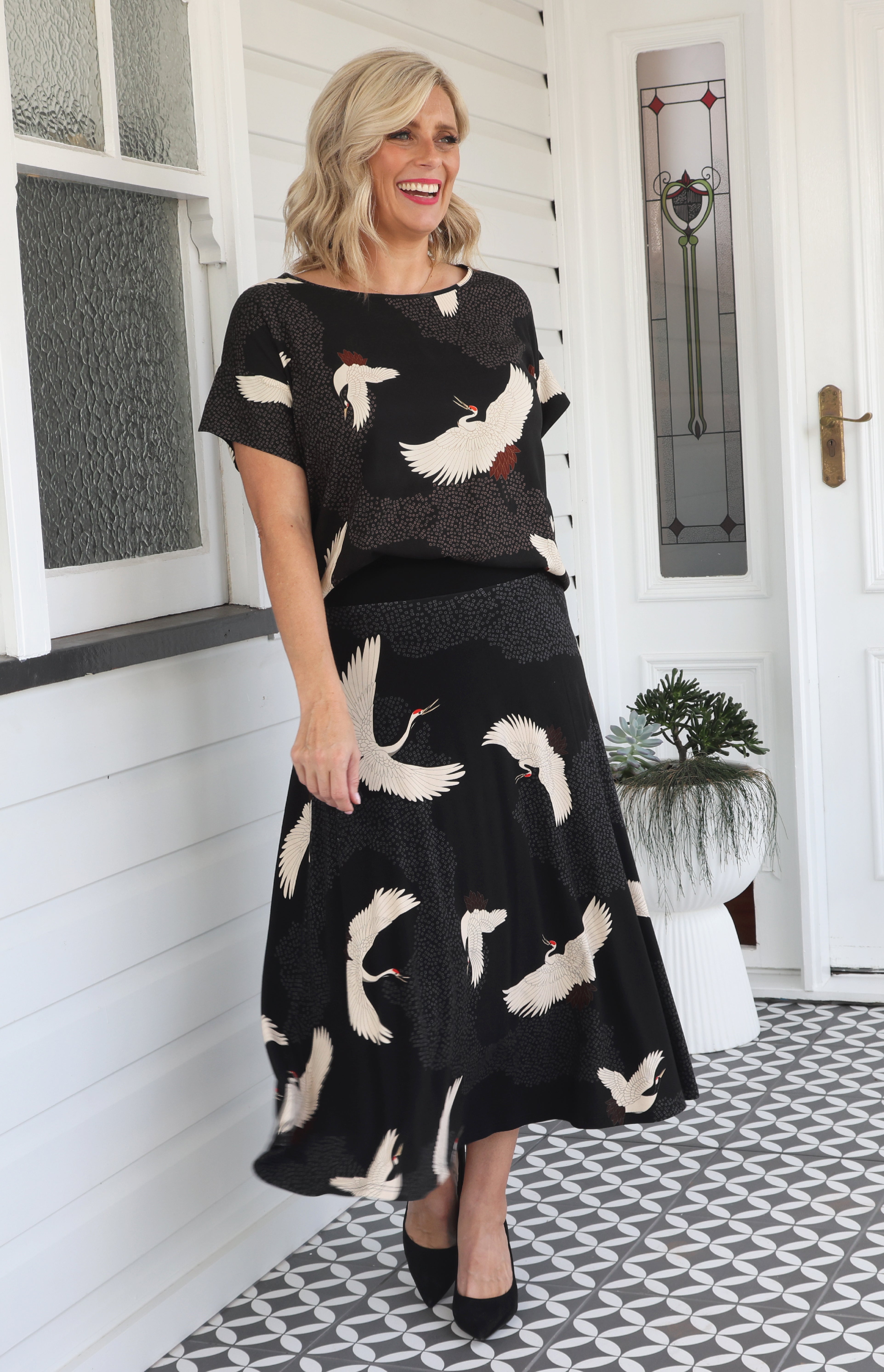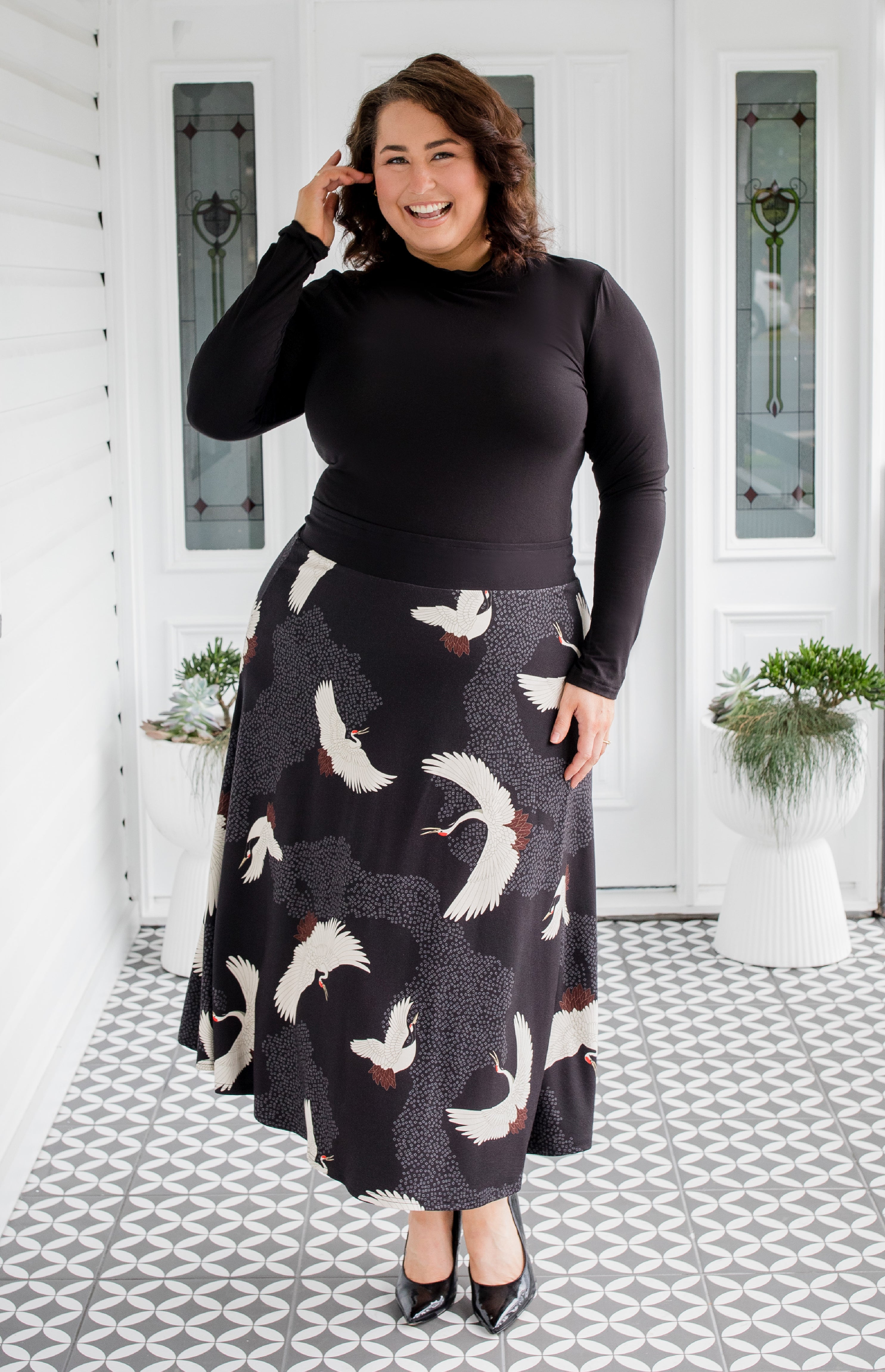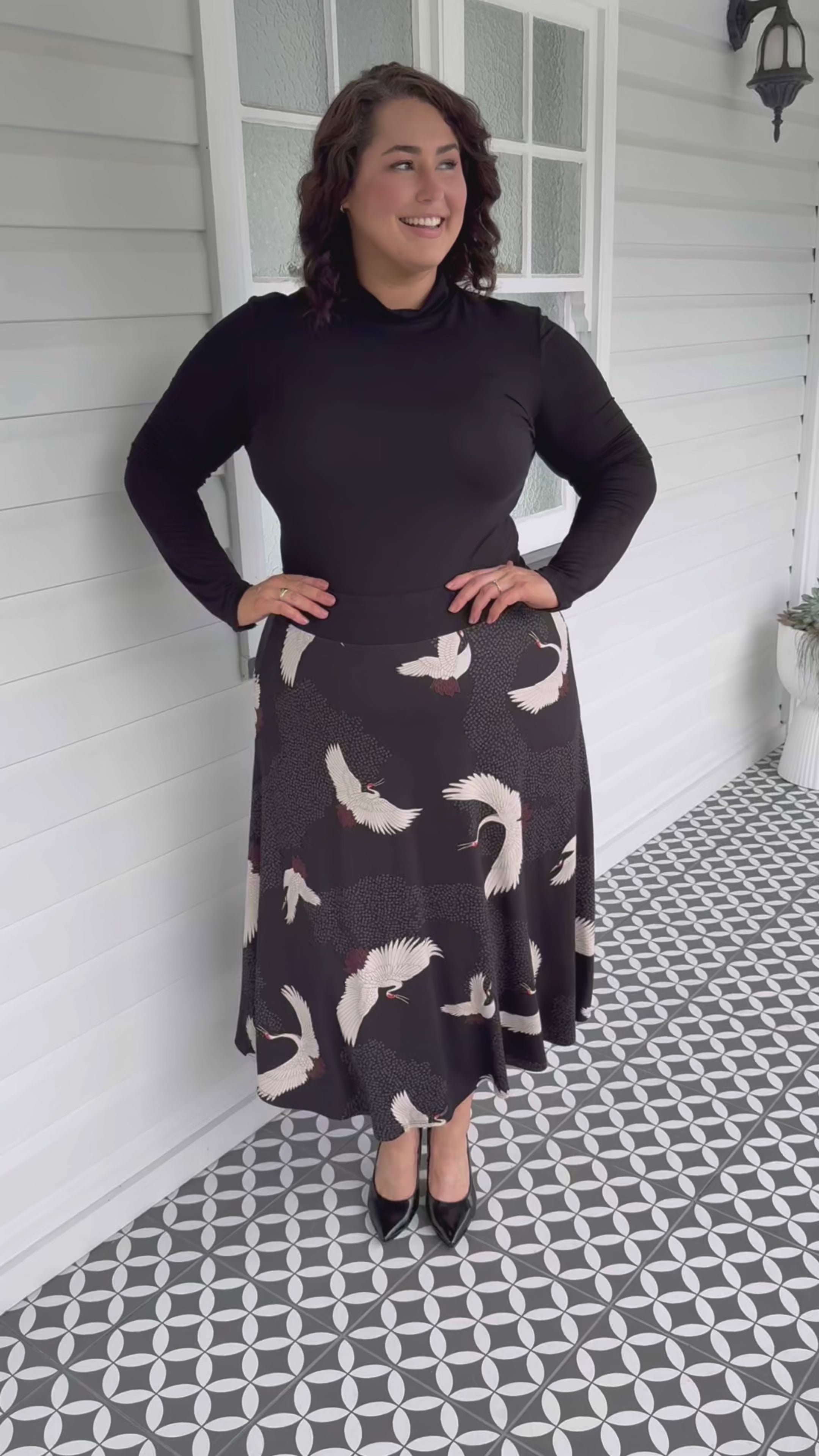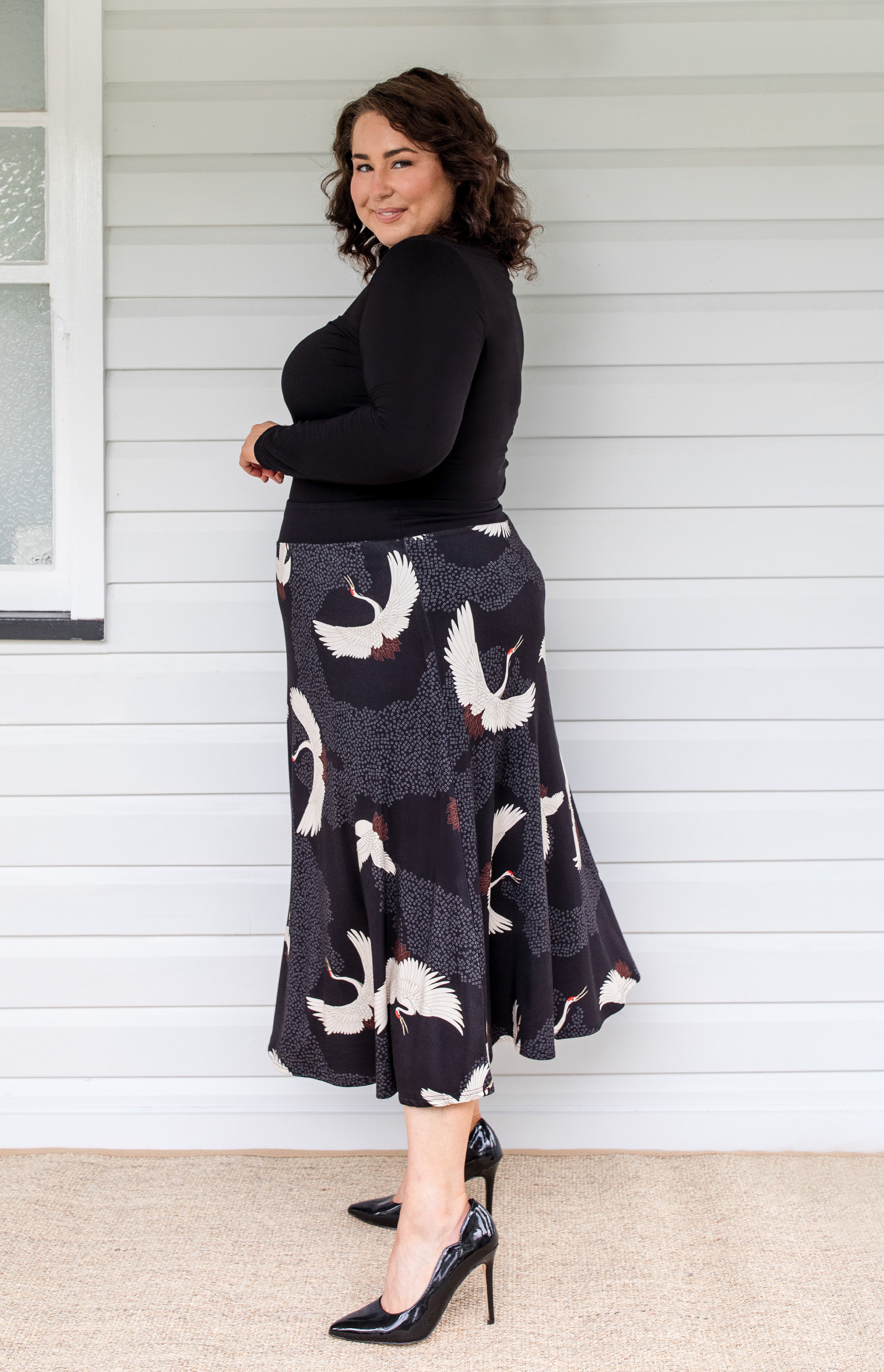 Fashioned in our beautiful bamboo jersey, with a ponte yoke so that the skirt is light and twirly but the thick stretch yoke ensures it stays firmly in place and feels comfortable to wear.