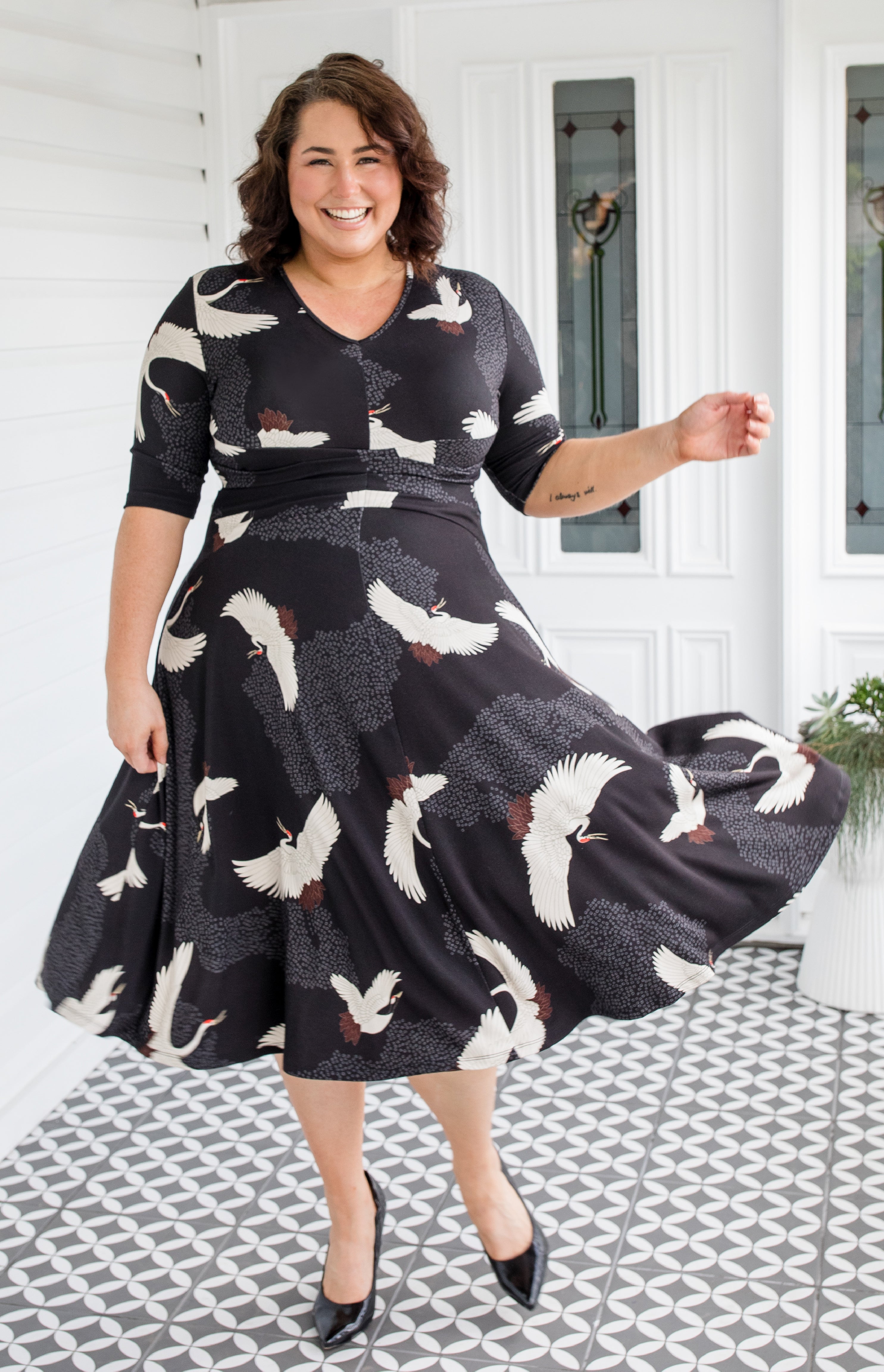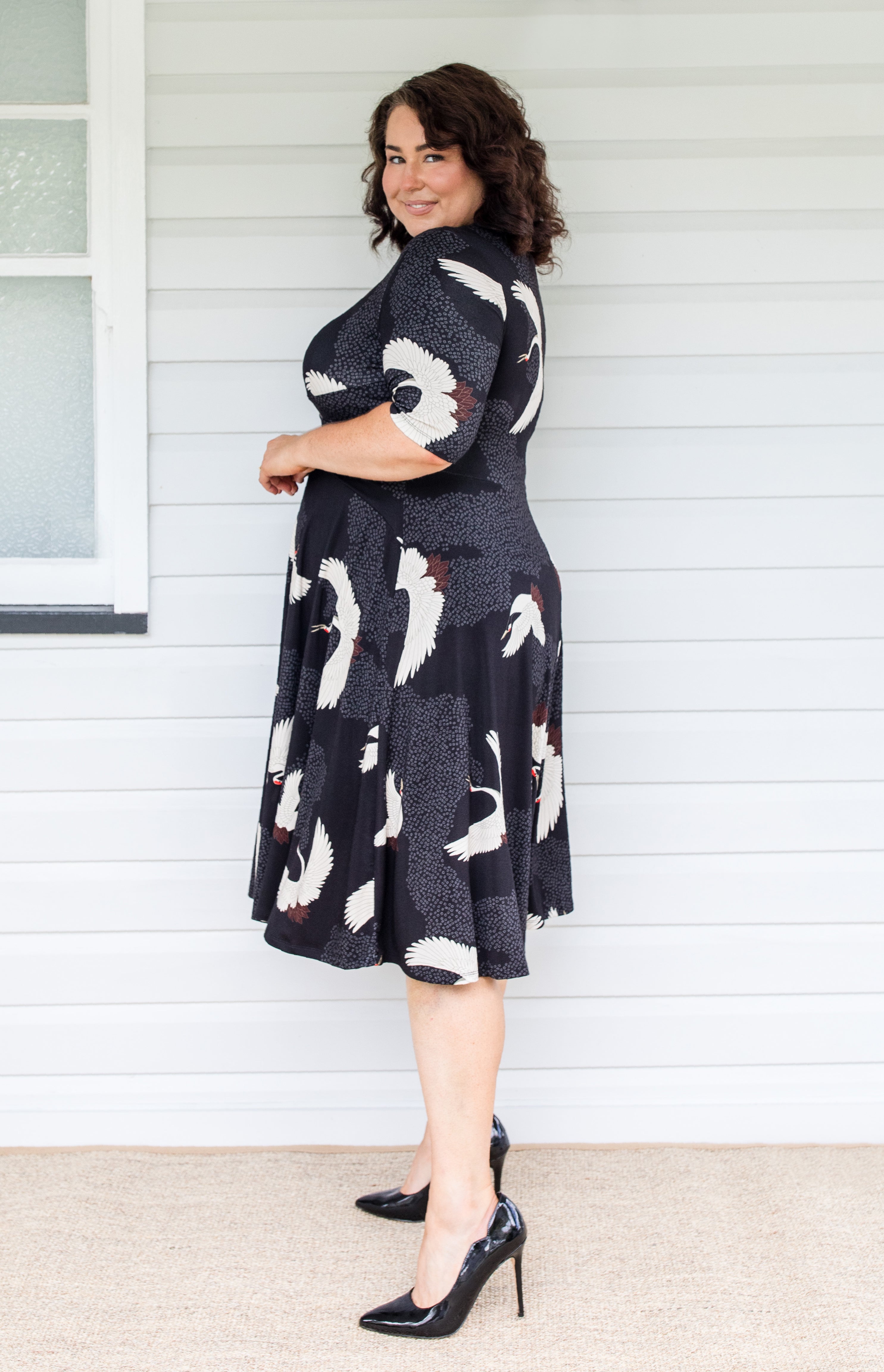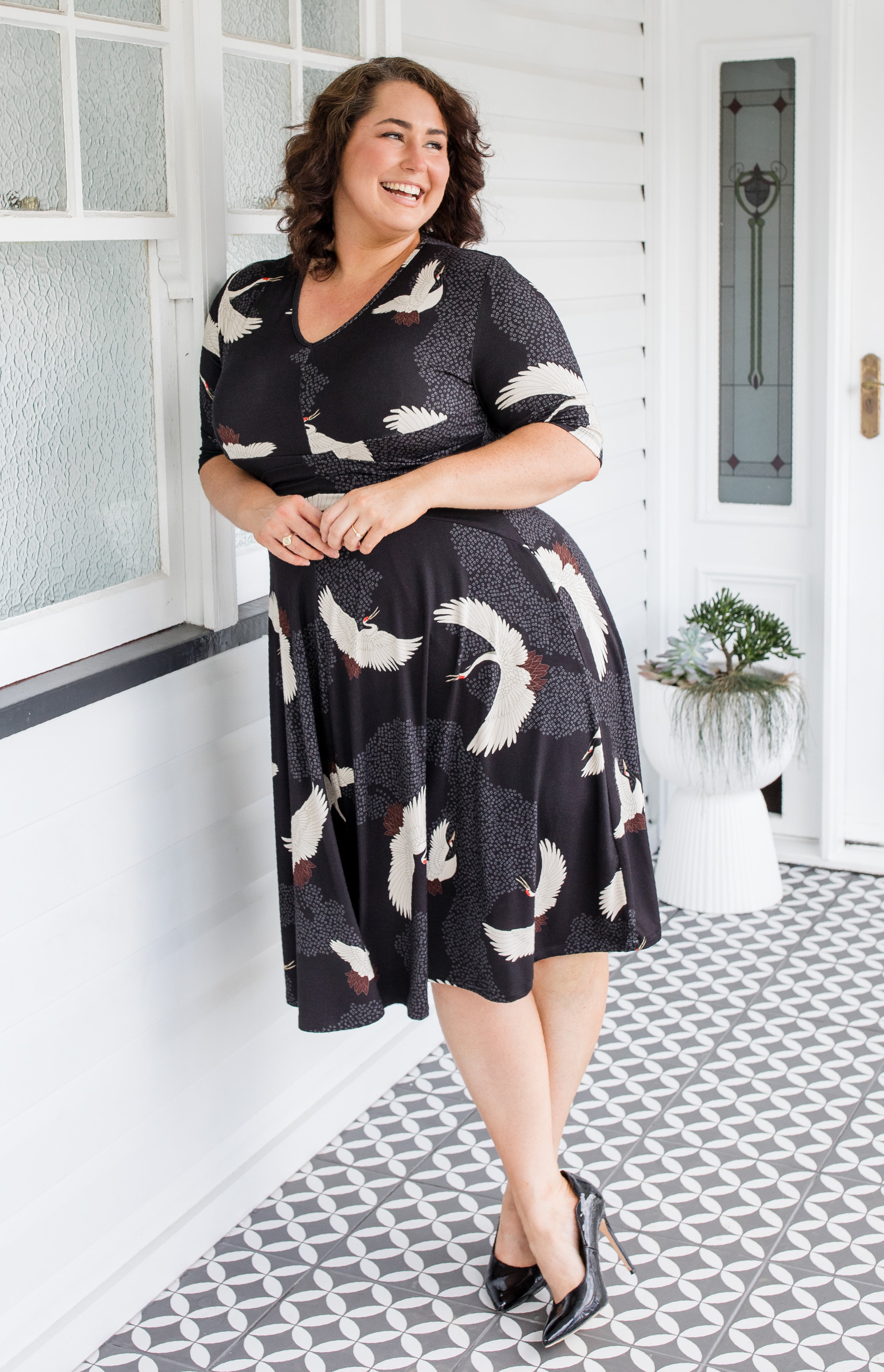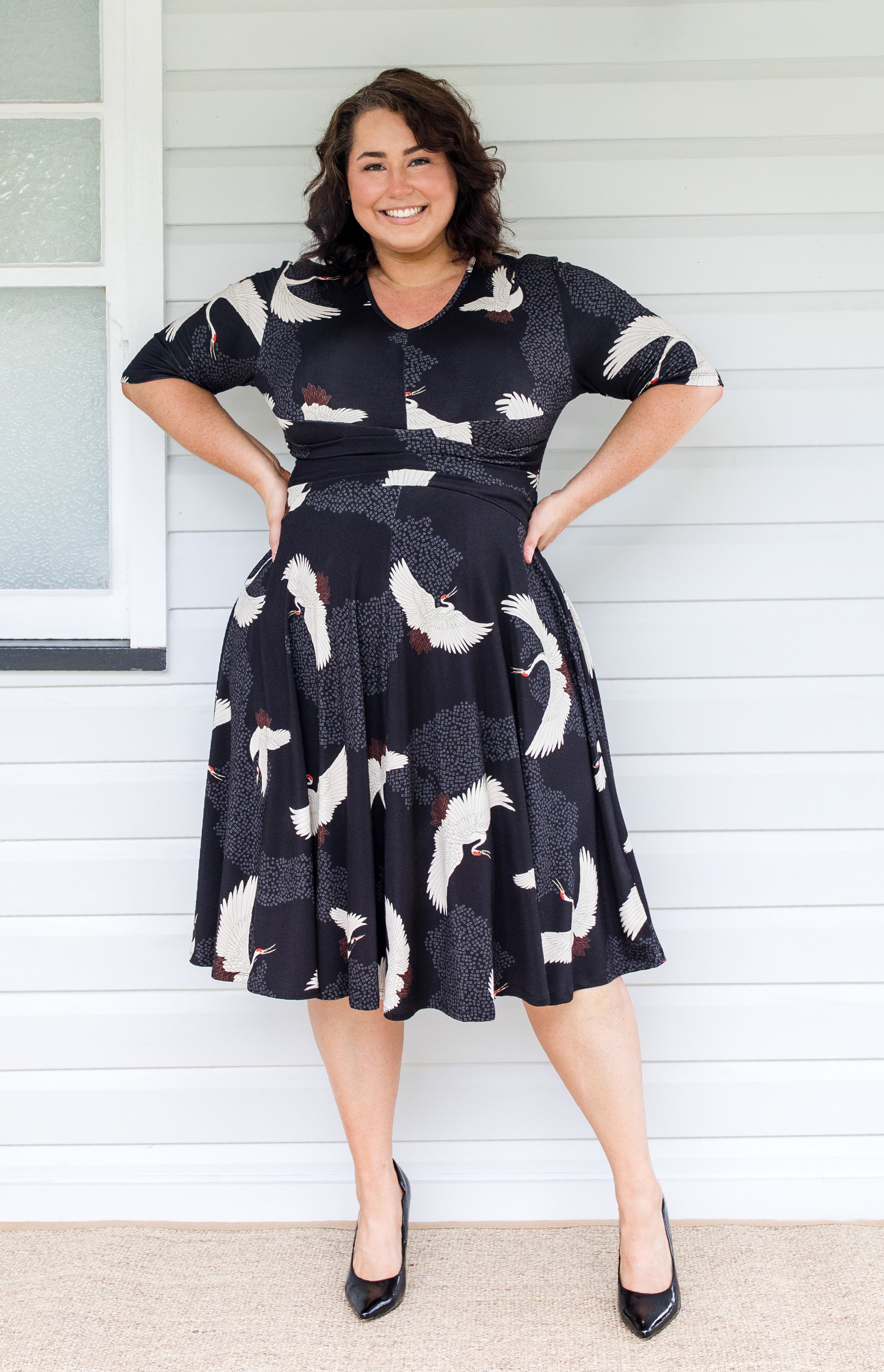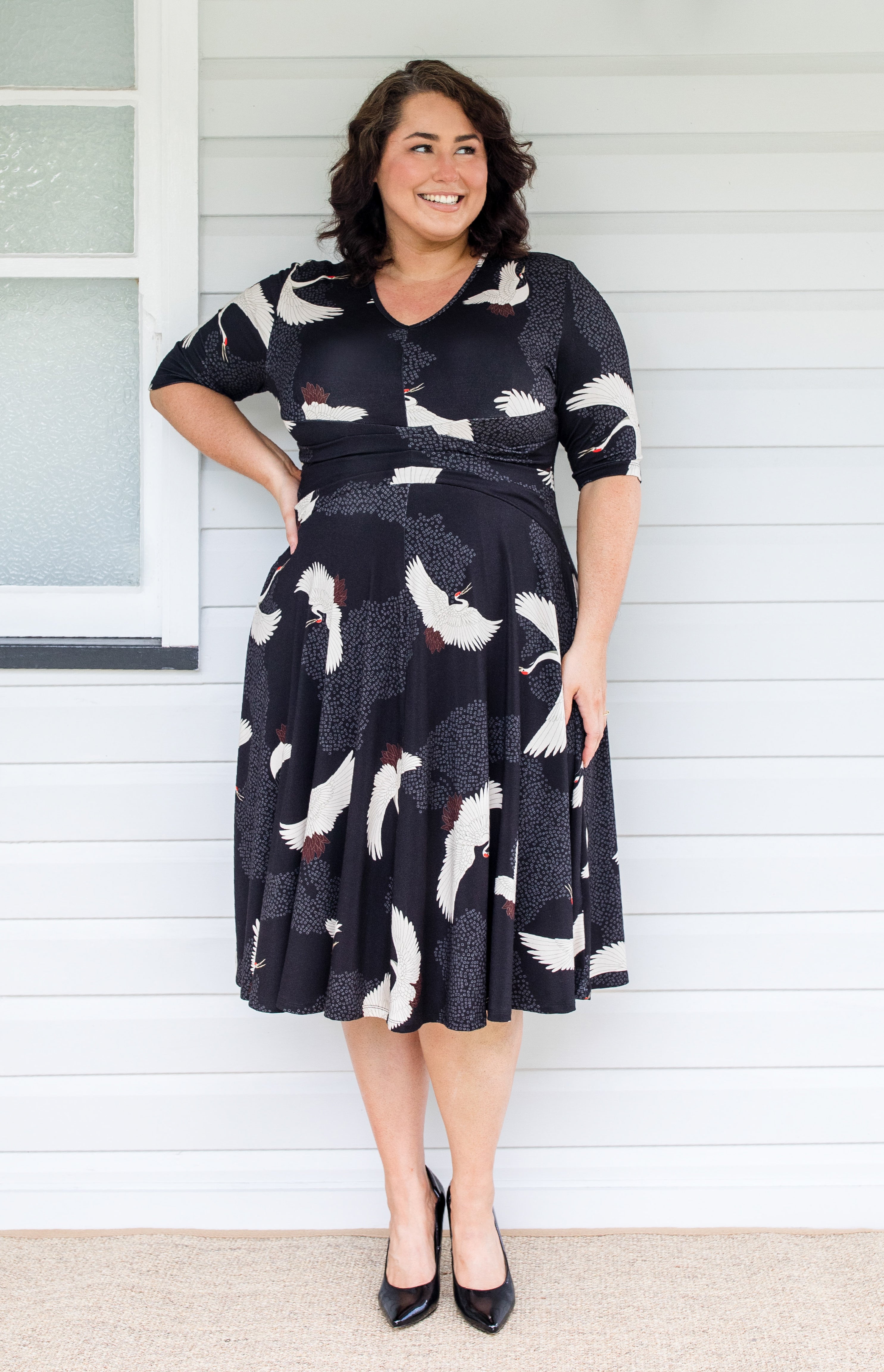 This is the dress that suits everyone... with her tucks across the front and curved panels that cinch you in at the waist & give you an enviable hourglass shape, and a full twirly skirt that skims over your tummy and hips.