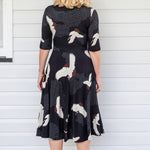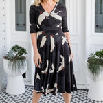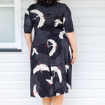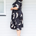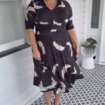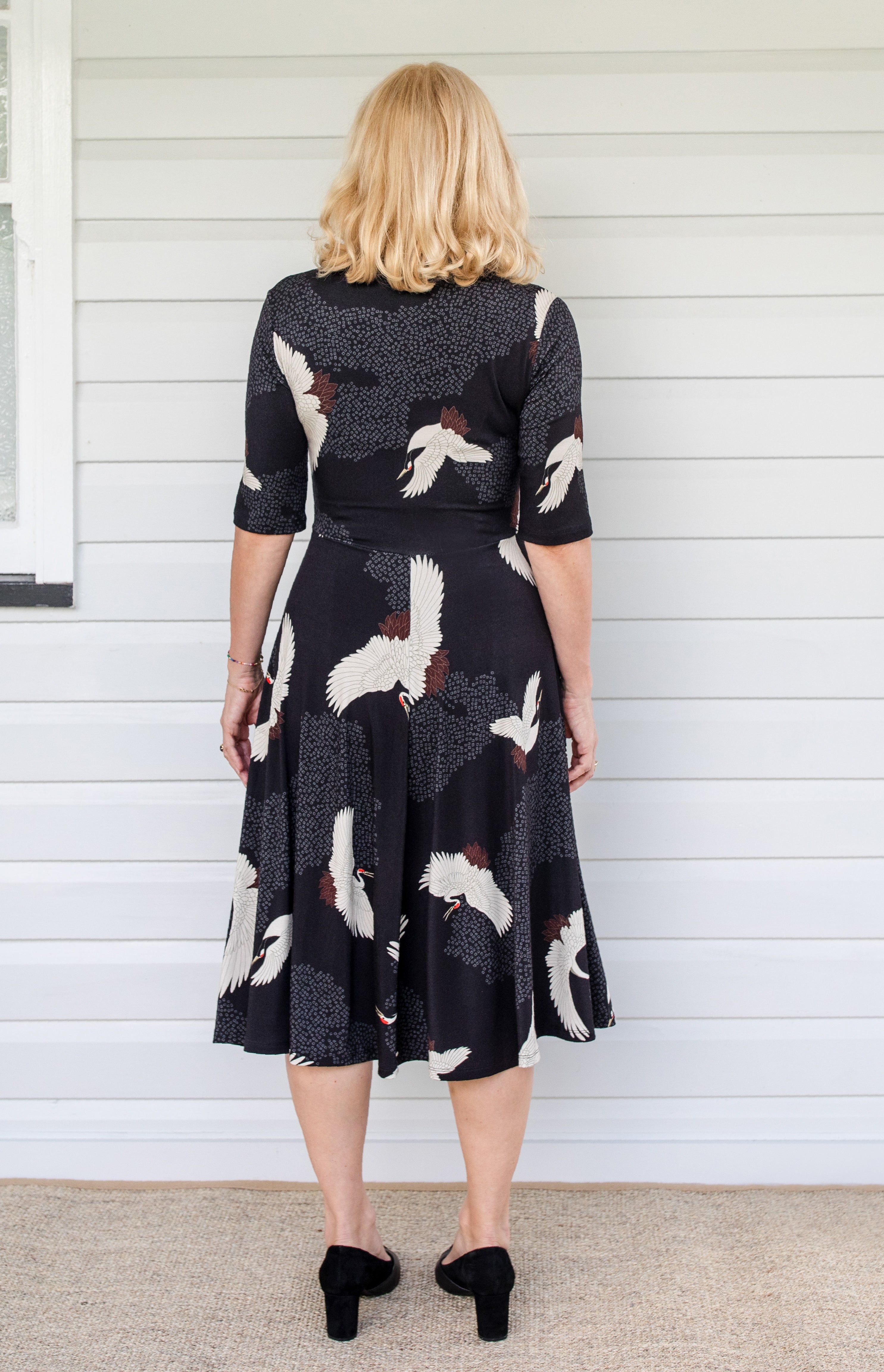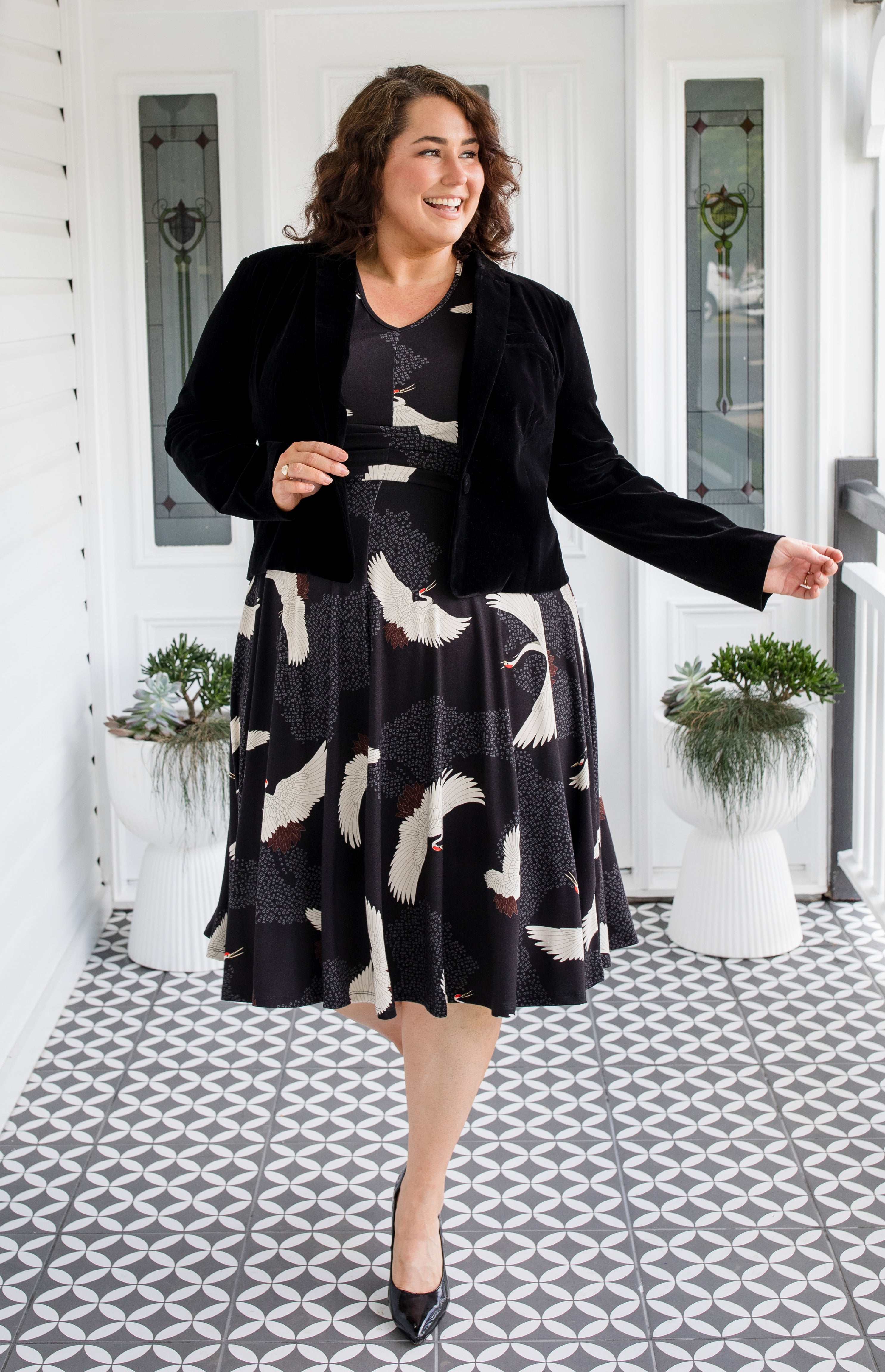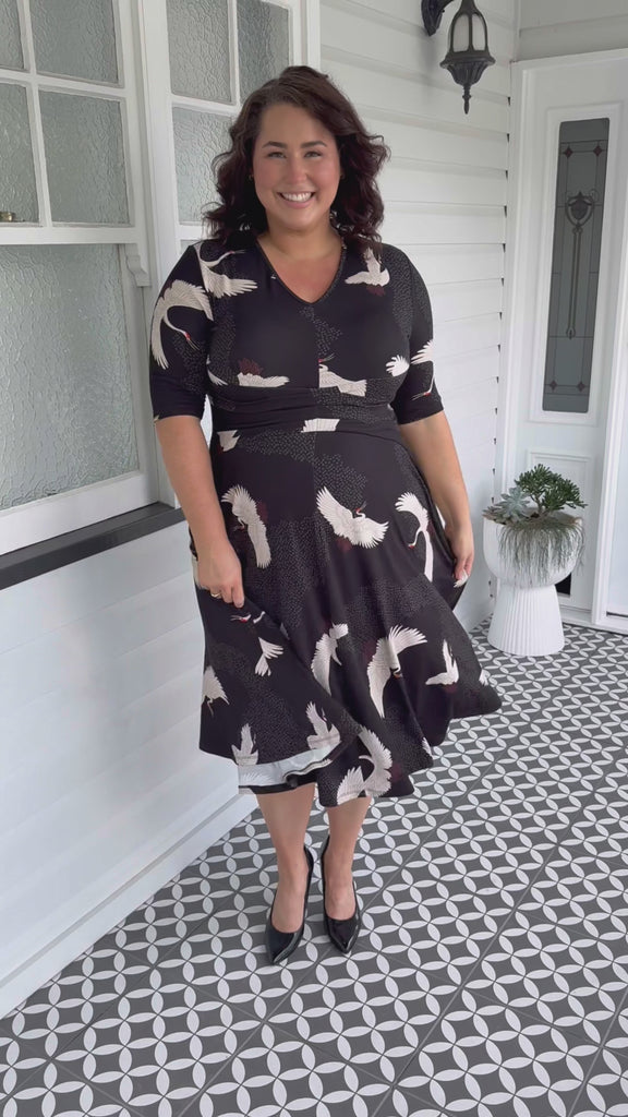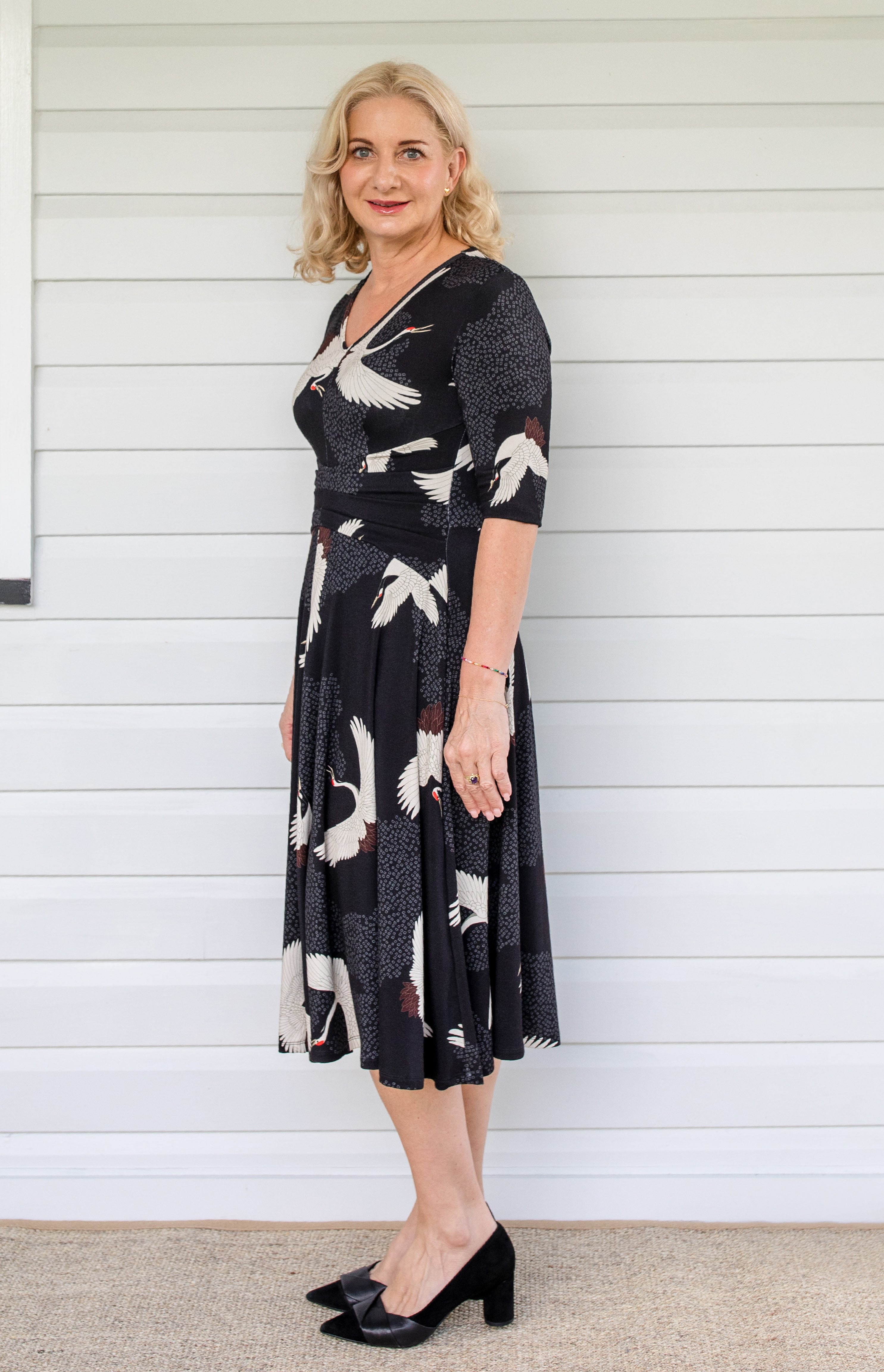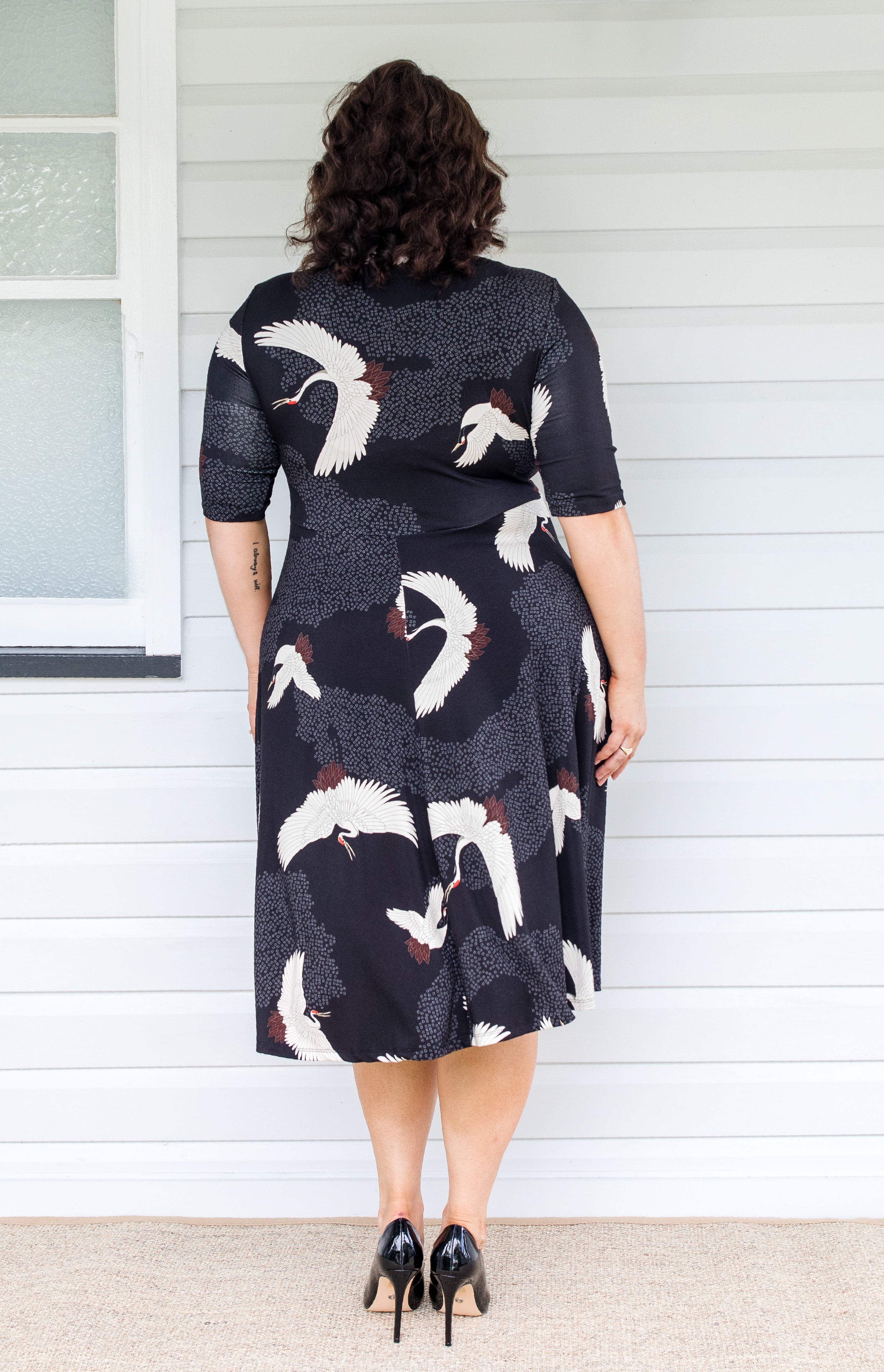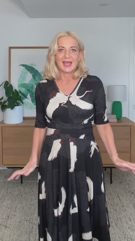 This is the dress that suits everyone... with her tucks across the front and curved panels that cinch you in at the waist & give you an enviable hourglass shape, and a full twirly skirt that skims over your tummy and hips.