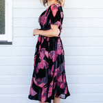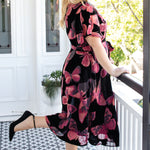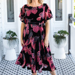 This stunning dress has been fashioned in a beautiful velvet butterfly burnout fabric, and lined in a gorgeous weighty satin fabric.