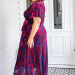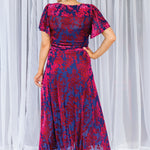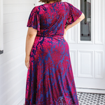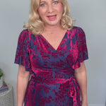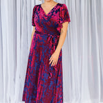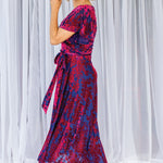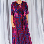 You'll certainly make an entrance in the Violet Dress. A true wrap style dress, with a separate slip dress in a semi sheer opulent velvet burnout fabric. This is the perfect frock to turn heads at your next fancy event.