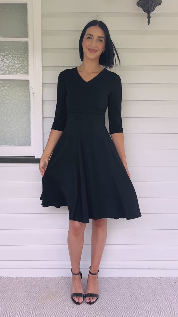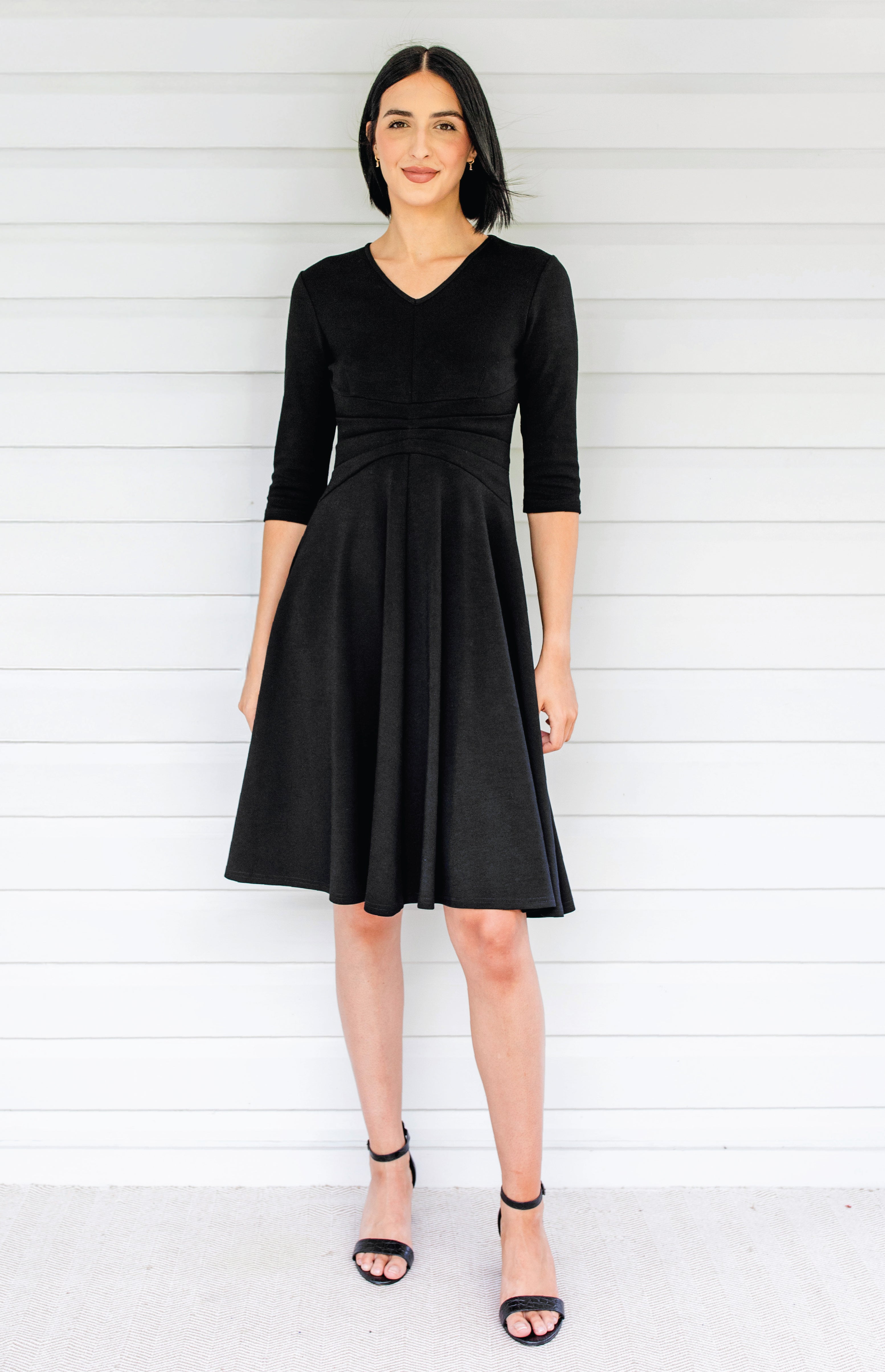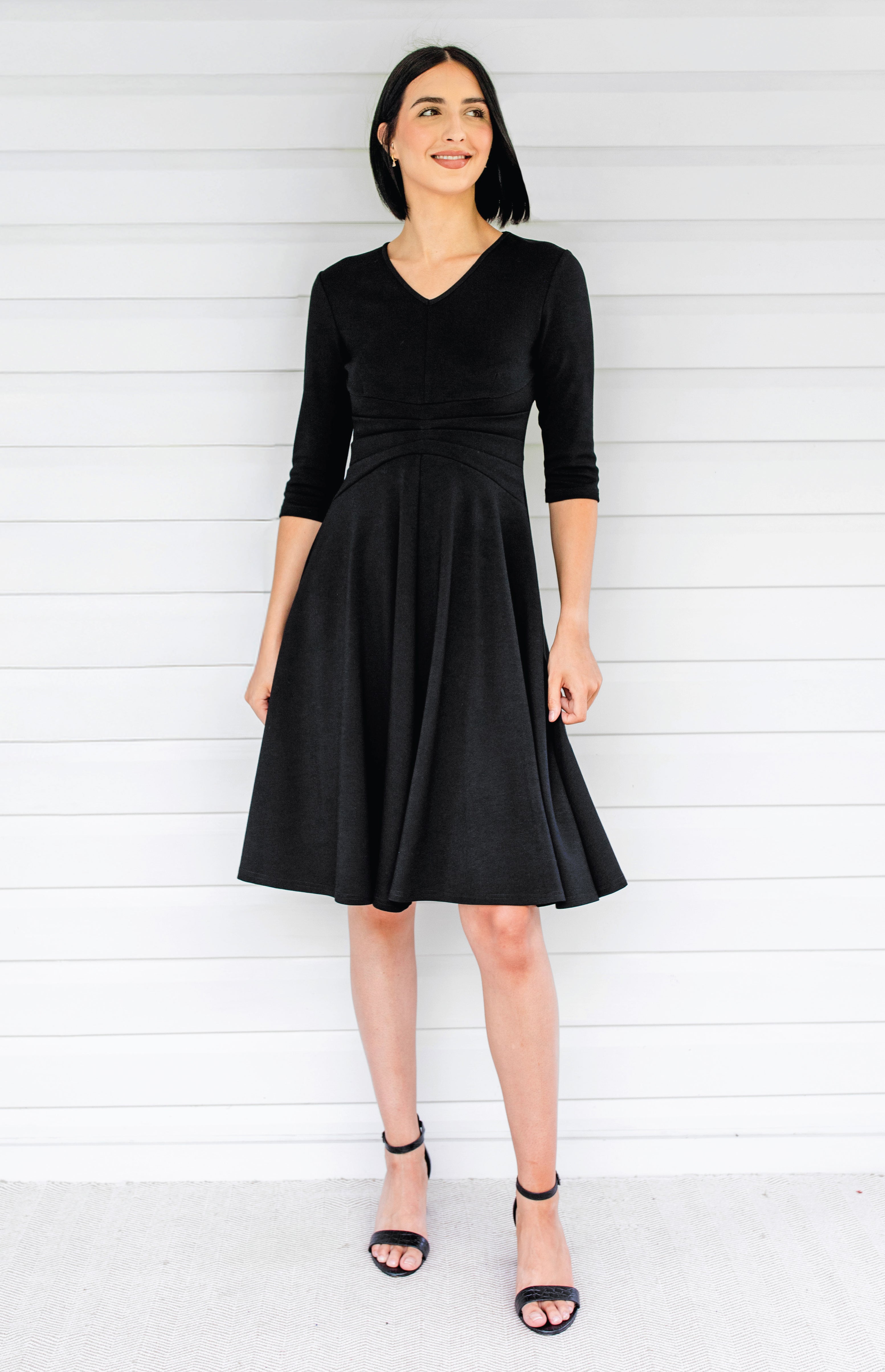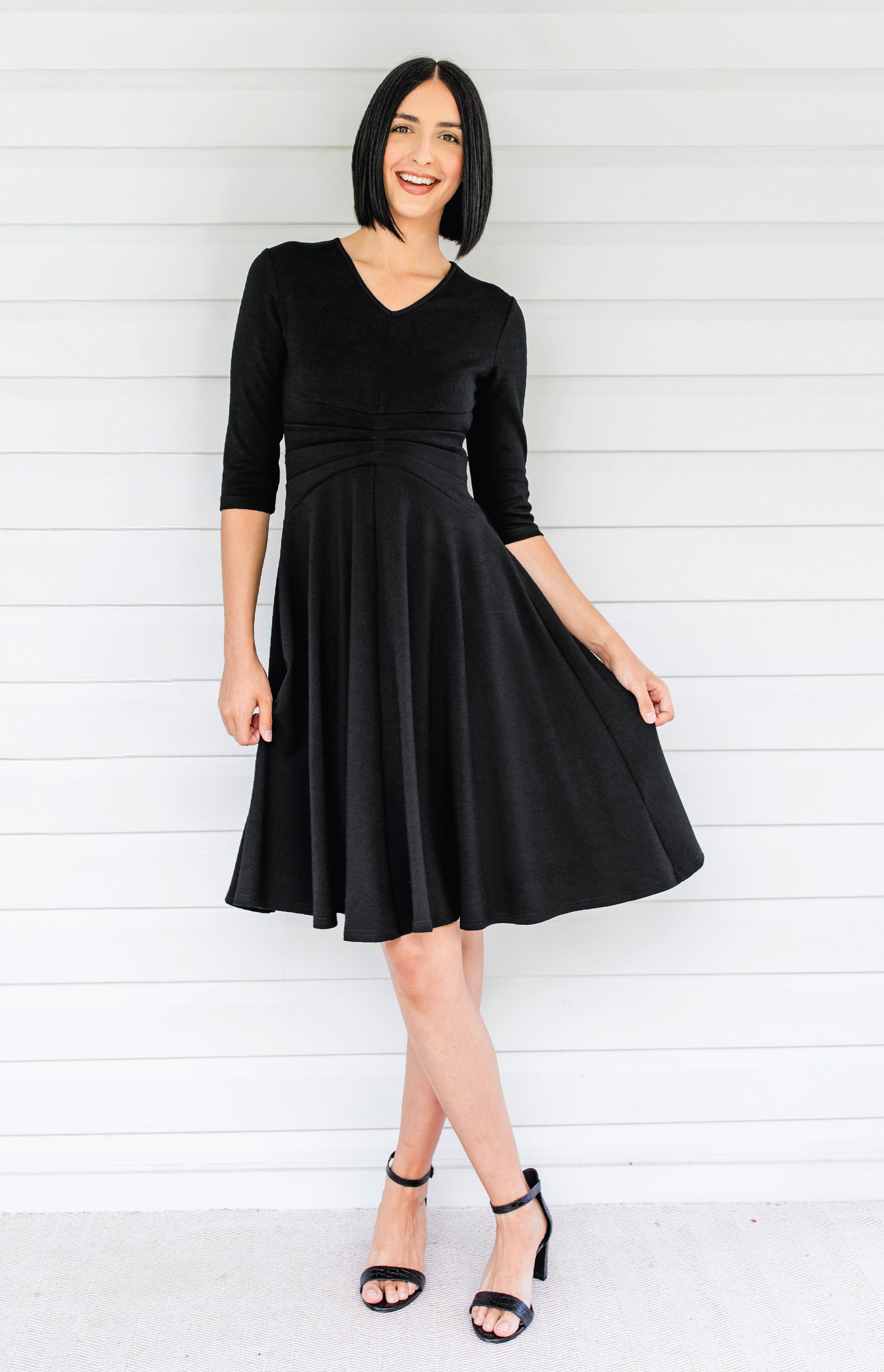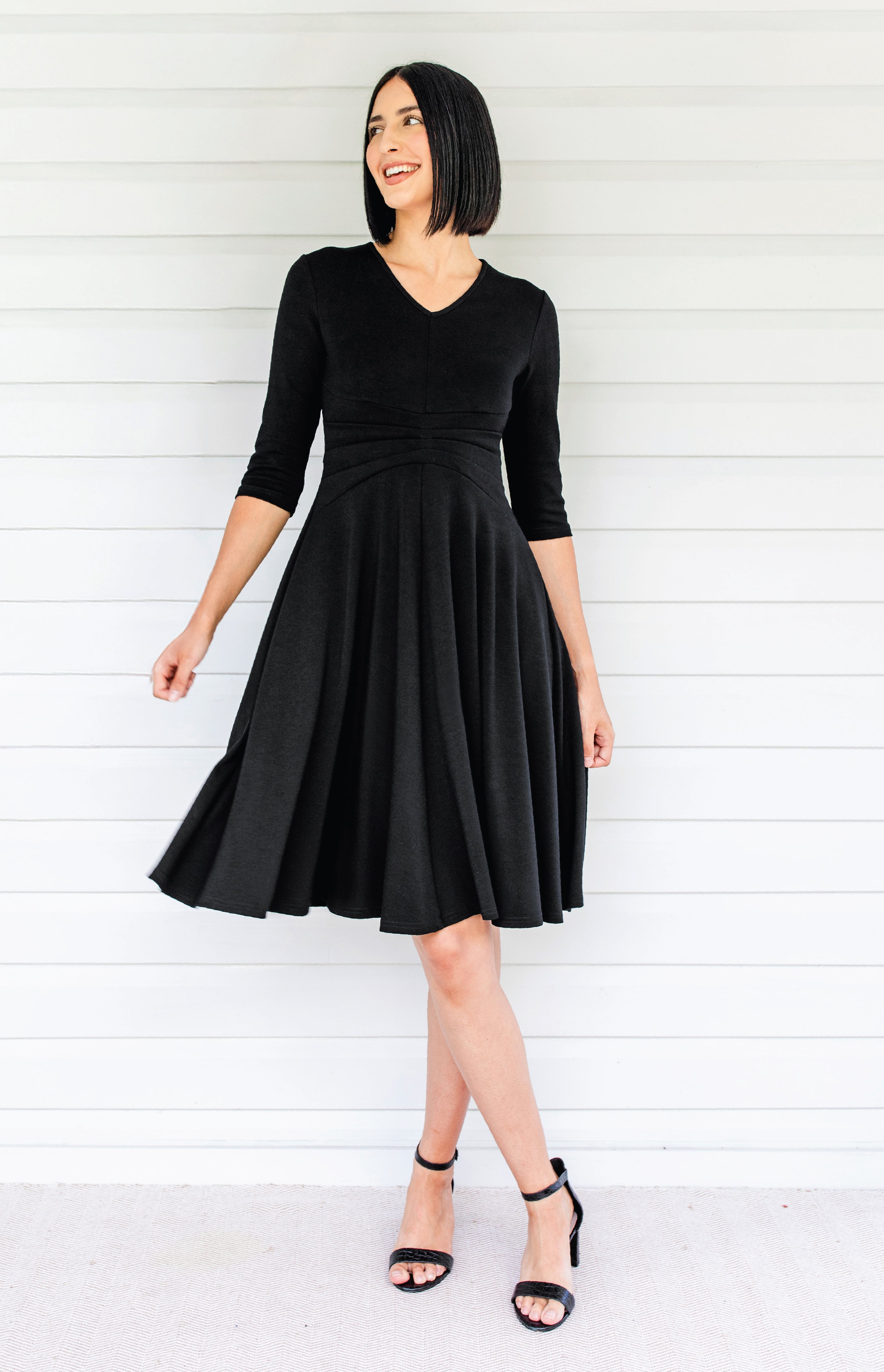 This is the dress that suits everyone... with her tucks across the front and curved panels that cinch you in at the waist & give you an enviable hourglass shape, and a full twirly skirt that skims over your tummy and hips.