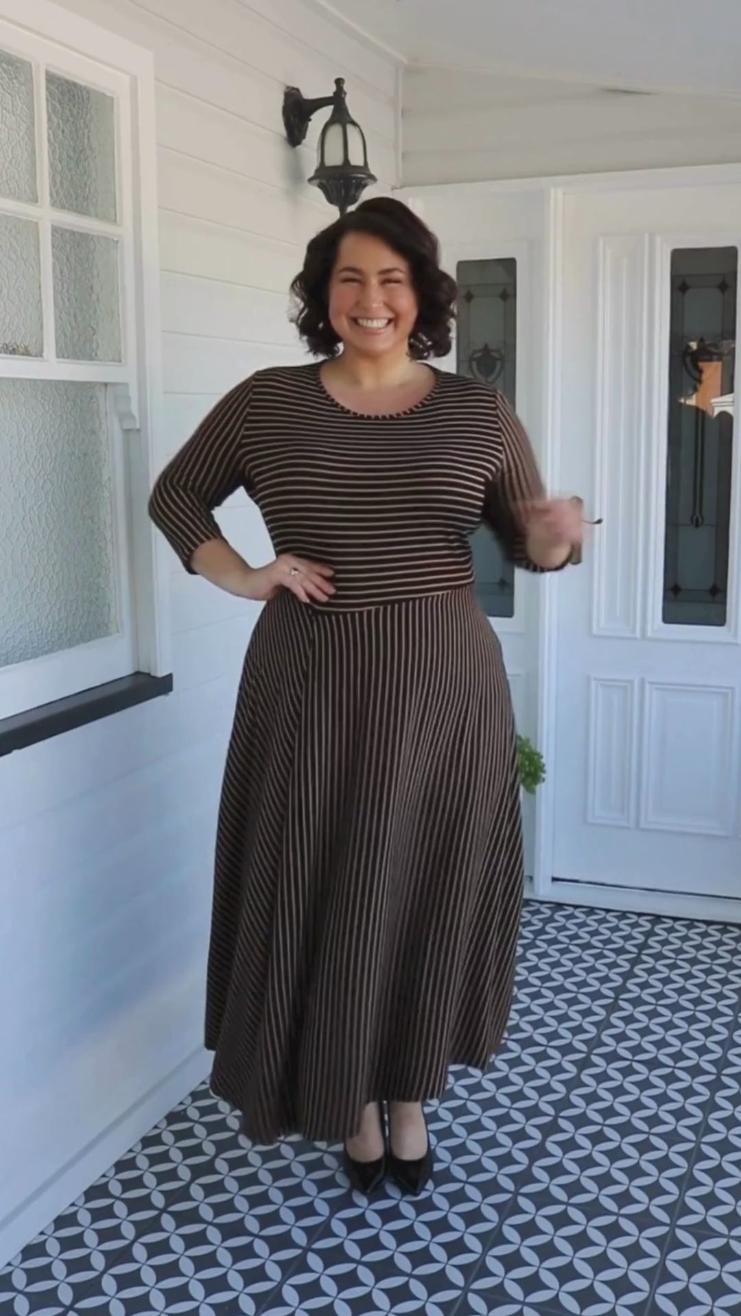 In classic stripes, see how we have cut the stripes in different directions so that they draw the eye down, elongating the figure. The fullness of the tuck in the skirt will skim over your tummy and bottom area.