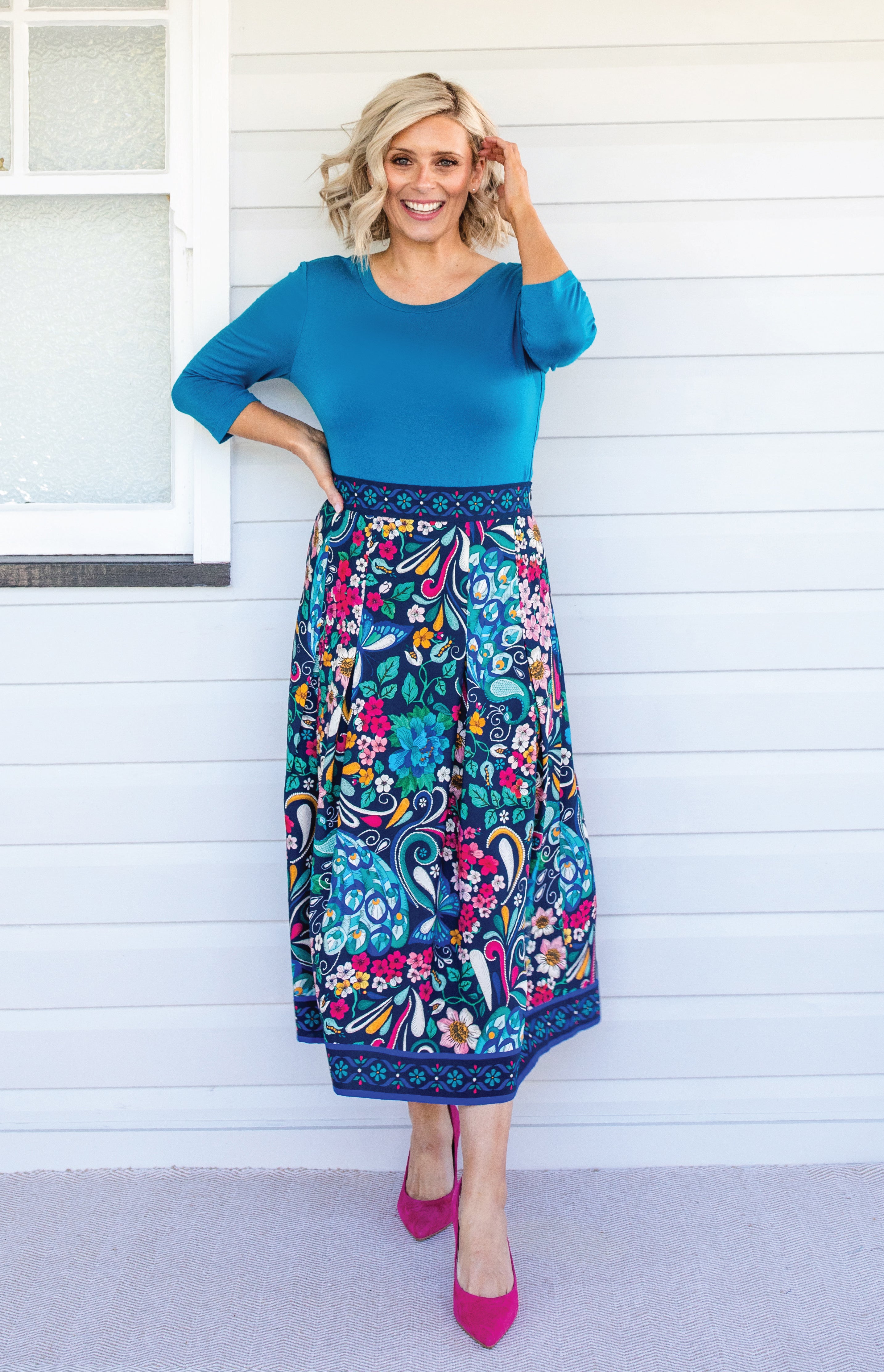 Our Designer Deanne (blonde) is wearing size 8. Her bust is 97cm; Waist 80cm; Hip: 103cm.