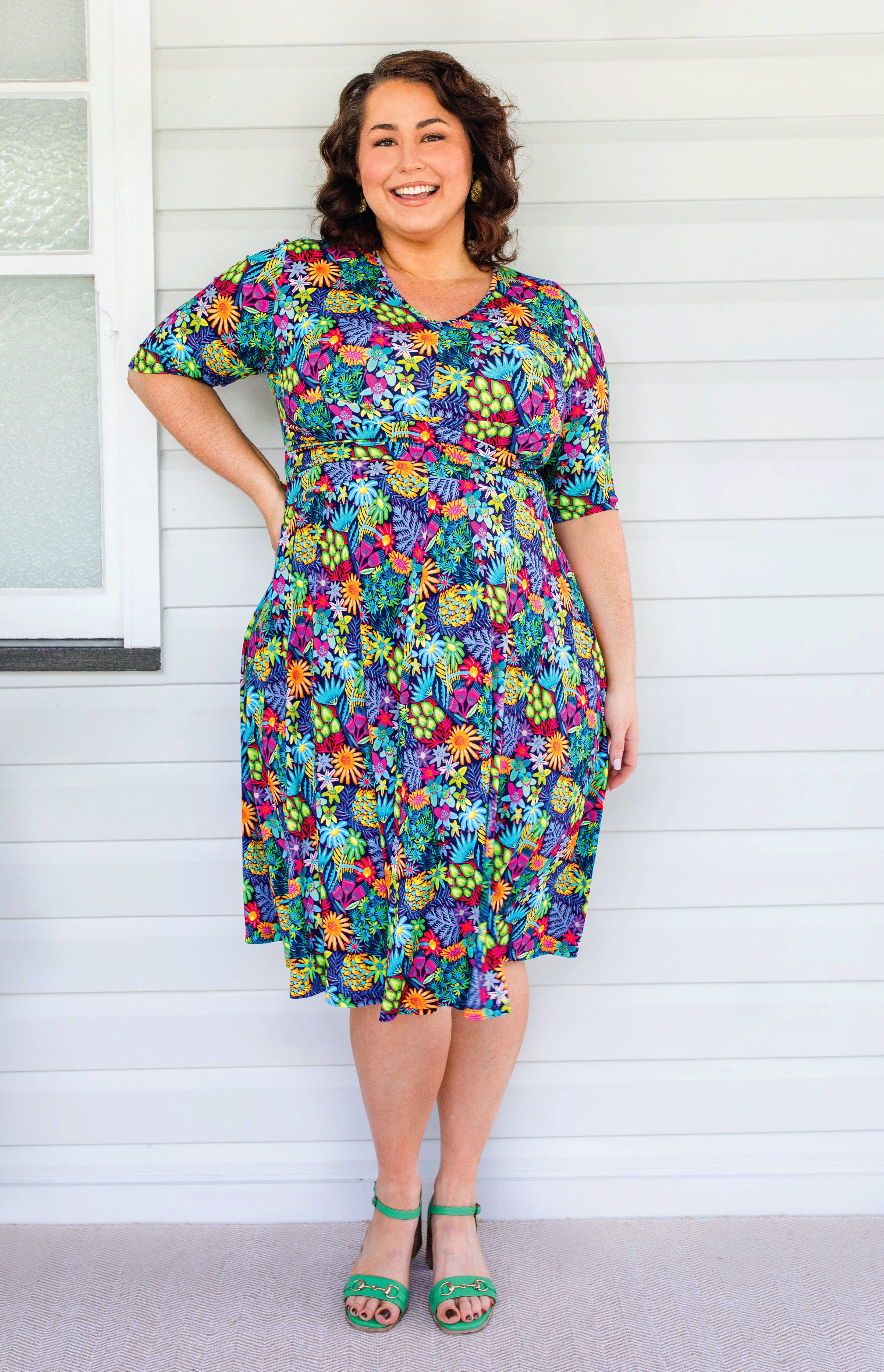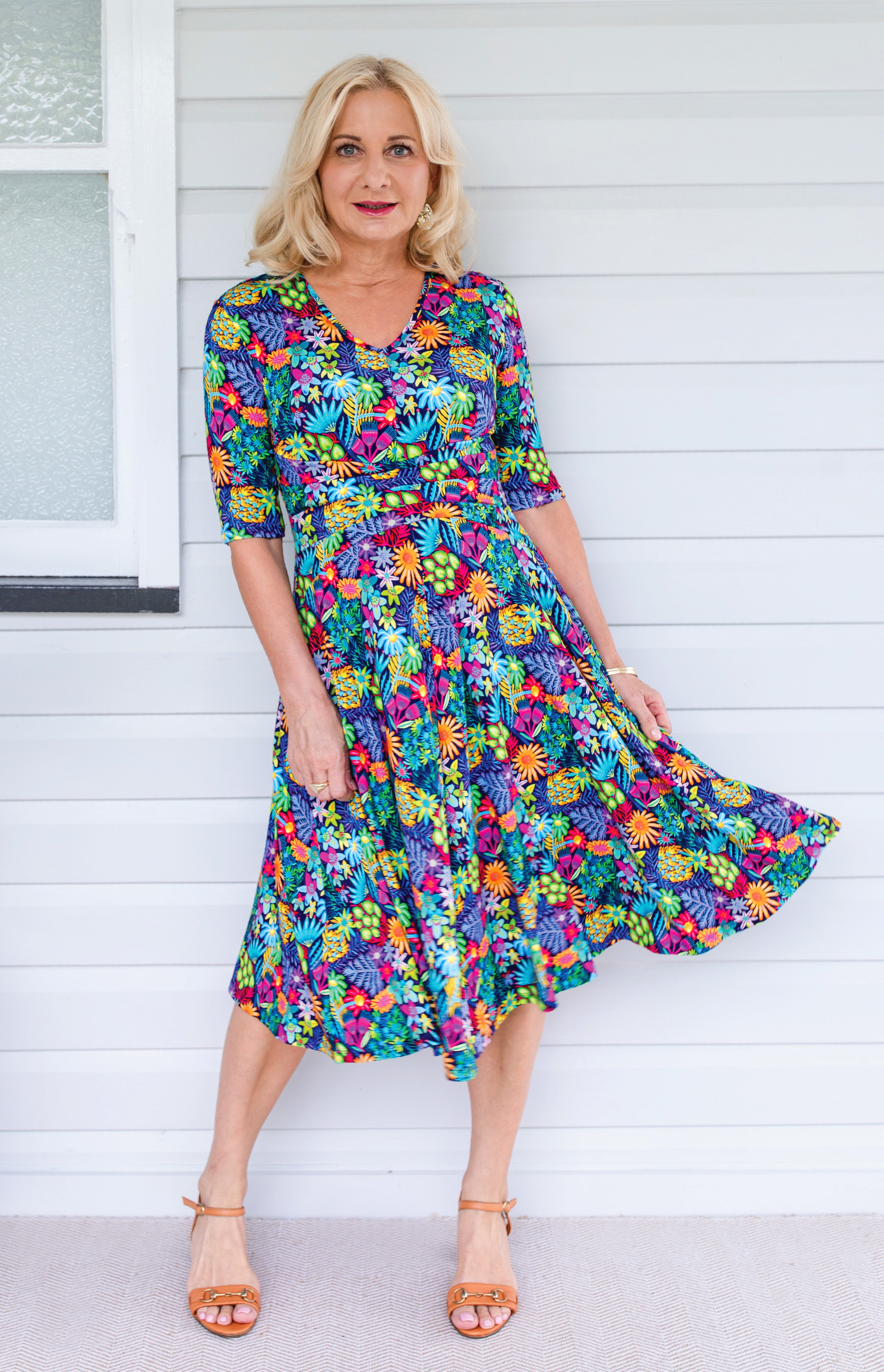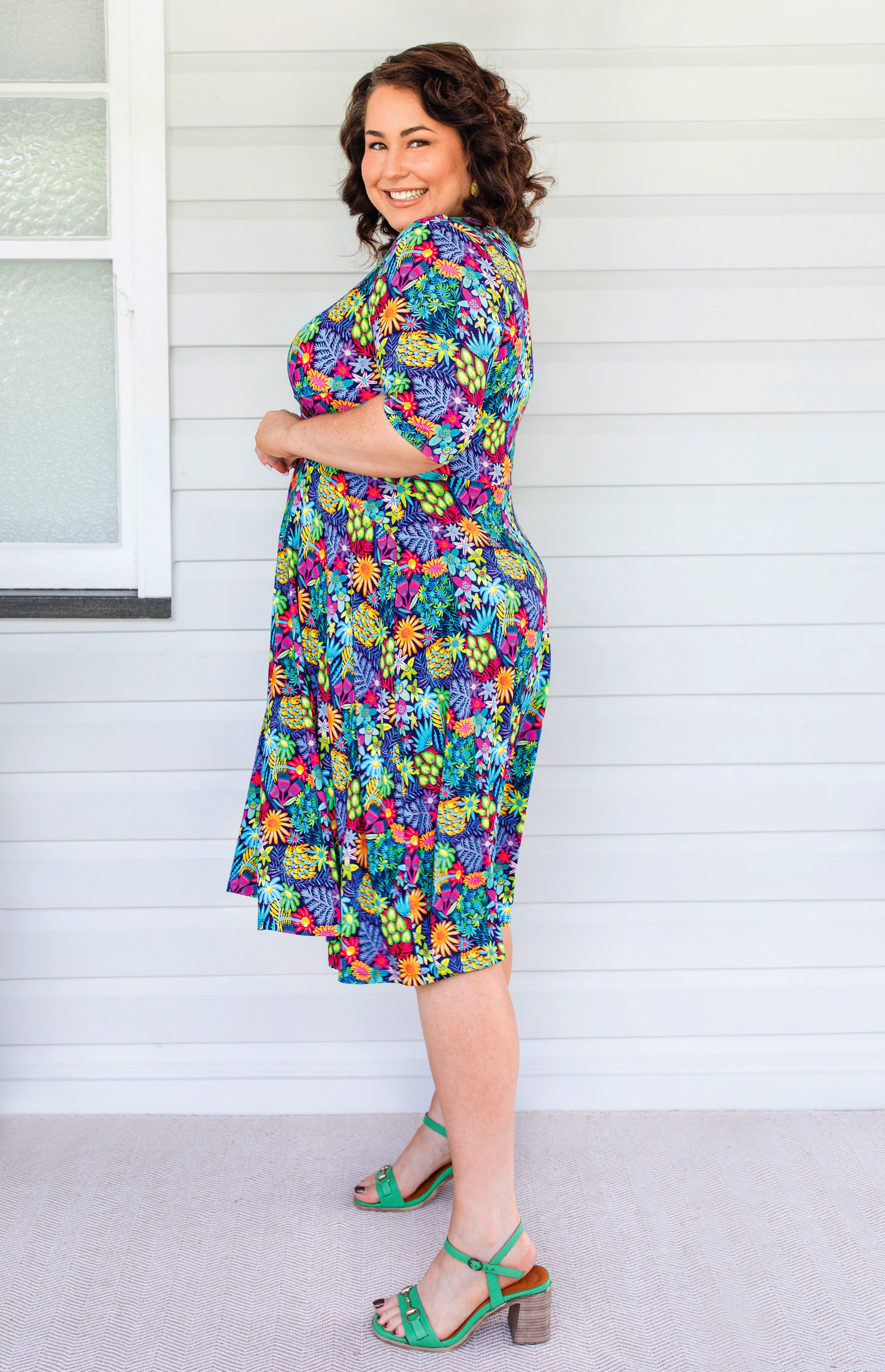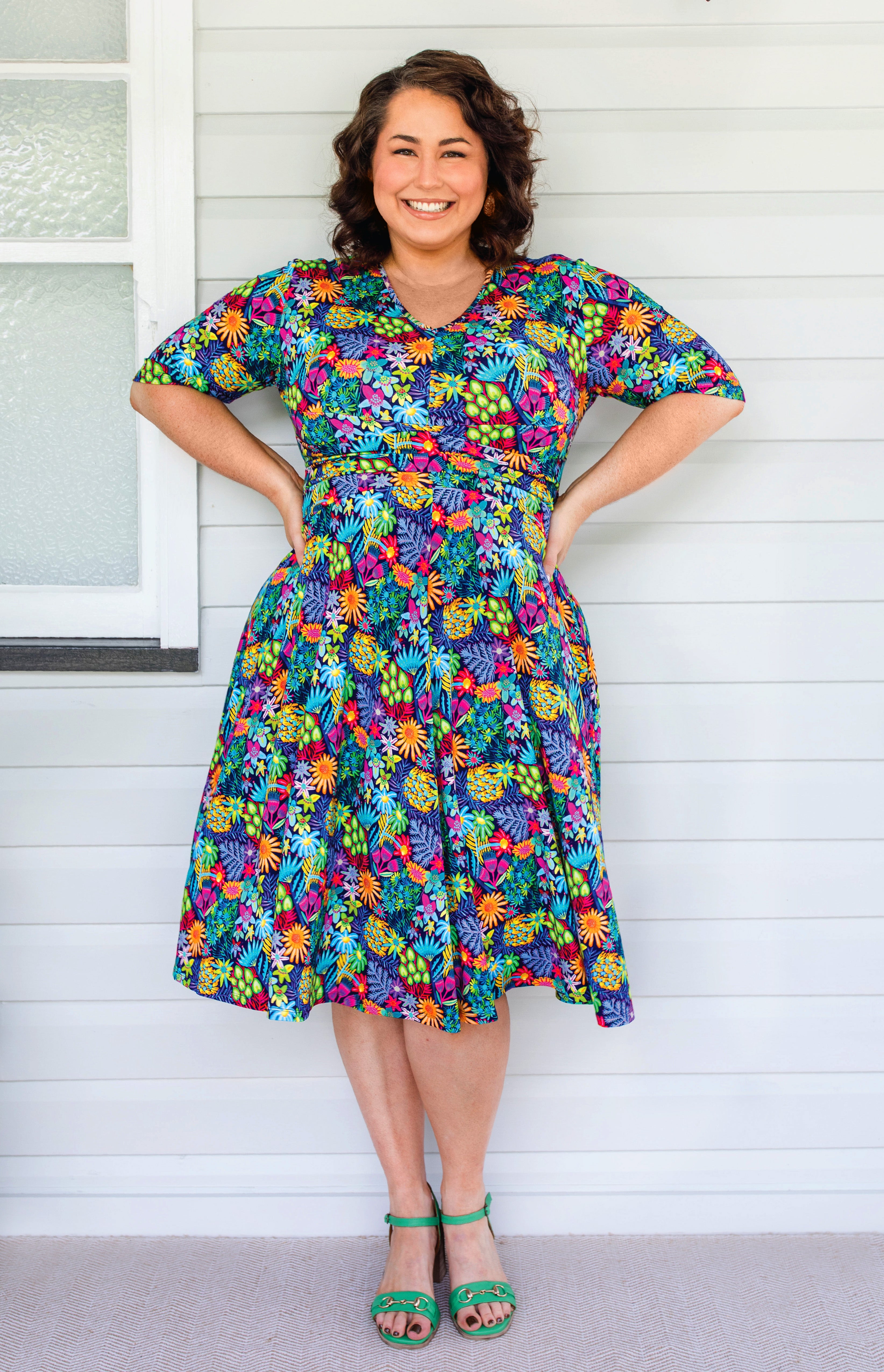 This is the dress that suits everyone... with her tucks across the front and curved panels that cinch you in at the waist & give you an enviable hourglass shape, and a full twirly skirt that skims over your tummy and hips.