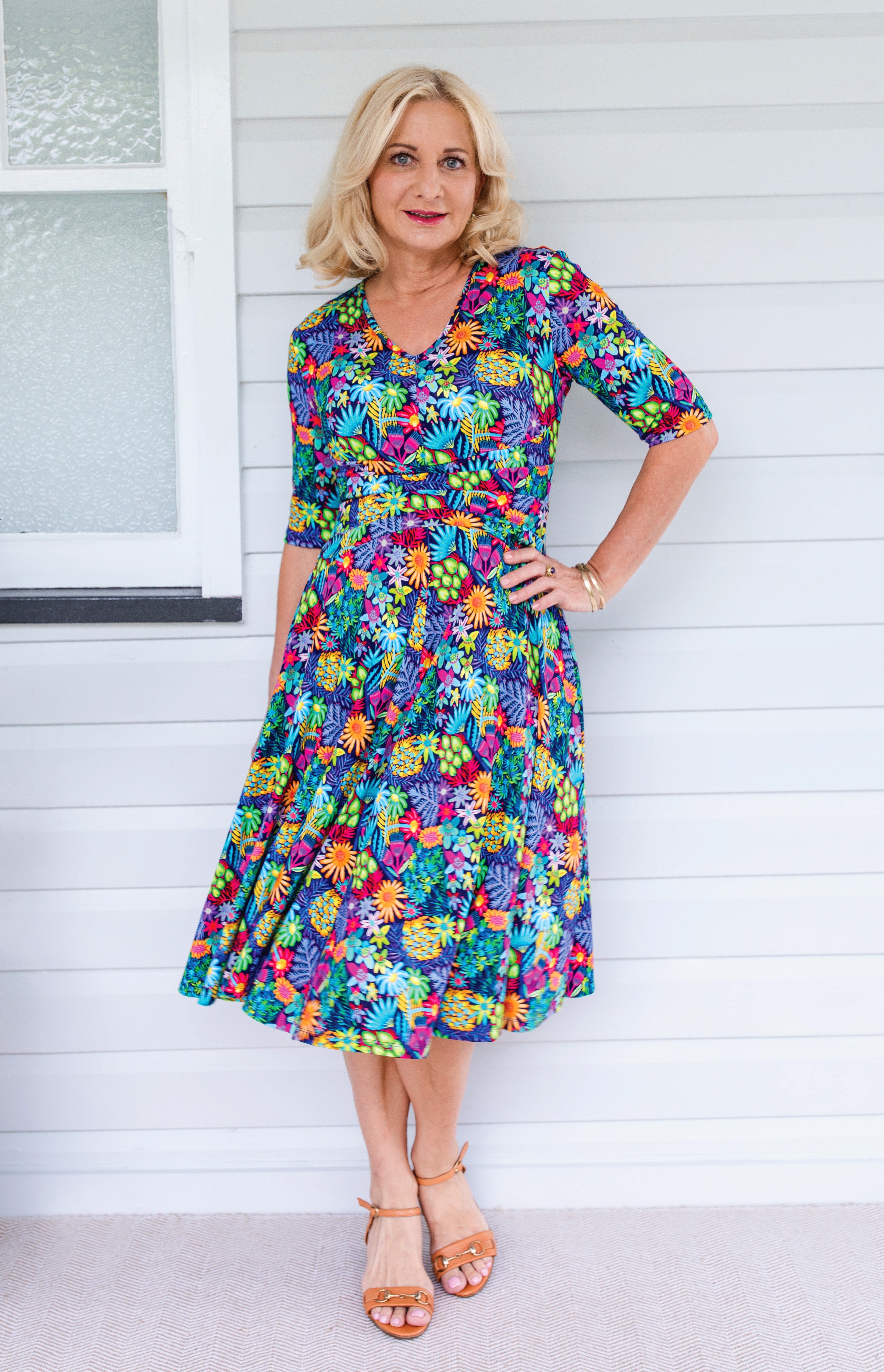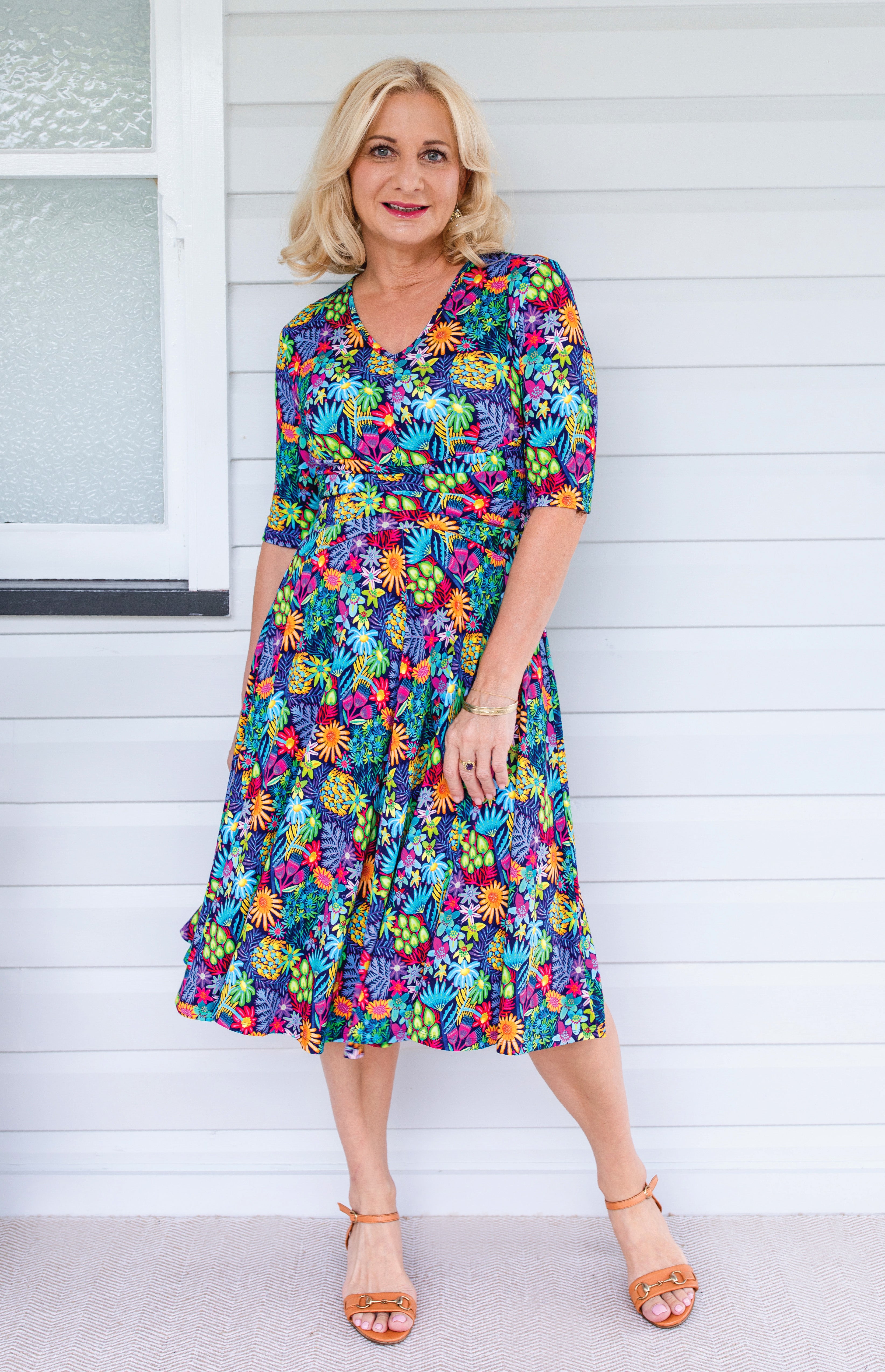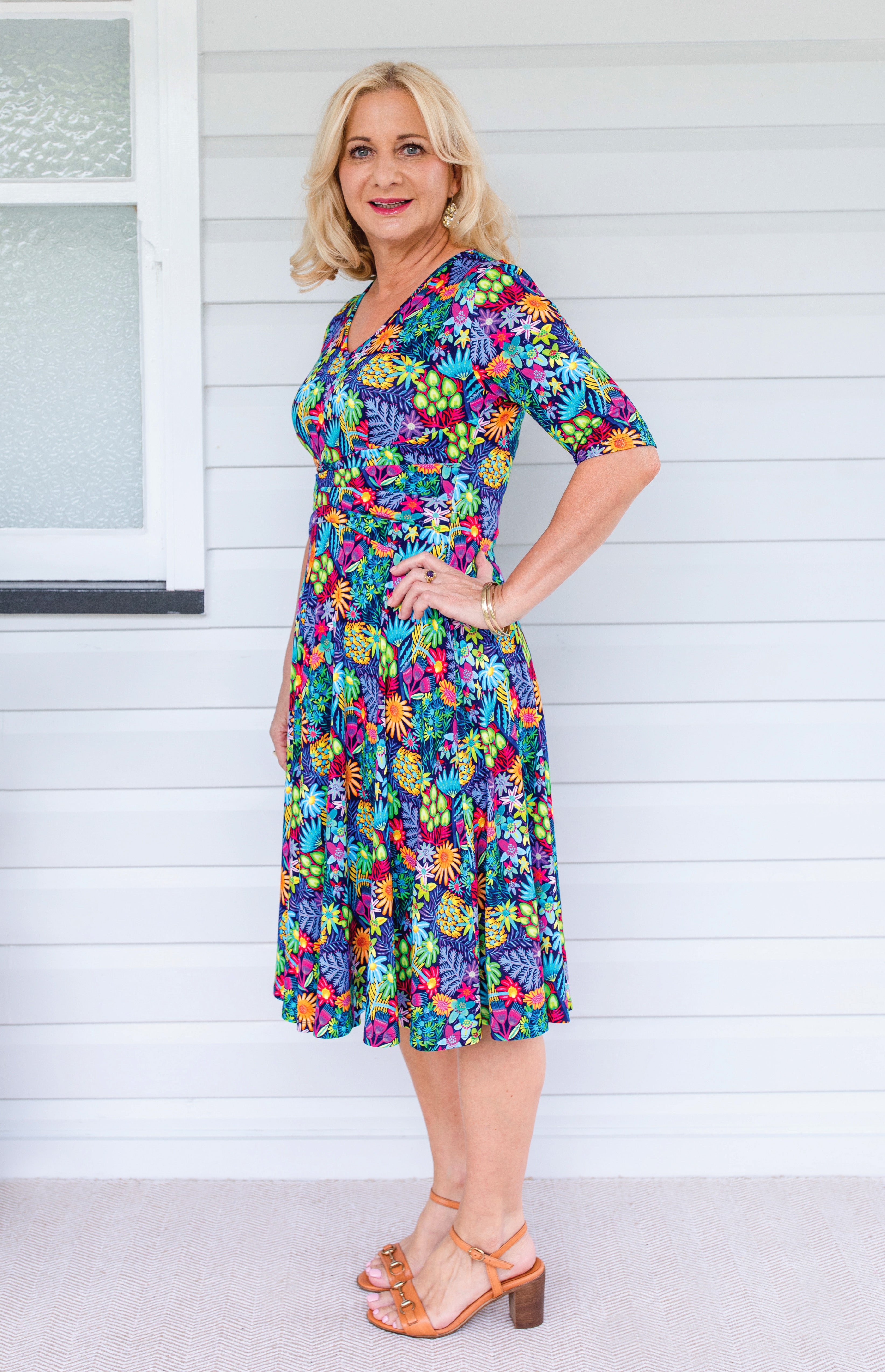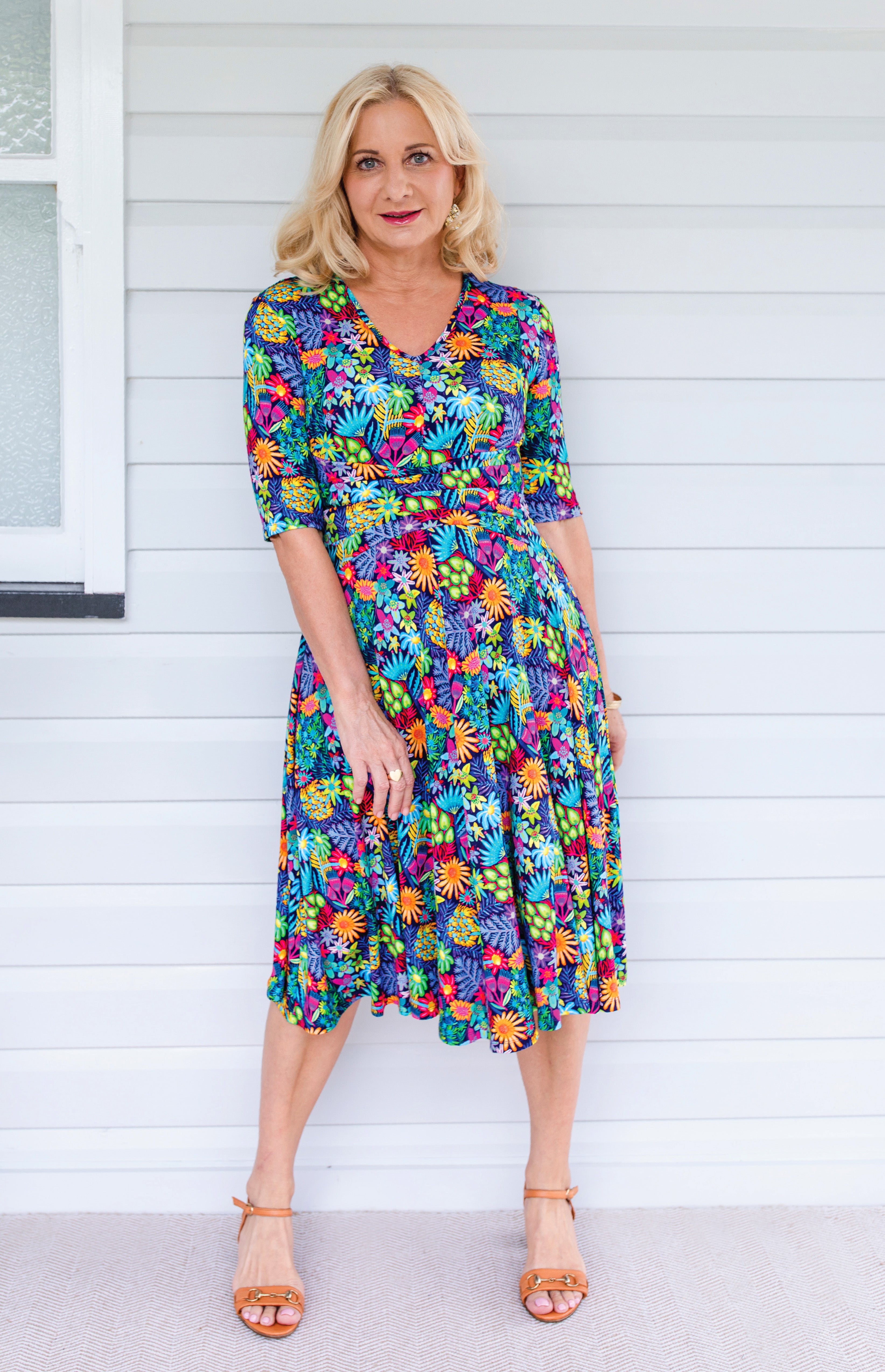 This is the dress that suits everyone... with her tucks across the front and curved panels that cinch you in at the waist & give you an enviable hourglass shape, and a full twirly skirt that skims over your tummy and hips.