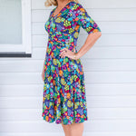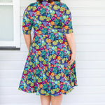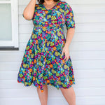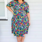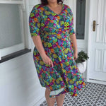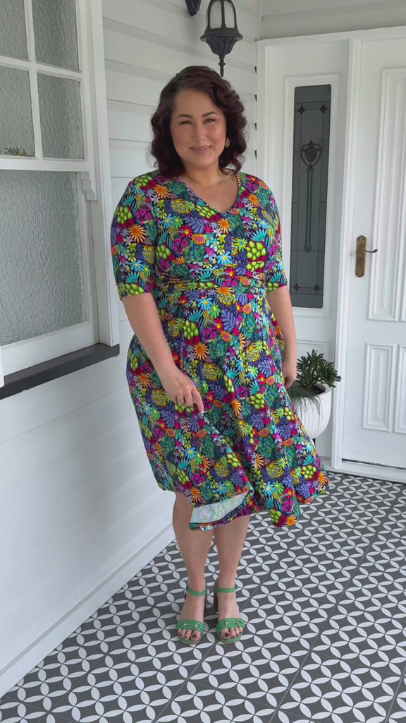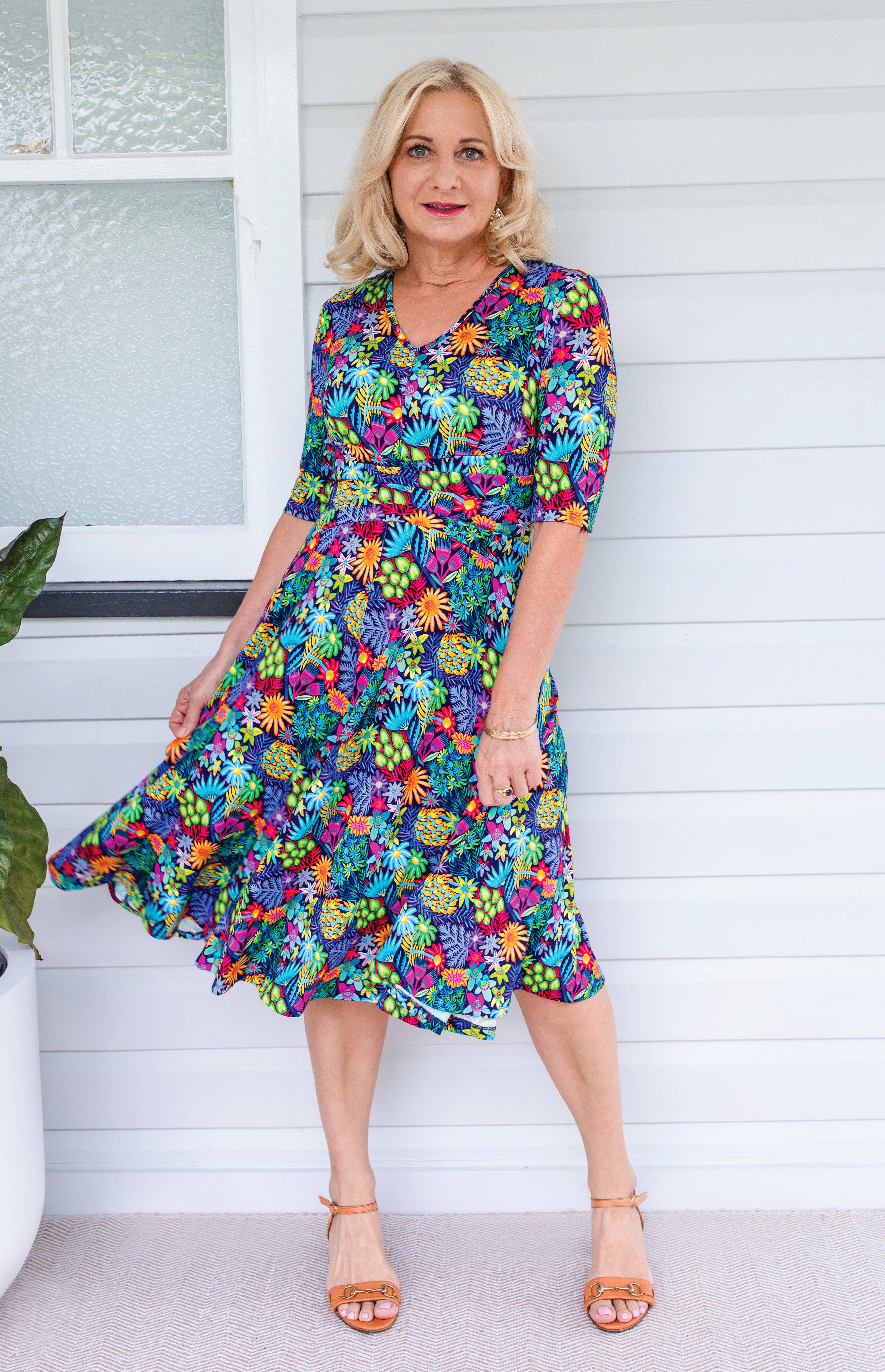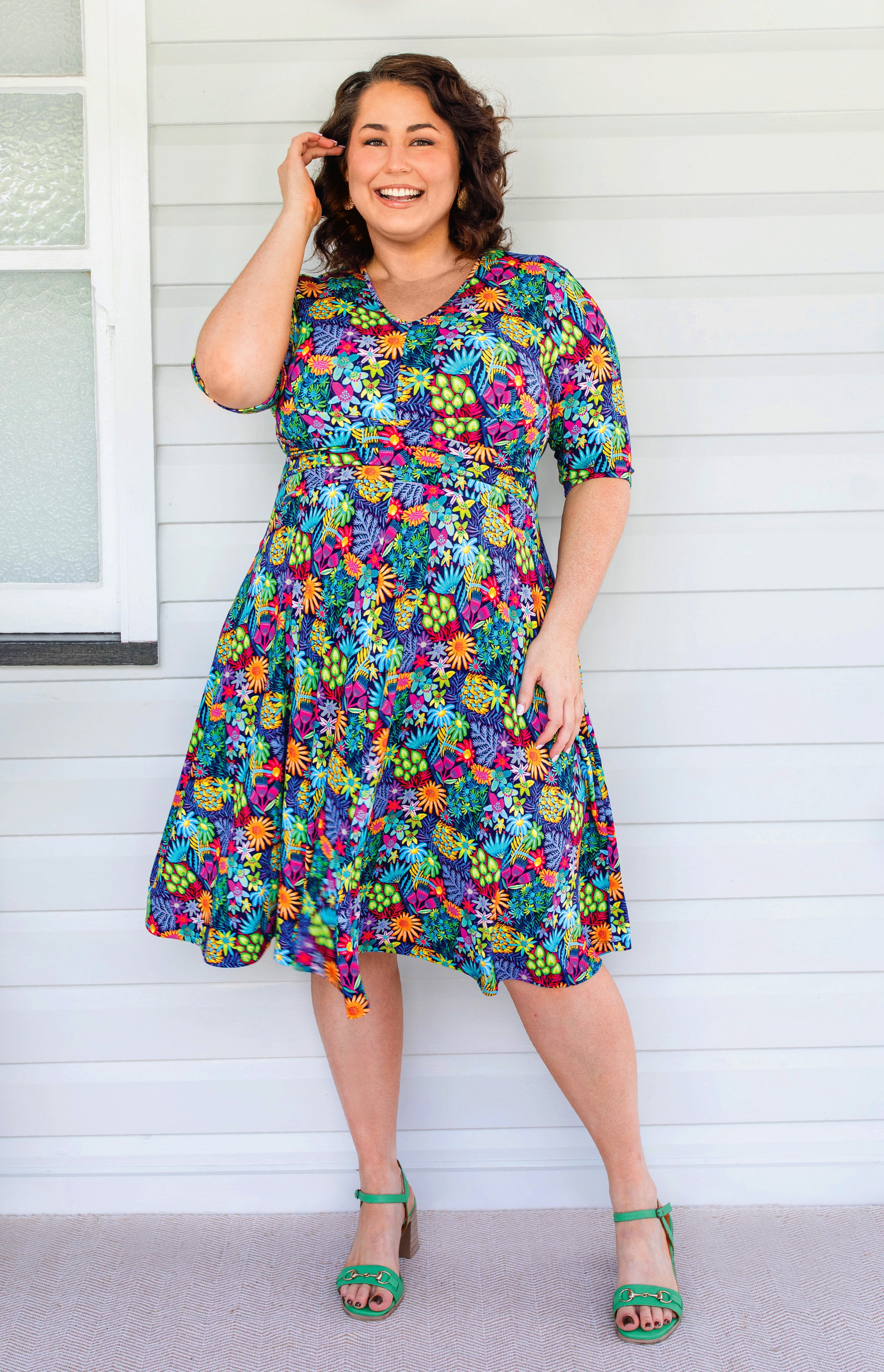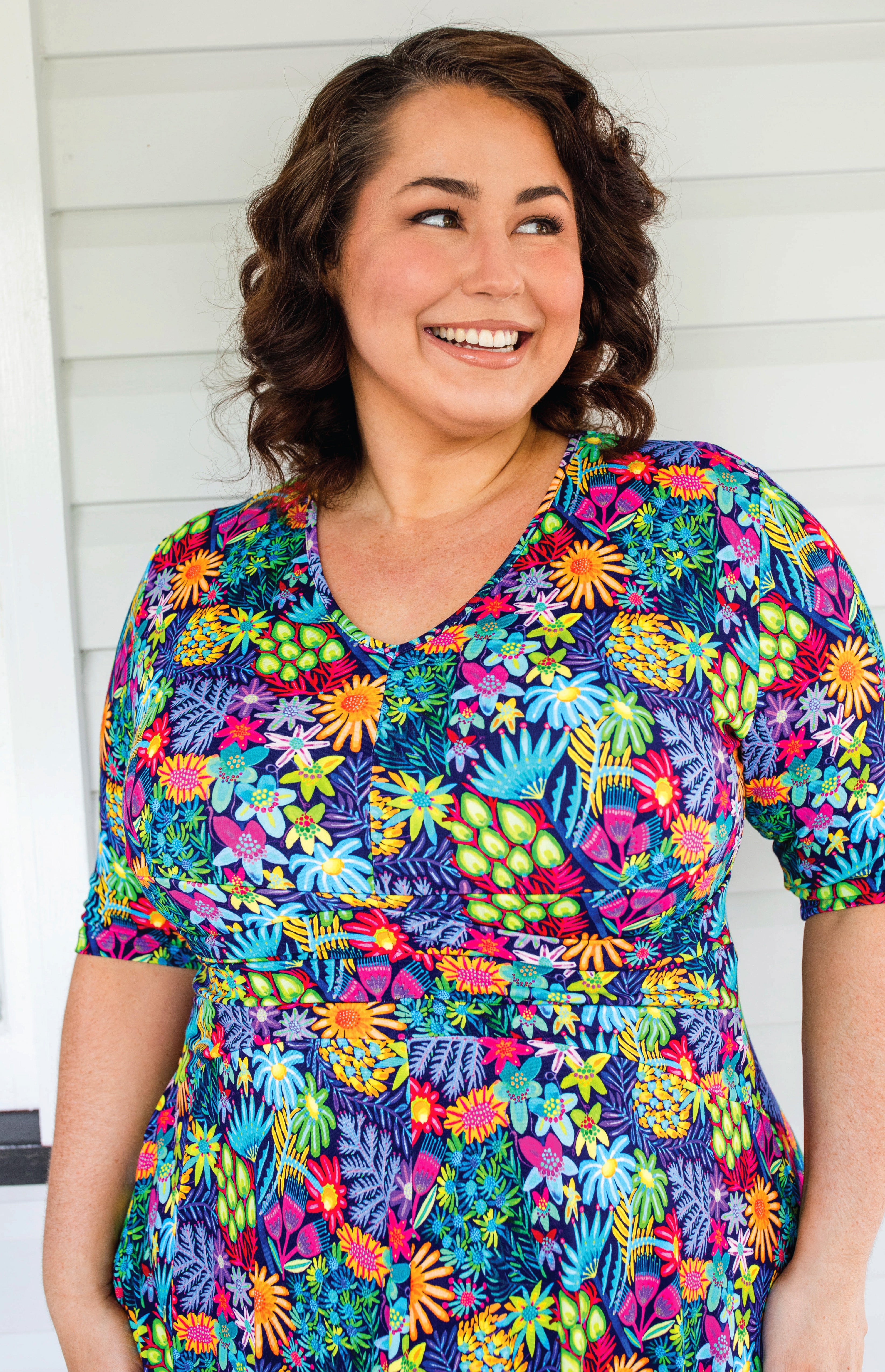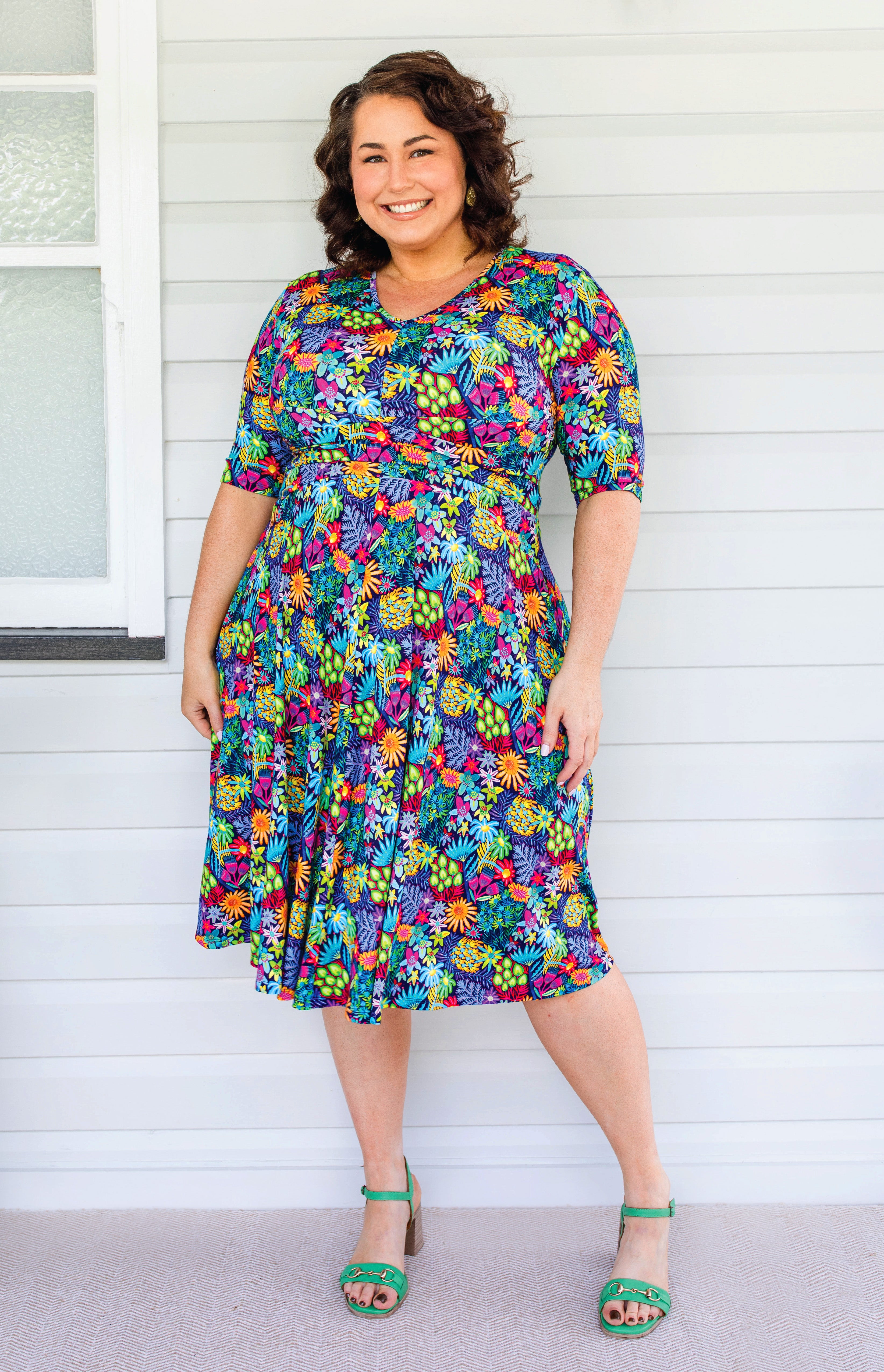 This is the dress that suits everyone... with her tucks across the front and curved panels that cinch you in at the waist & give you an enviable hourglass shape, and a full twirly skirt that skims over your tummy and hips.