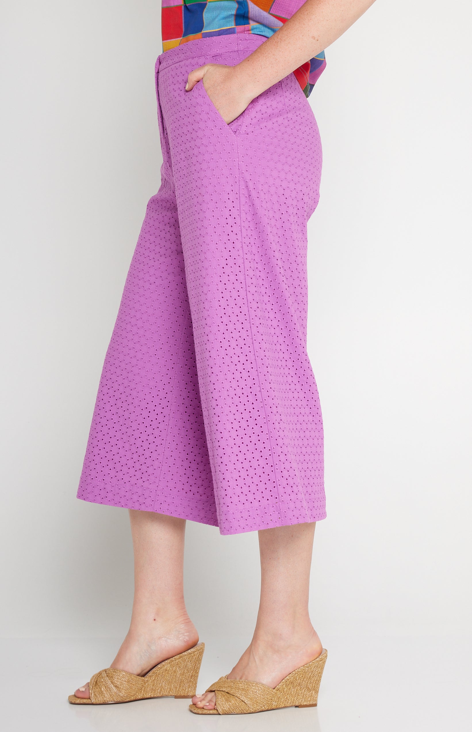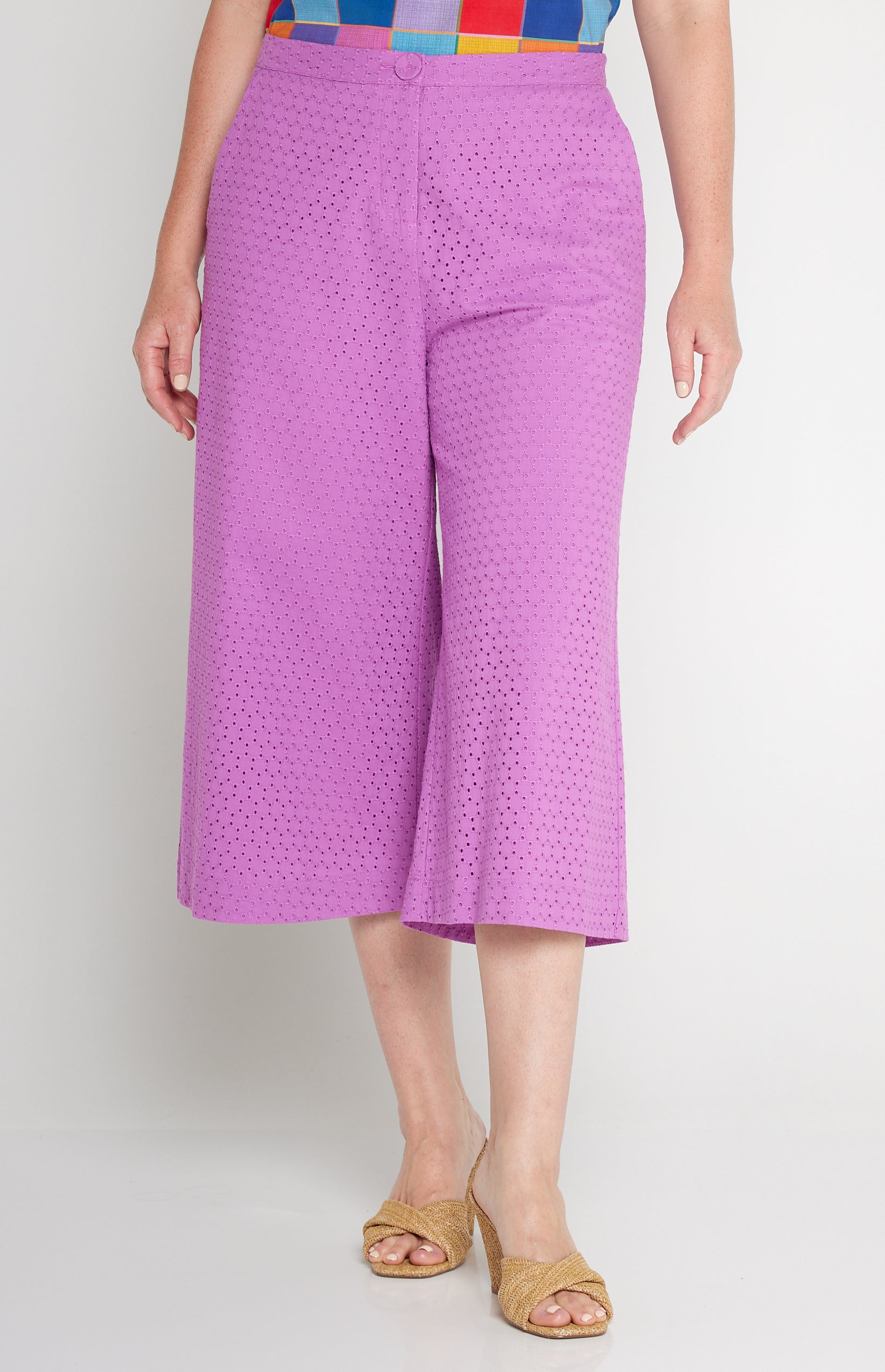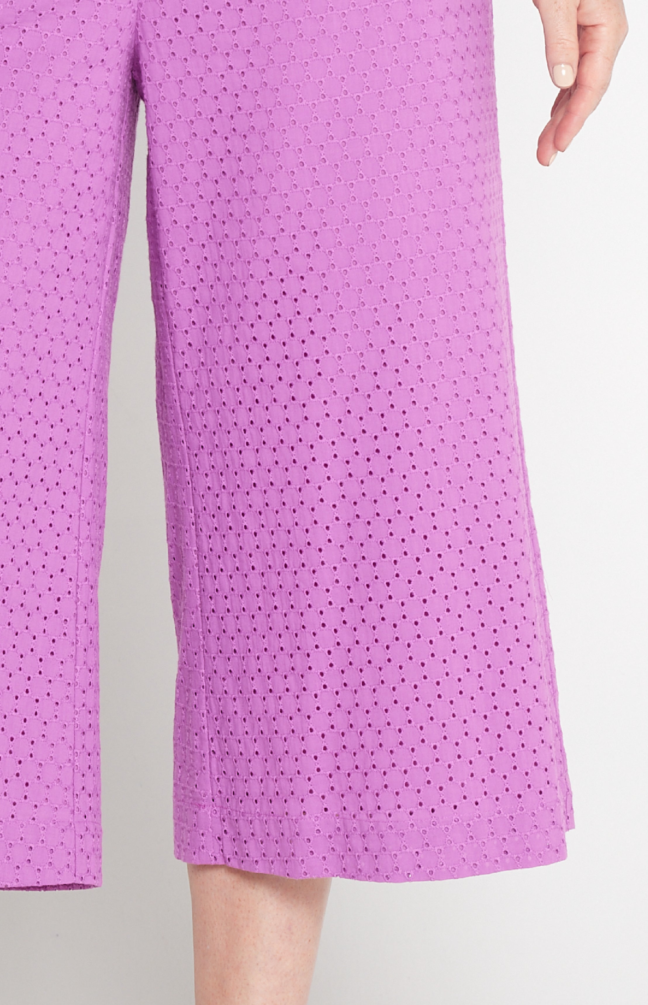 Step out in style and comfort in the Jane, she is the perfect wear anywhere pant, with her wide cropped leg. These ones are fashioned in a gorgeous lilac broderie lace.