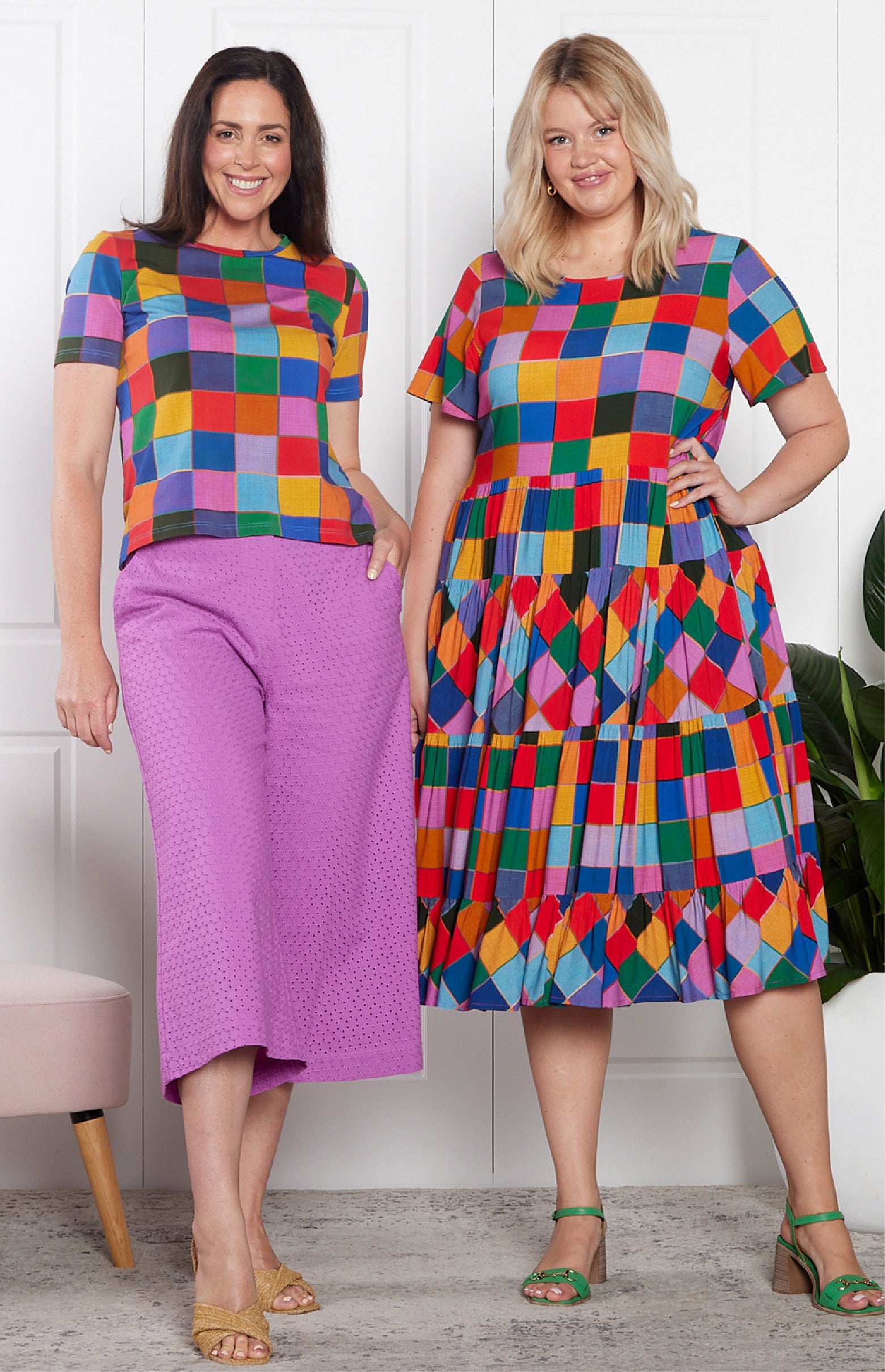 Our designer Deanne (blonde in video) wears a size 8 and is 162cm tall