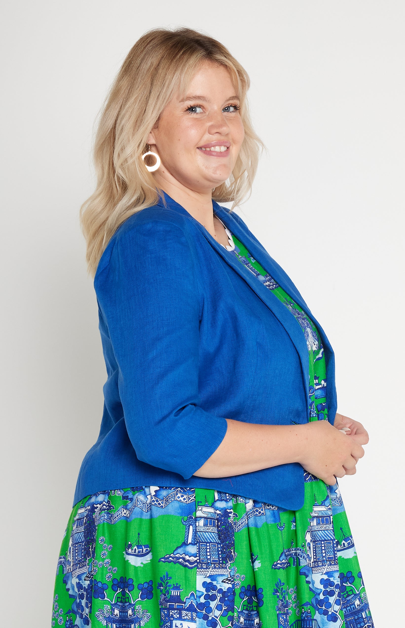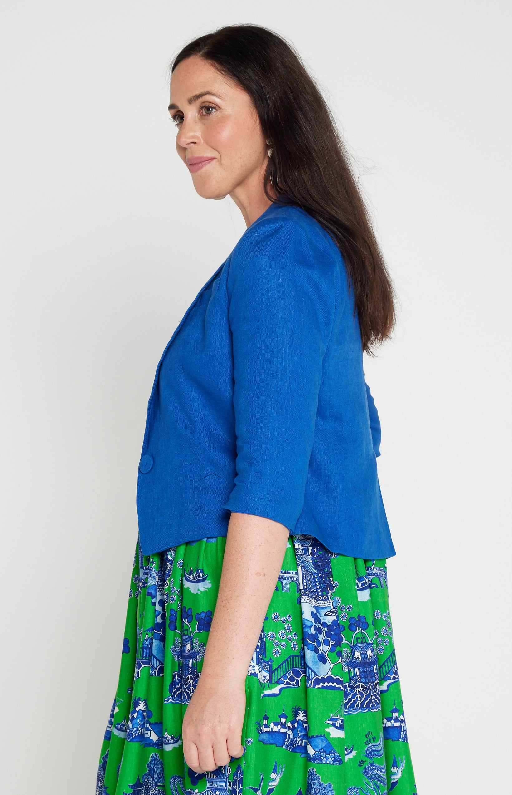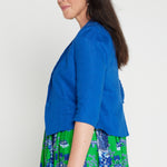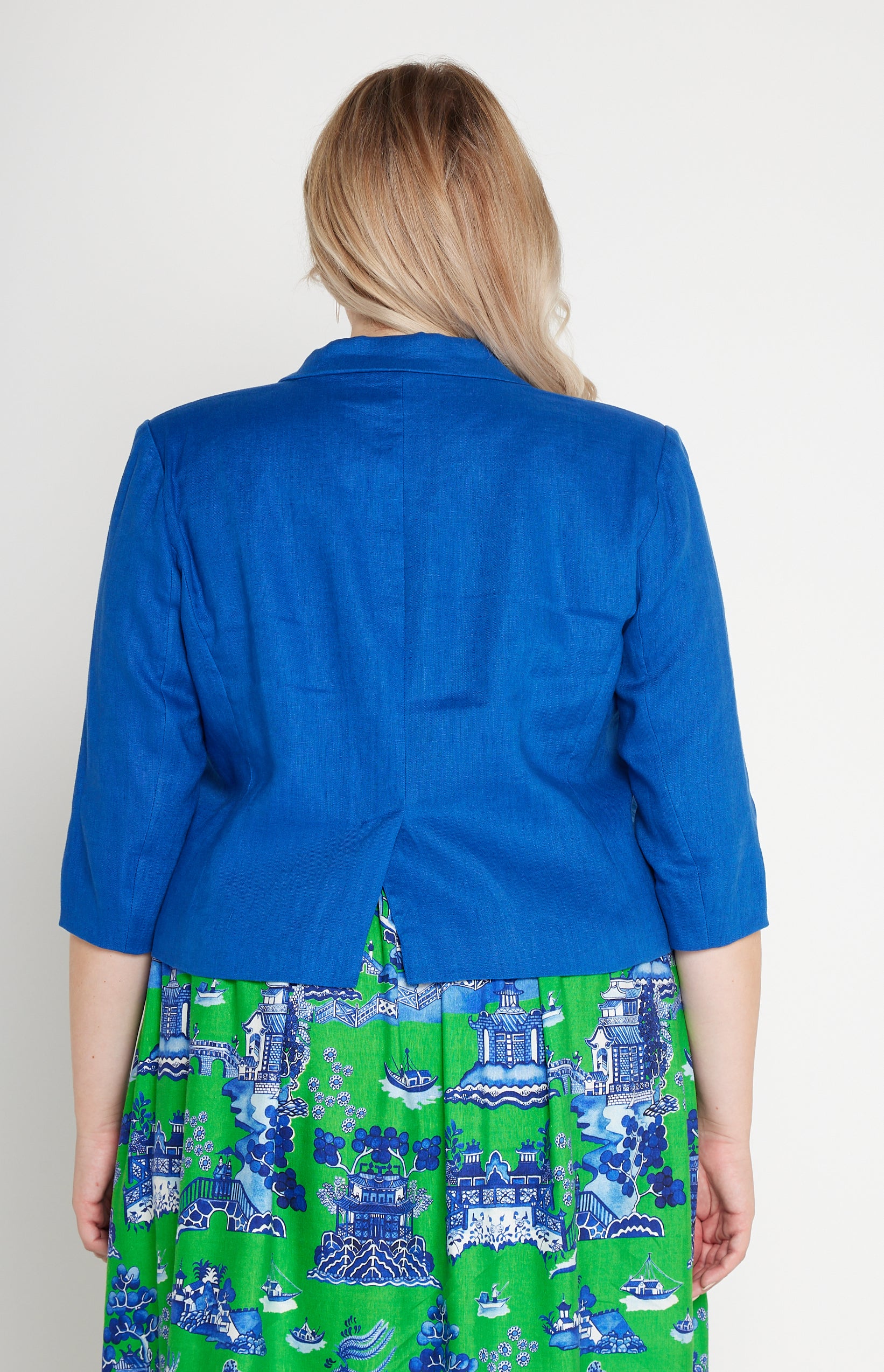 This is based off our Perfect Velvet Blazer except she is made in our luxe linen fabric, and is a cropped length, so she looks perfect over your Maiocchi frocks.