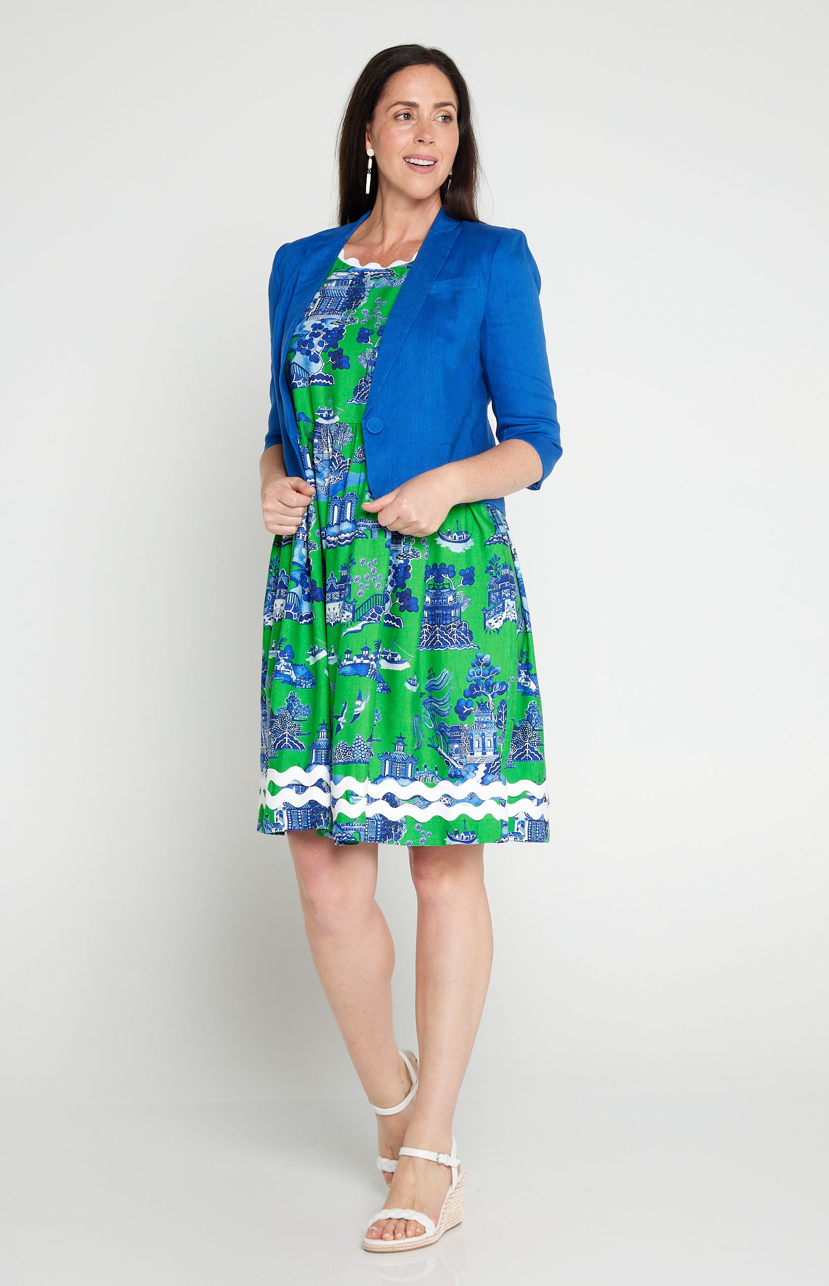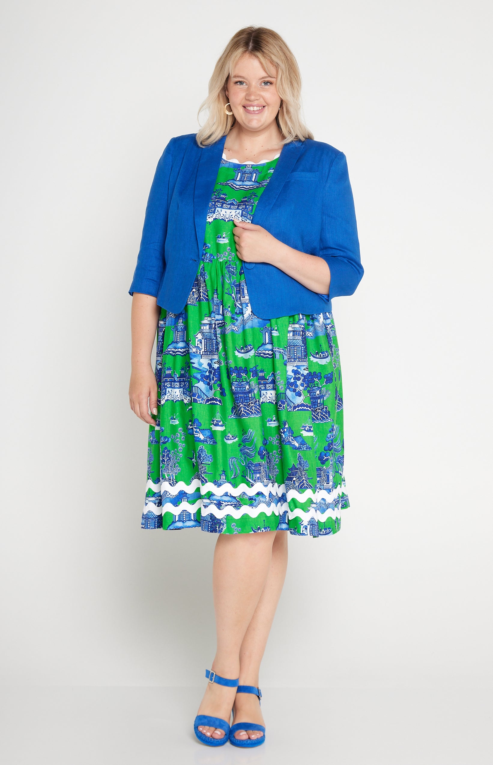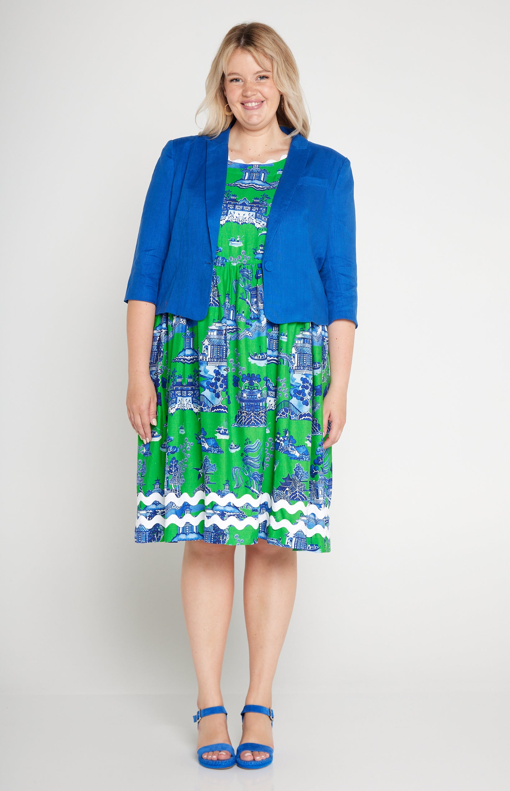 This is based off our Perfect Velvet Blazer except she is made in our luxe linen fabric, and is a cropped length, so she looks perfect over your Maiocchi frocks.