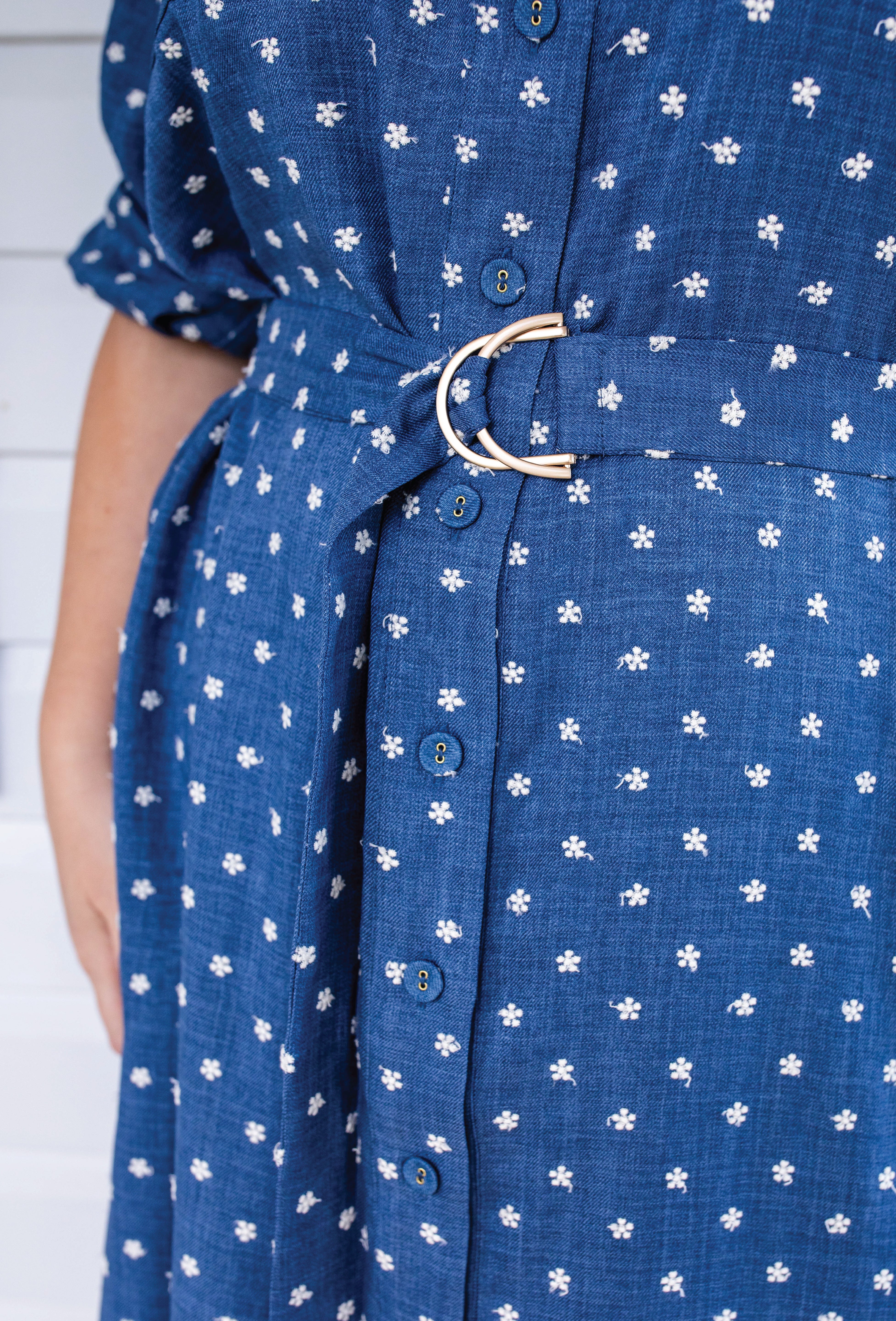 The Alison Shirt Dress is a traditional shirt dress style, and features a luxe denim fabric with little embroidered flowers.
