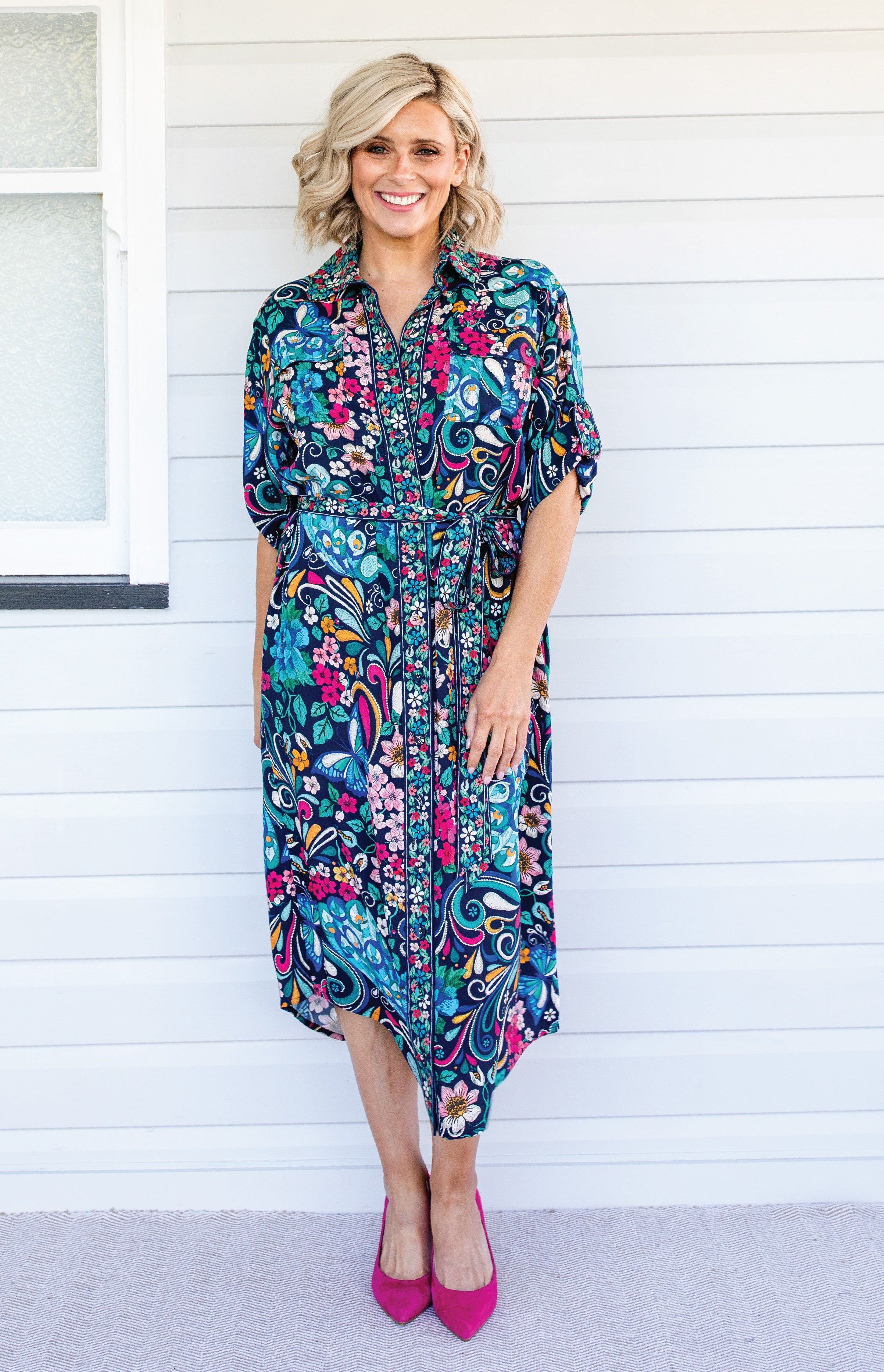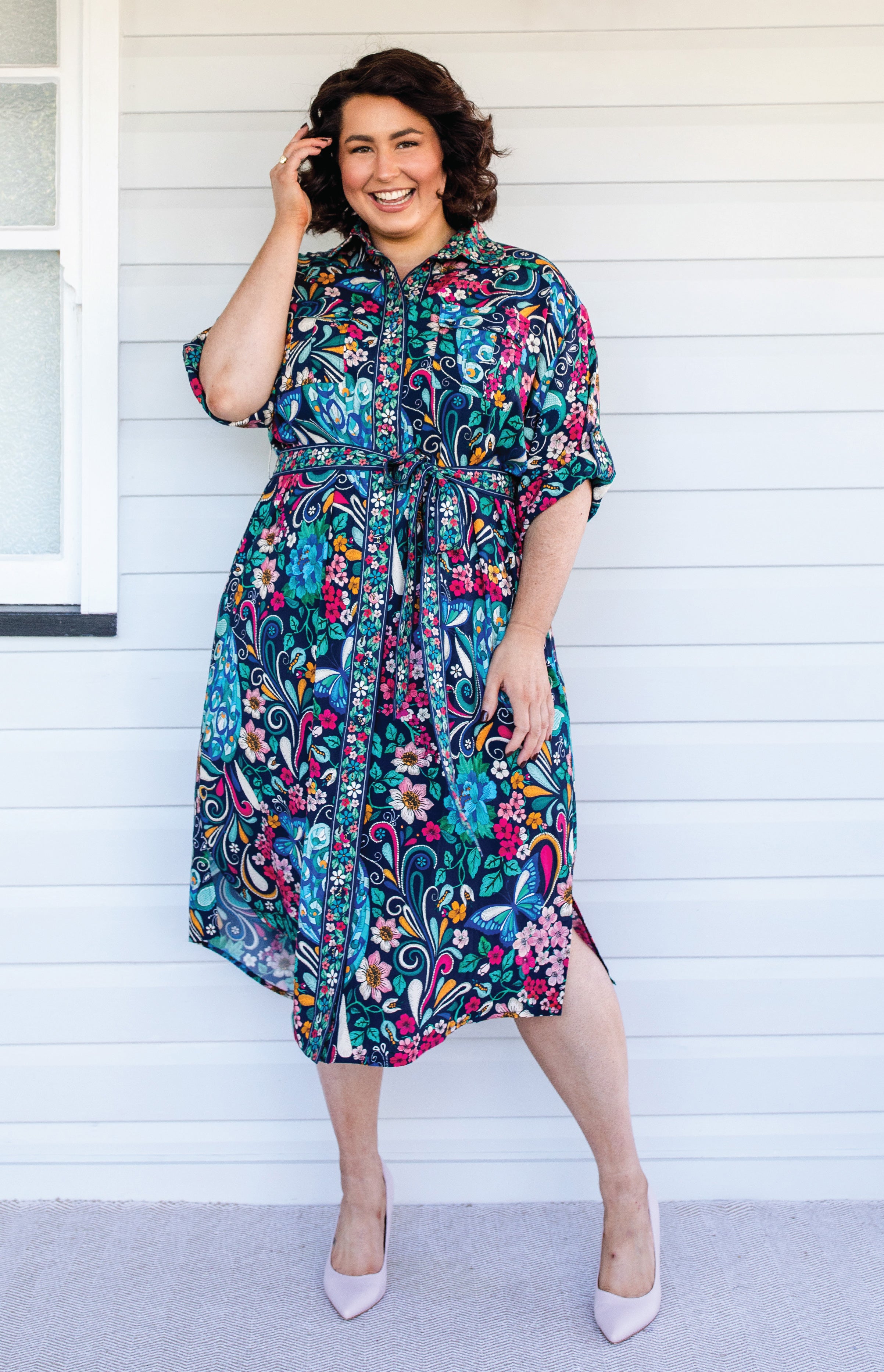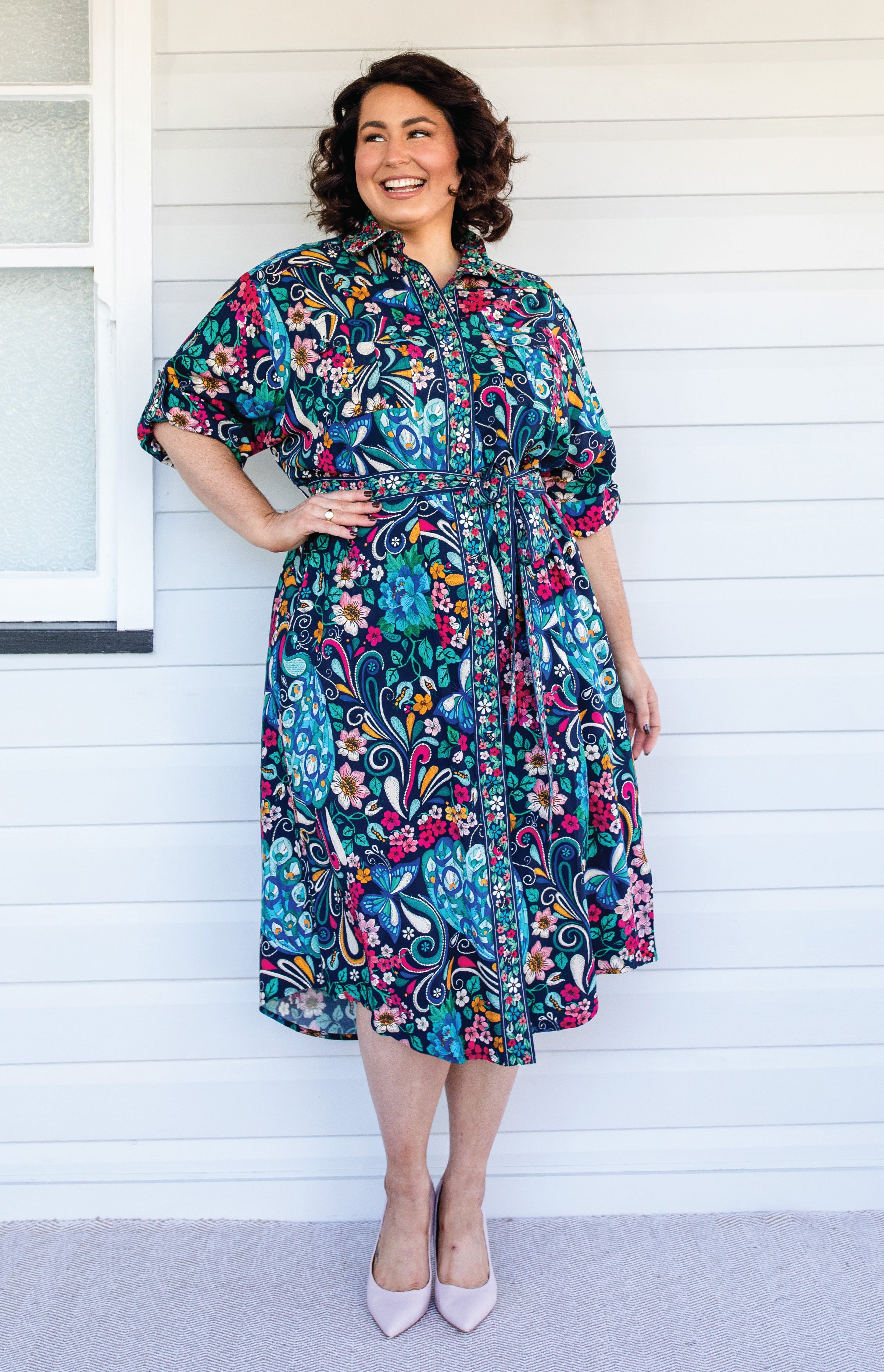 The Alison Shirt Dress is a traditional shirt dress style, and we have created a contrast floral print that is on the centre front panel, collar, buttons & sleeve cuff panels.
