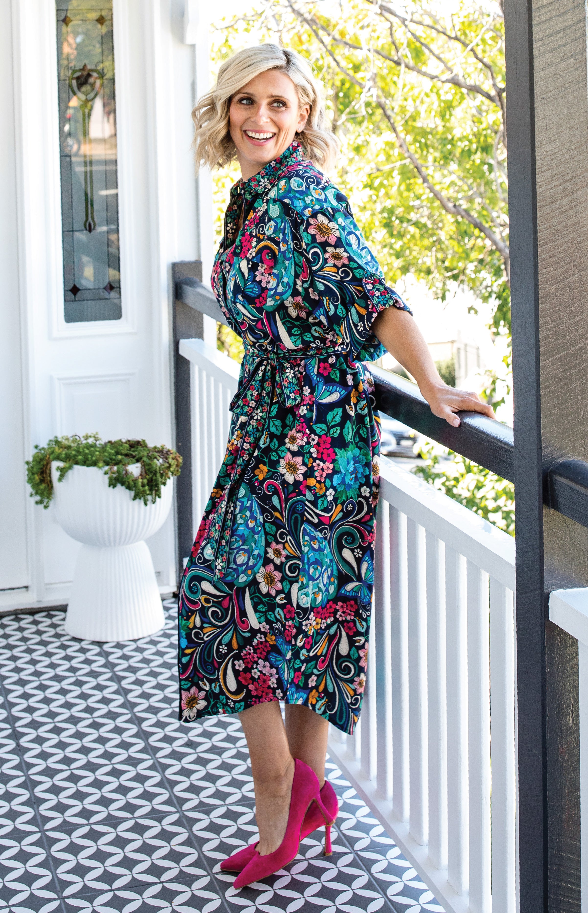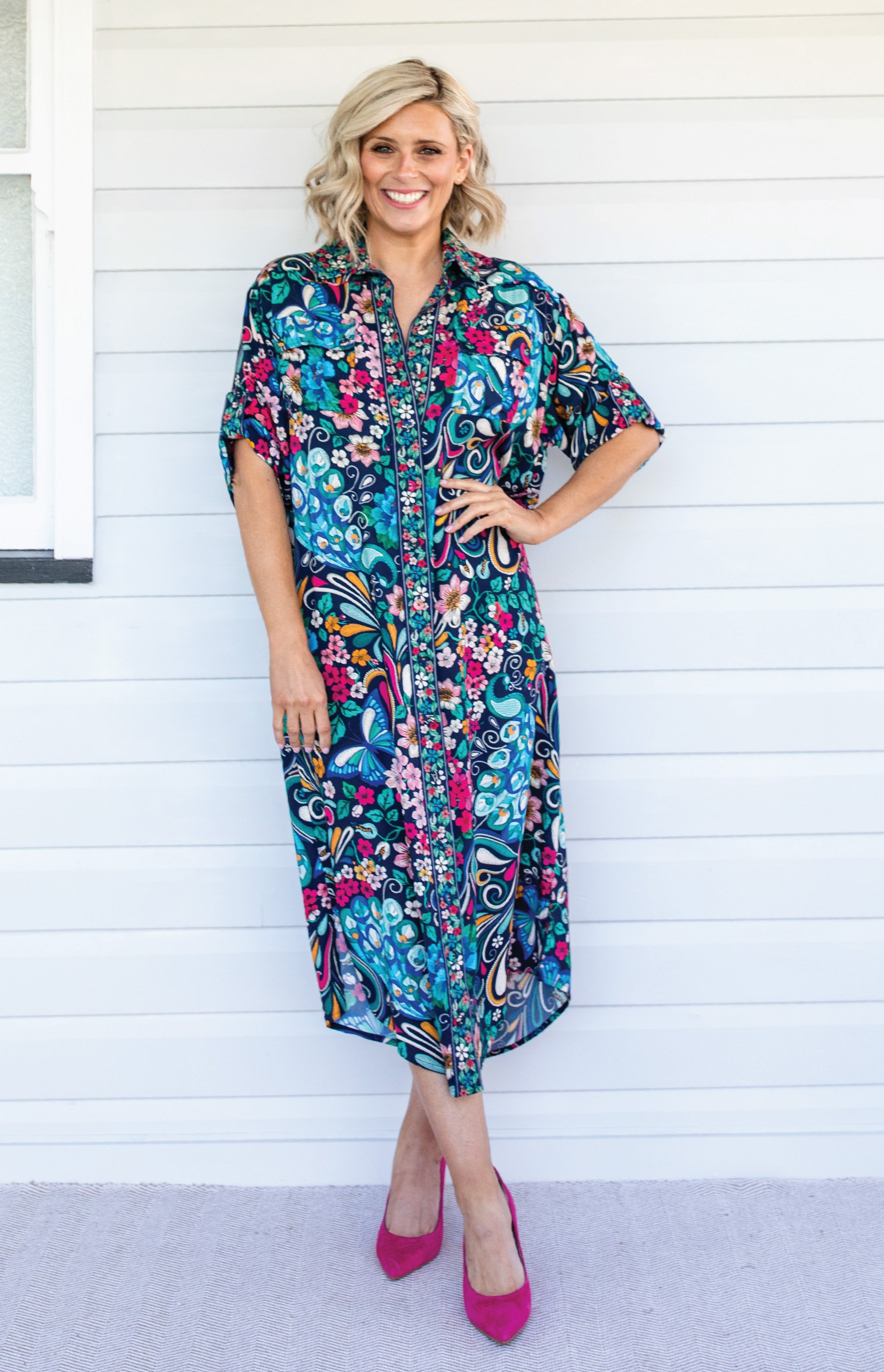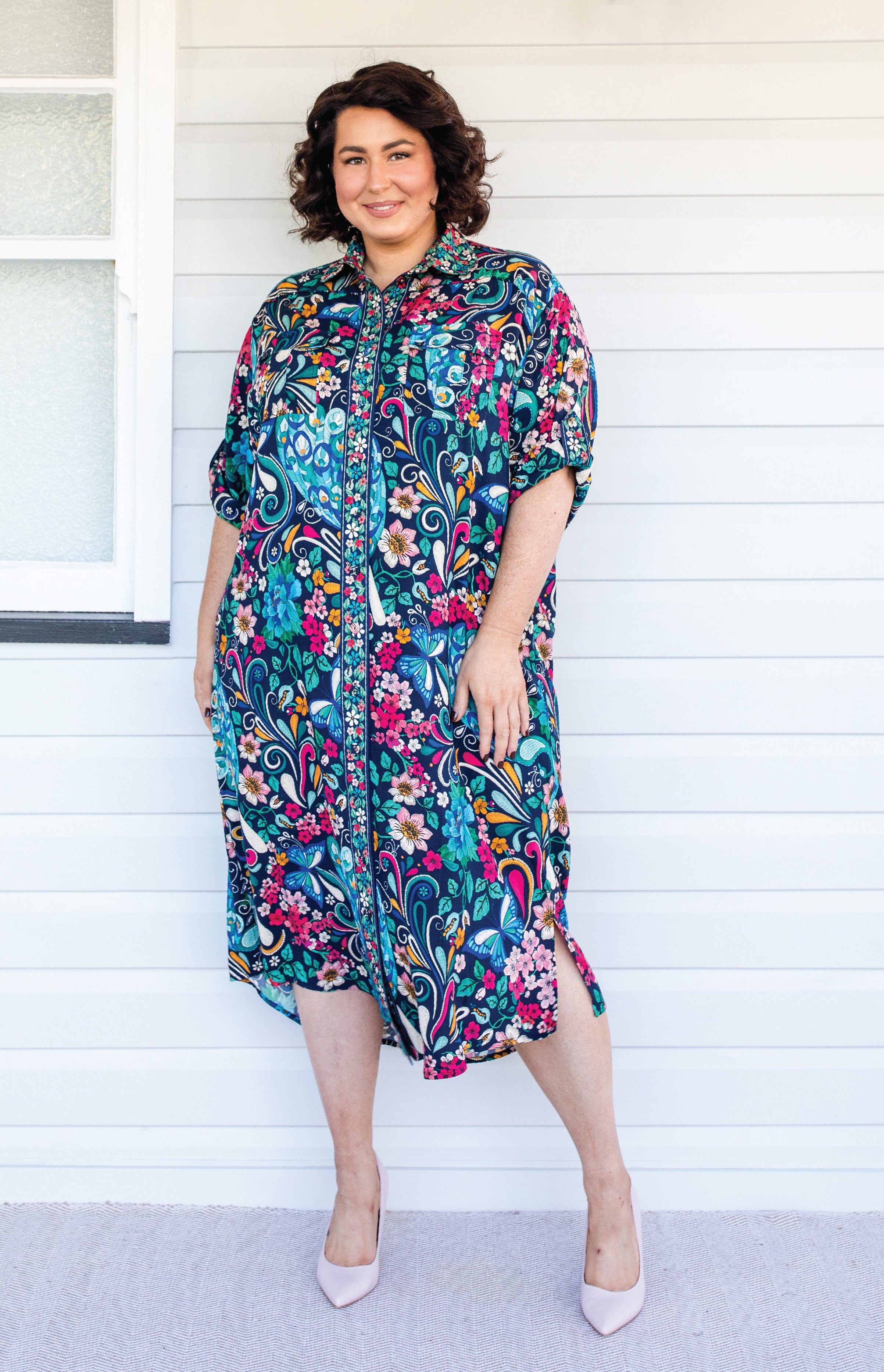The Alison Shirt Dress is a traditional shirt dress style, and we have created a contrast floral print that is on the centre front panel, collar, buttons & sleeve cuff panels.
