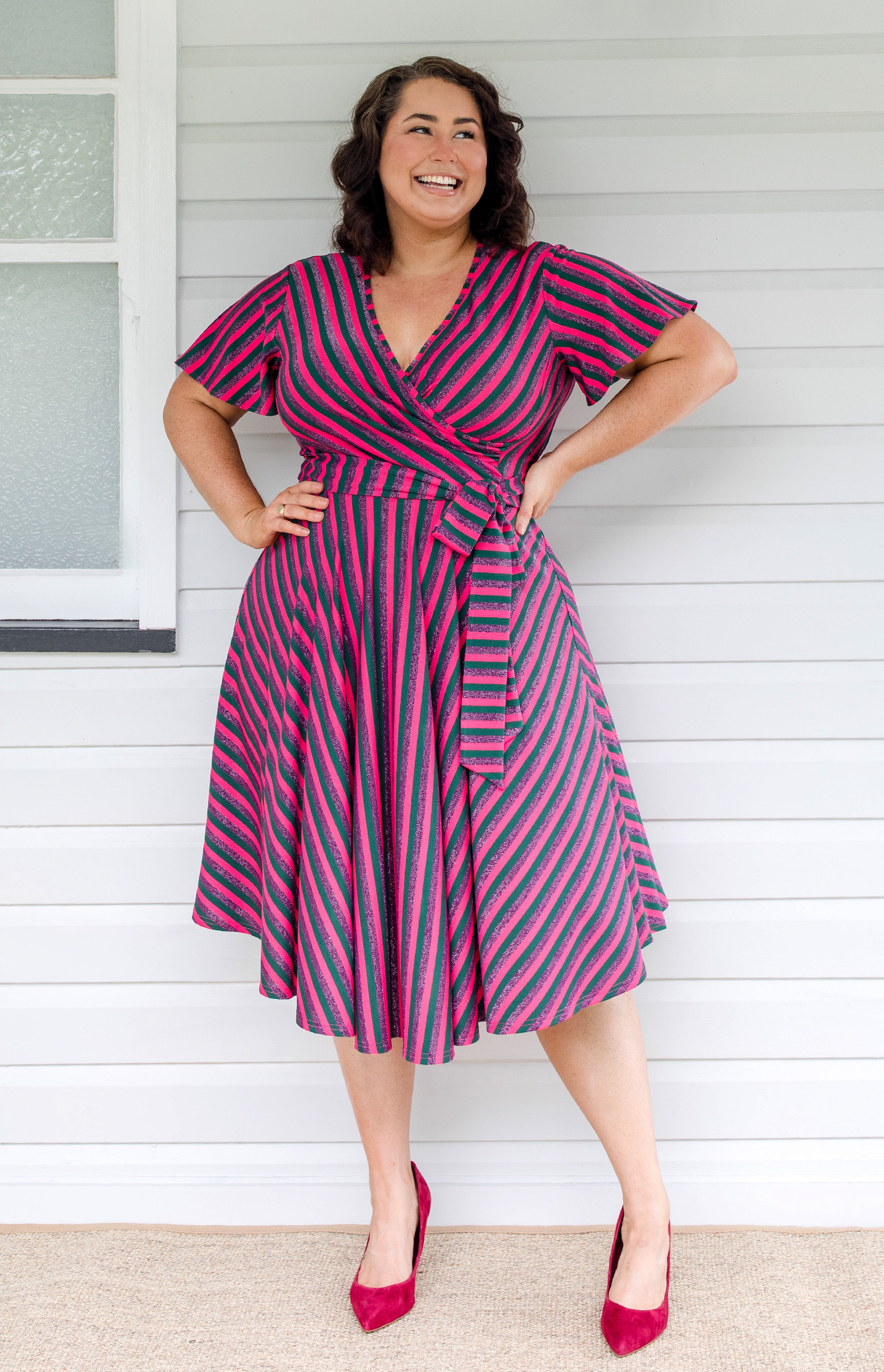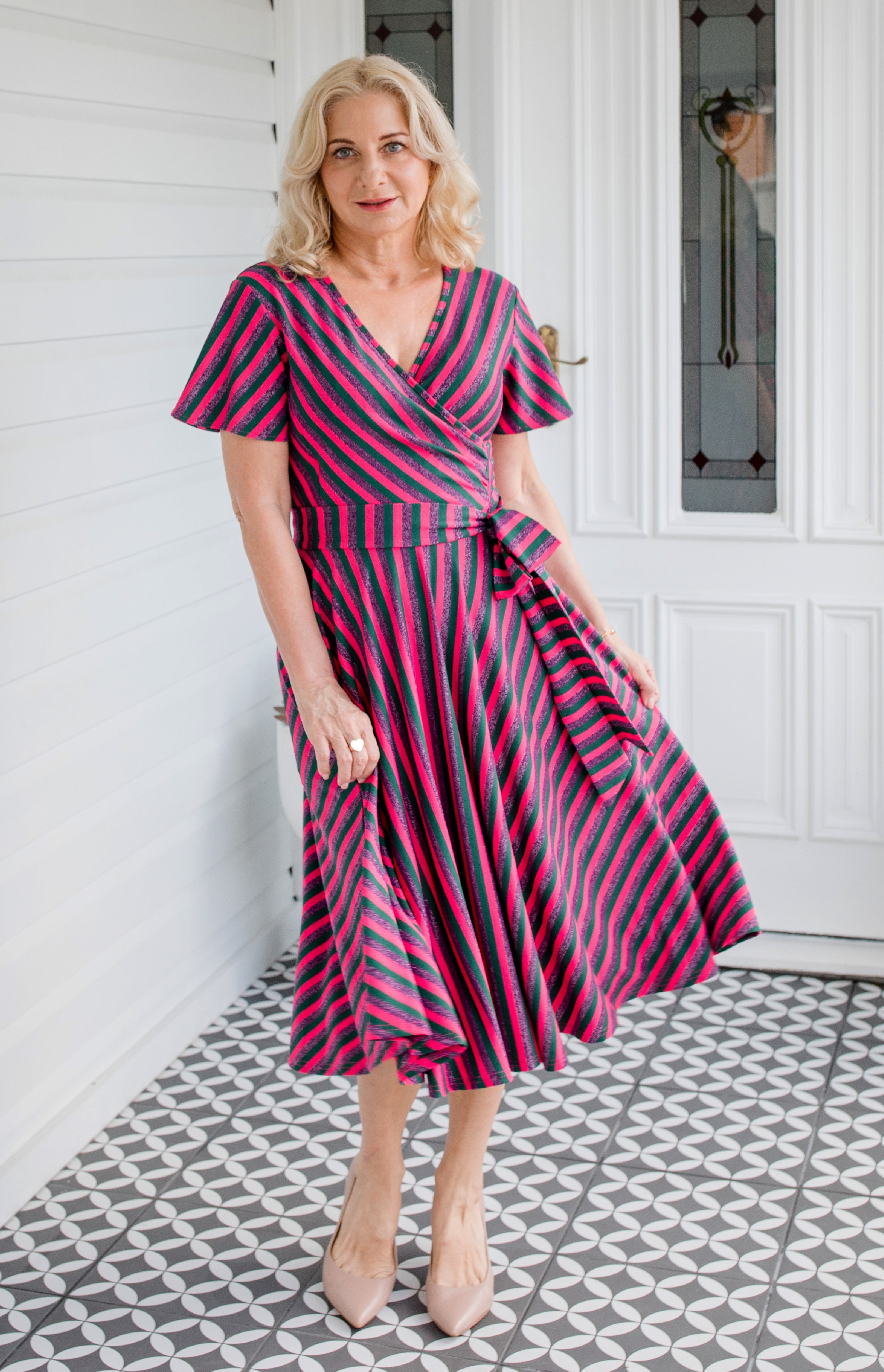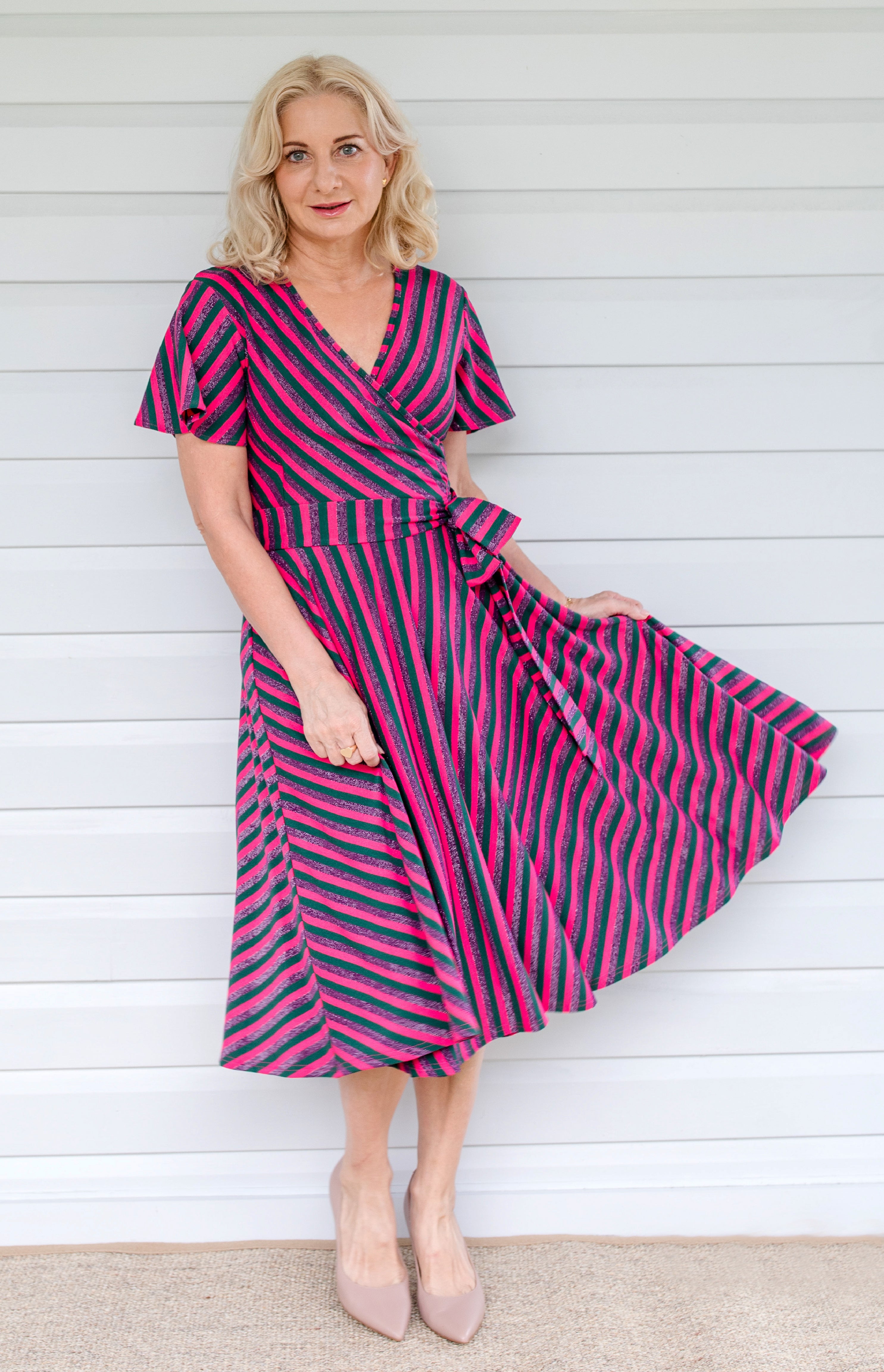 See how we have cut the stripes in different directions so that they draw the eye down, elongating the figure and making you look and feel fabulous.