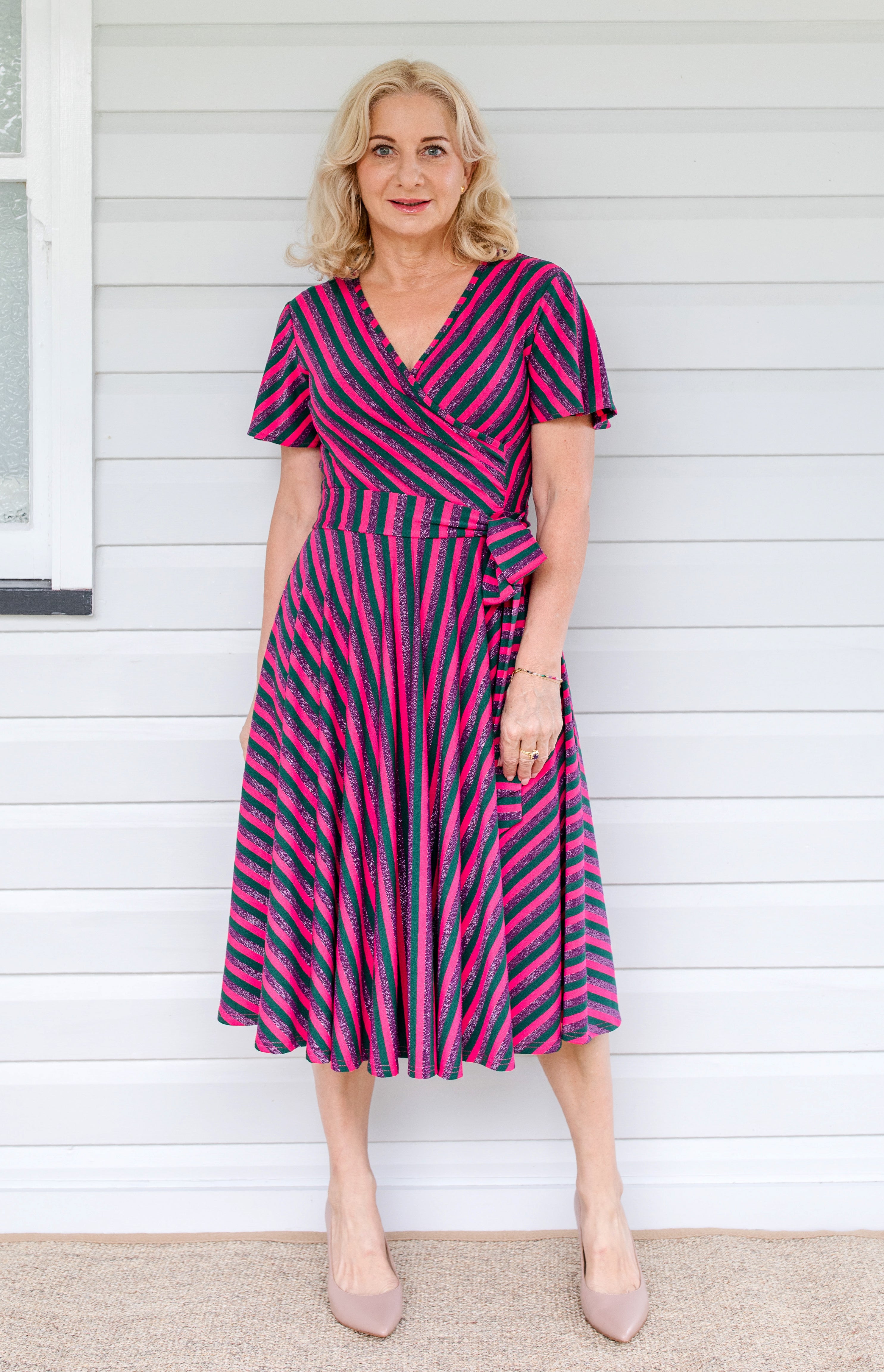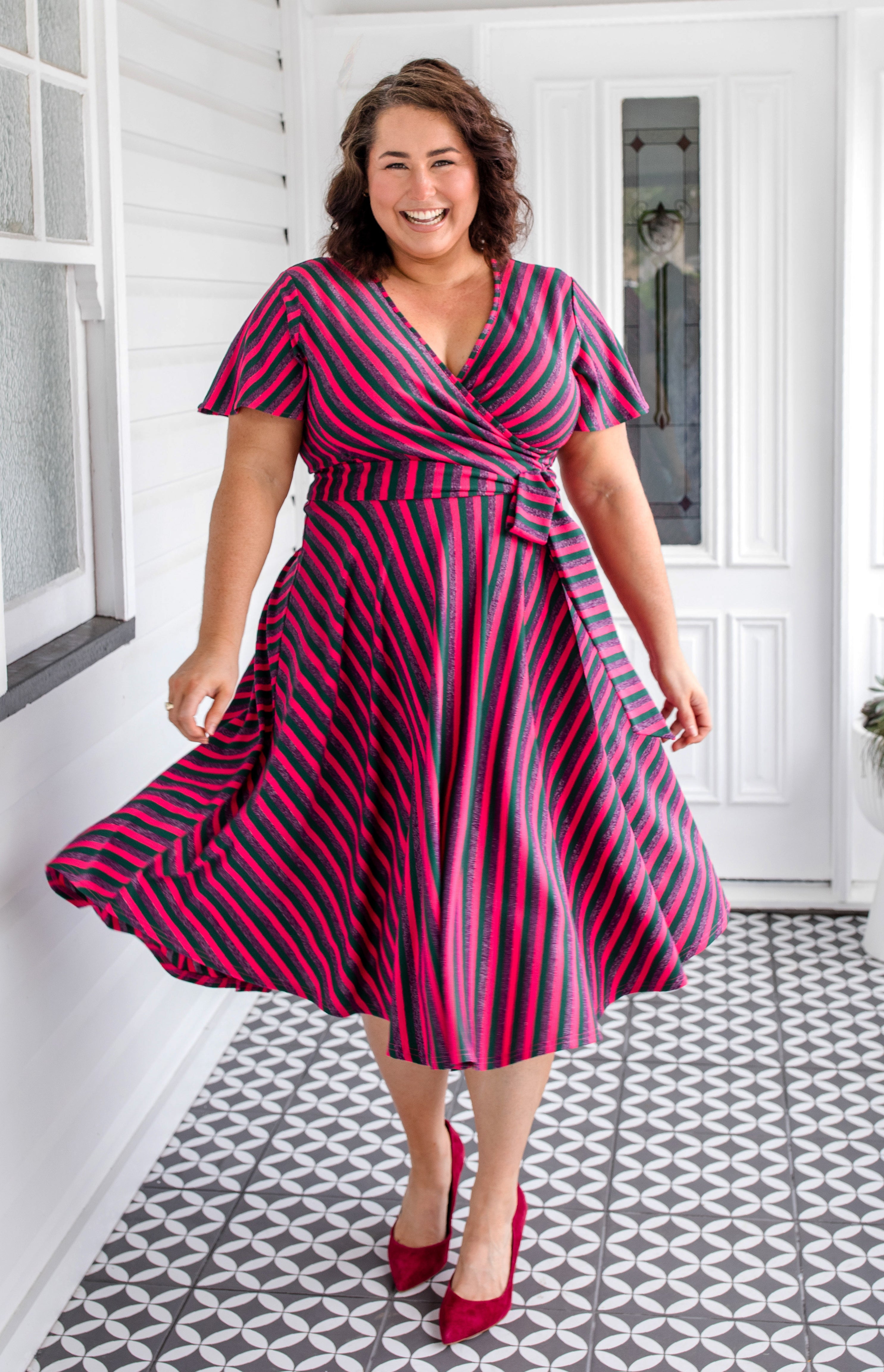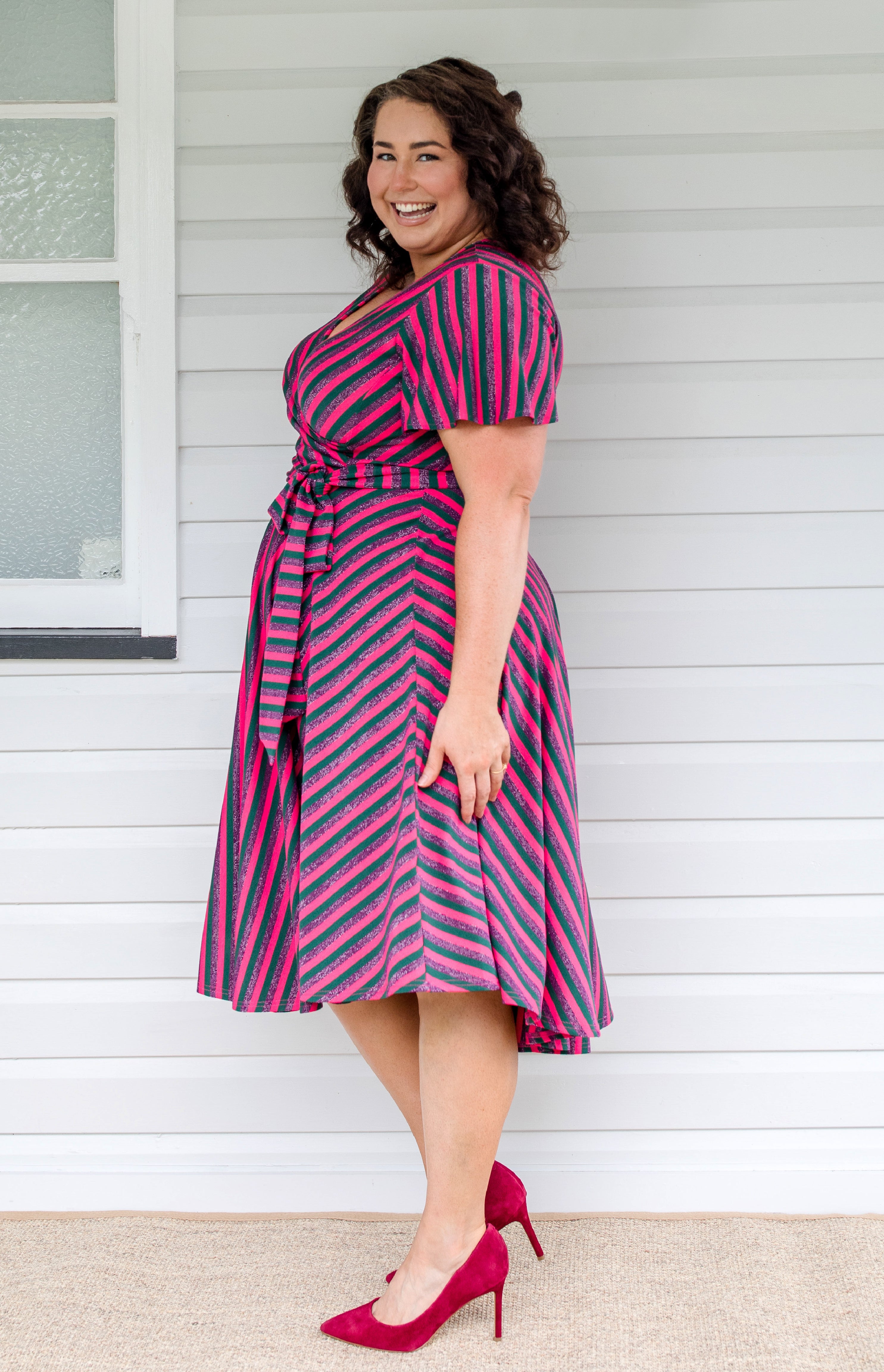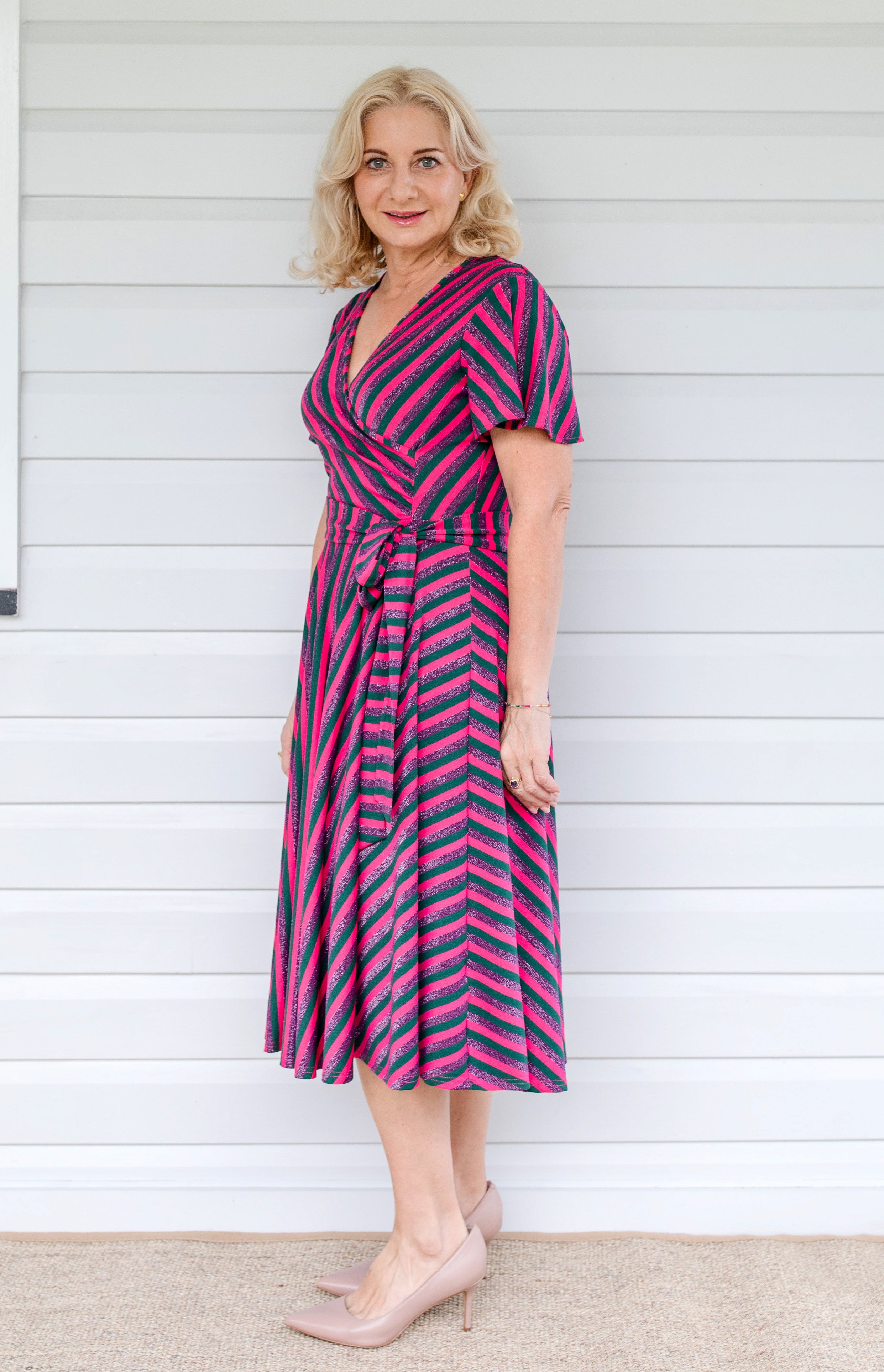 See how we have cut the stripes in different directions so that they draw the eye down, elongating the figure and making you look and feel fabulous.