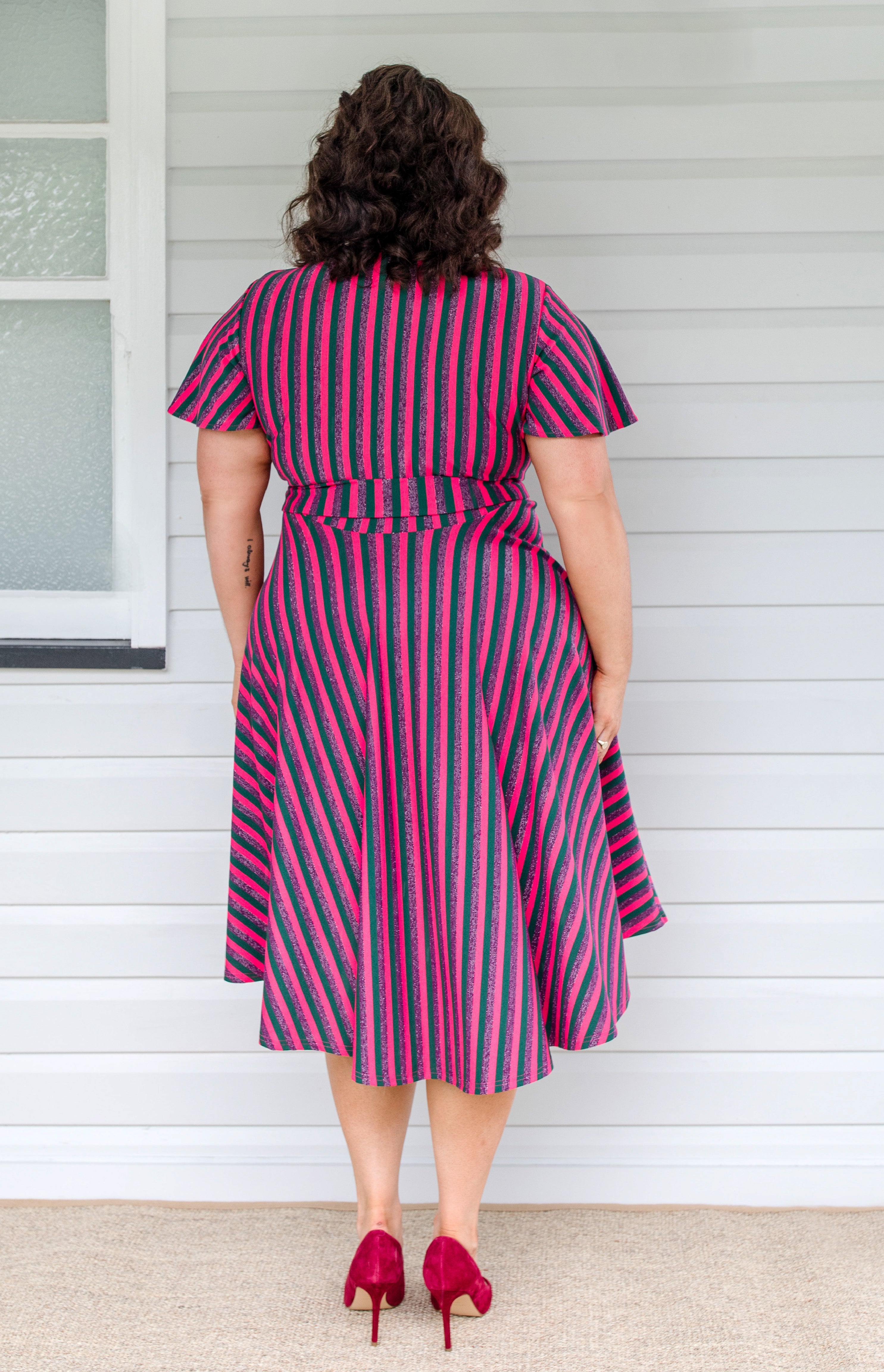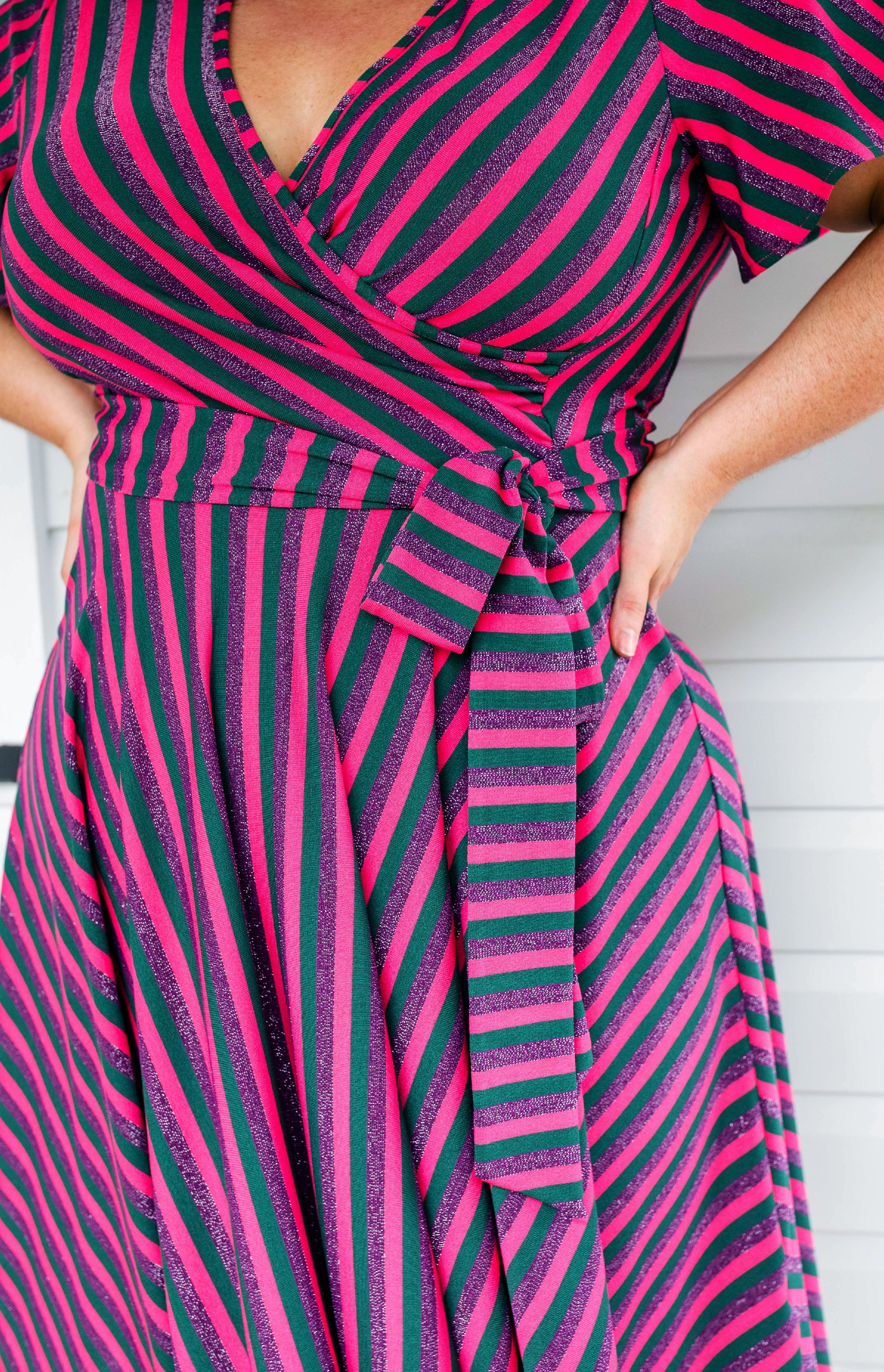 Guaranteed to make you shine, our Arabella Dress is winter wardrobe perfection in these opulent metallic stripes. This dress will be sure to turn every head in the room at your next special event.
