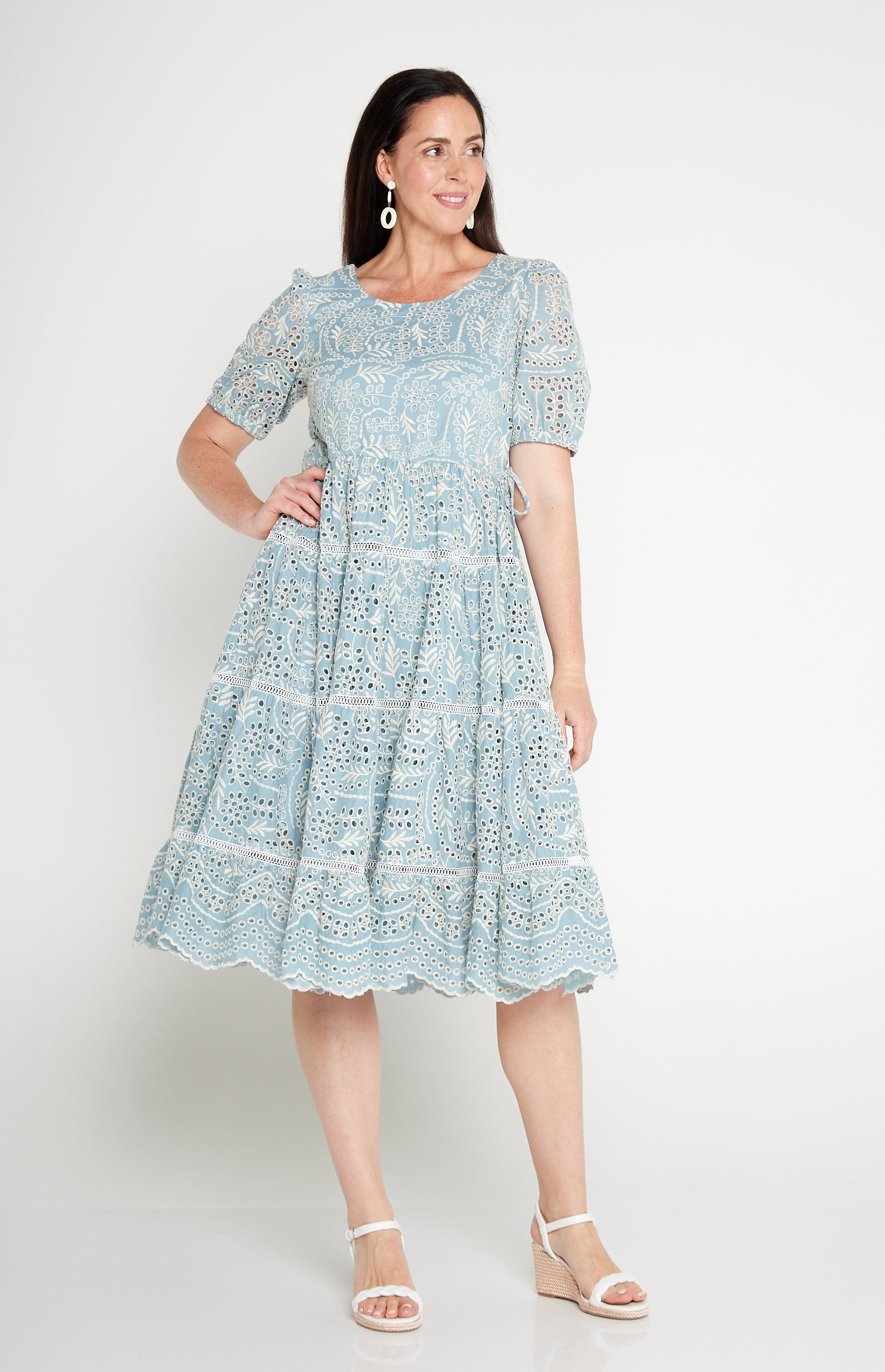 Round neckline and adjustable drawstring waist on Eloise Dress in blue lace