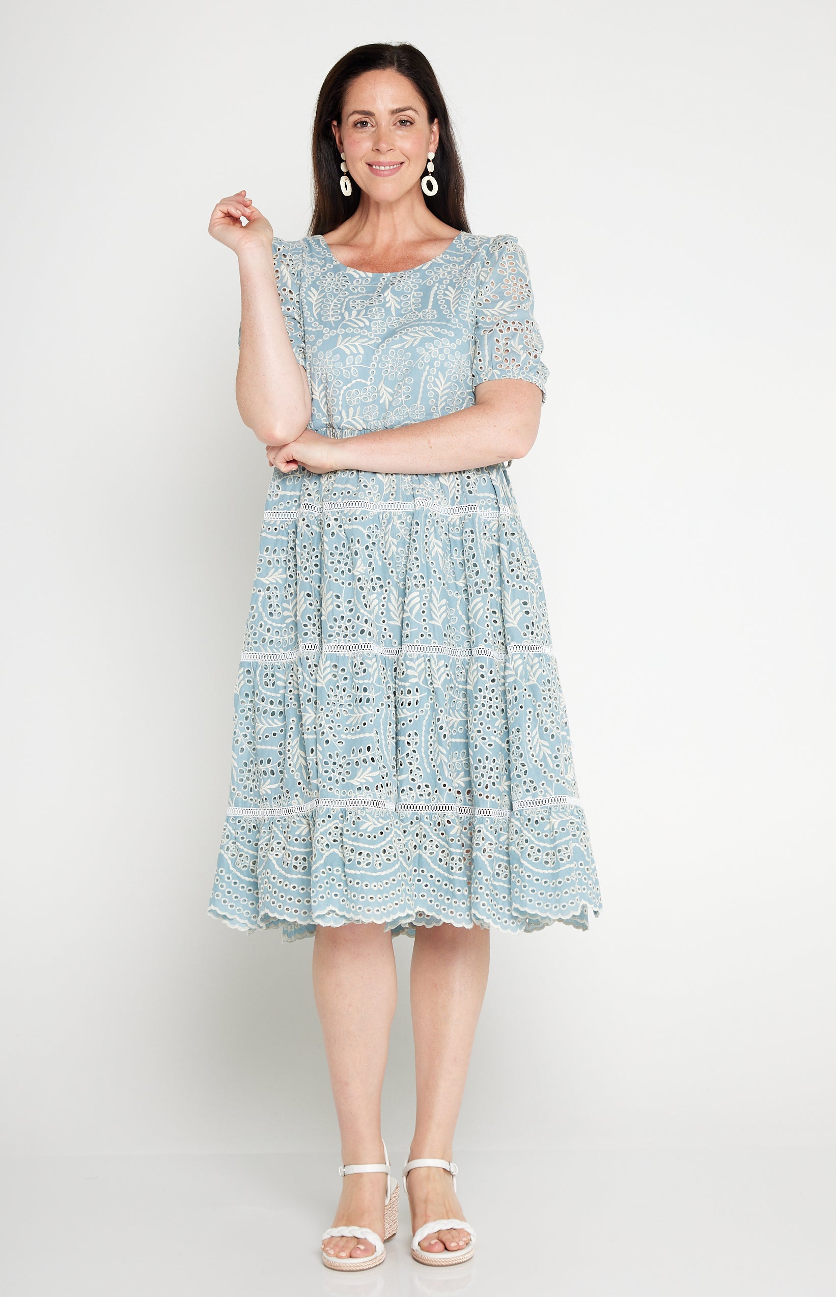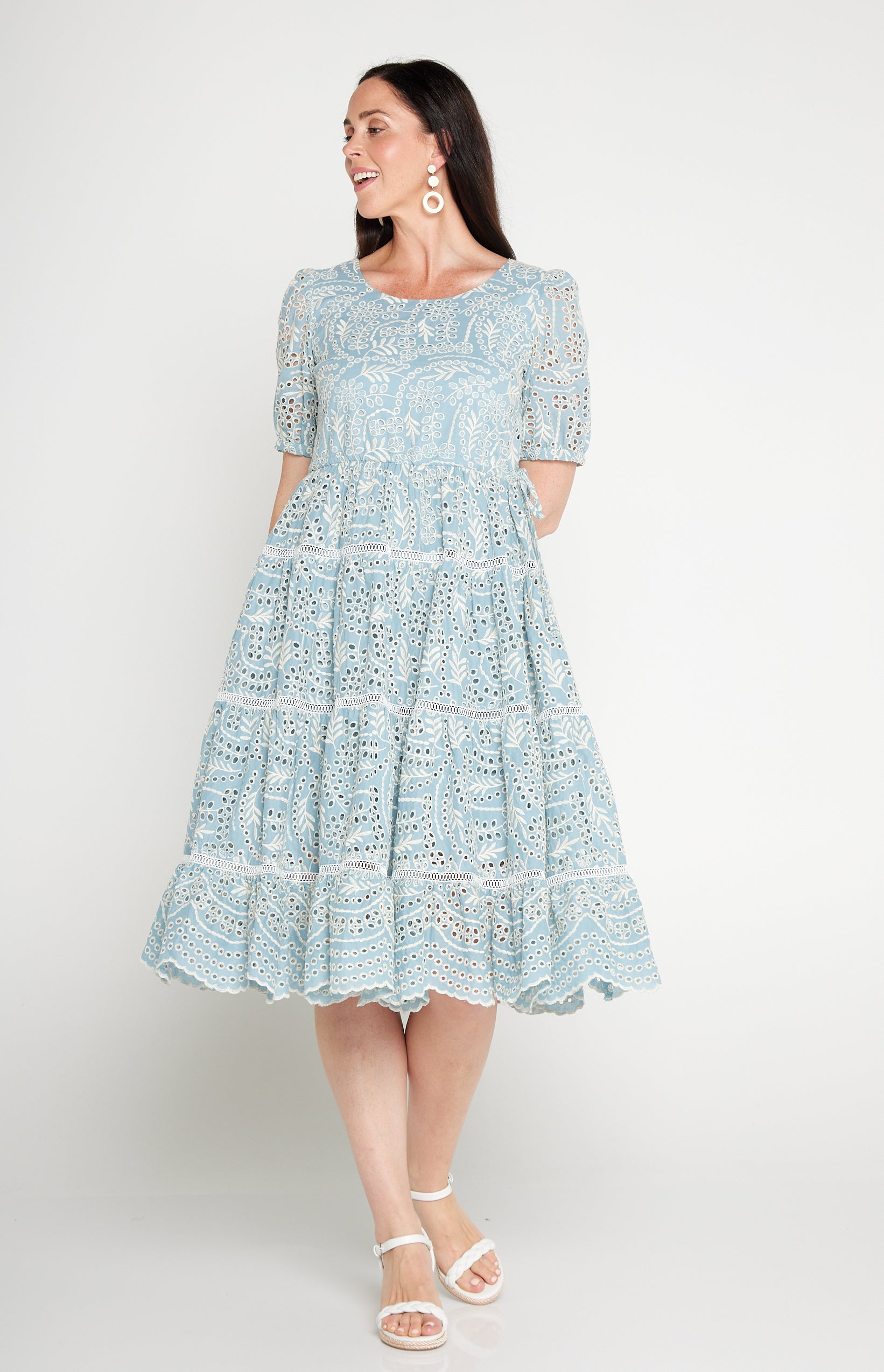 Eloise Dress in blue lace – feminine fit-and-flare cotton lace frock by Maiocchi