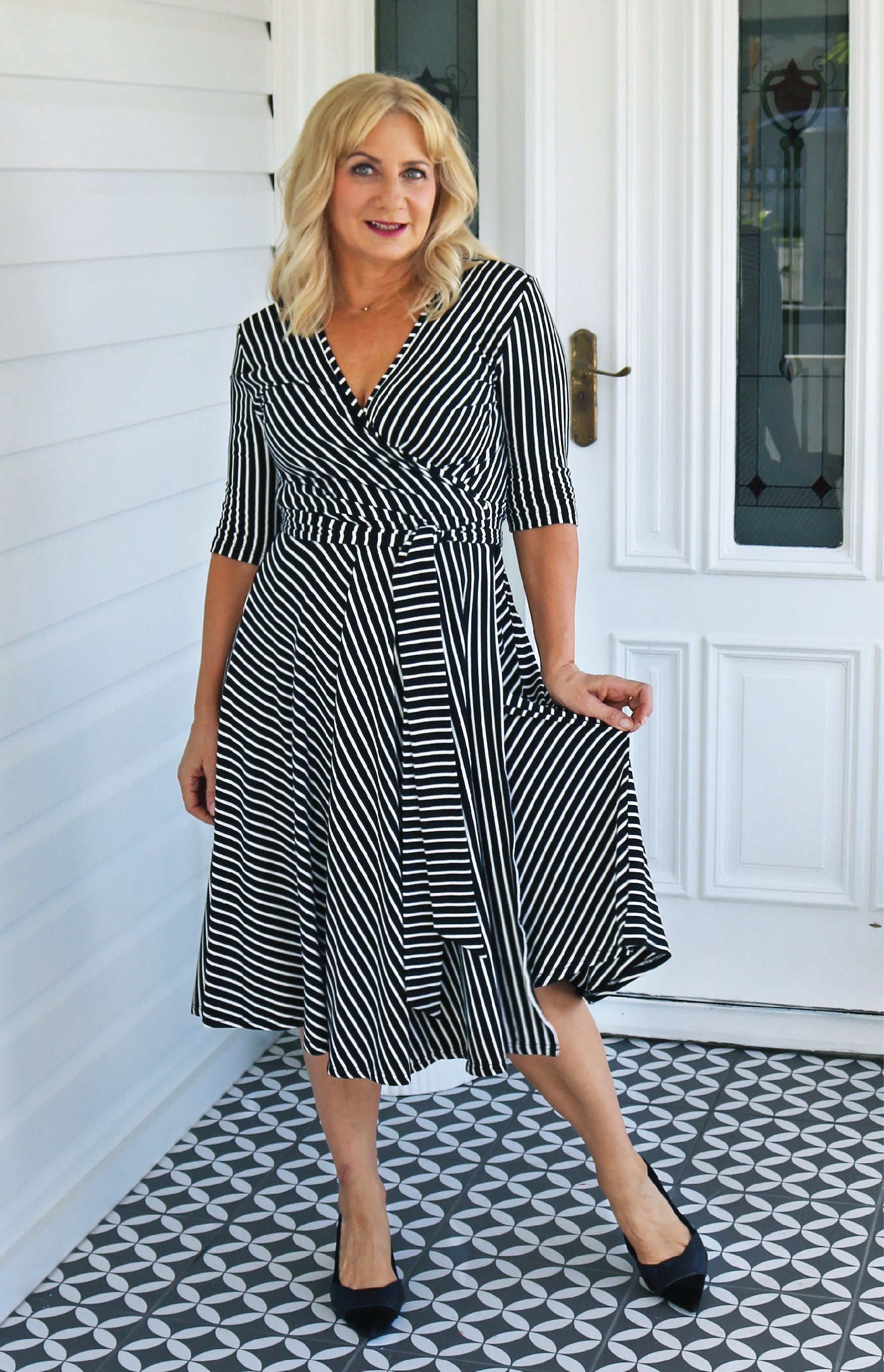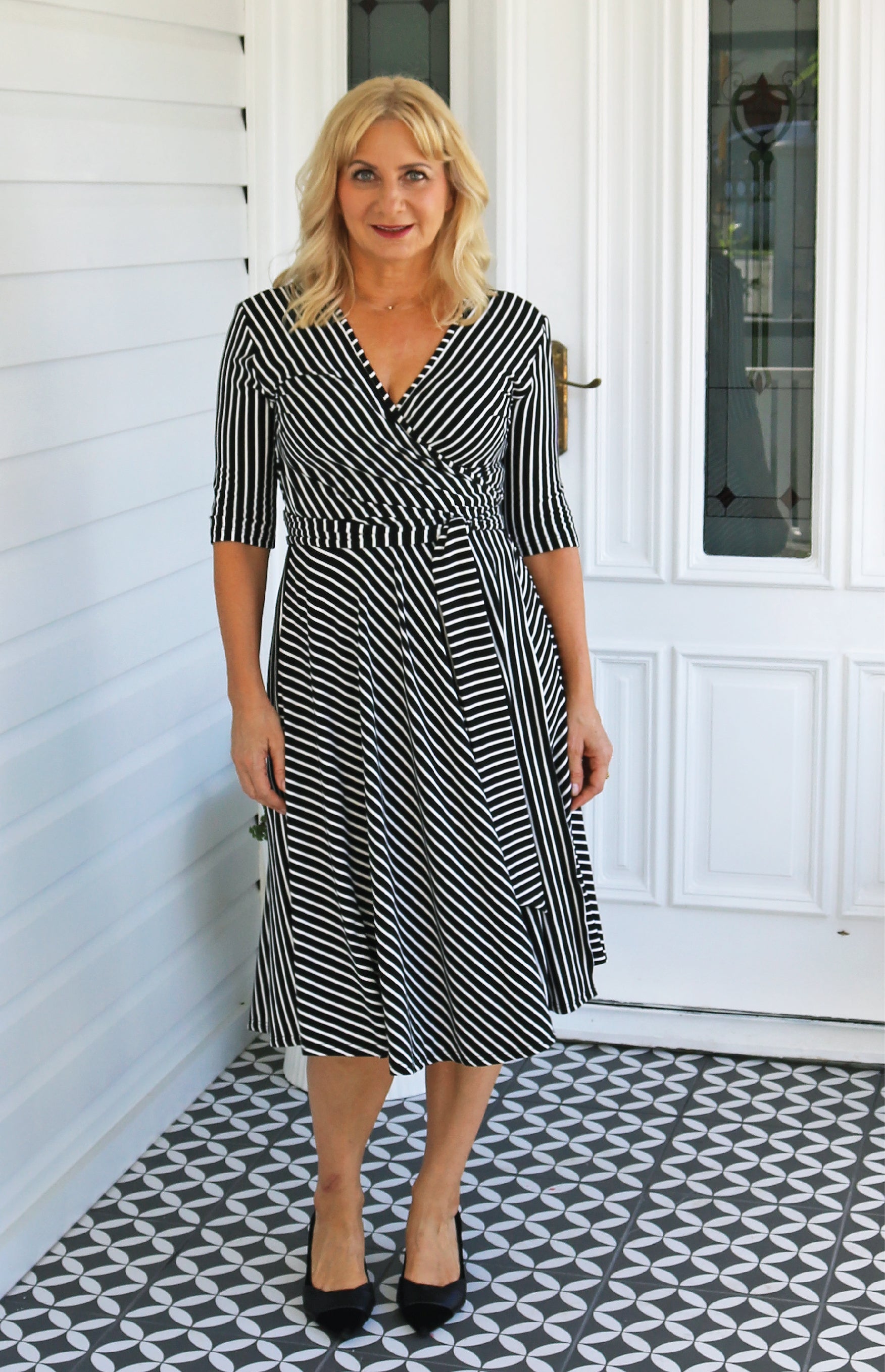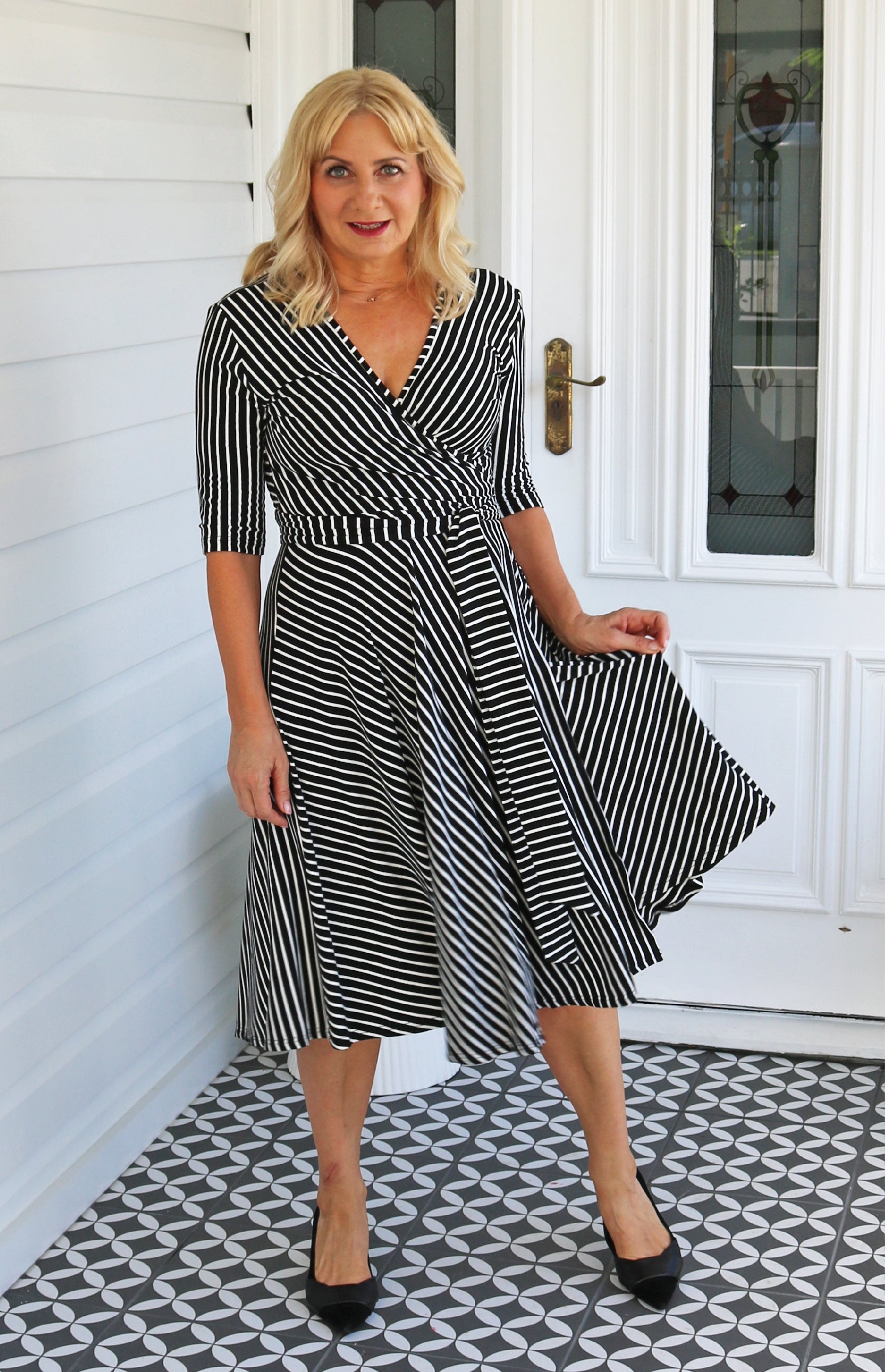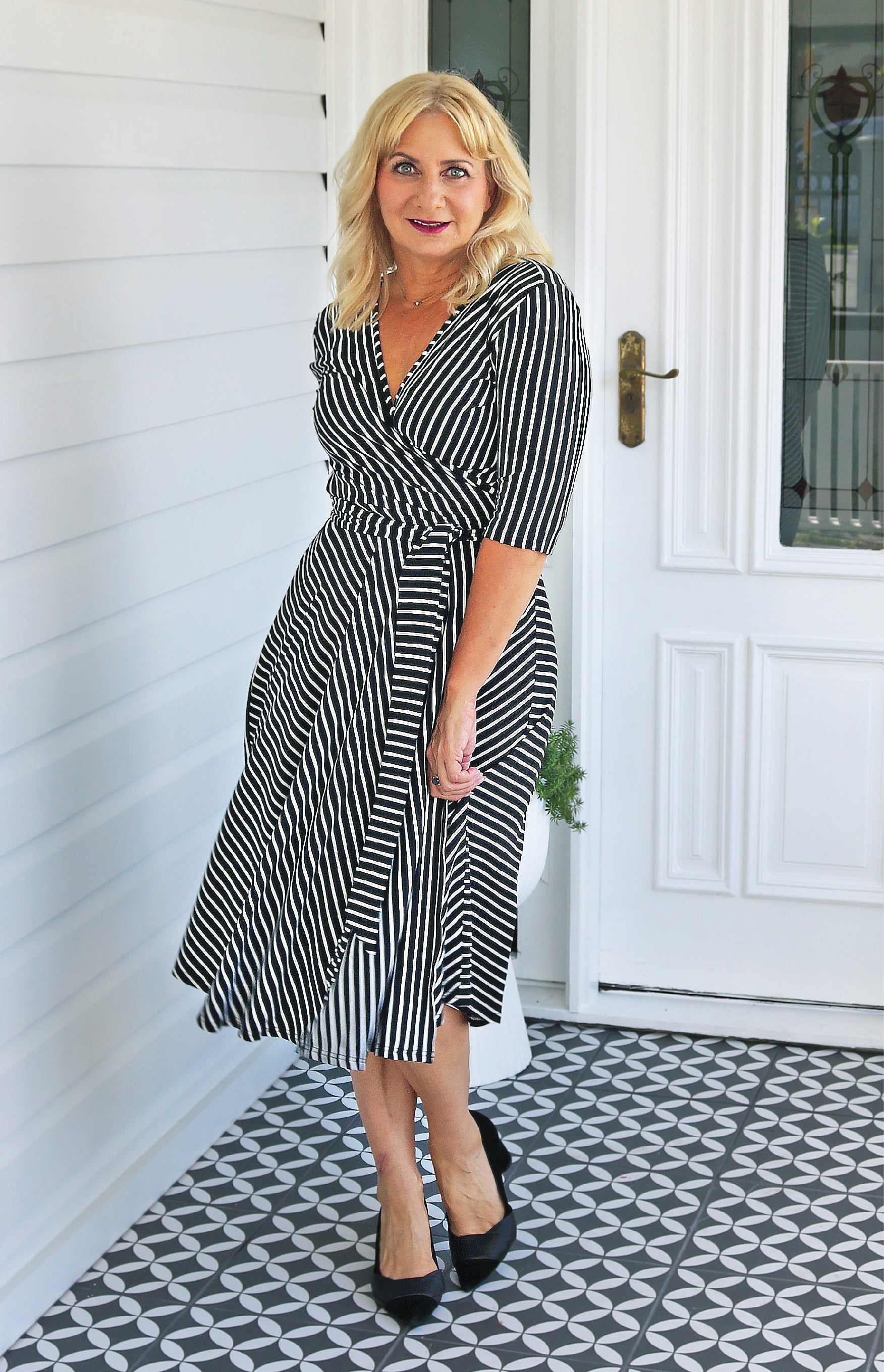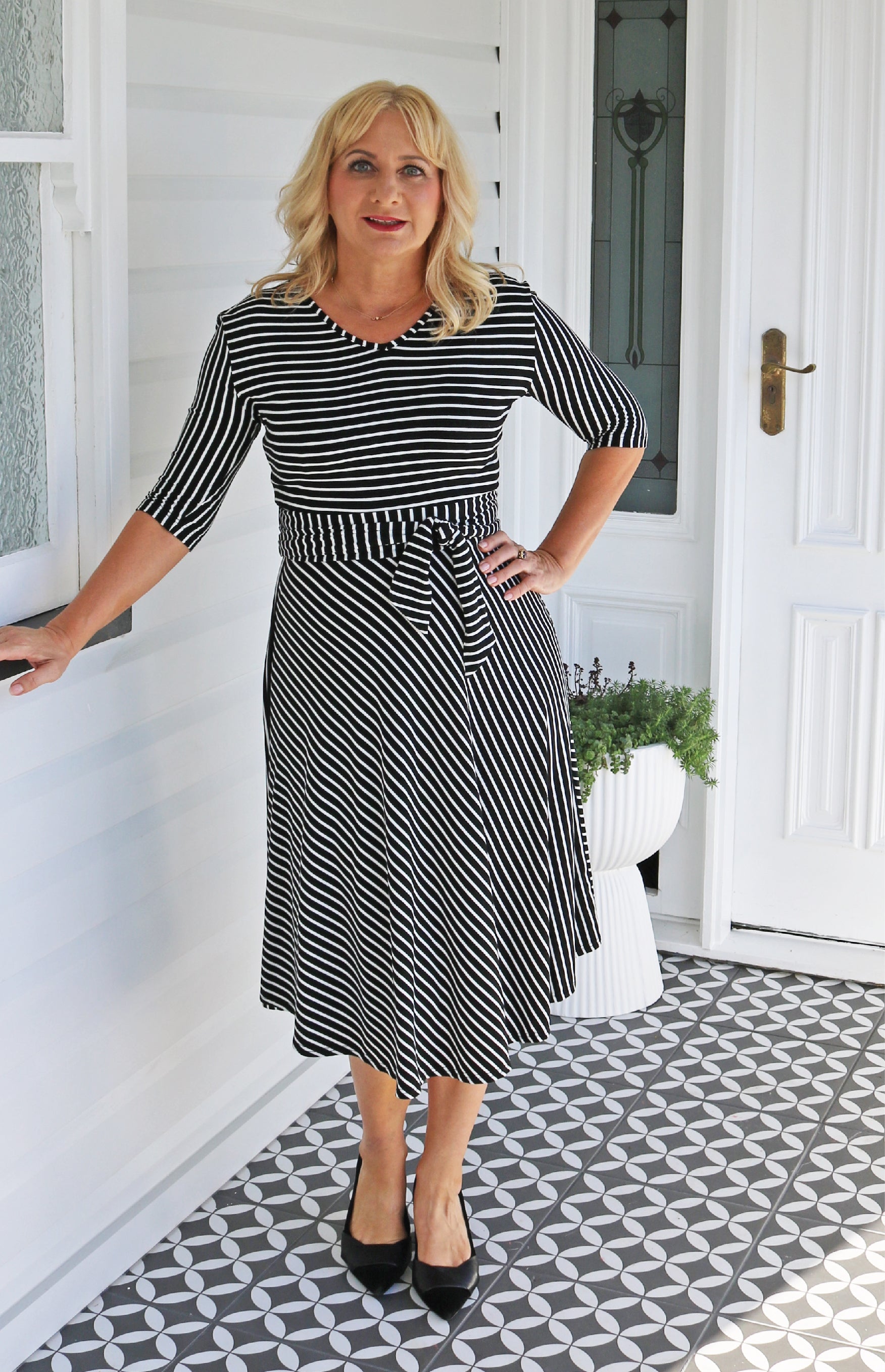 In classic black and white stripes, see how we have cut the stripes in different directions so that they draw the eye down, elongating the figure.